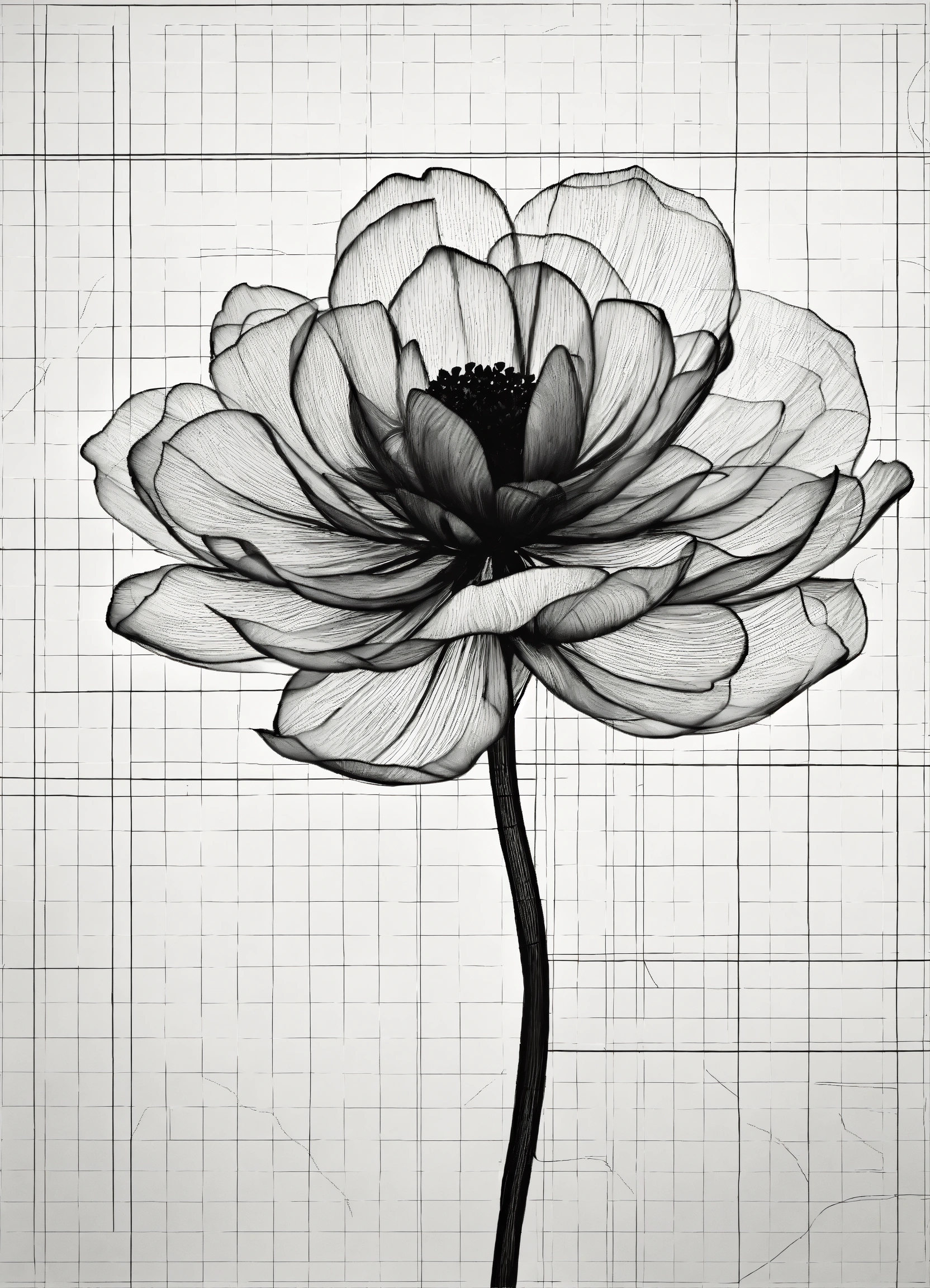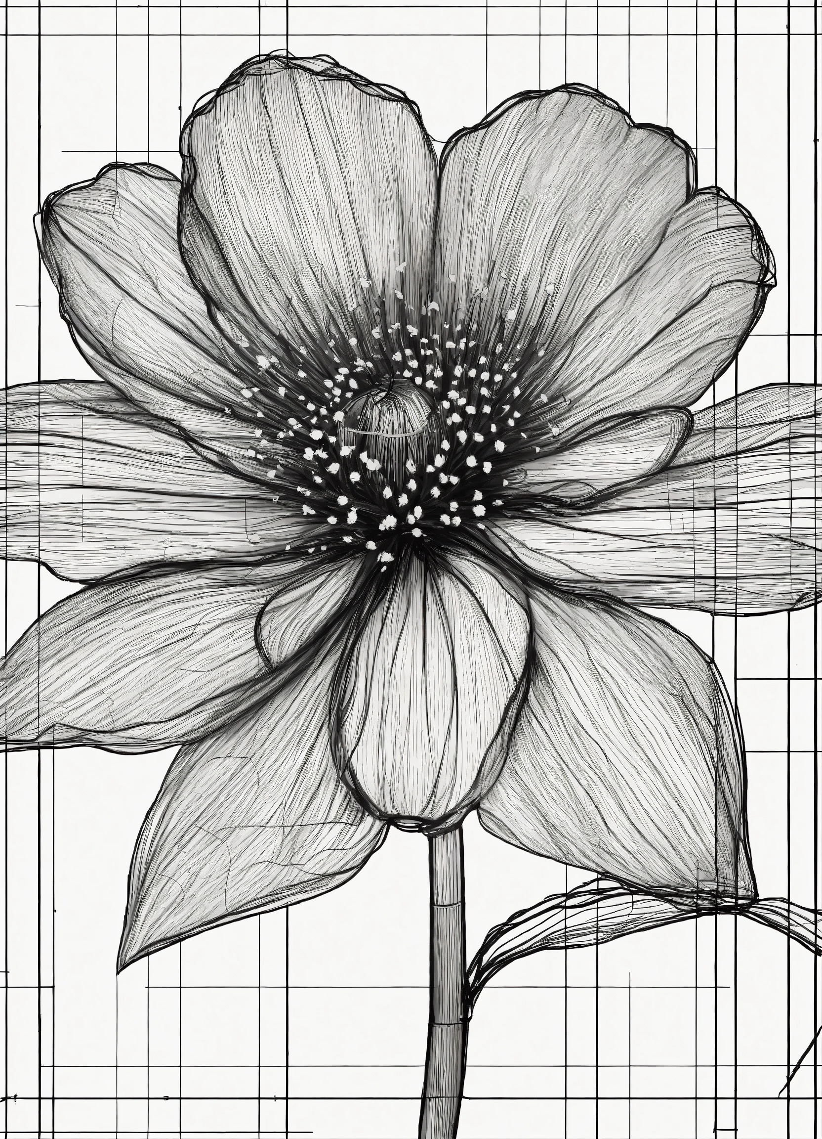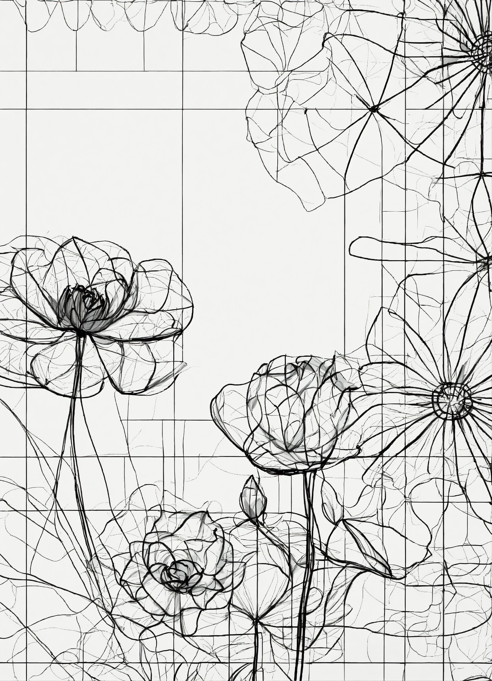Create a sketch of wireframe flower silhouette, black, single lines as a grid on a white background, filling the entire silhouette