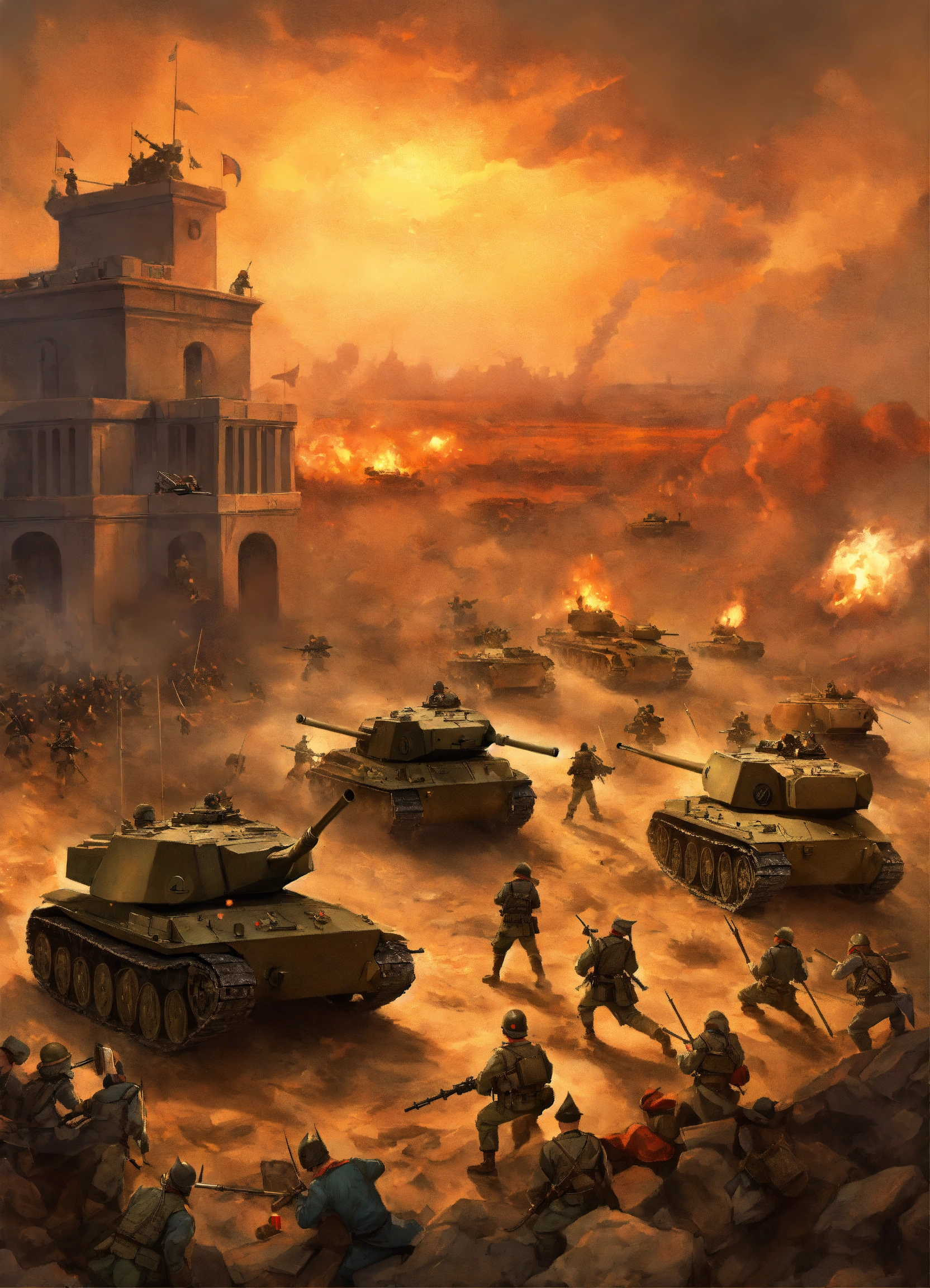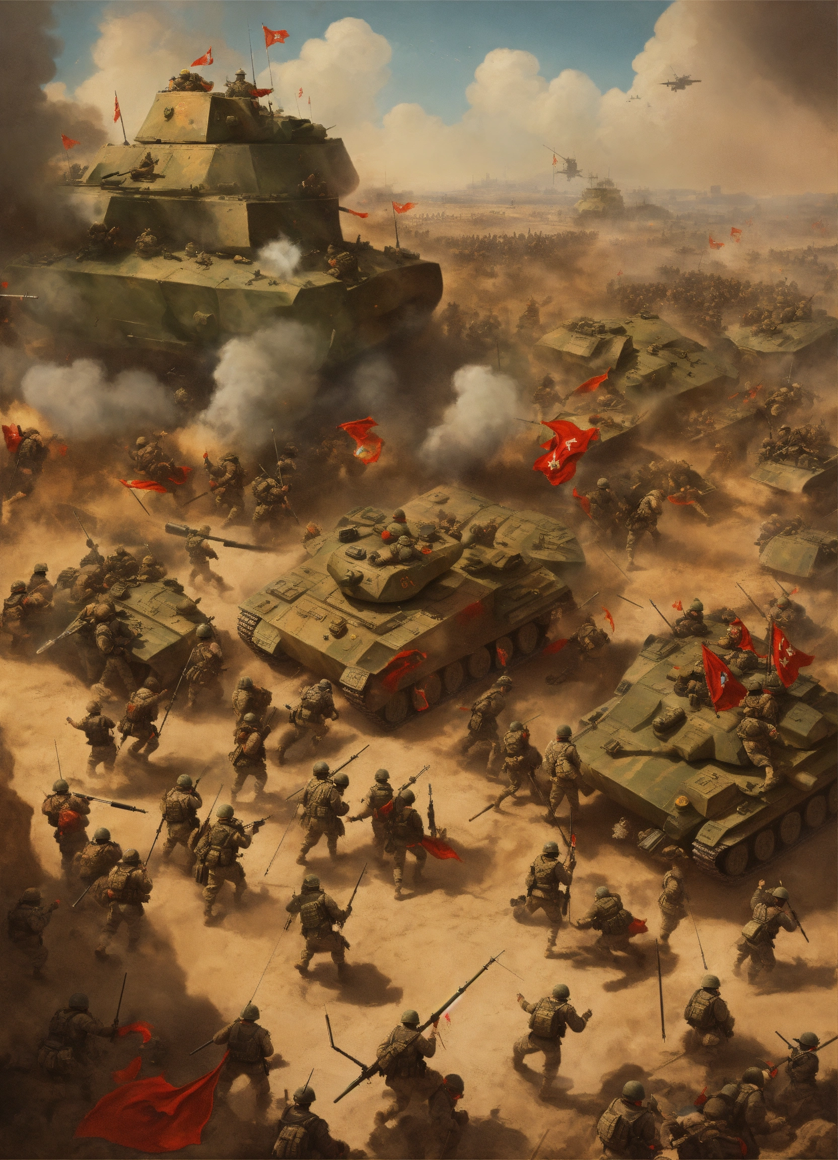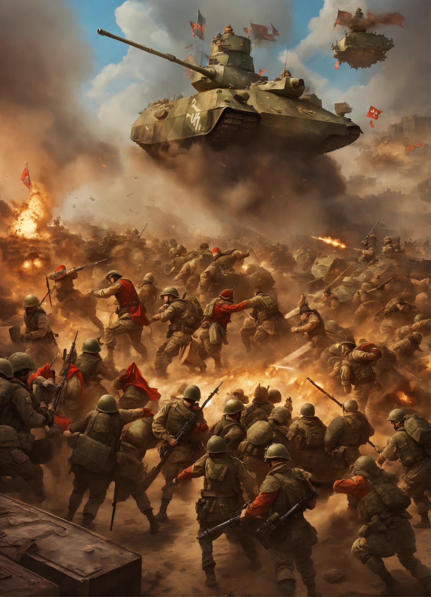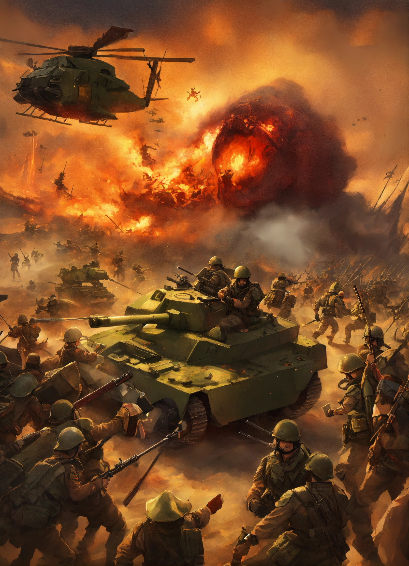A battle is going on, lots of soldiers and tanks, on the top right corner stands god, on the top left corner stands the devil, the 2 are playing dice
