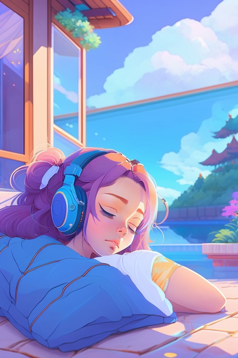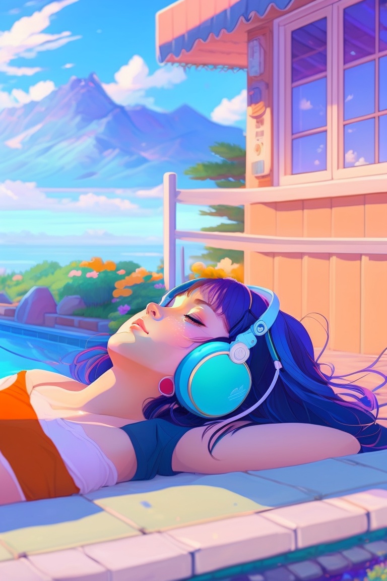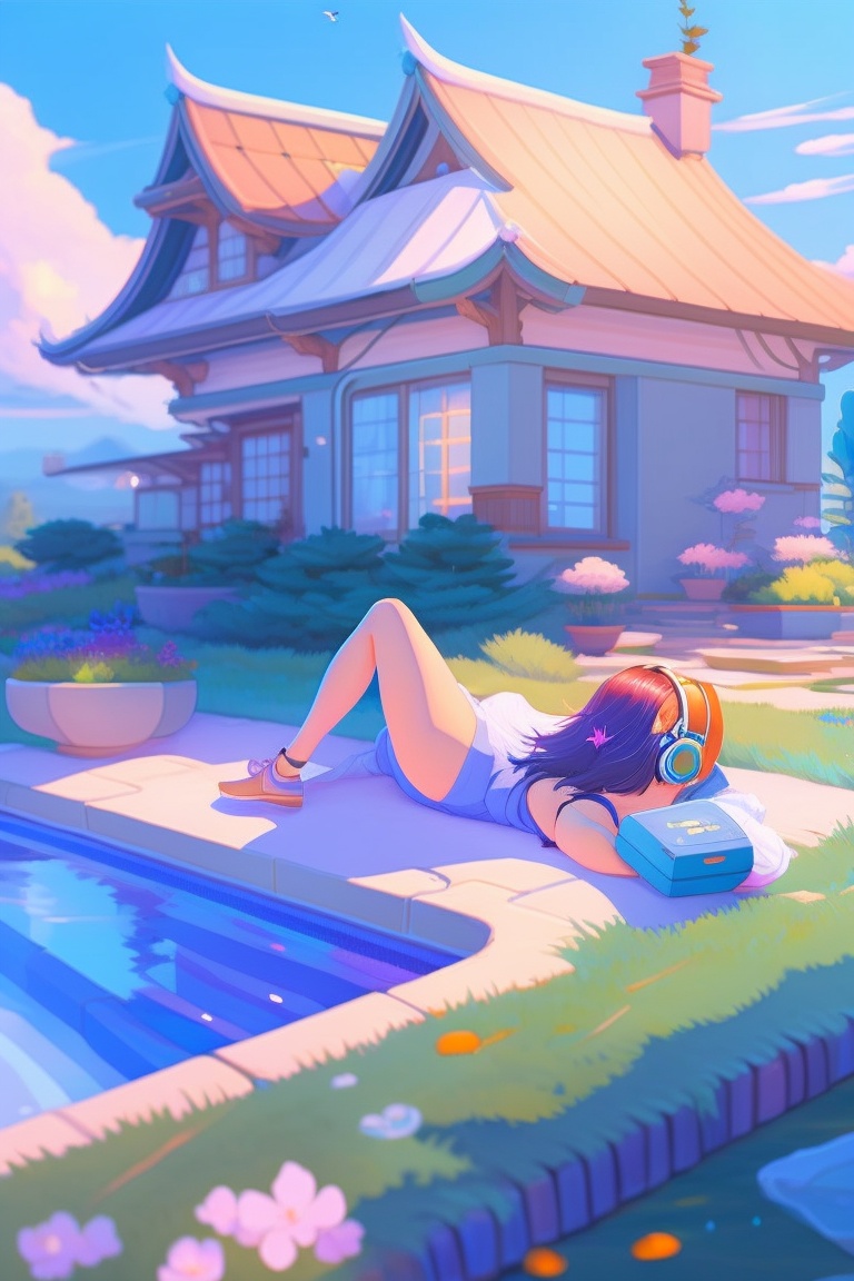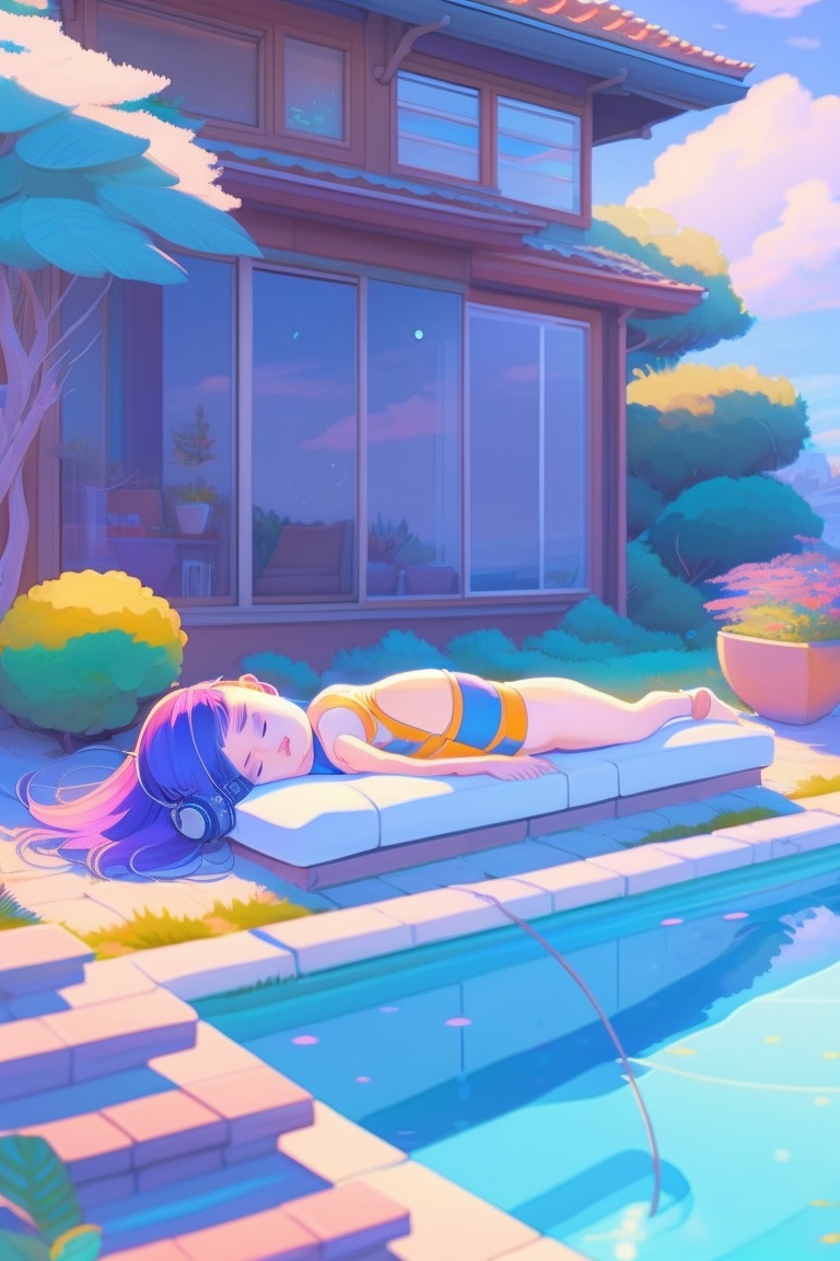 Anime girl laying down (sleeping with streched arms and legs) on her house backyard towards sky with closed eyes wearing headphones next to swimming pool, listening to lofy music waering headphones with closed eyes, with cold colors background, hyper detailed painting, style of laurie greasley, studio ghibli, devinart, trending on artstation, low details in landscape mode 16:9 ratio akira toriyama, 4k, vibrant colors, generate image in landscape mode in 16:9 ration