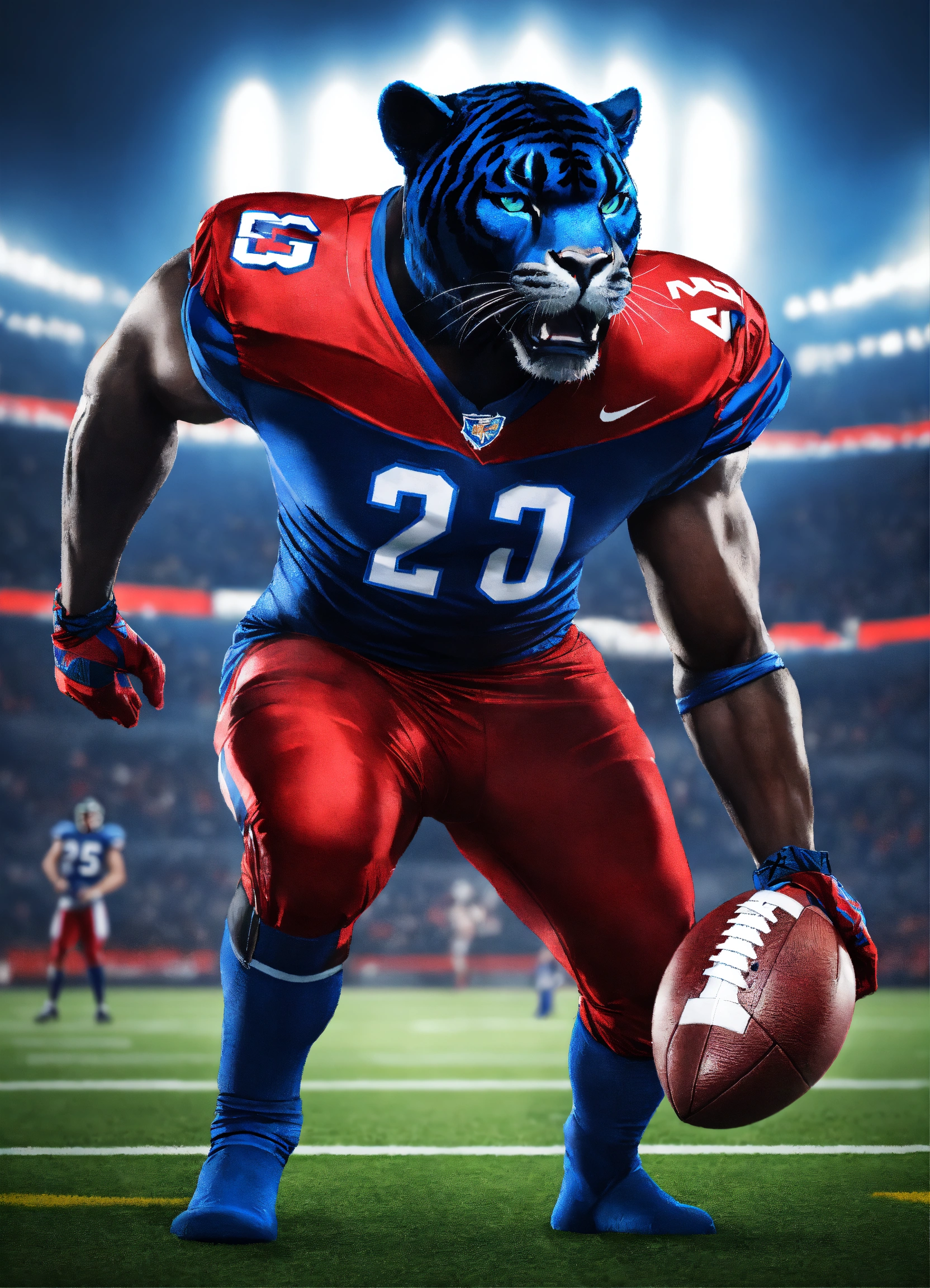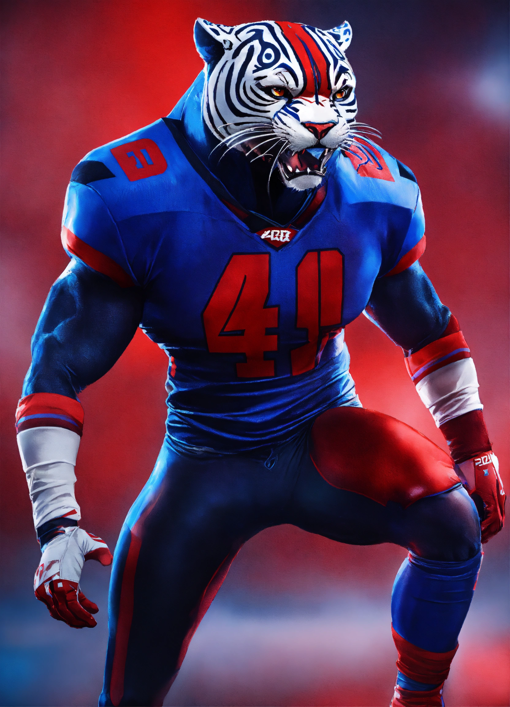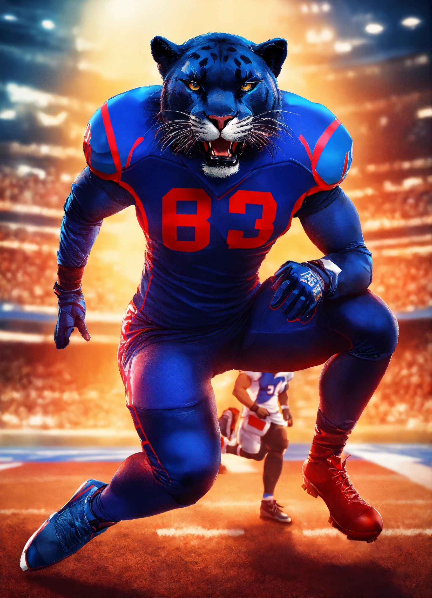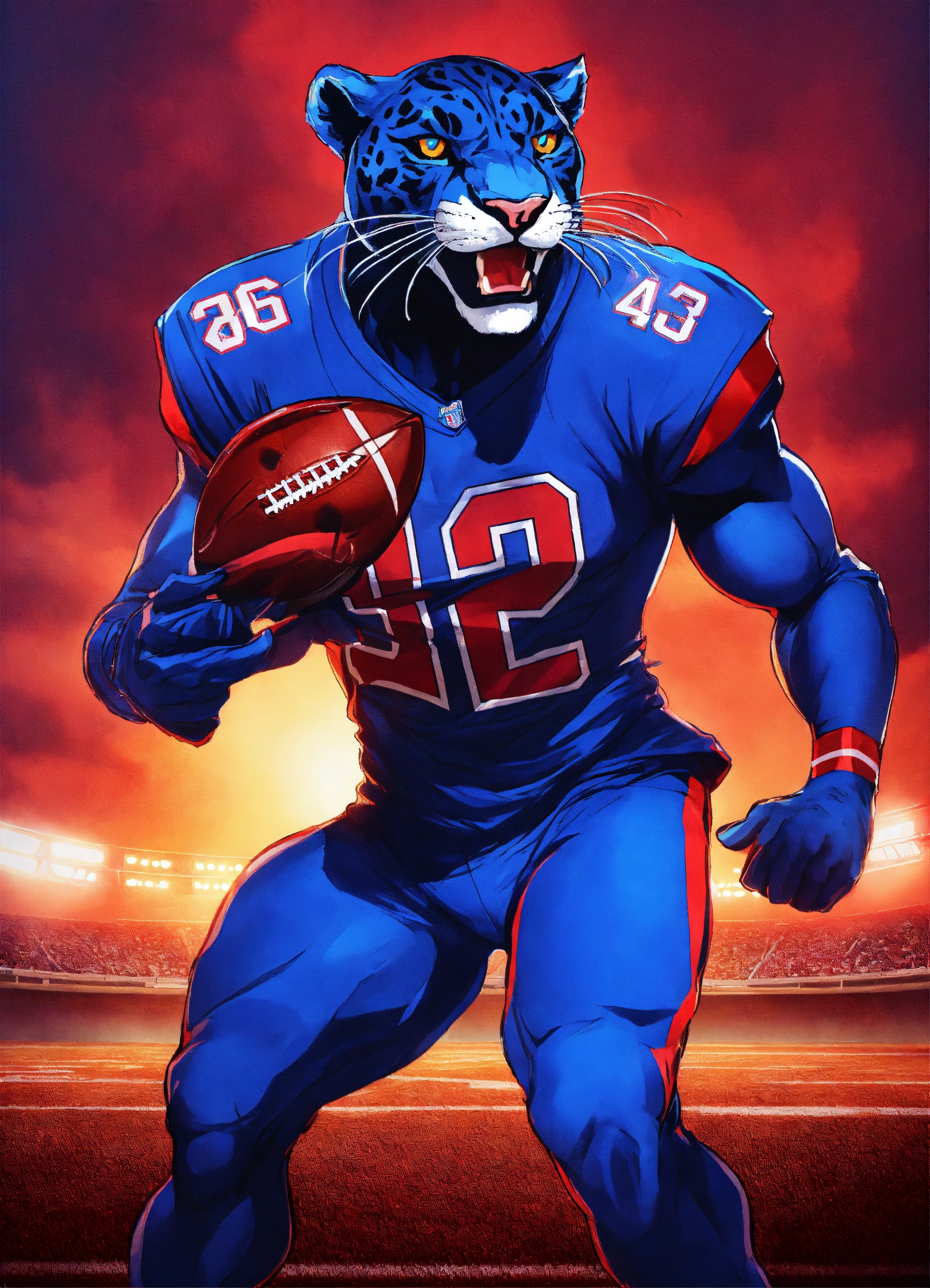 An image of a panther mascot dressed as a football athlete, without helmet, in the style of dark azure and crimson, red and royal blue, savagepunk, ultra hd, red and blue --ar 2332