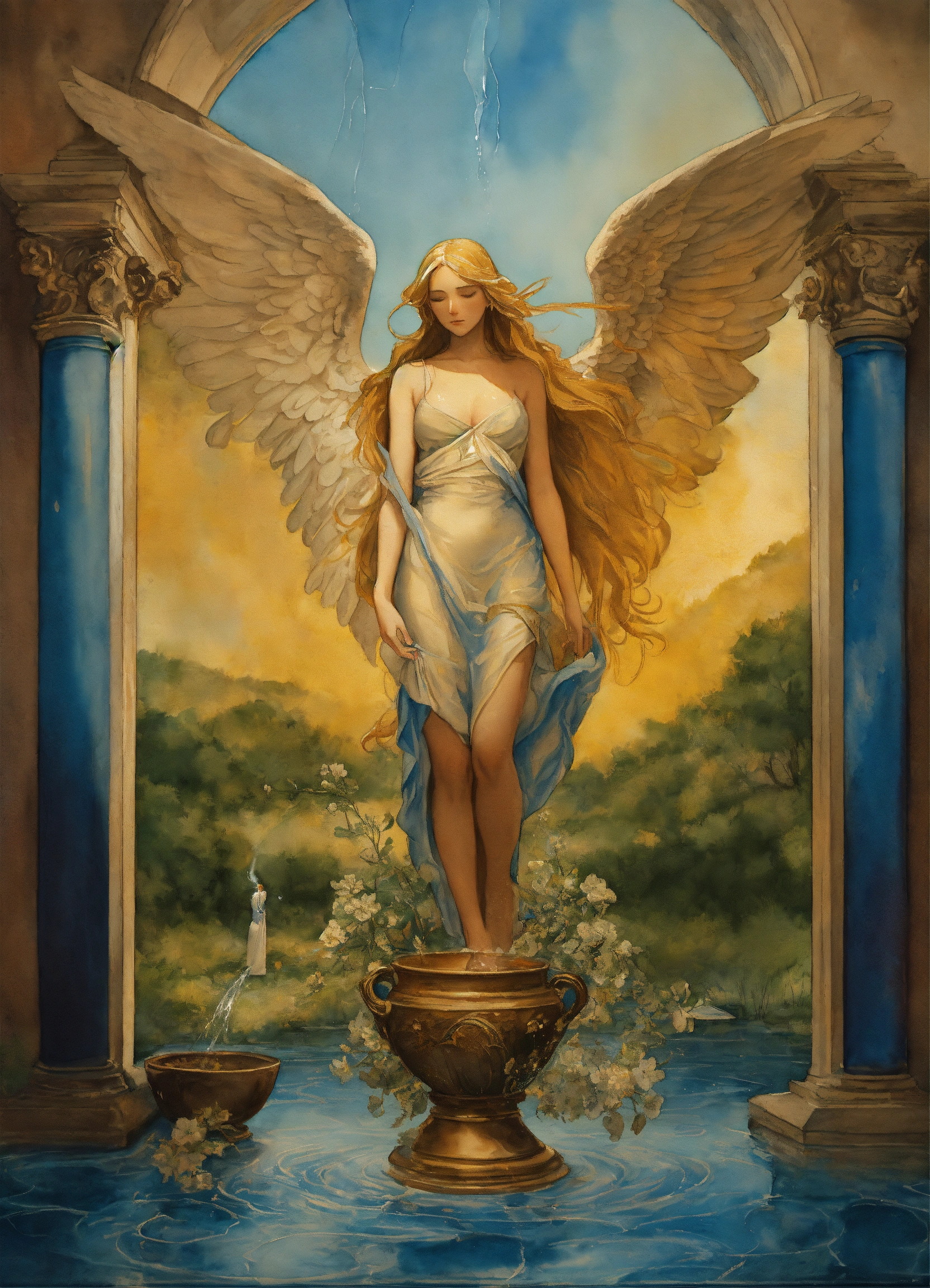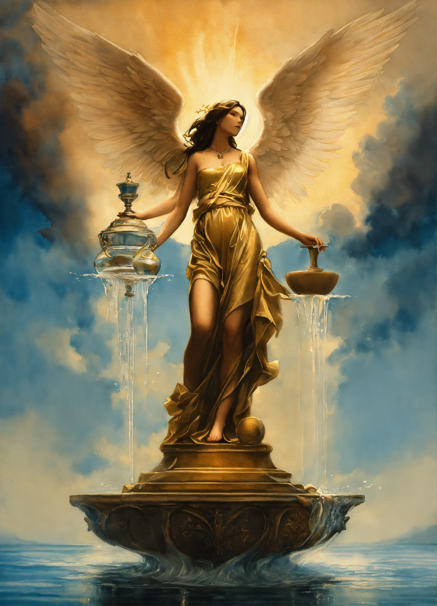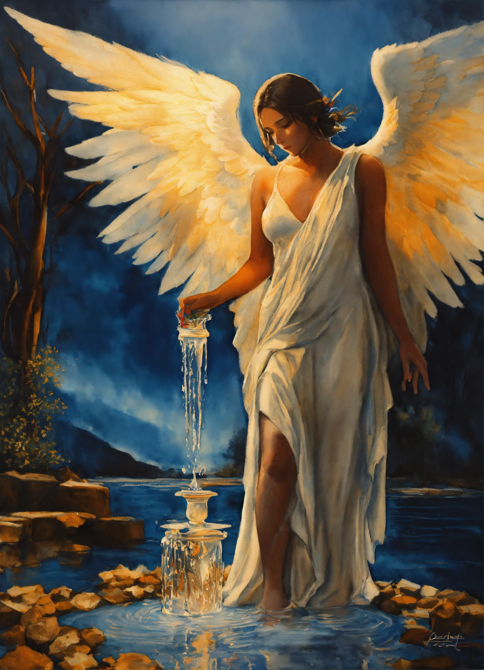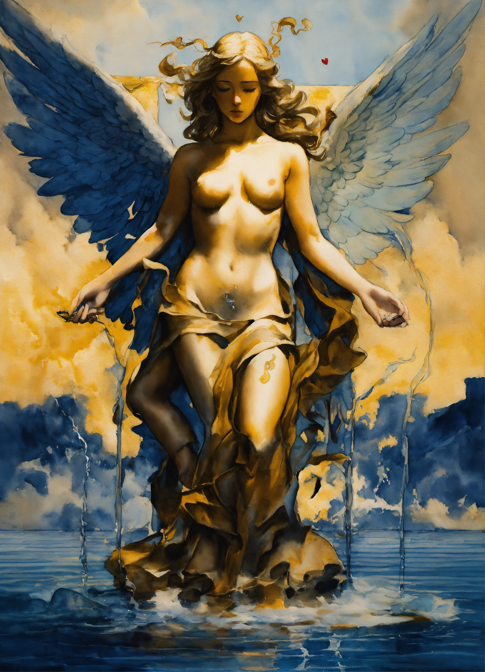 Blend of two styles (1, 2) 1. graphite art to meticulously capture the raw emotion and depth of the narrative. watercolor splatter reflecting the passionate and tumultuous relationship with faith, love, and sacrifice. 2. noir art emphasizing the duality of sin and salvation, devotion and betrayal. theme the intense struggle of love, faith, and sacrifice, entwined with the concept of worship and the harsh realities of devotion and earthly desires. central imagery an angel pouring water from one vase into another vase. one foot of the angel is partially submerged in the water while the other foot is on the ground. background blue sky juxtaposed with lush, sunlit landscapes symbolizing the radiant presence.