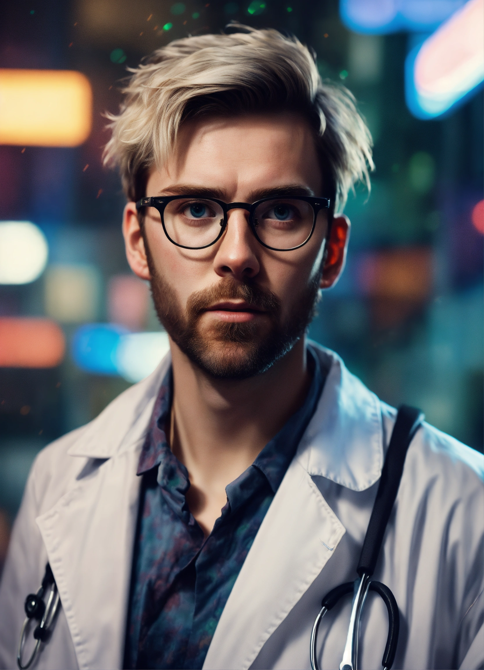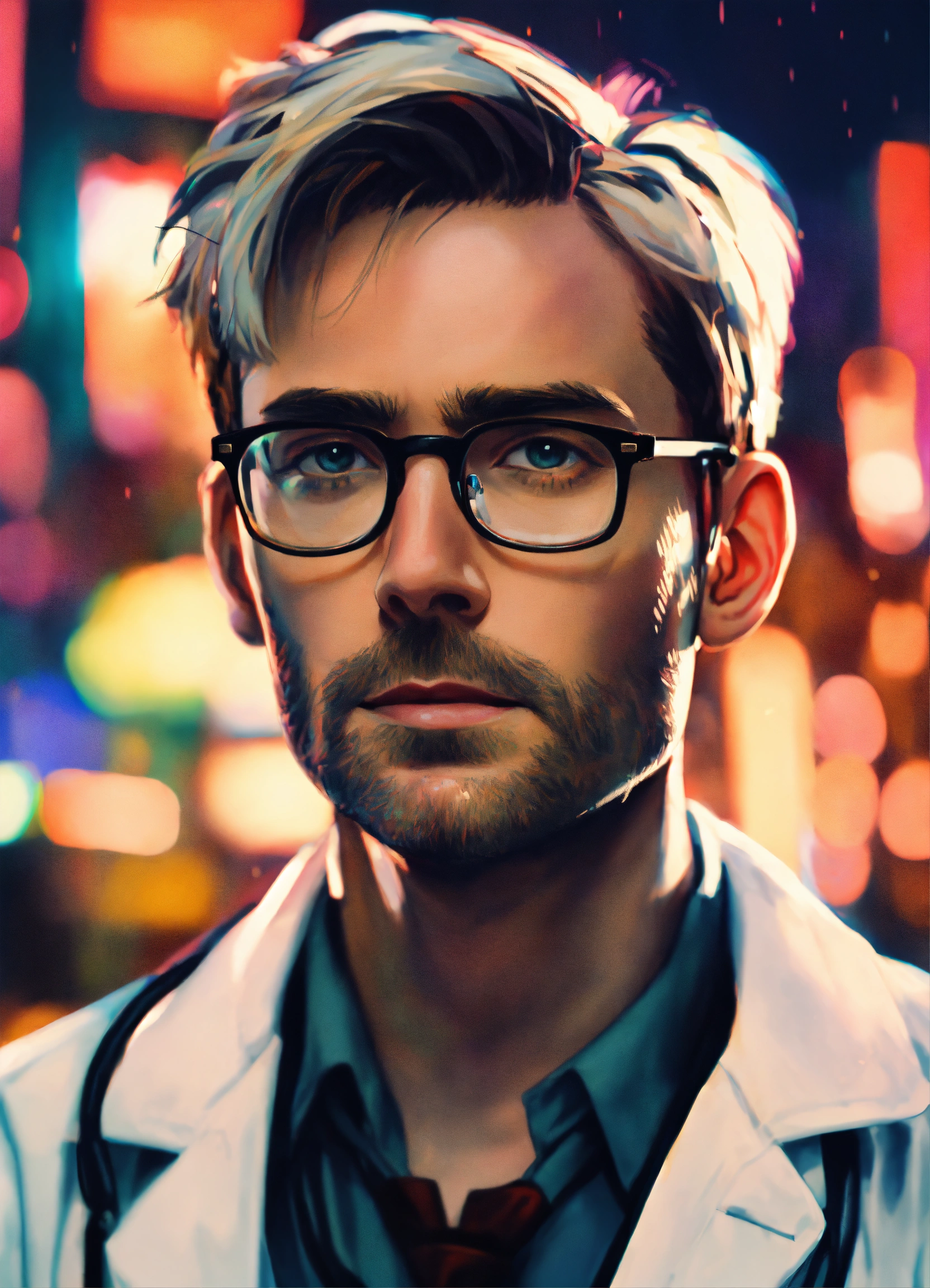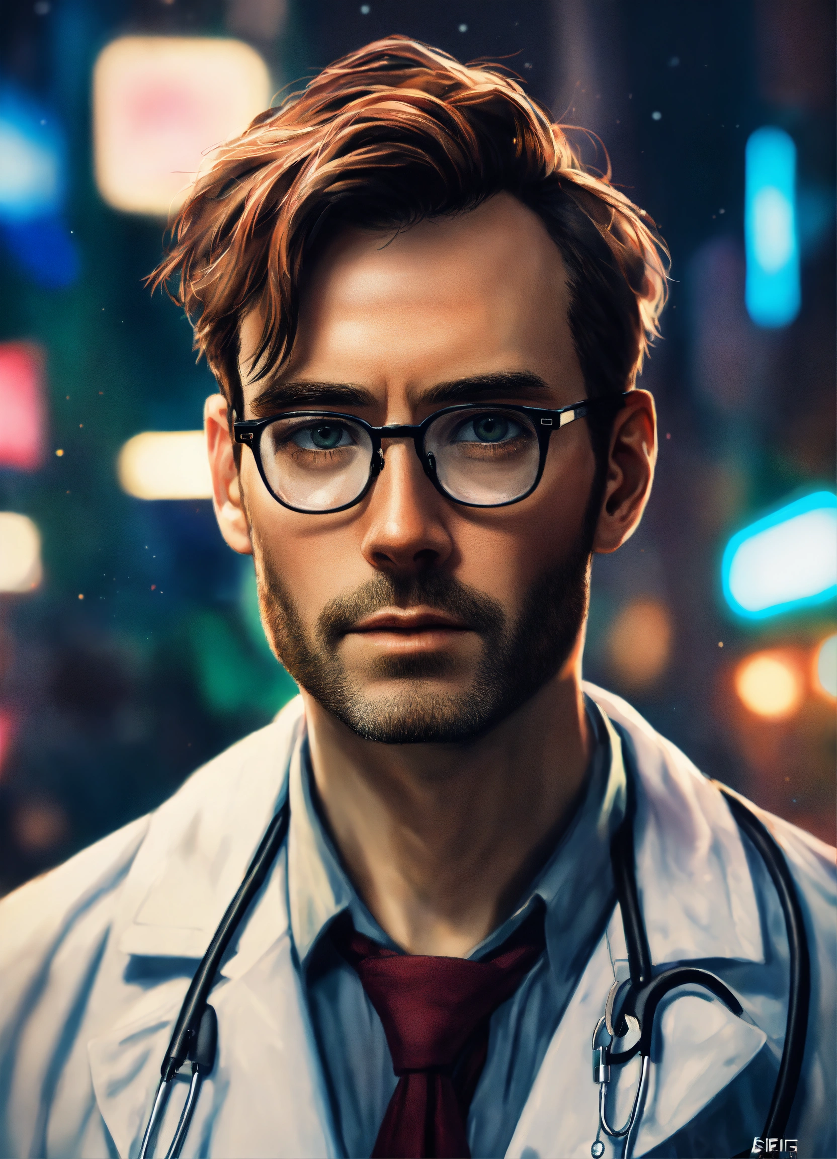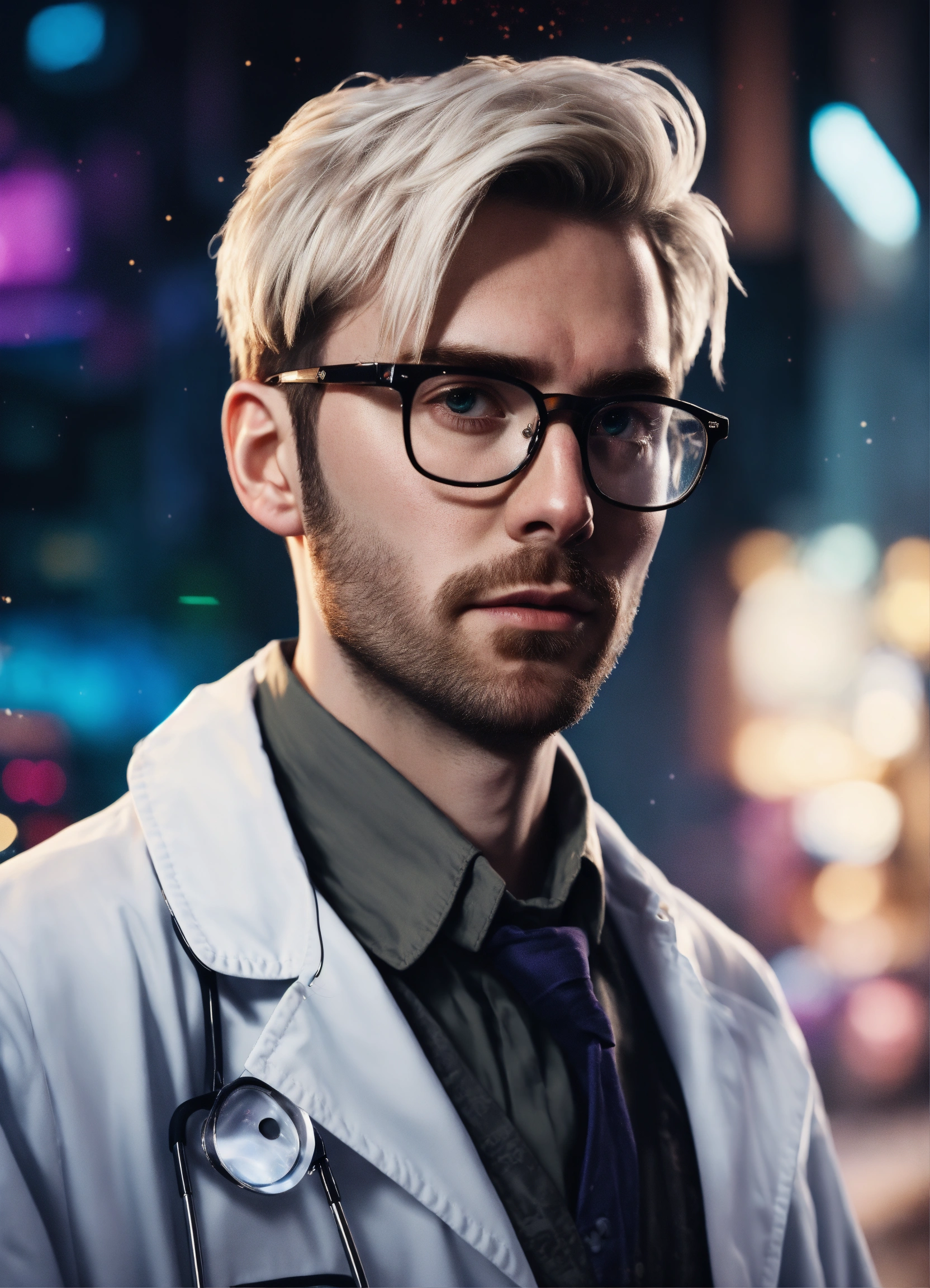 Highly detailed portrait of pale british david tenant, white short hair, cyberpunk, doctor coat, glasses, cartoon realism, black, grunge aesthetic!!! bokeh