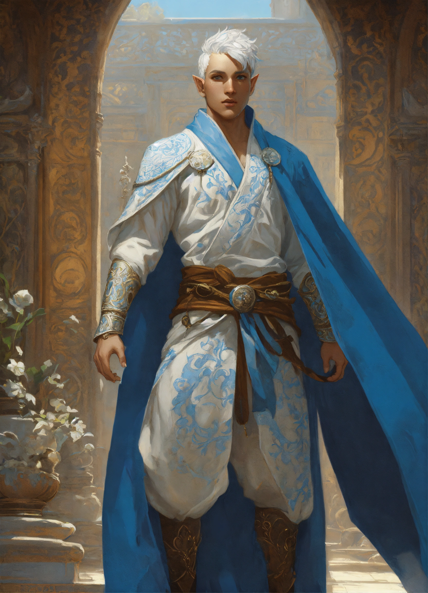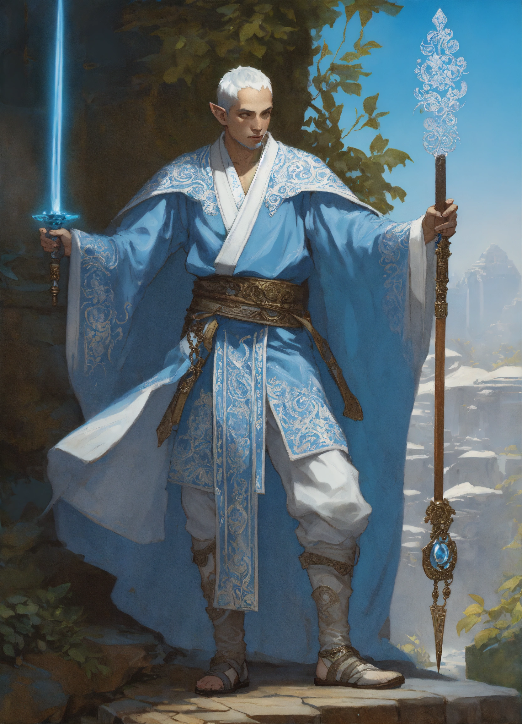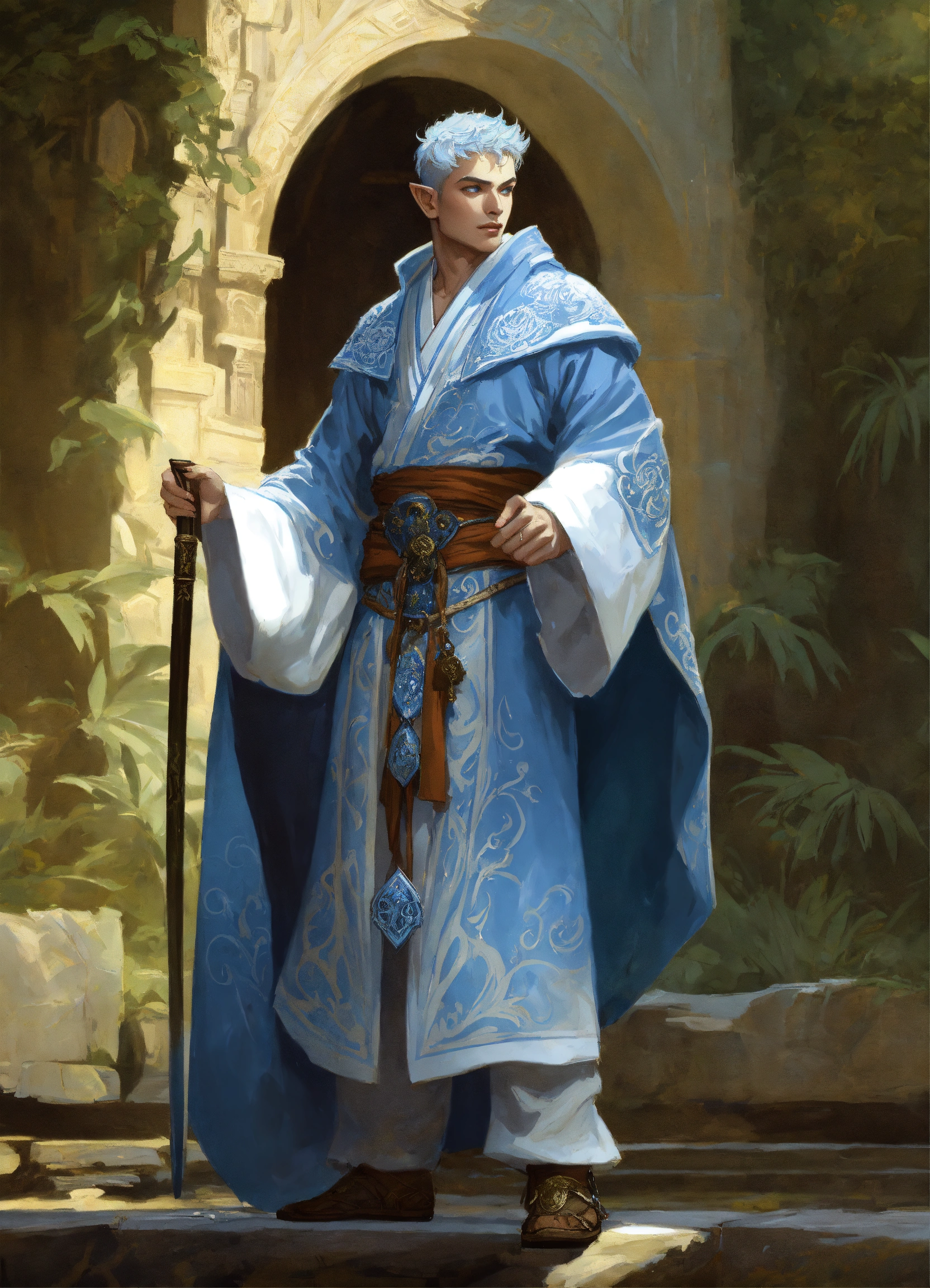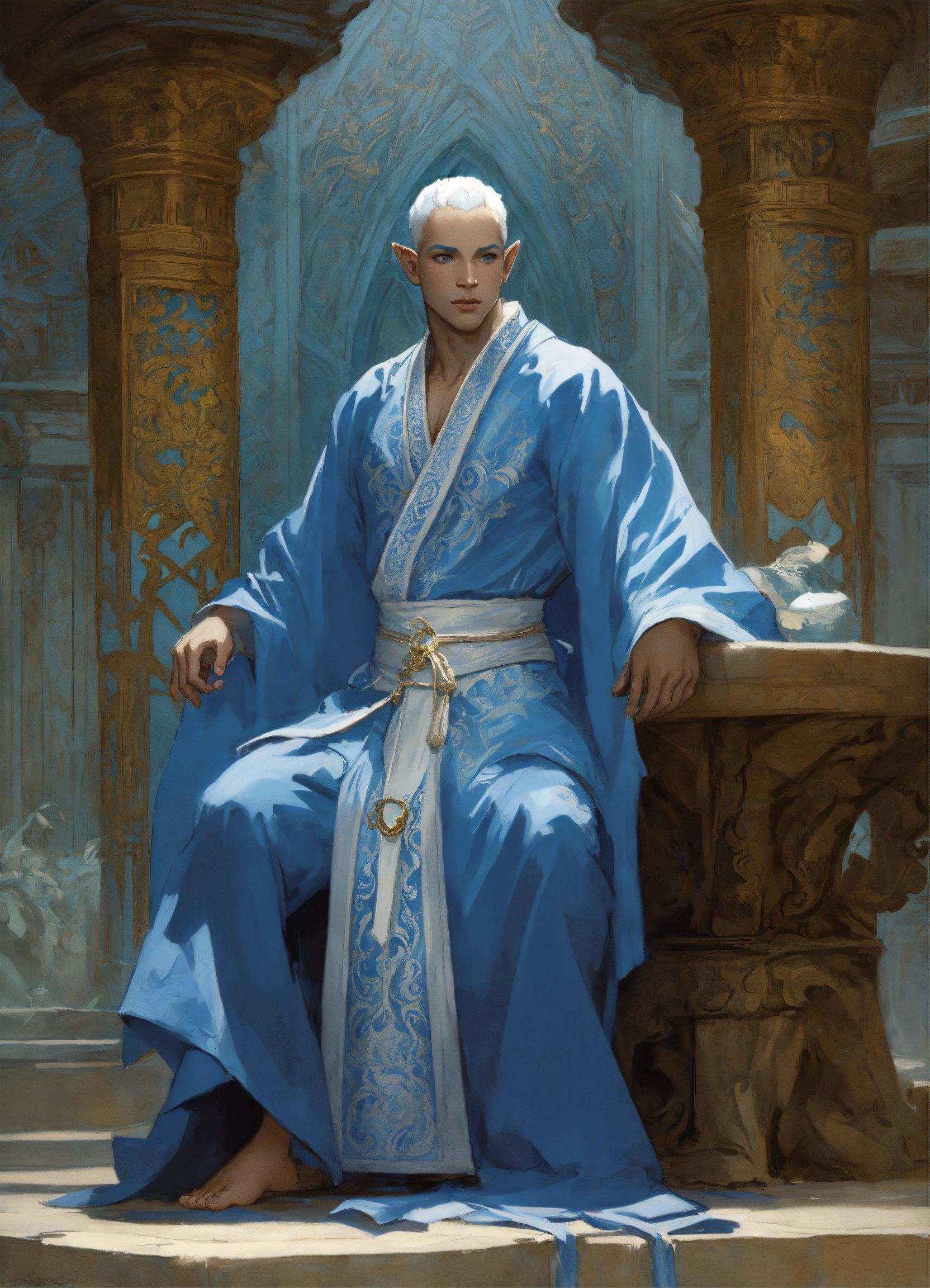 Male elf, ice blue skin color, white white short hair, wearing blue and white monk short robes, concept art, intricate details, highly detailed by greg rutkowski, michael whelan, and gustave dore, alphonso mucha, martial arts, full body