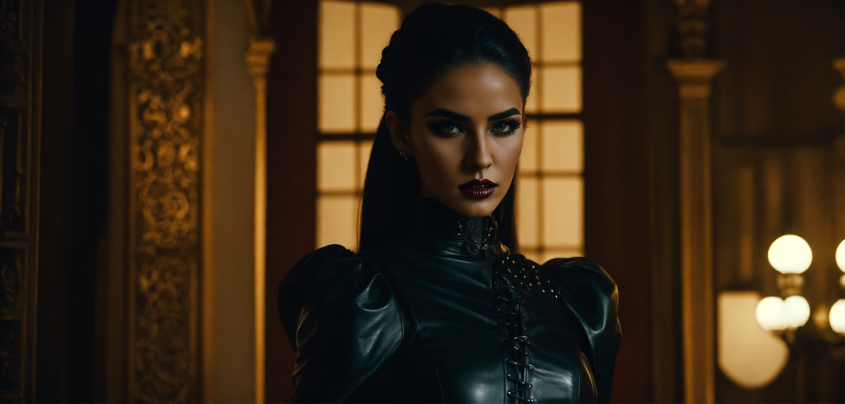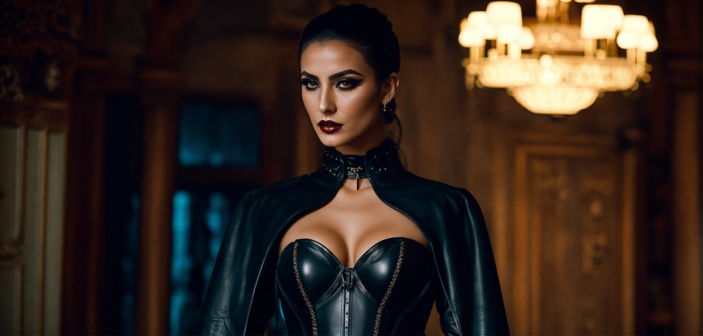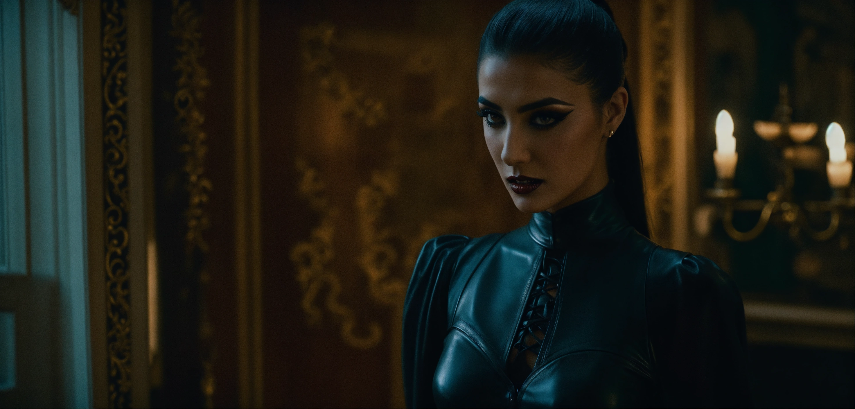 Cinematic vampire underworld movie look, stunning arab woman fashion model, head slightly tilted, looking dominant arrogant, straight black high ponytail hair, eyeliner makeup, strict black leather dress with big long puff sleeves, black leather waist corset, french mansion room by night, haze