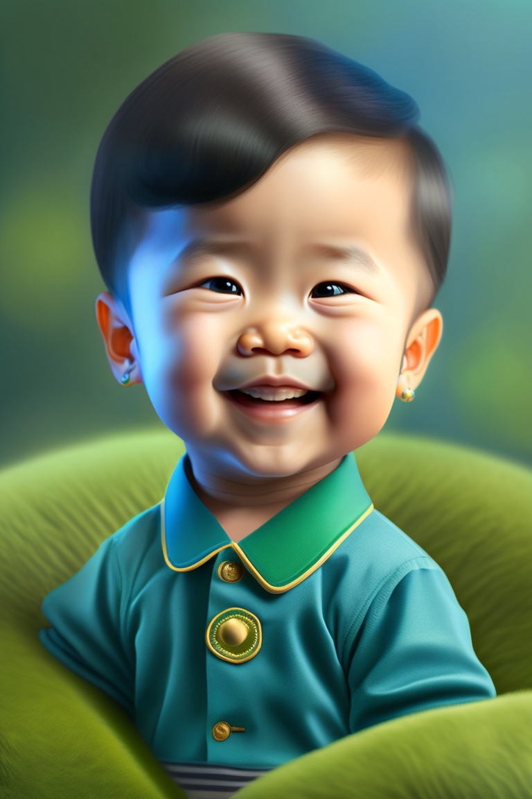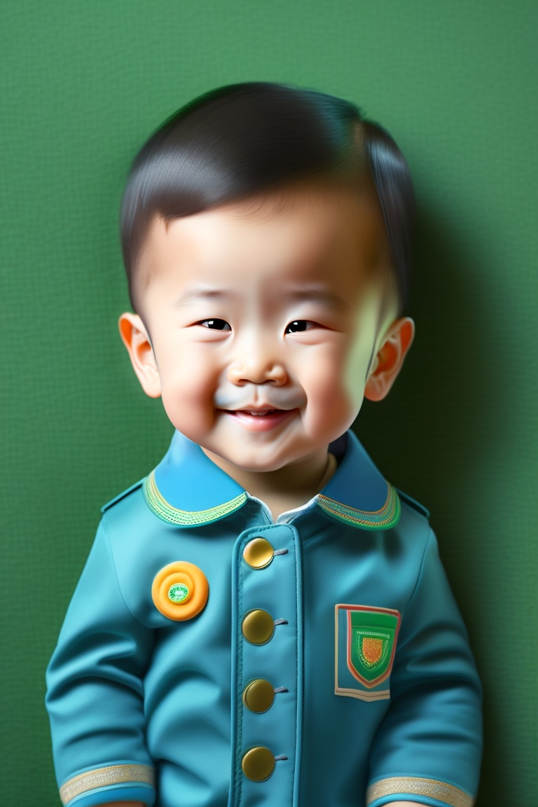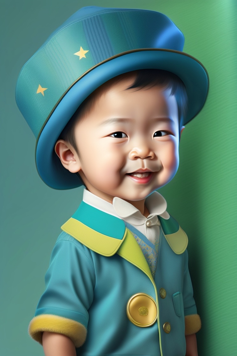 Handsome chinese boy baby, big eyes, double eyelids, high nose bridge, wearing blue clothes, smiling, green background