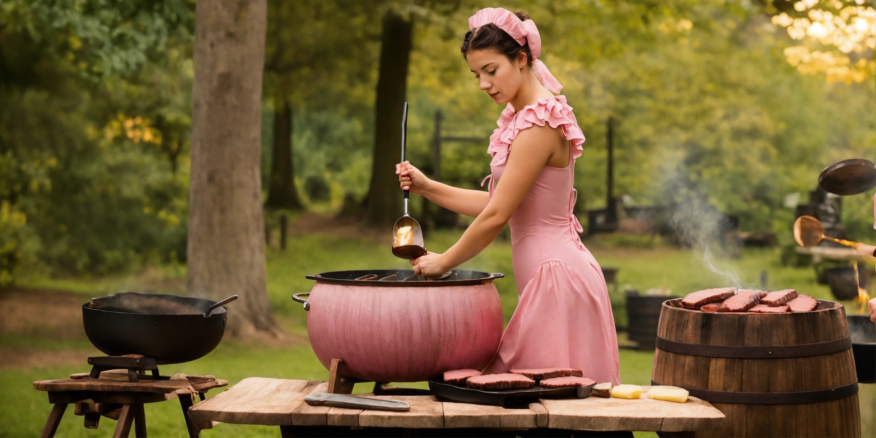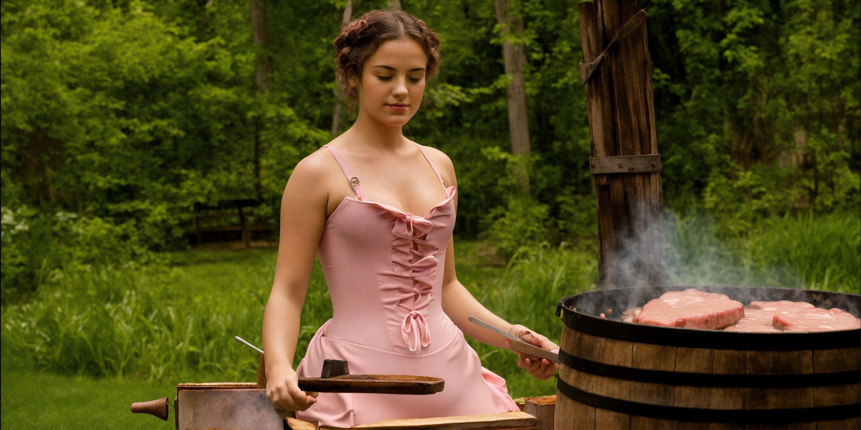 19th century young lady in a pink swimsuit frying steaks on a wooden barrel