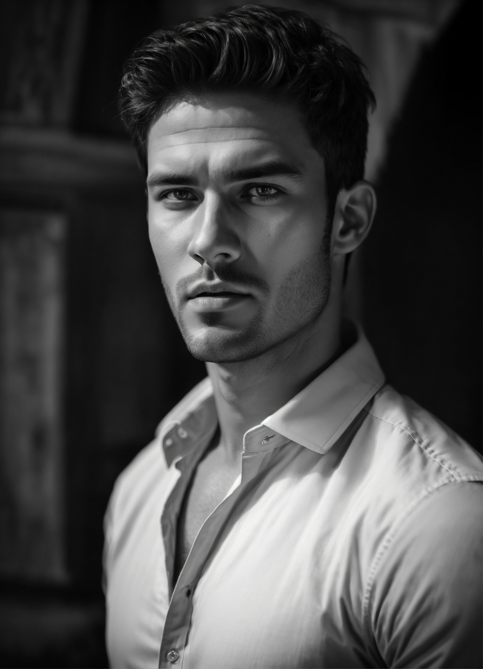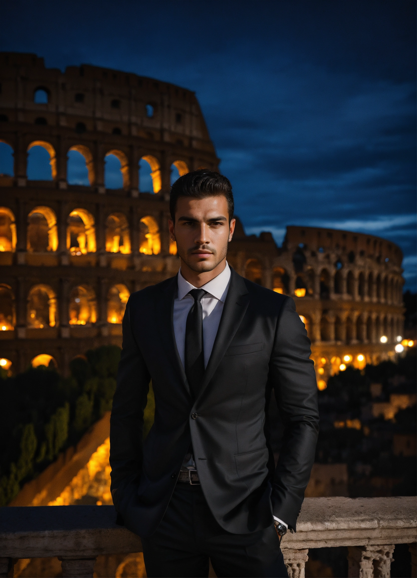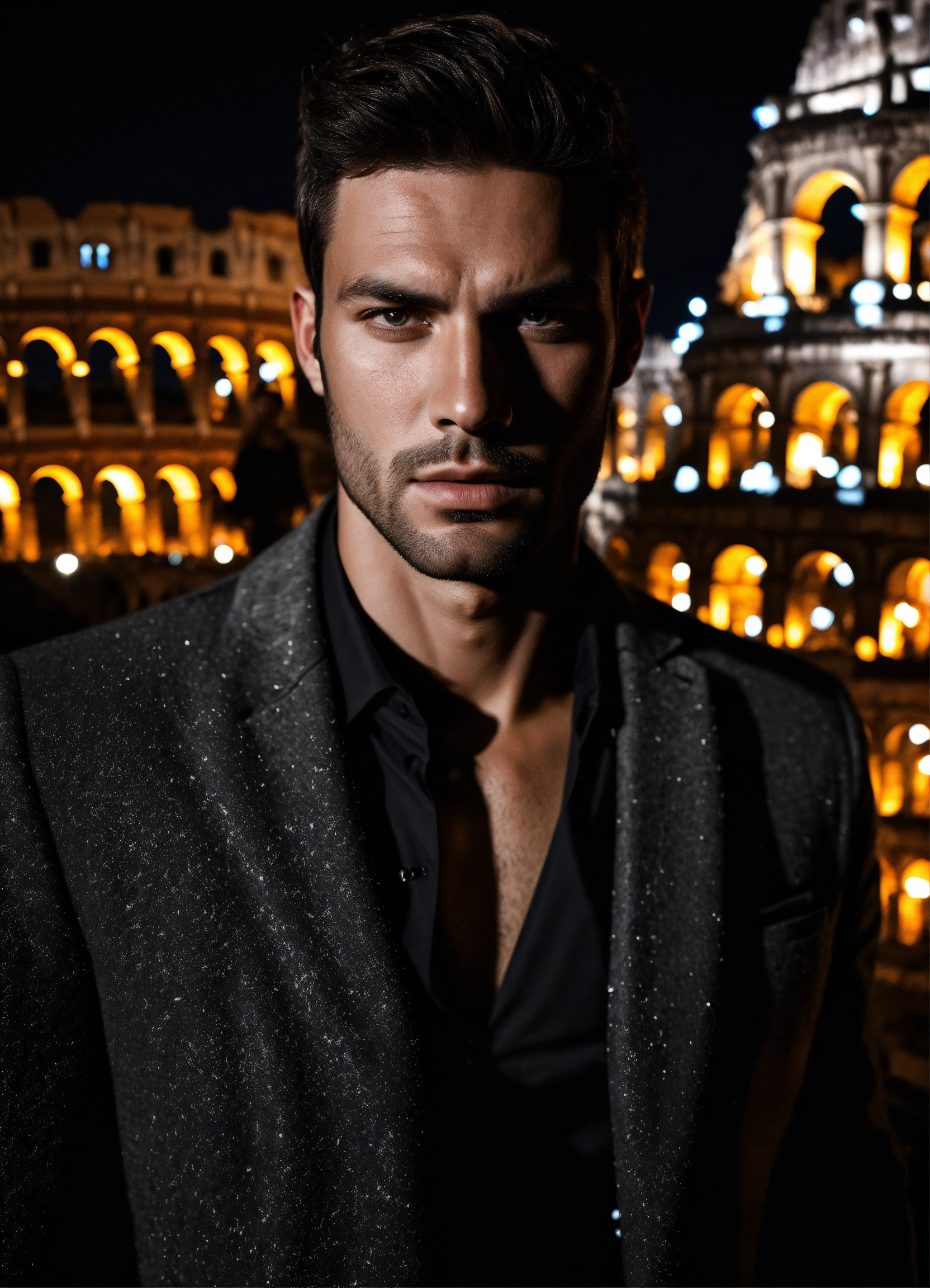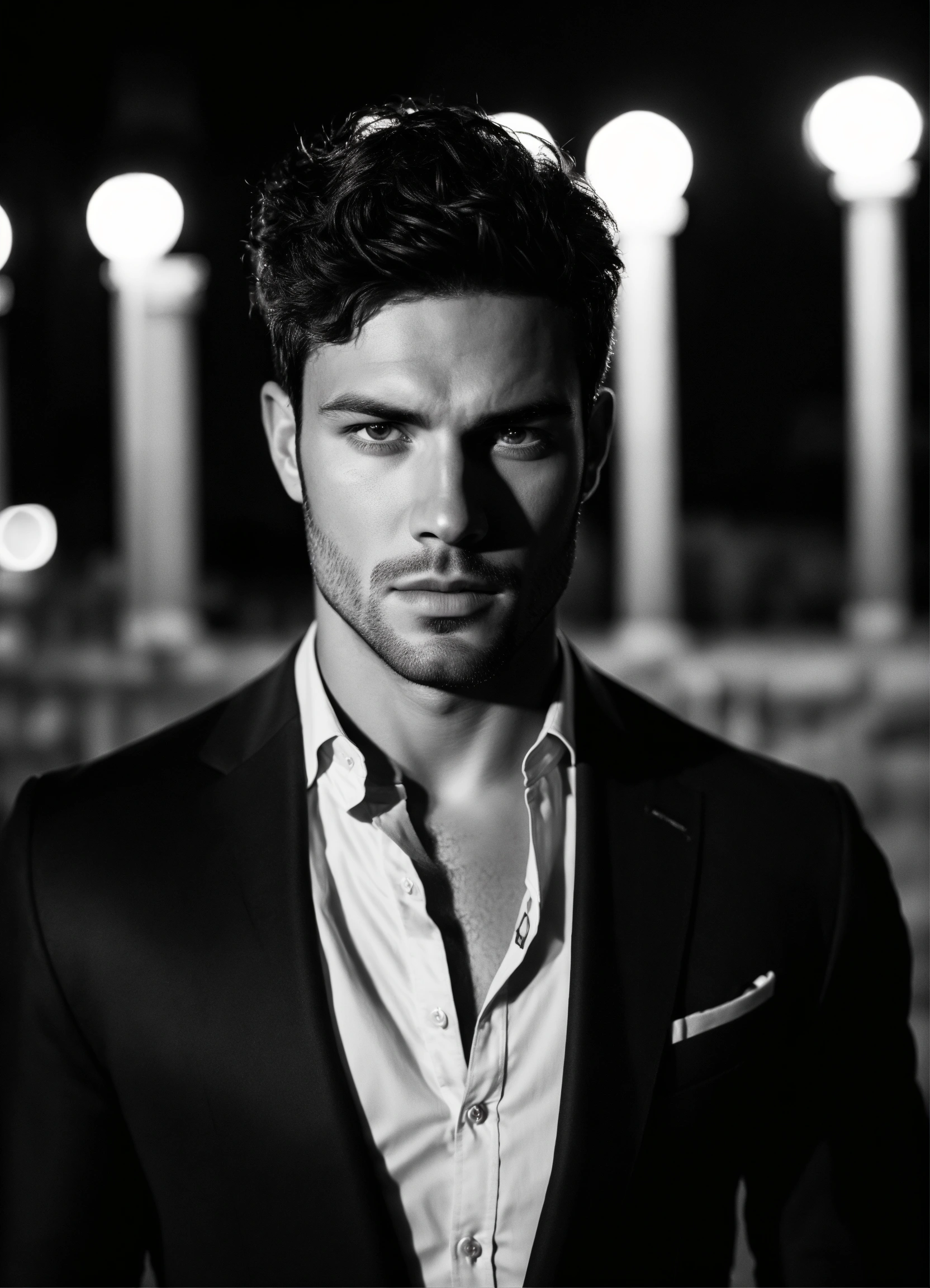 Photo of male model gonçalo teixeira, black and white, realistic, portrait, not painted, very detailed faces, skin with pores, 4k, dark suit, skin not smoothed, desire in the eyes, glowering, looking into the camera, dark shirt. colosseum in rome in full view at night as background