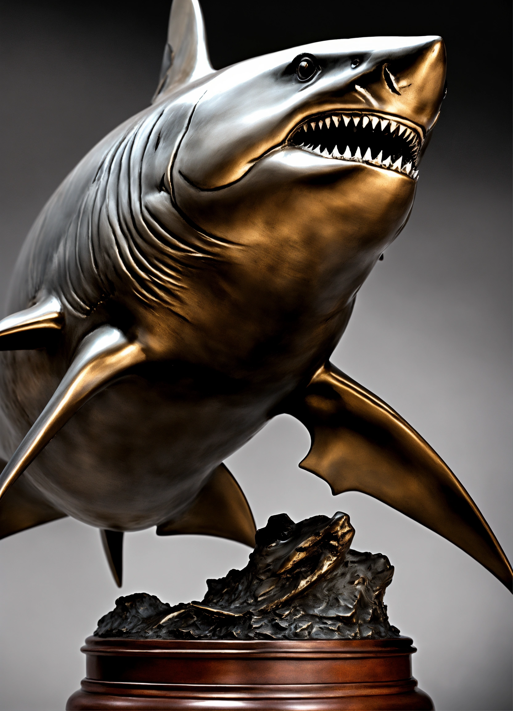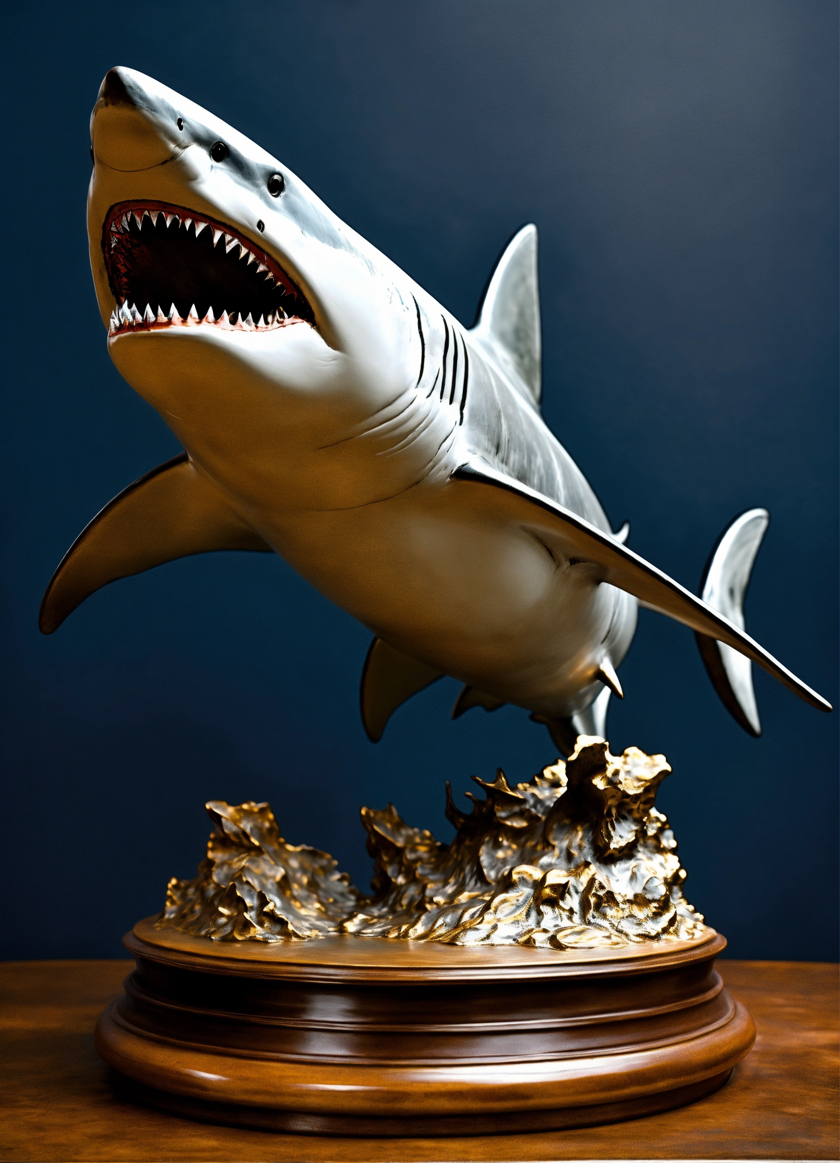 A sculpture of beautiful white shark bronze on top of a base, ultra-mega-realistic in ultra-definition 32k photorealism.