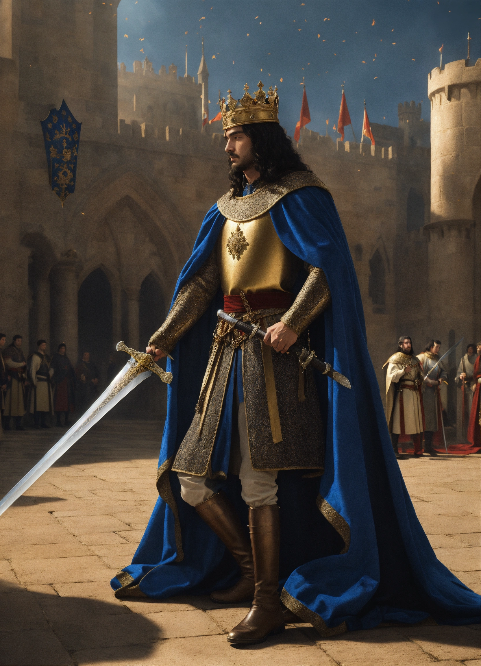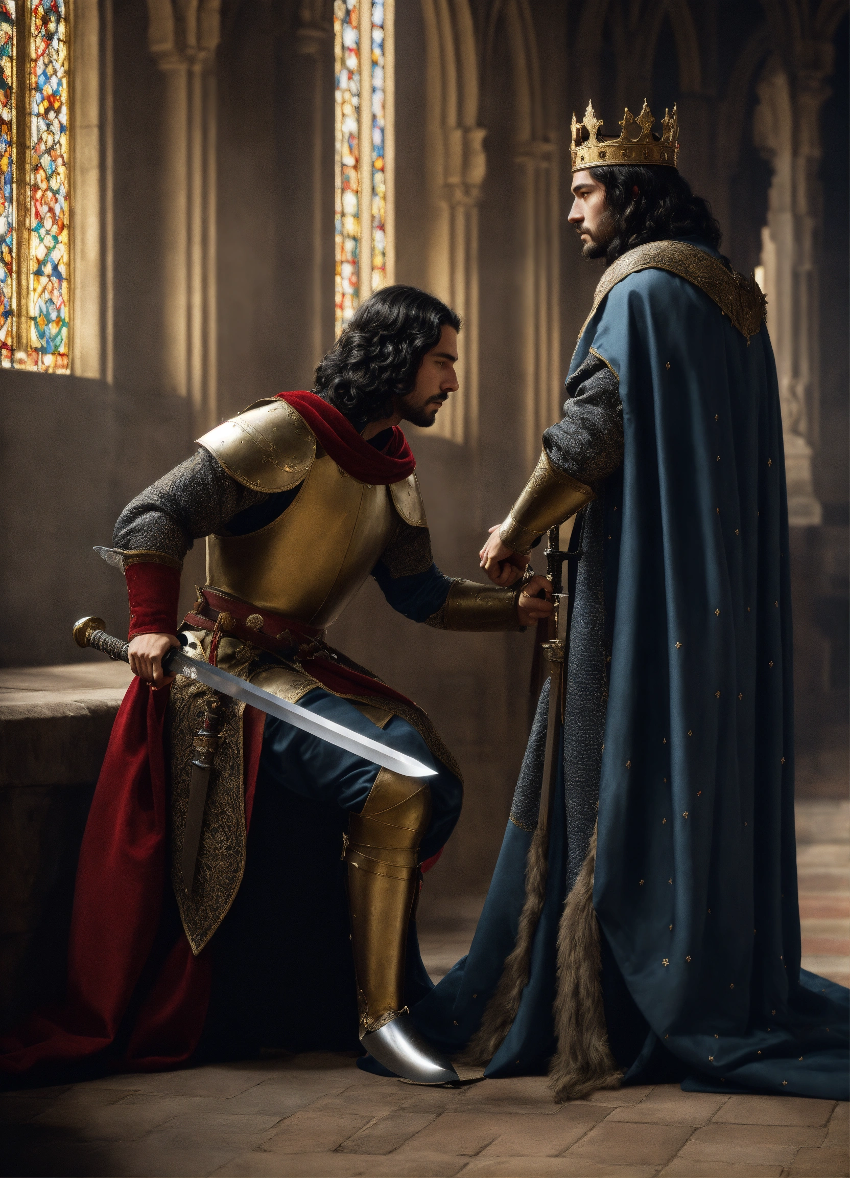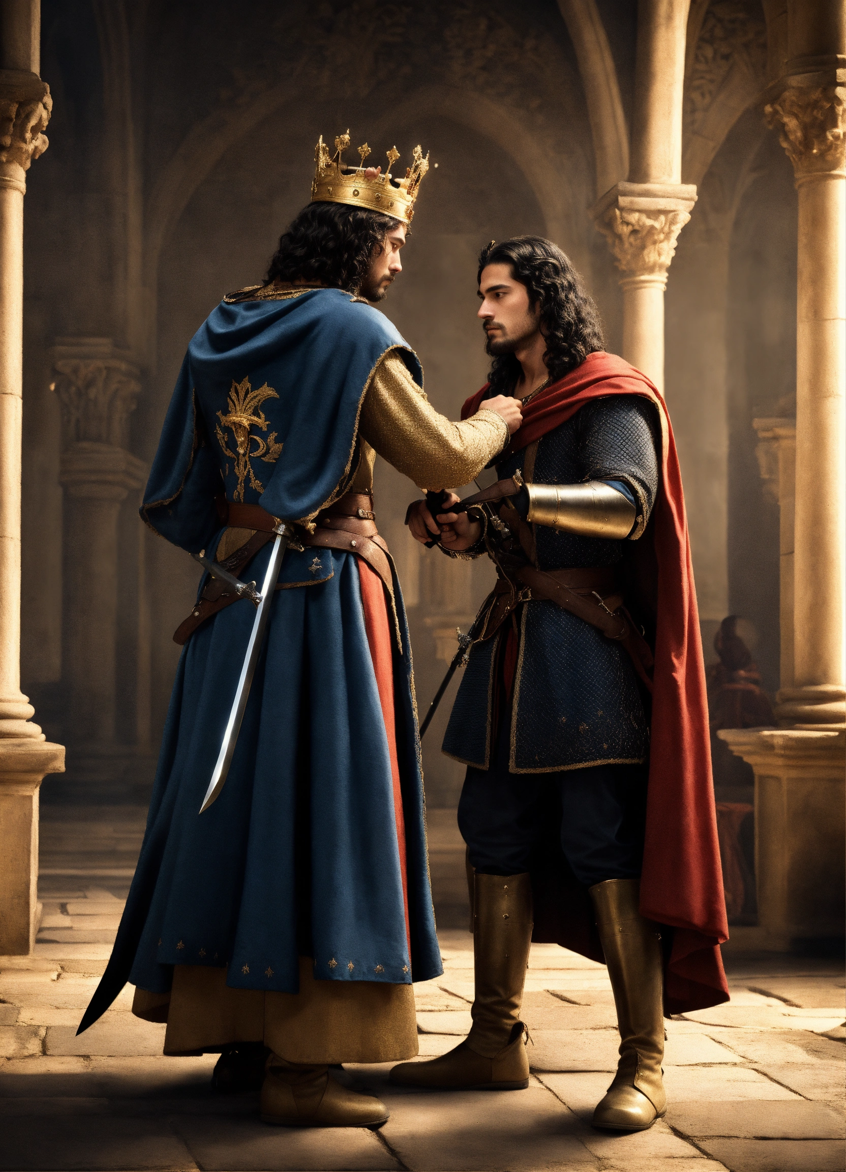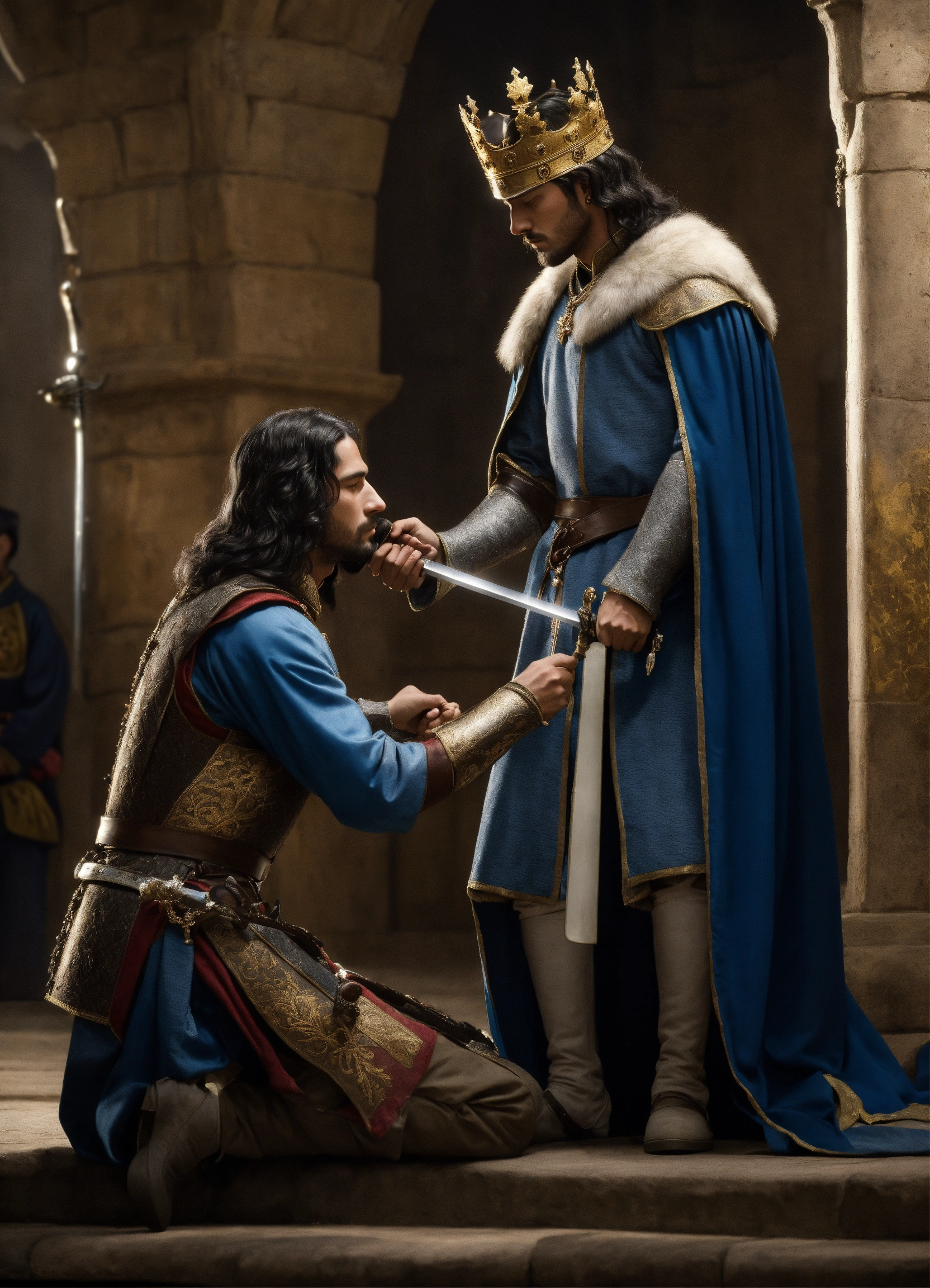 In medieval, the king is around 50 years old, holding a sword with both hands and handling to a prince 18 years old with black long hair that kneels down and accepts the sword, side view, the king wearing a crown with five sword blades, wearing royal clothing with long clothing, side view, photorealistic
