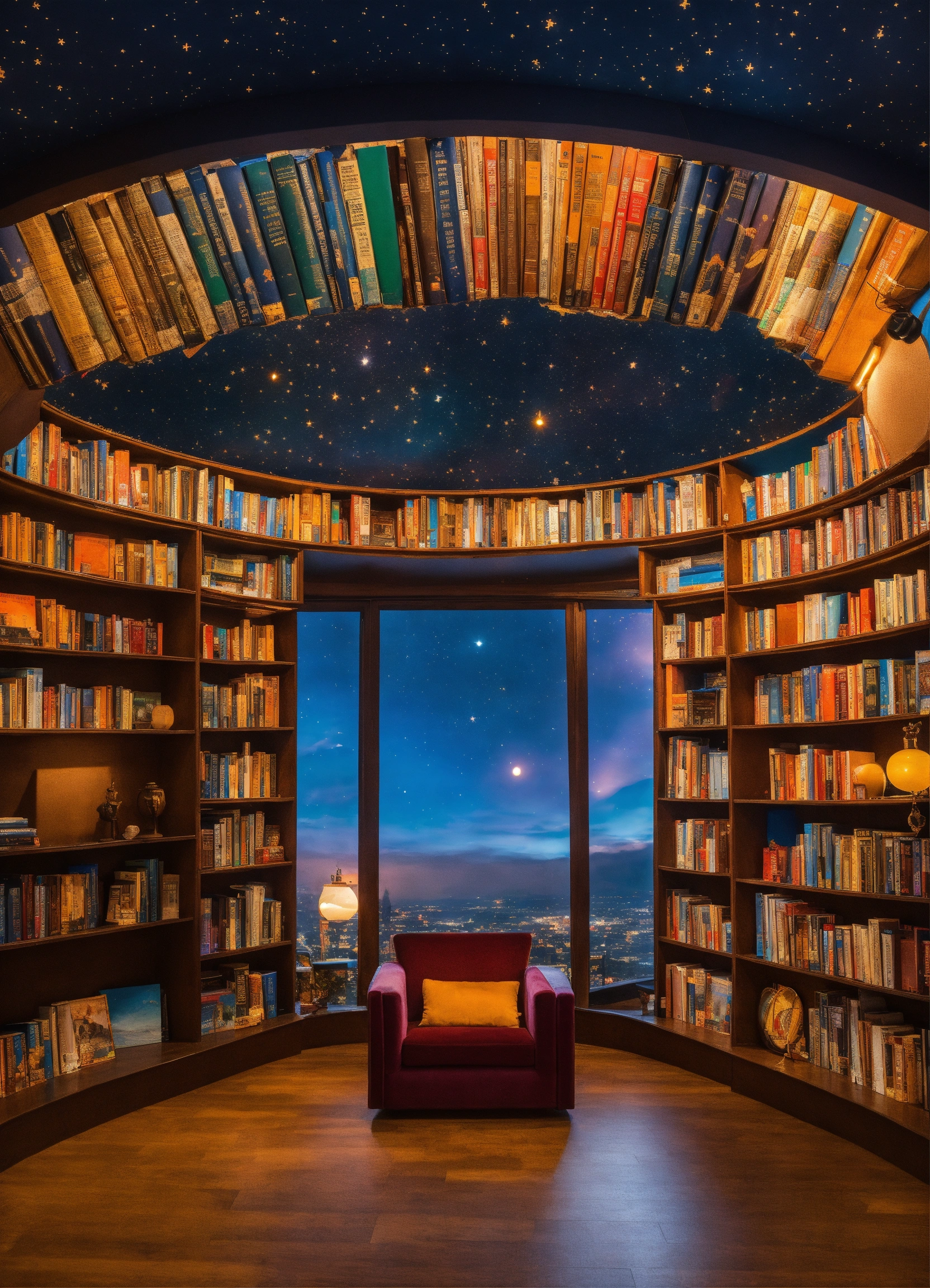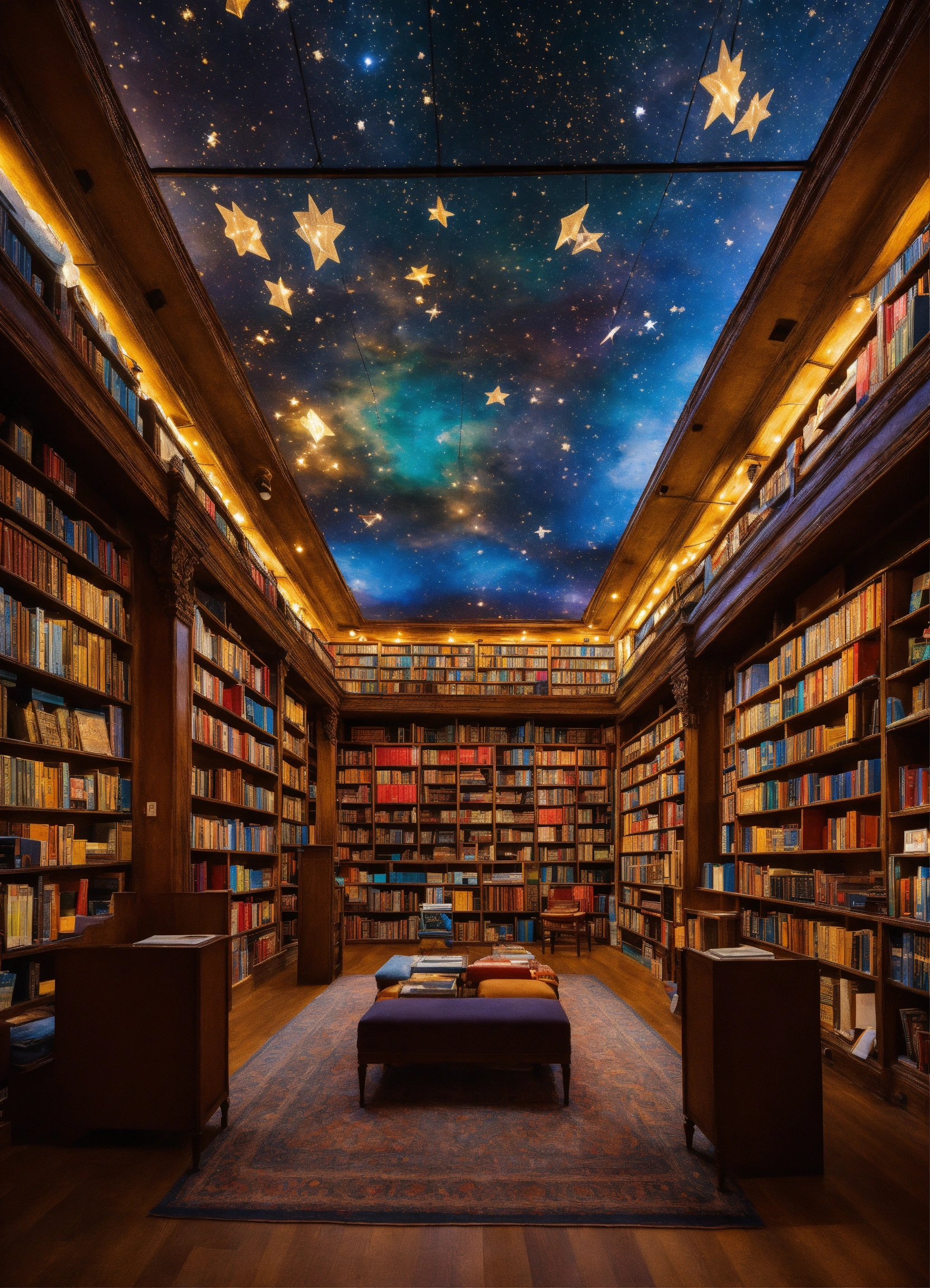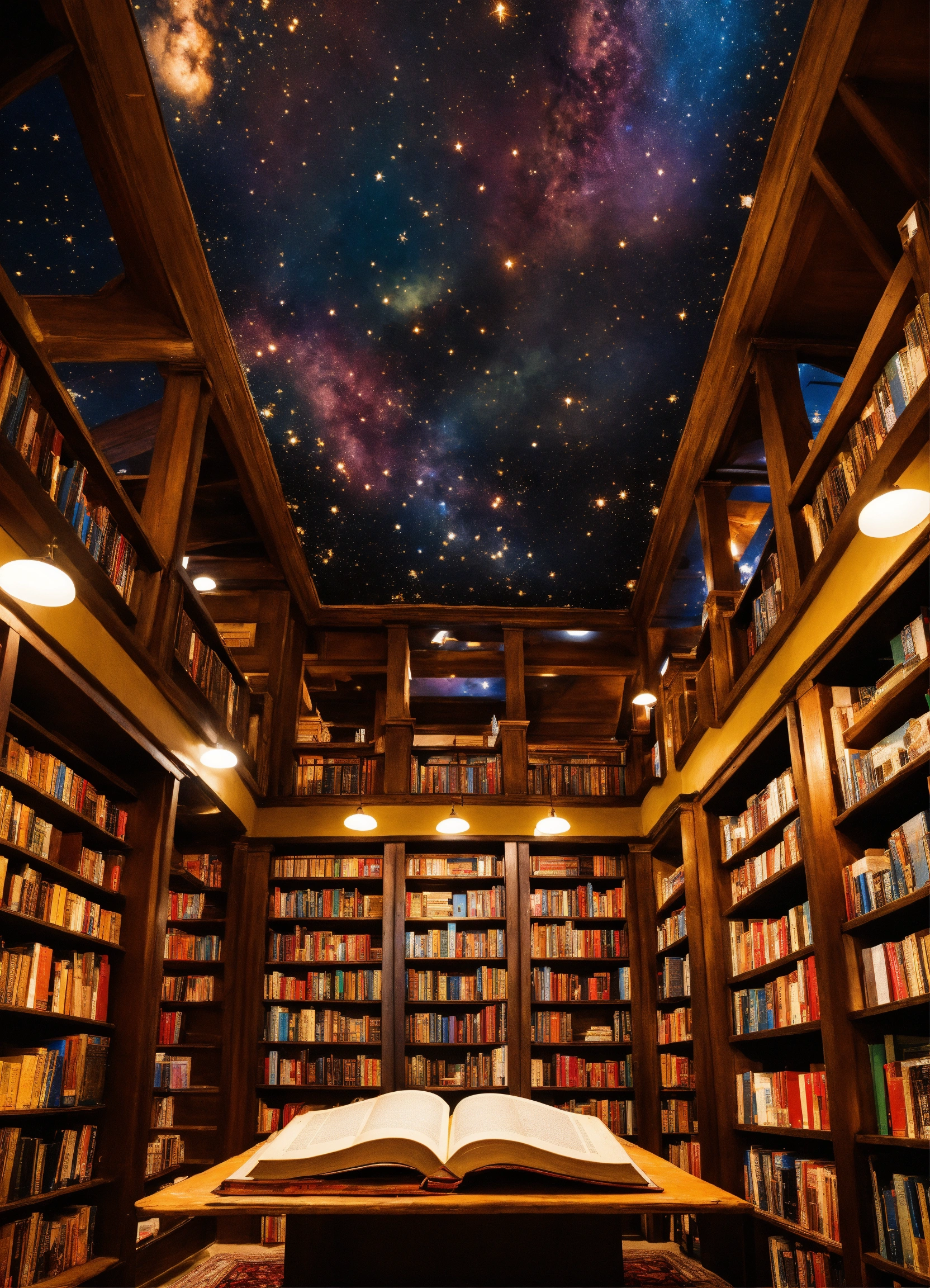 The ceiling opened up like a giant book with stories written in the stars, detached floating bookcases full of colorful books.