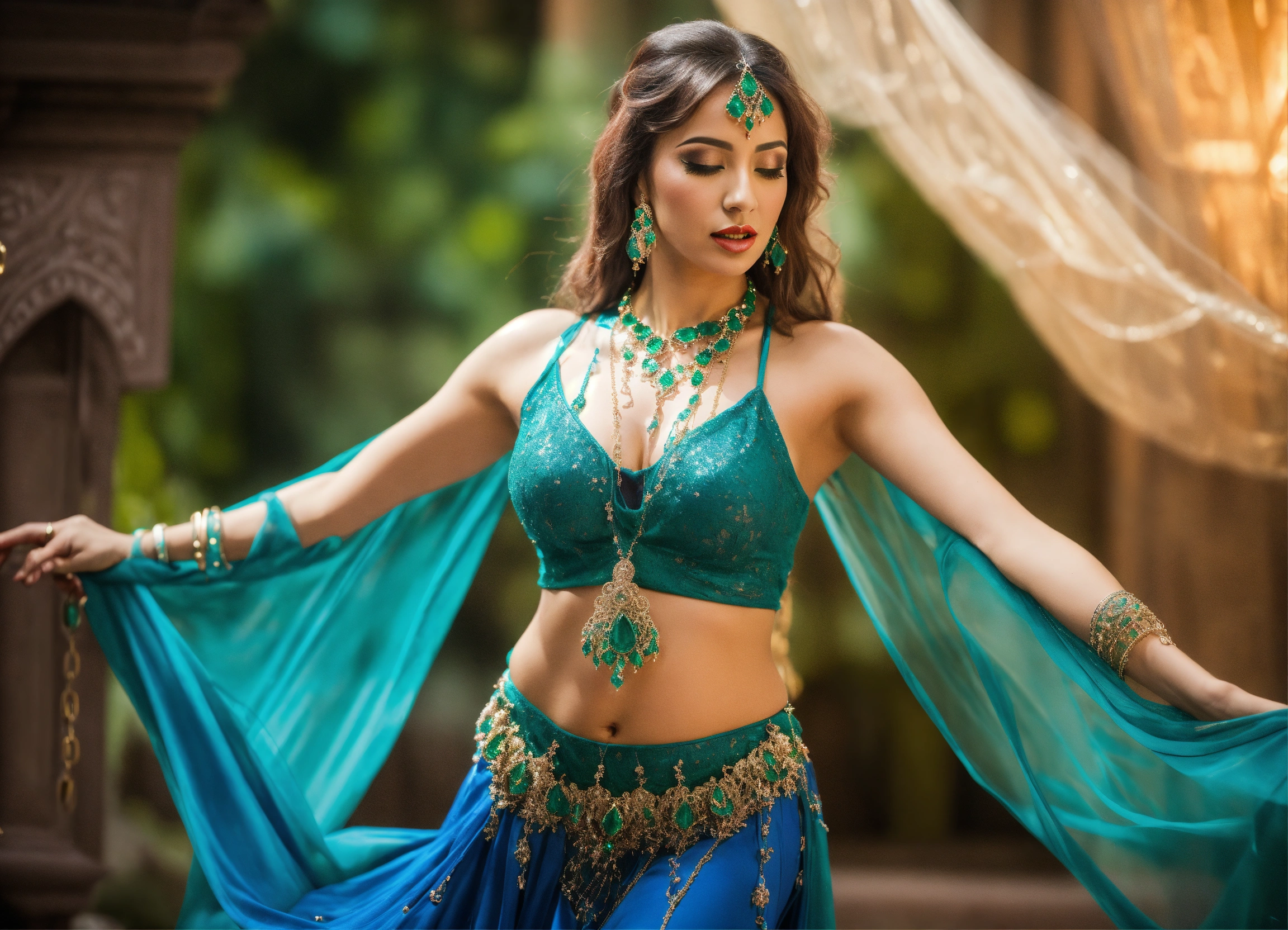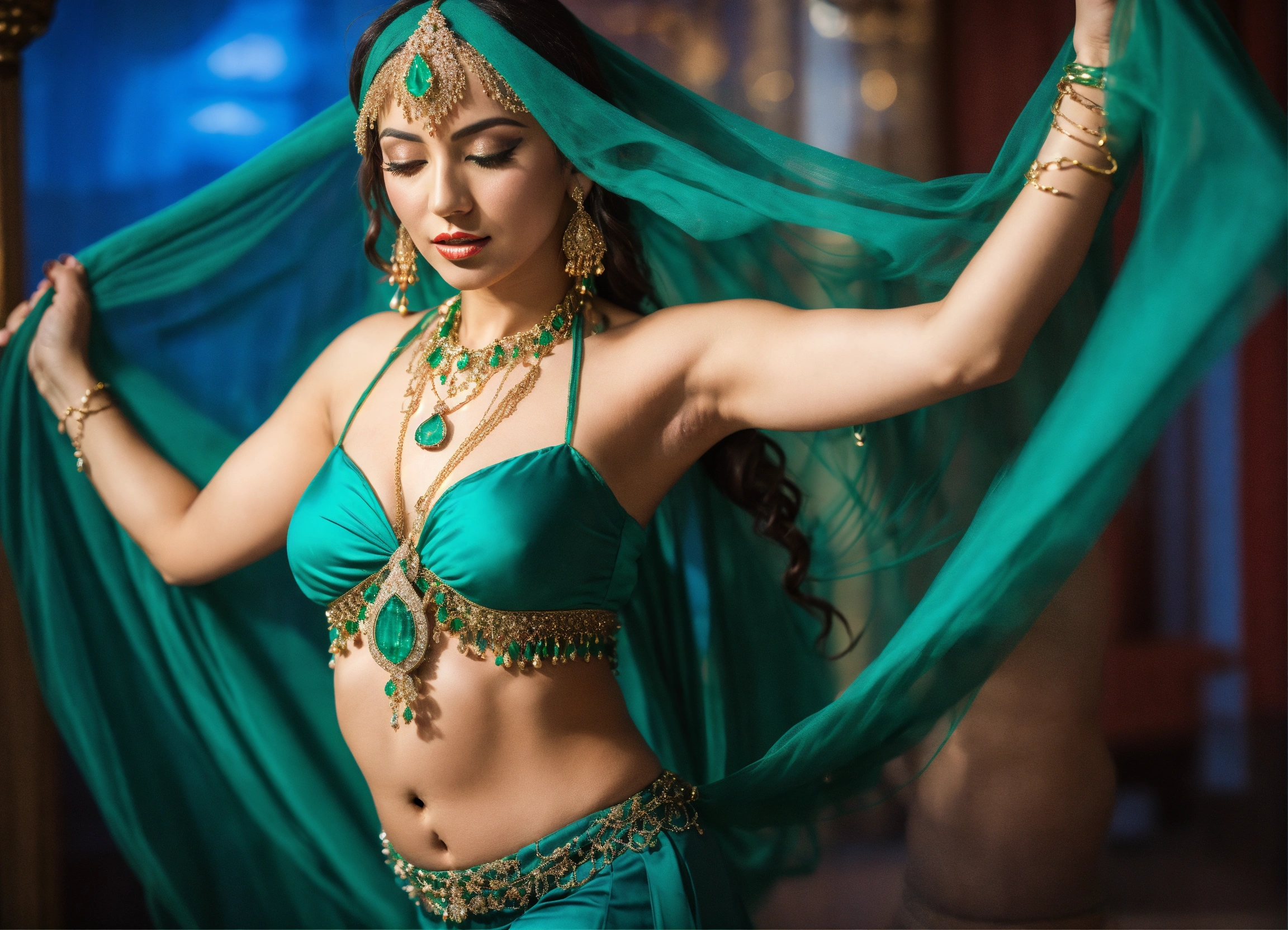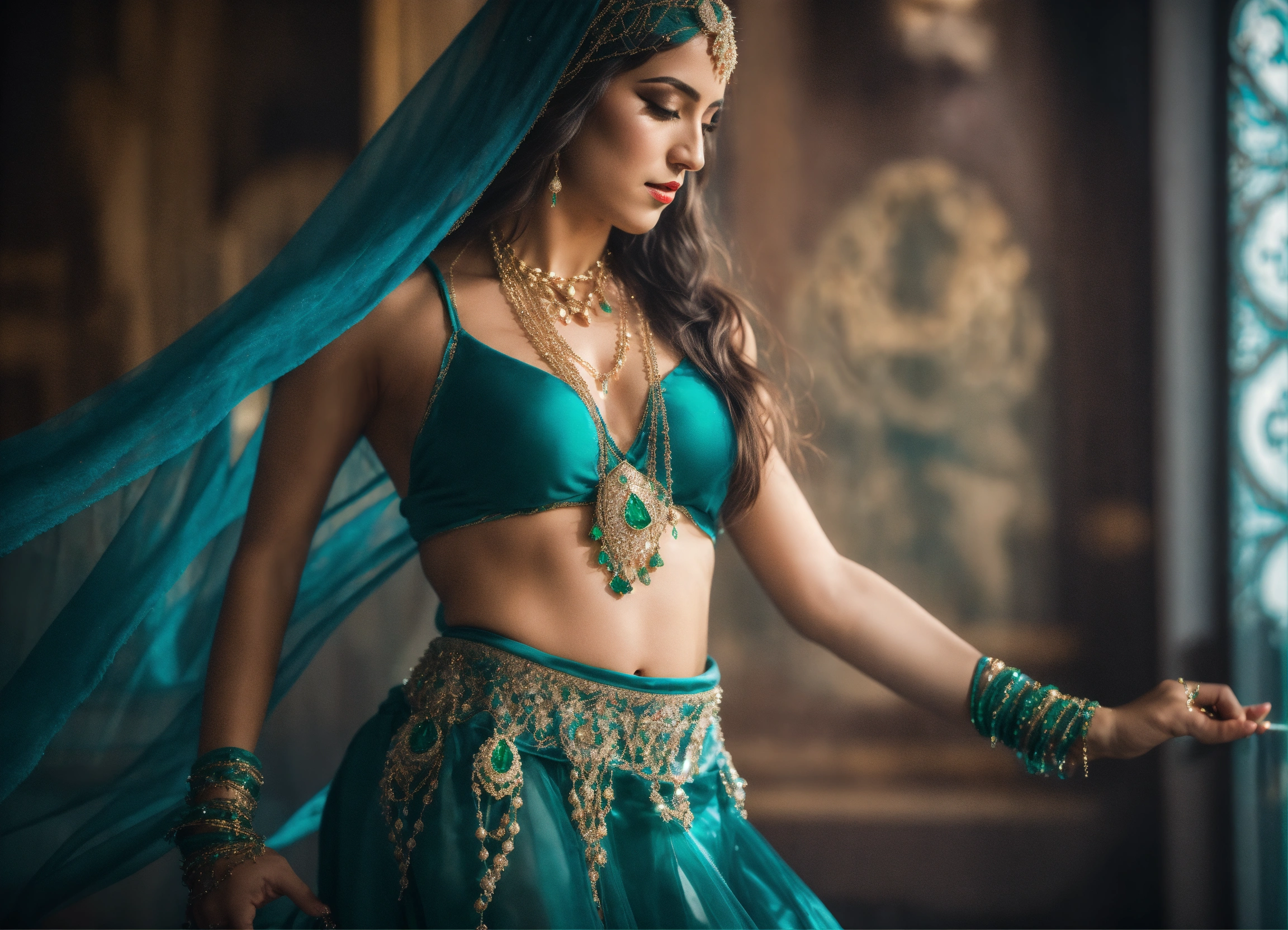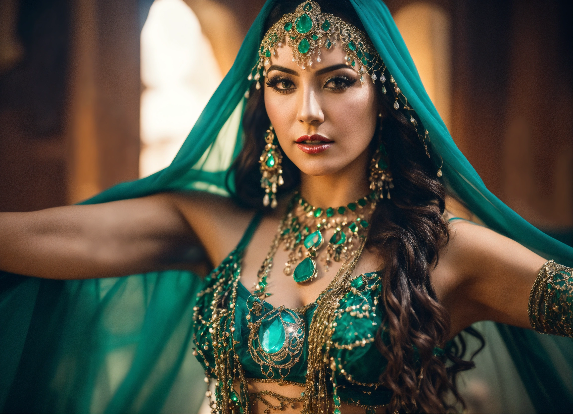 Photo portrait of dynamic belly dancer dancing in oriental palace, with an emerald pendant top of chains and blue skirt only, hiding behind a transparent veil, three-quarter view