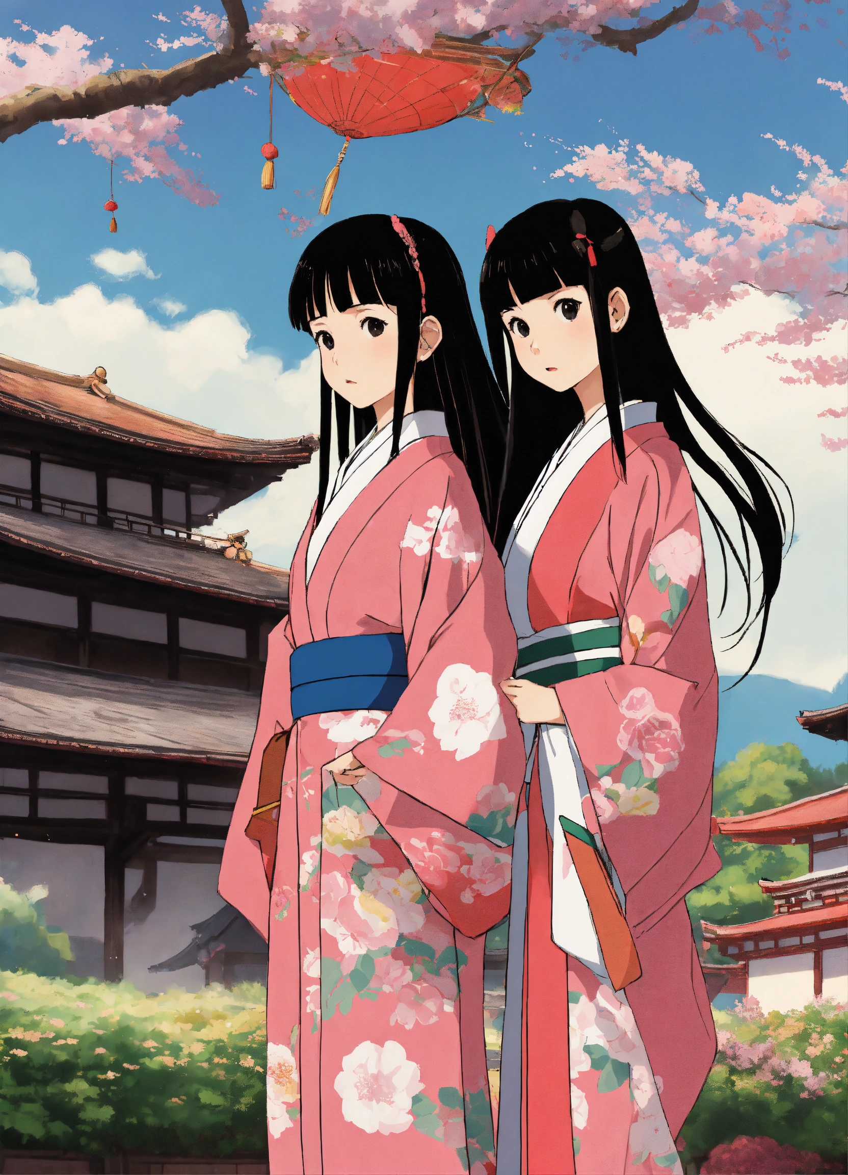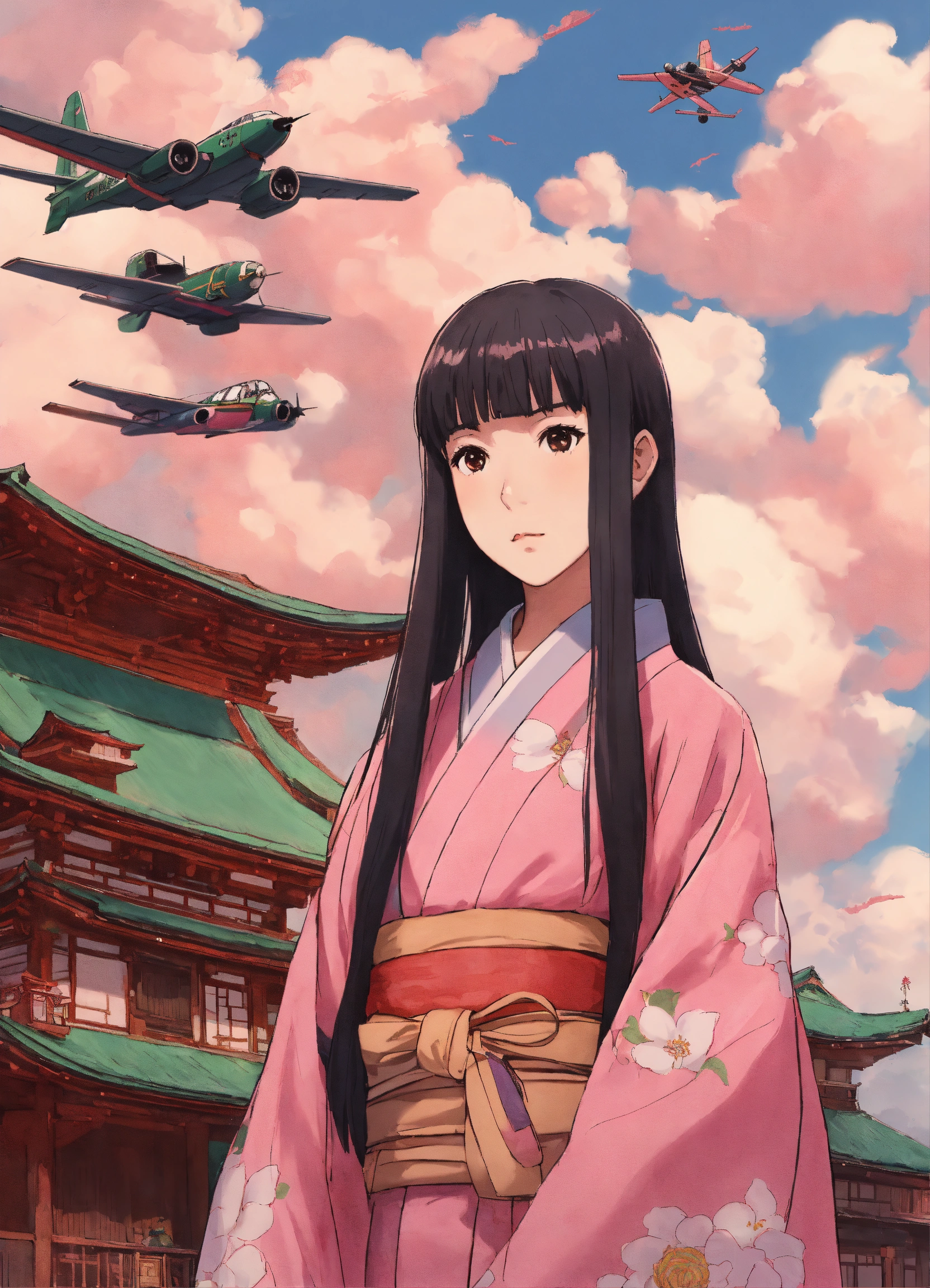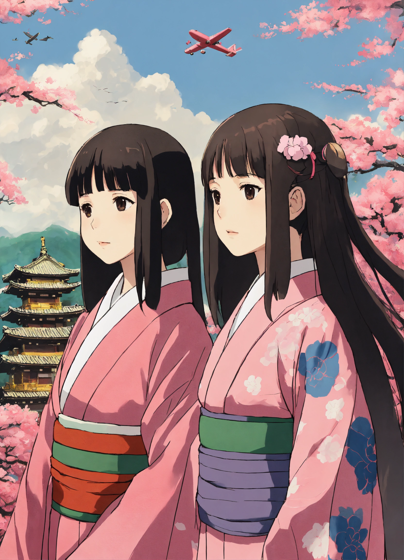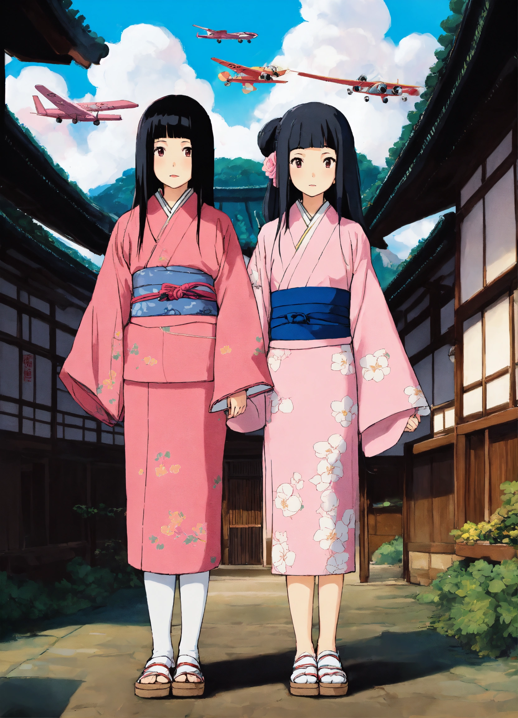 Two girls in ghibli spirited away styled with ghibli airplanes, one girl has a long straight black hair with a pink kimono and taller than the second girl, the second girl has a wolfcut hair with japanese kimono, both of them has fair skin