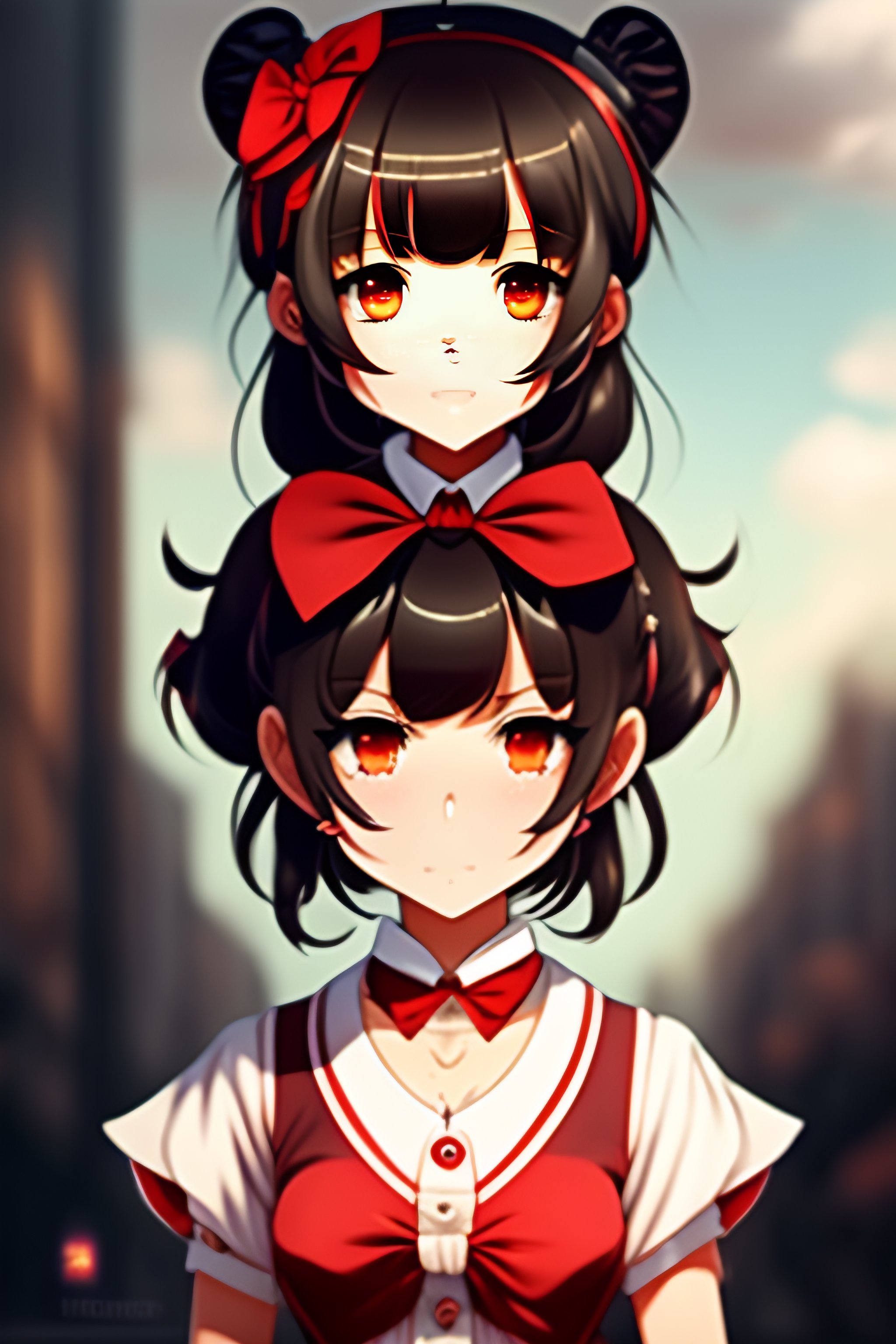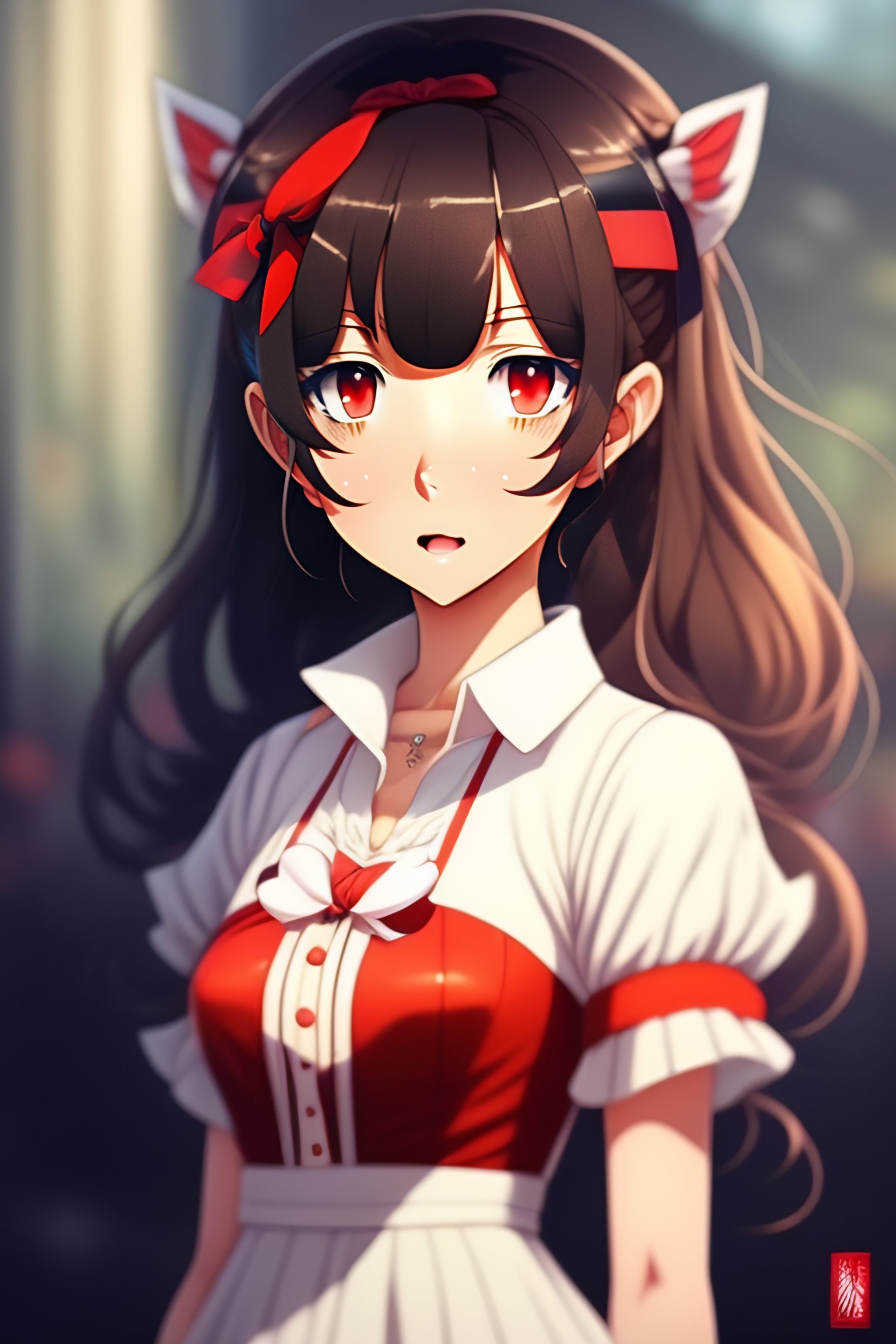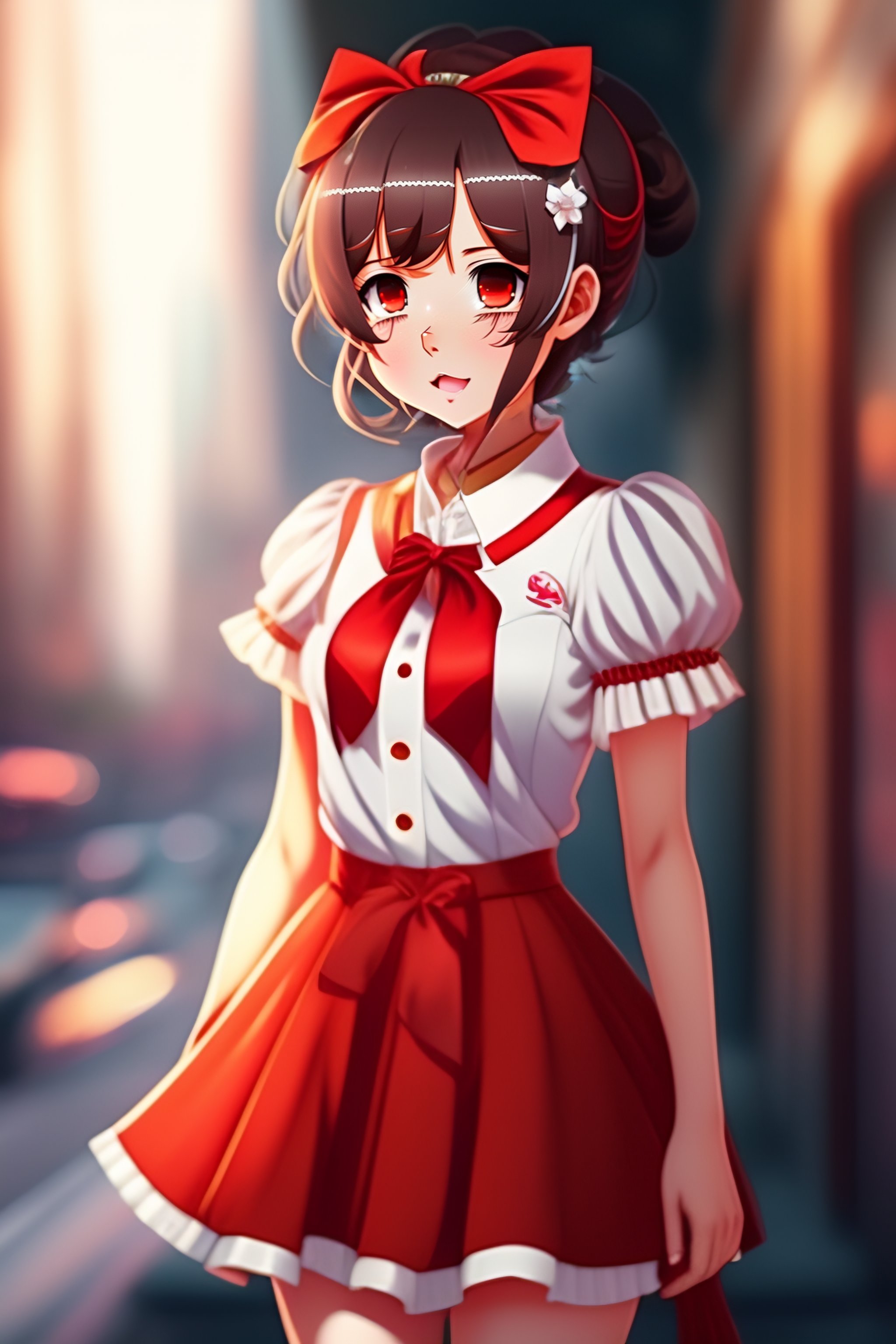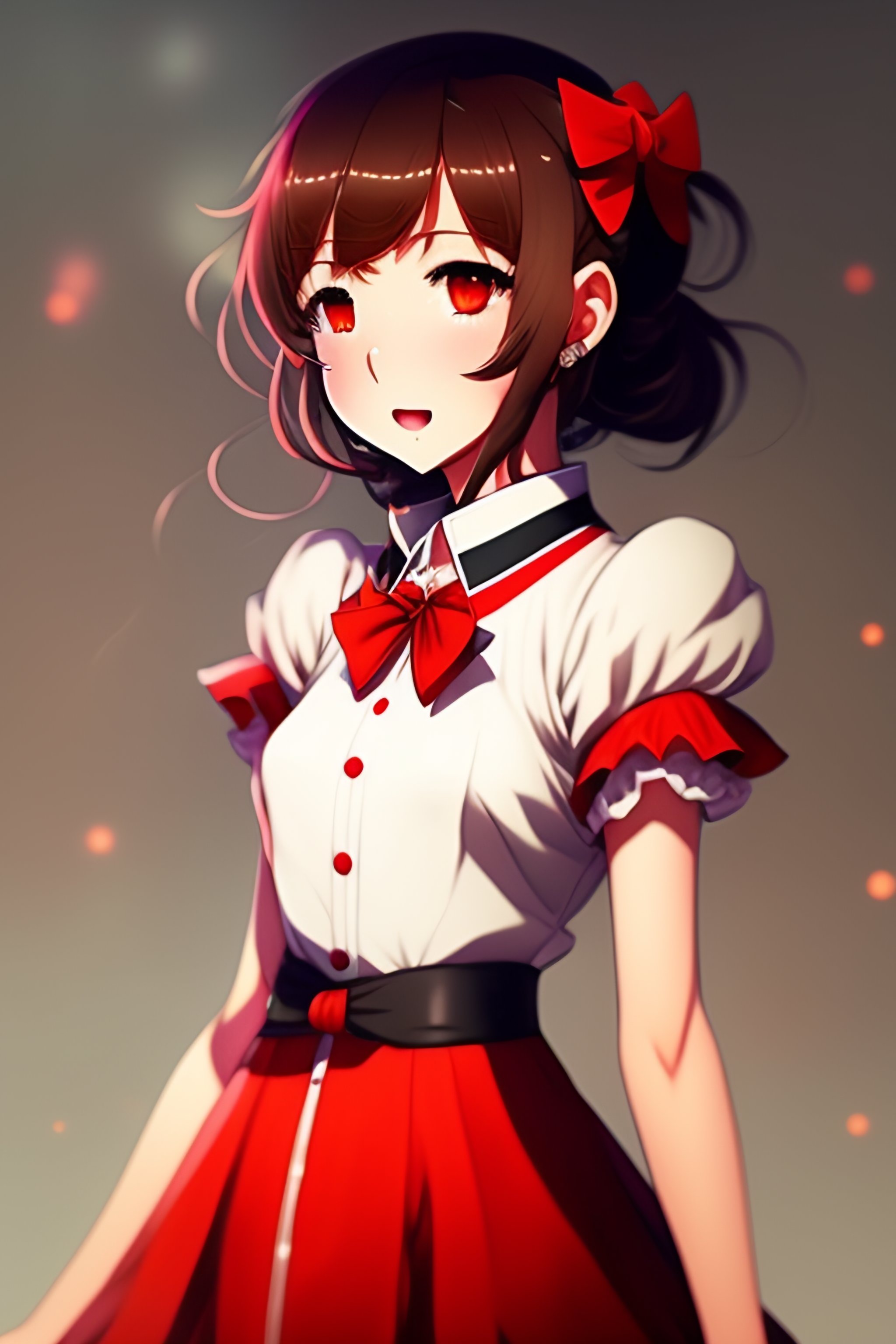 Anime girl, sophisticated dress, hairband with bow, loose white shirt with red accents, short red pants, short brown hair, brown eyes, demonic