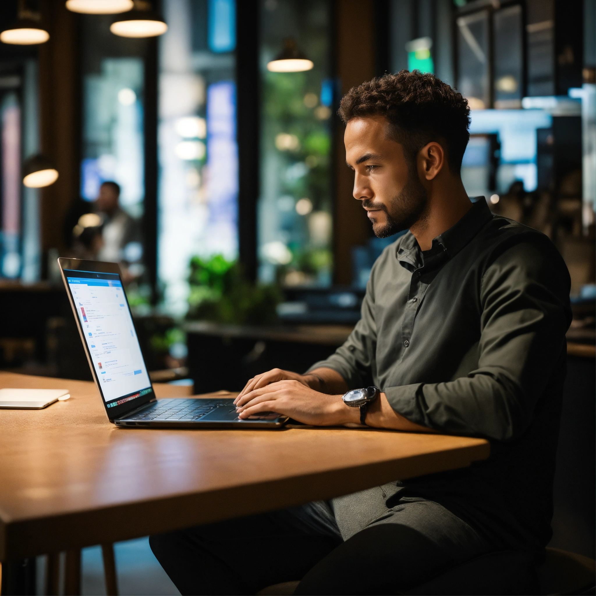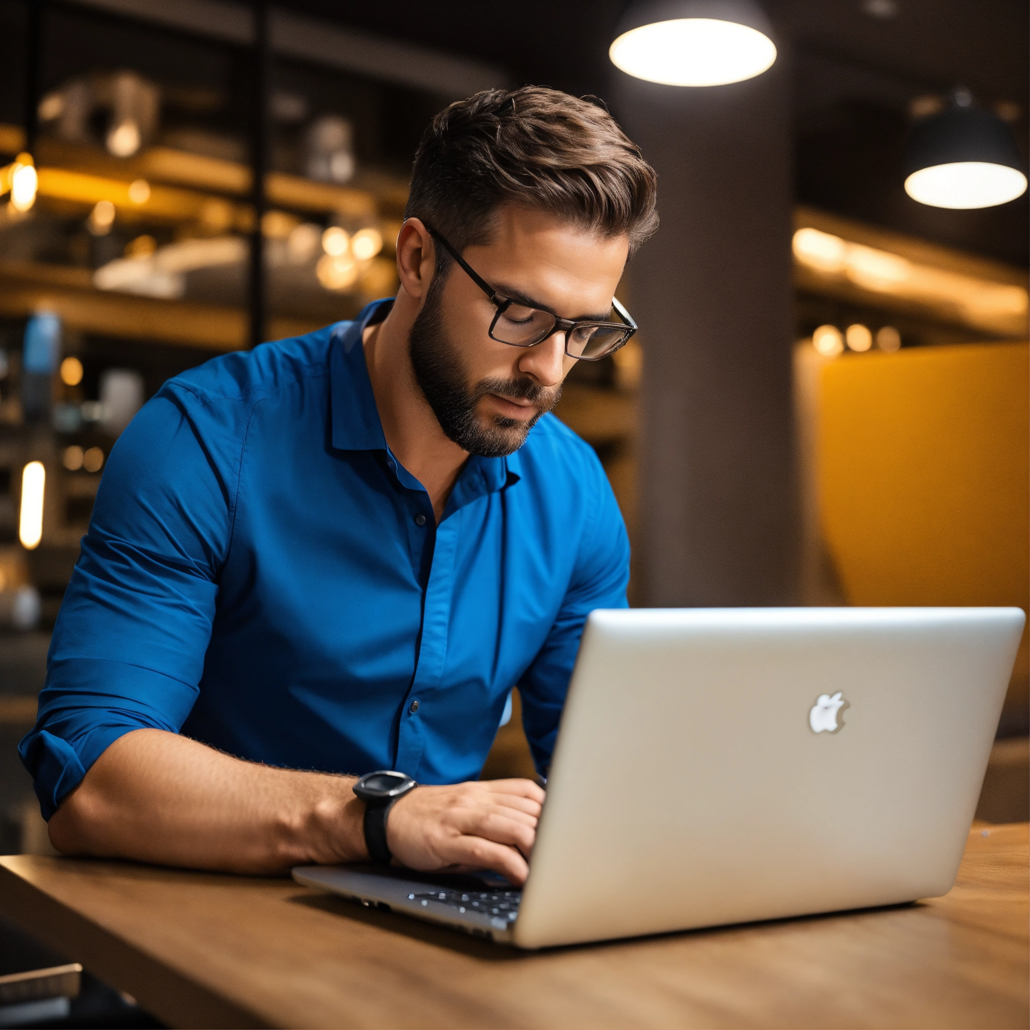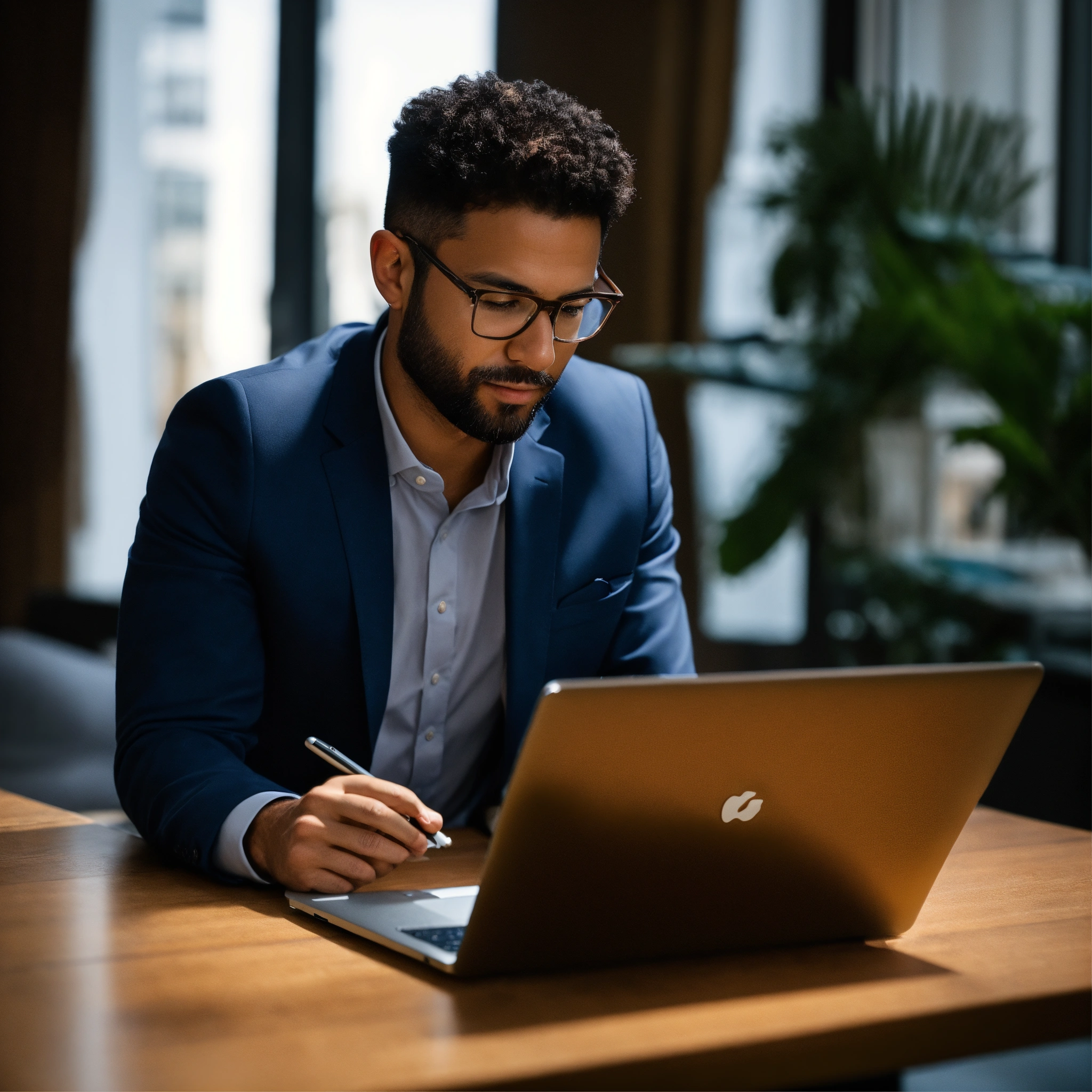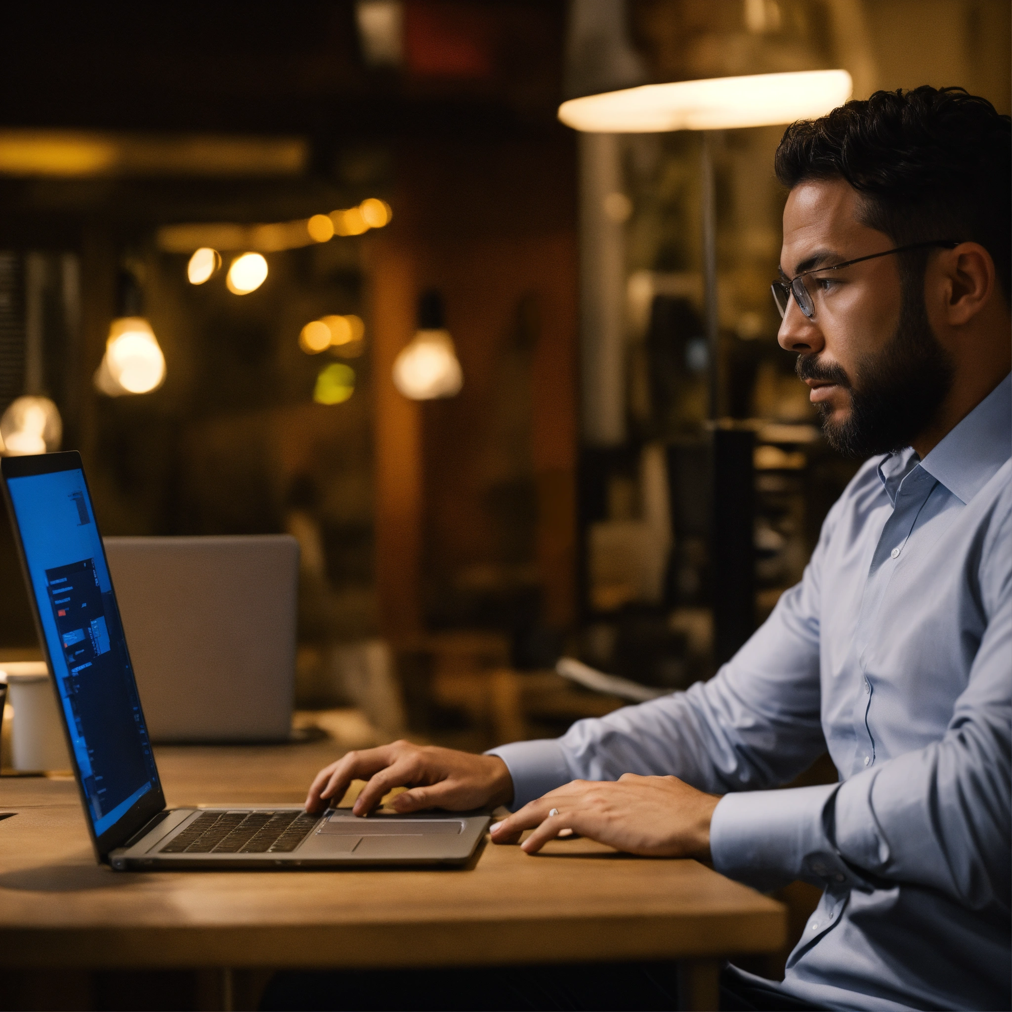 A photo of a man looking at a laptop, the man is in a business setting, the laptop is open and the man is looking at the screen