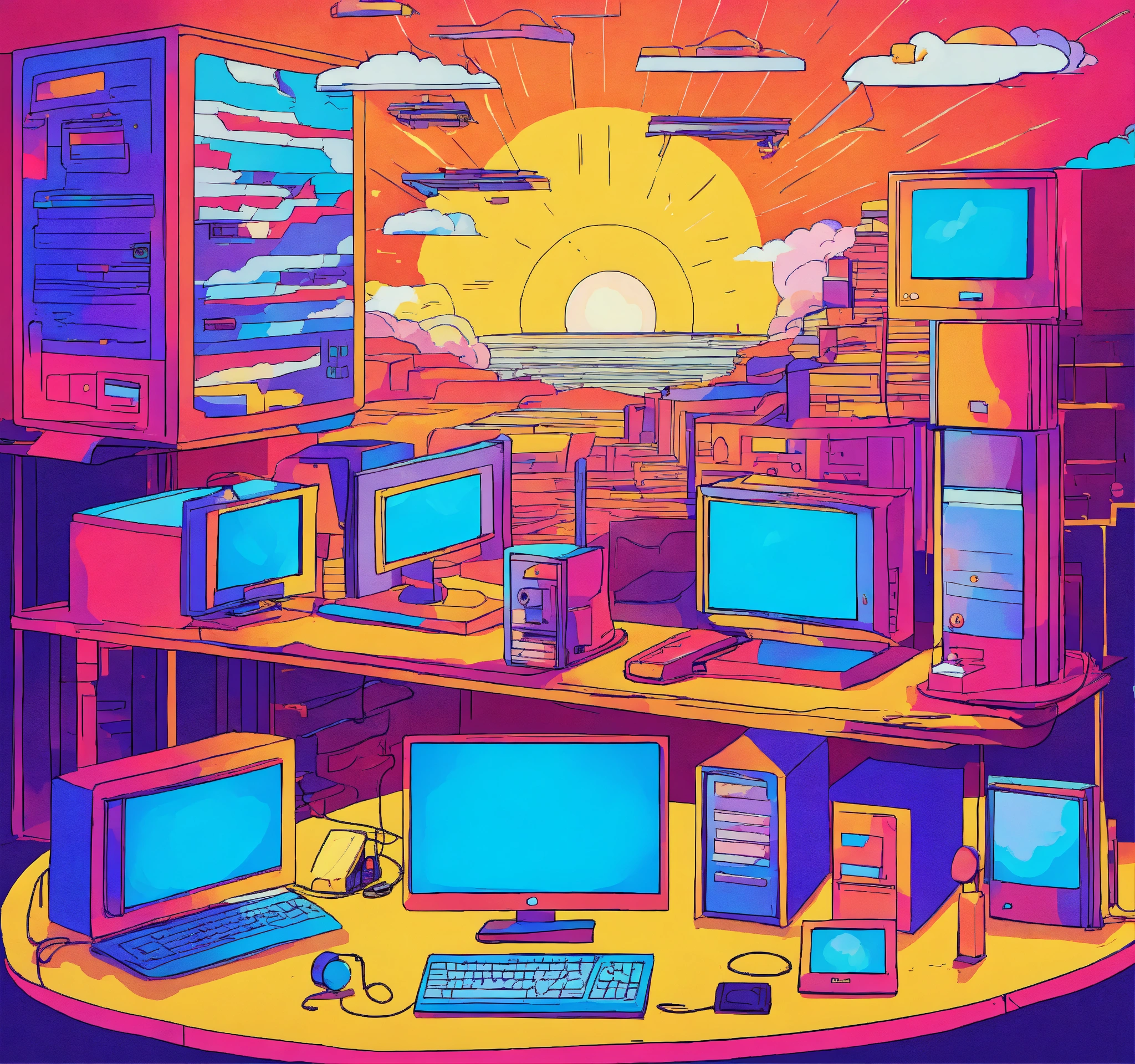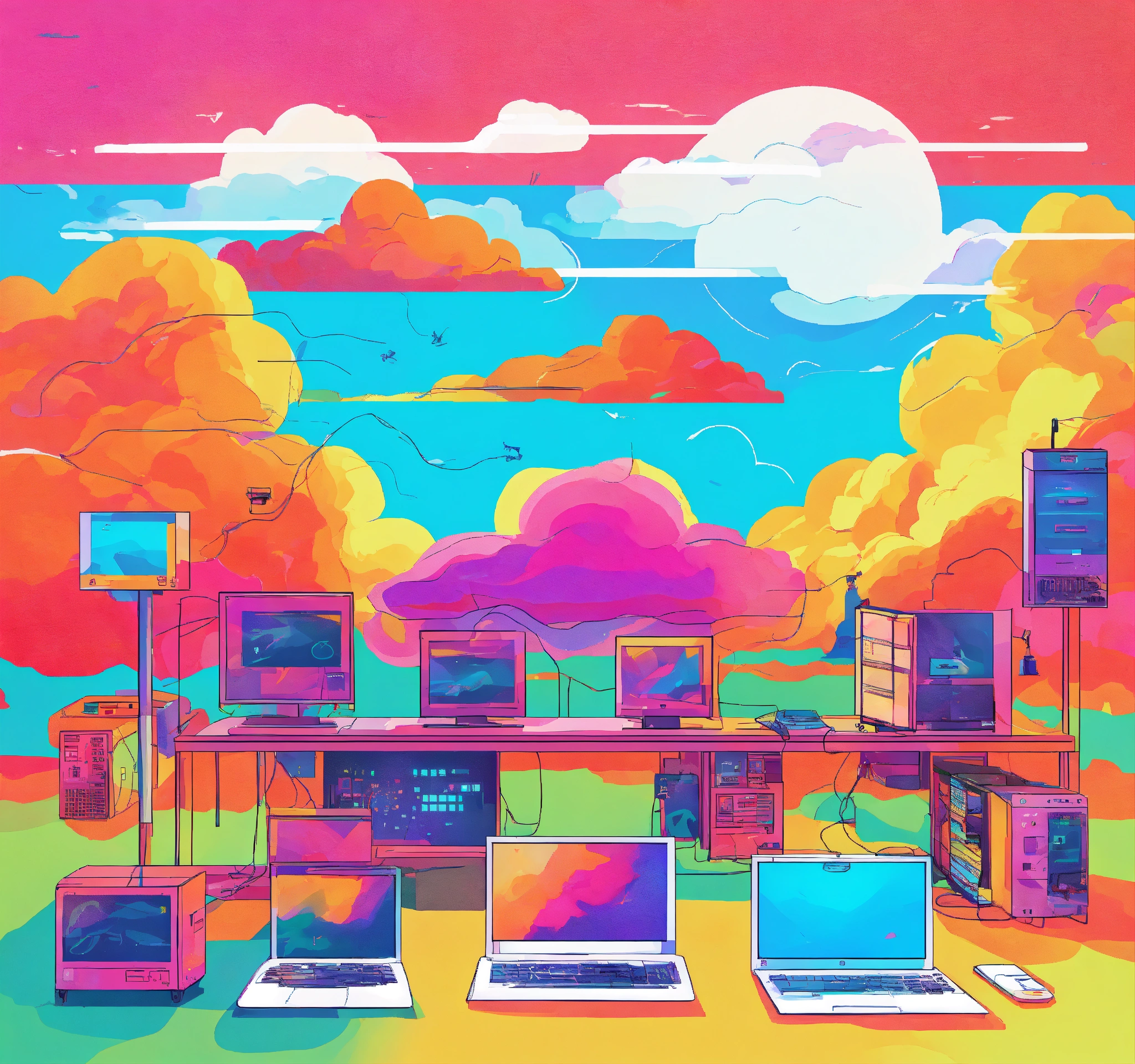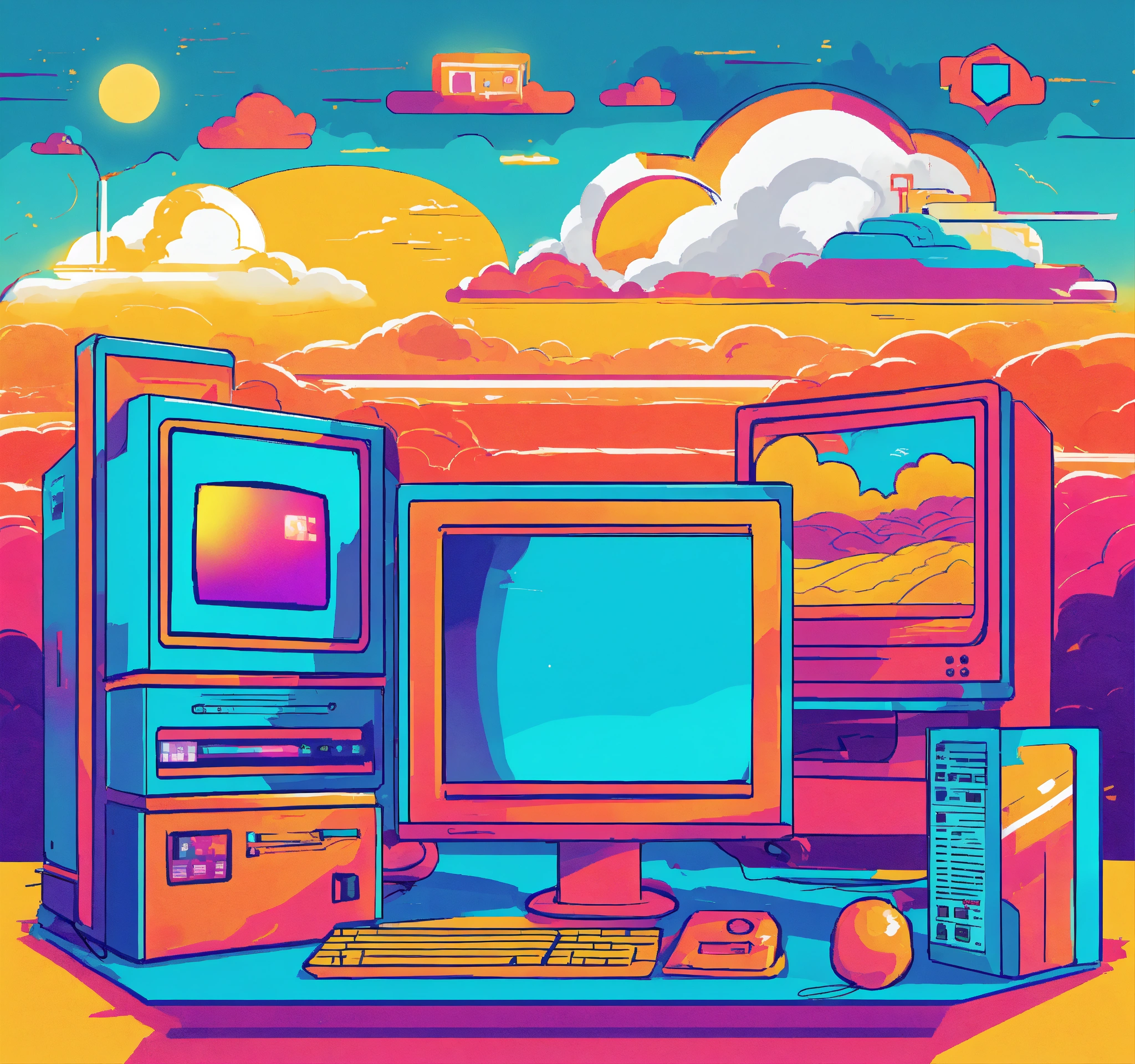 Please generate a lively artwork of computers and cybersecurity under sunshine and clouds using a bright and vibrant color palette