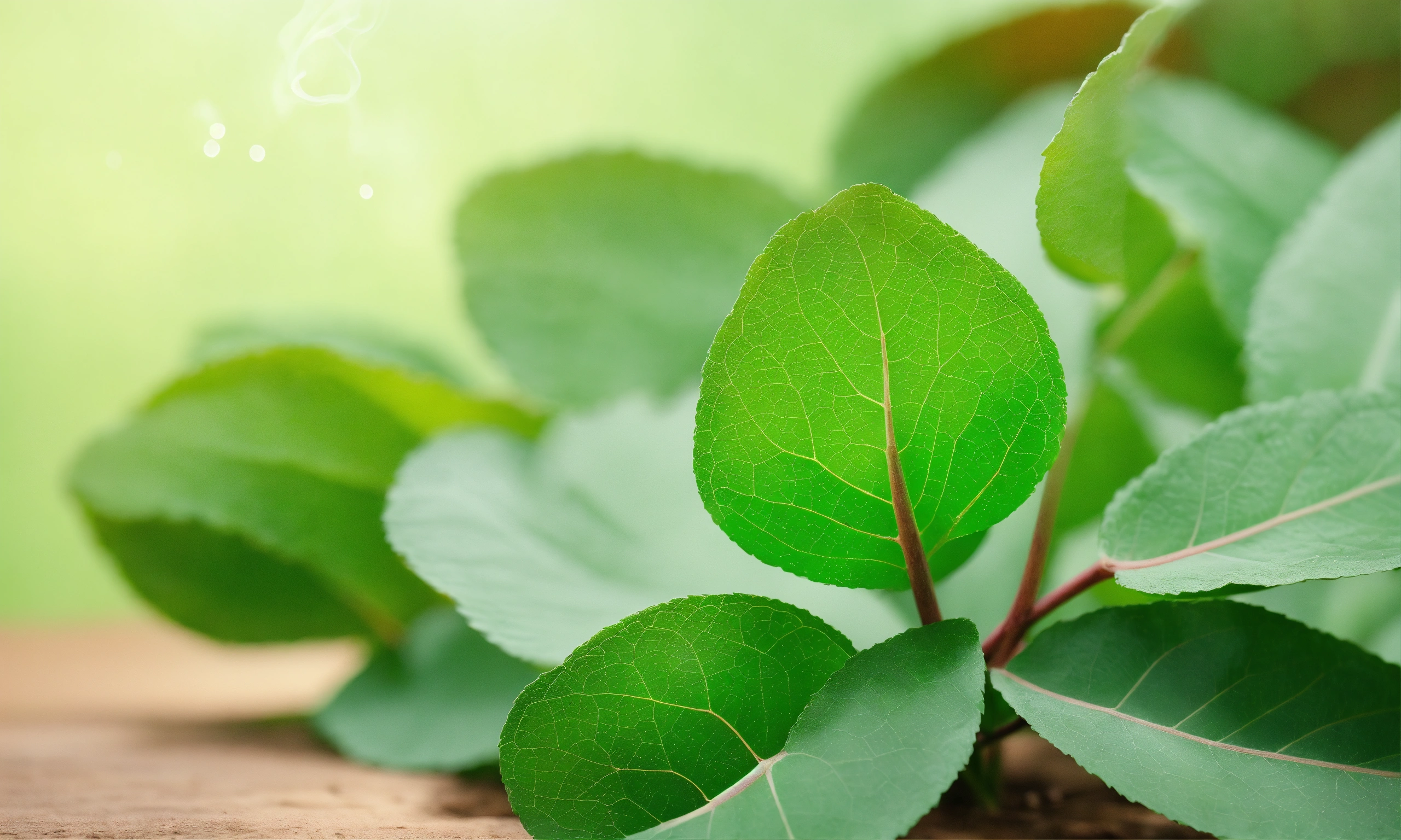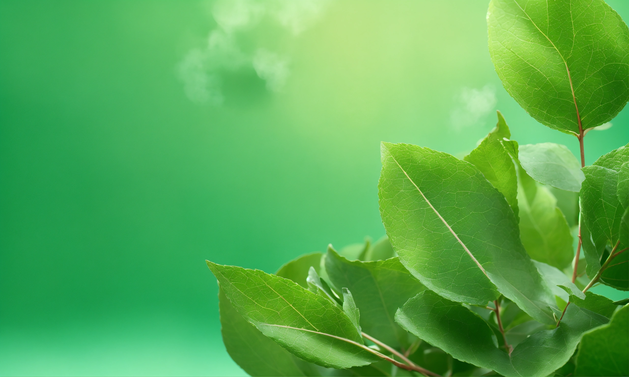 Clear ambient glowing pastel green background, peppermint leaves, eucalyptus leaves, clearing sinus advertisement, creative design using steam around leaves in mid air