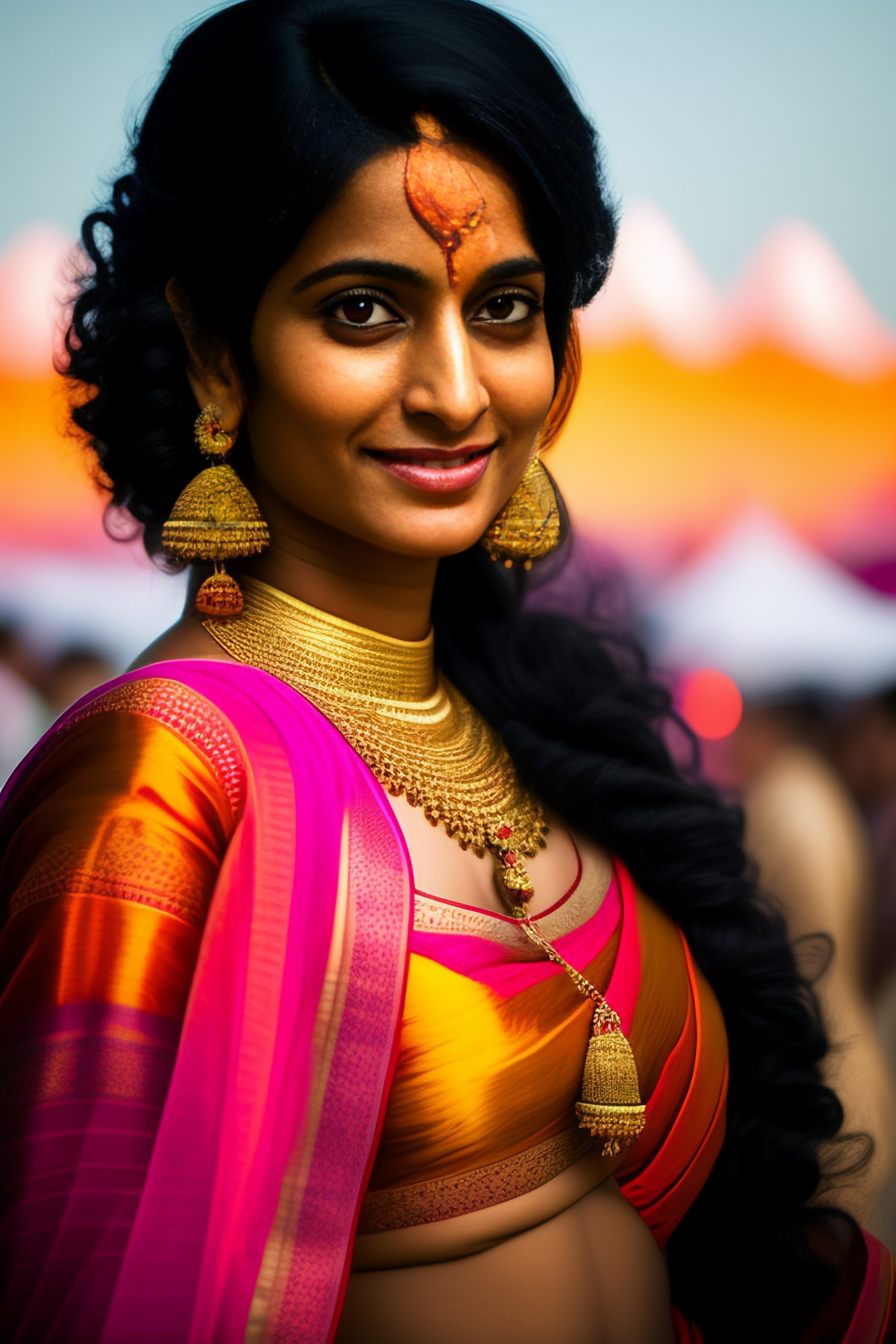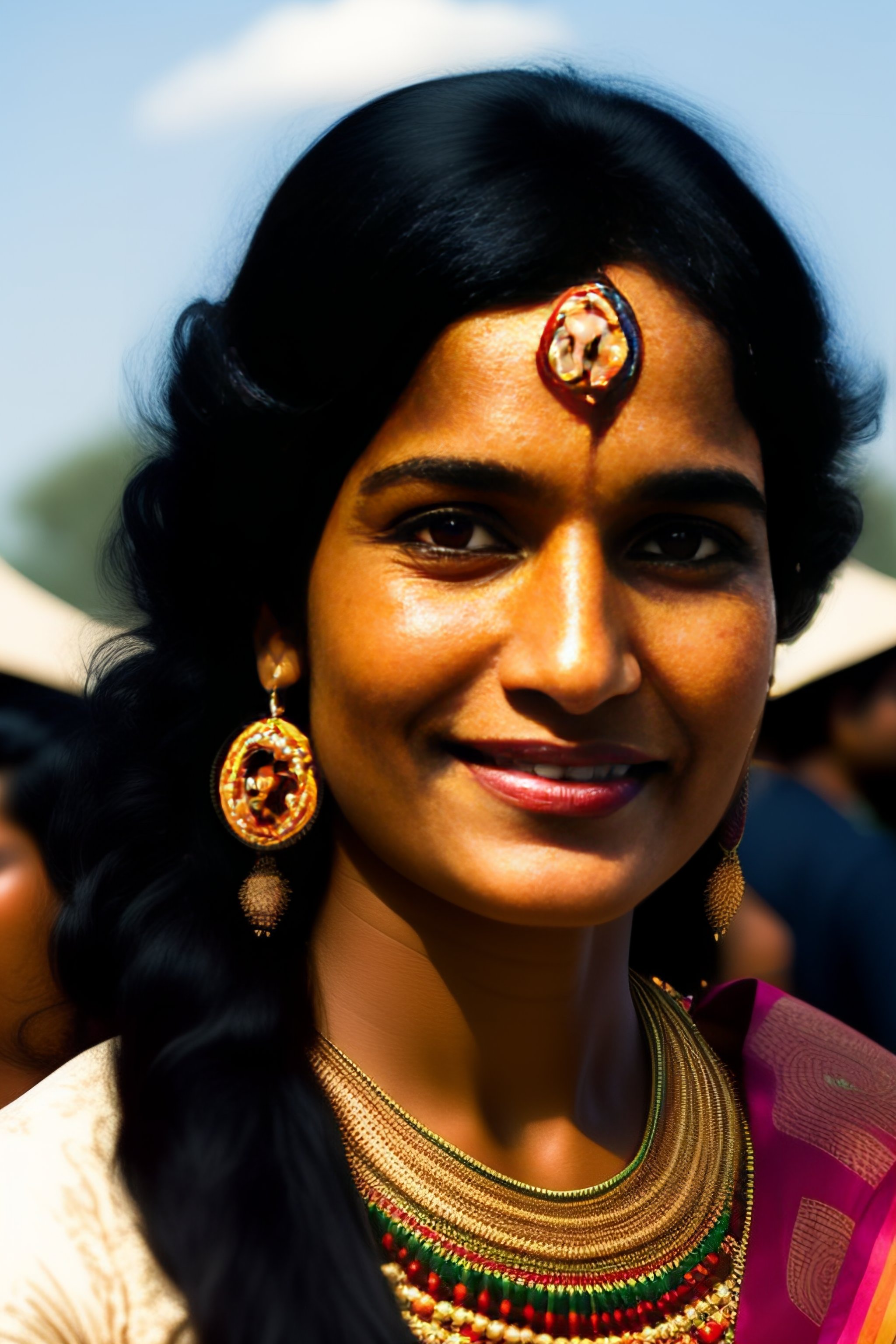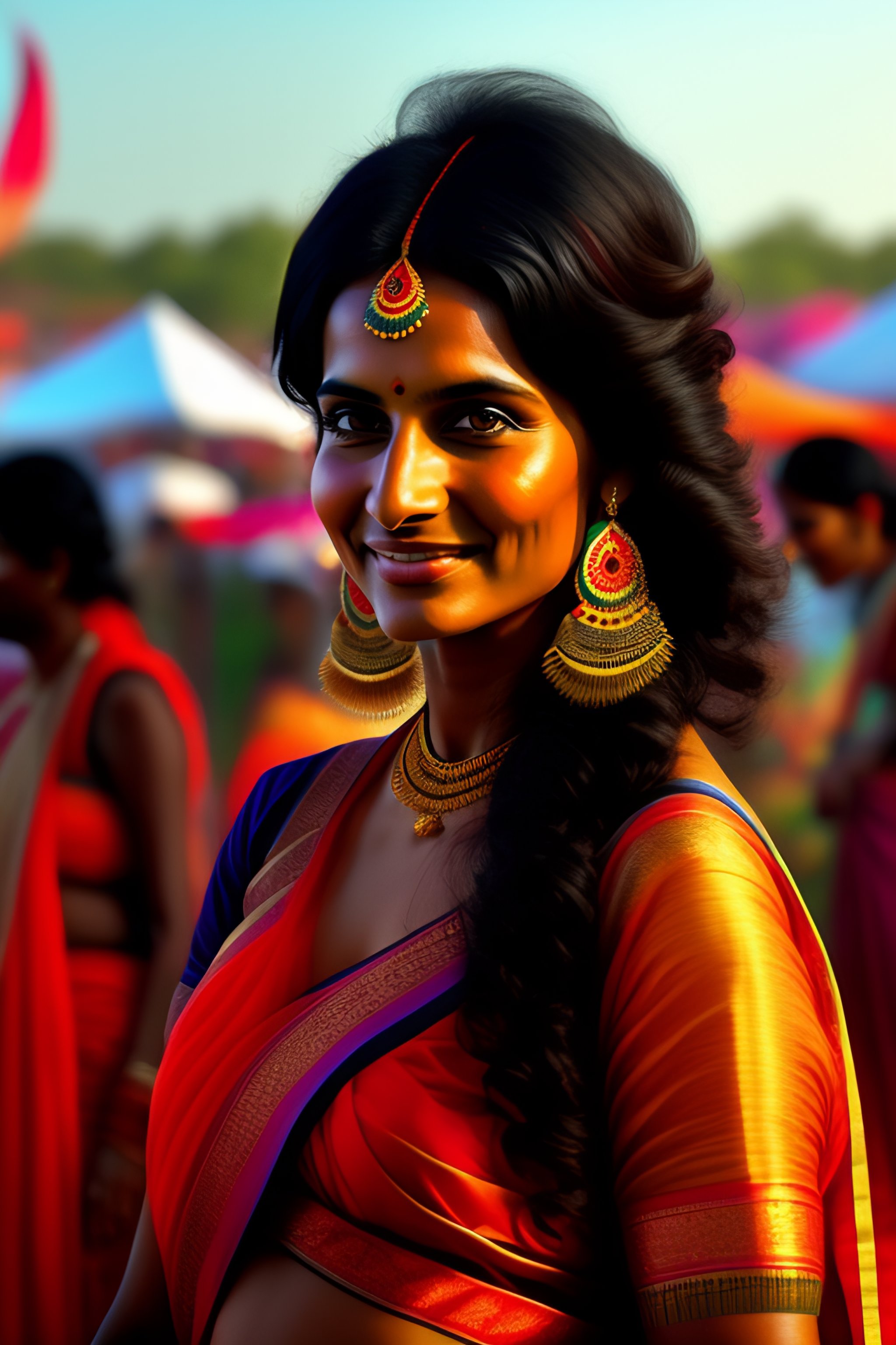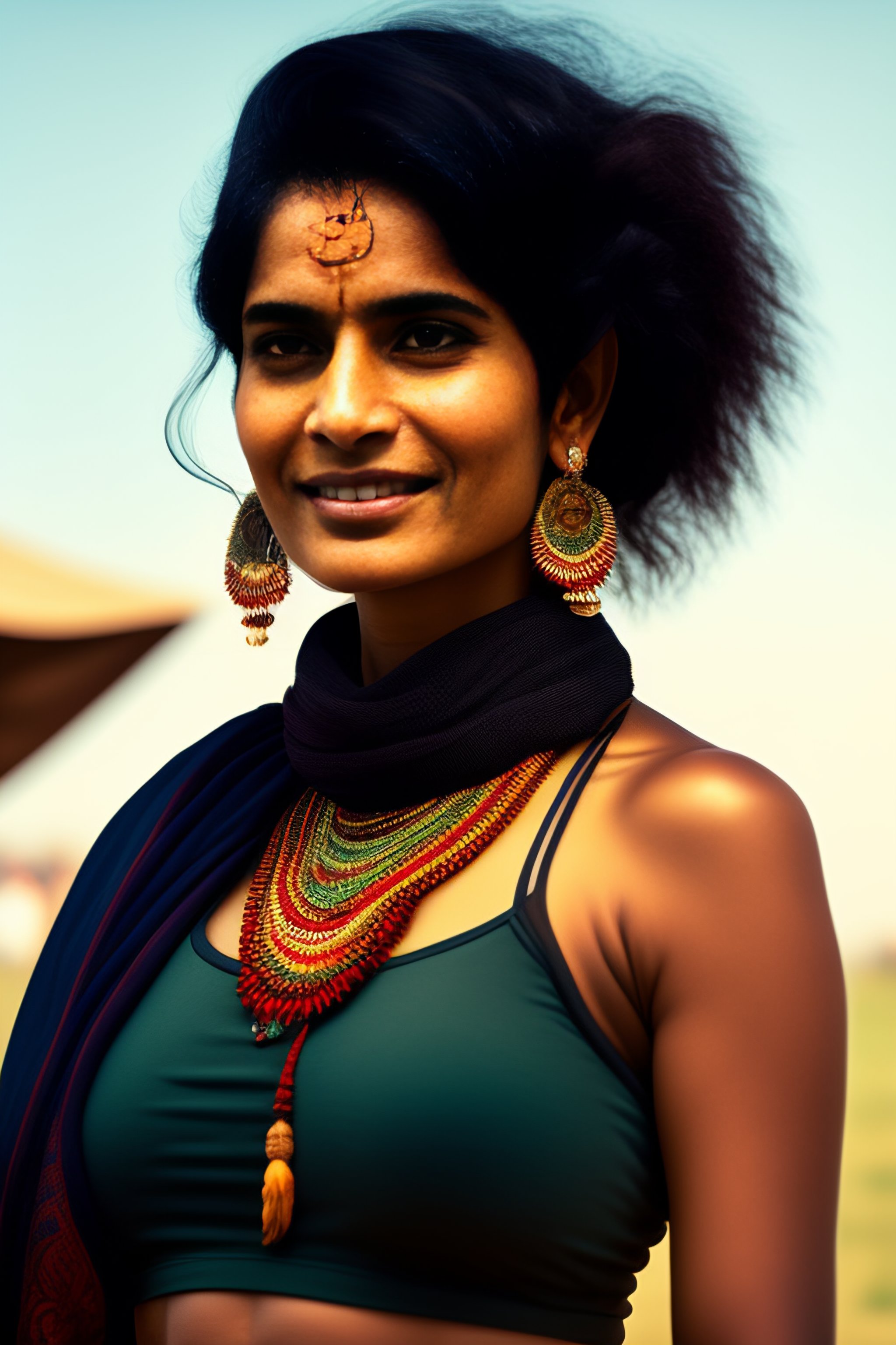 Indian woman in early 30s, short black hair, above average looking, full body, no makeup, short earrings, feather, music festival in the background