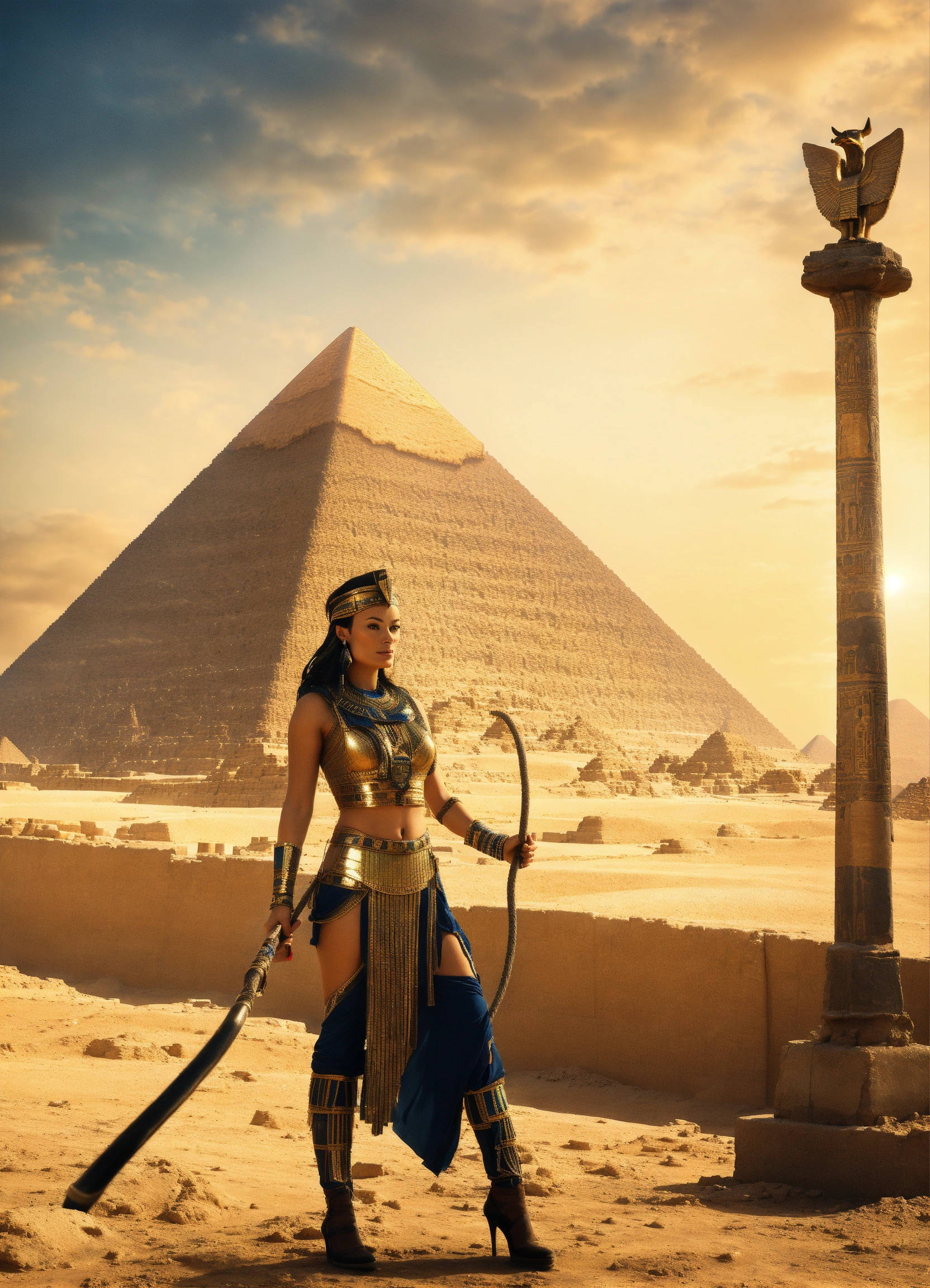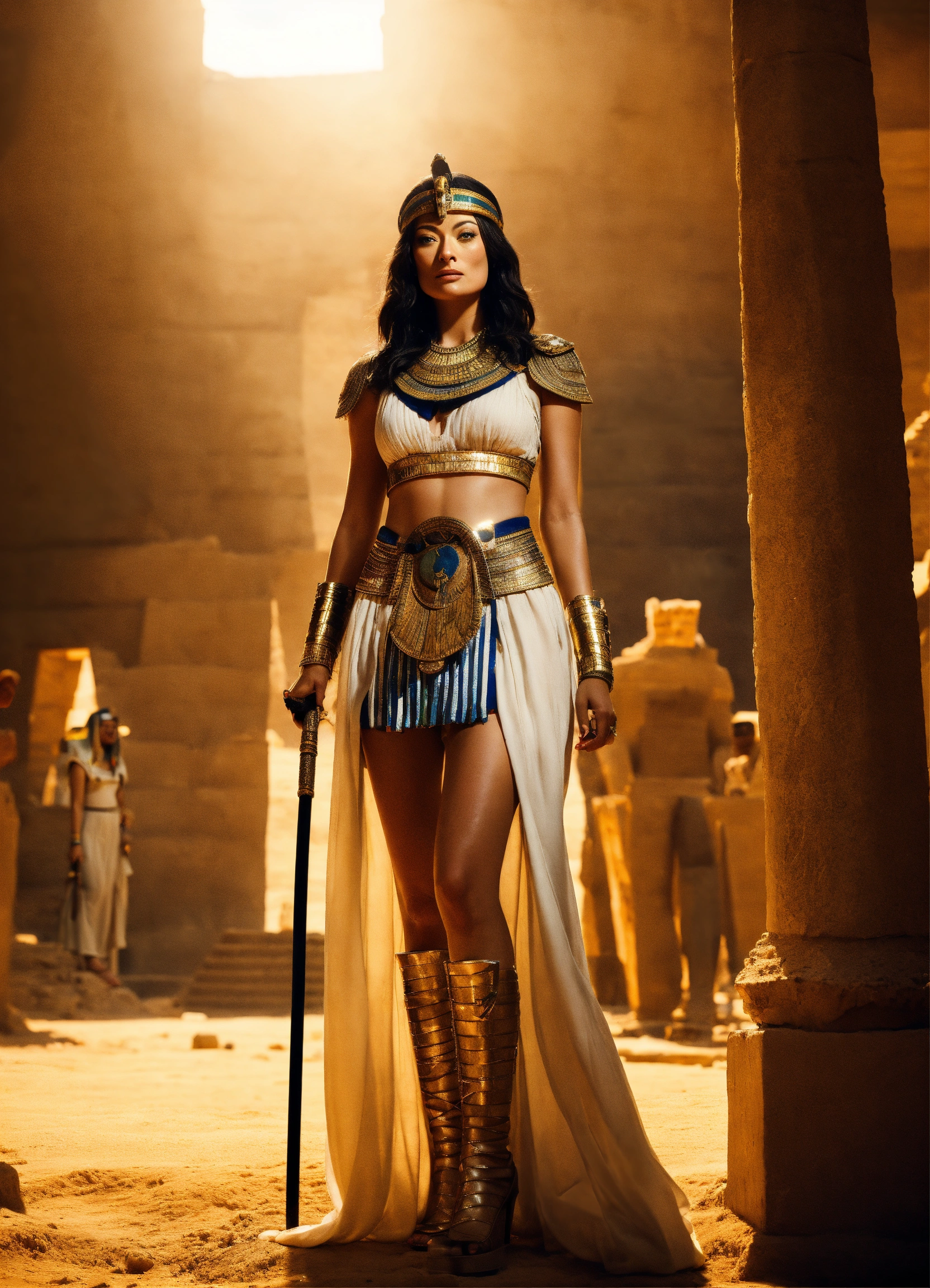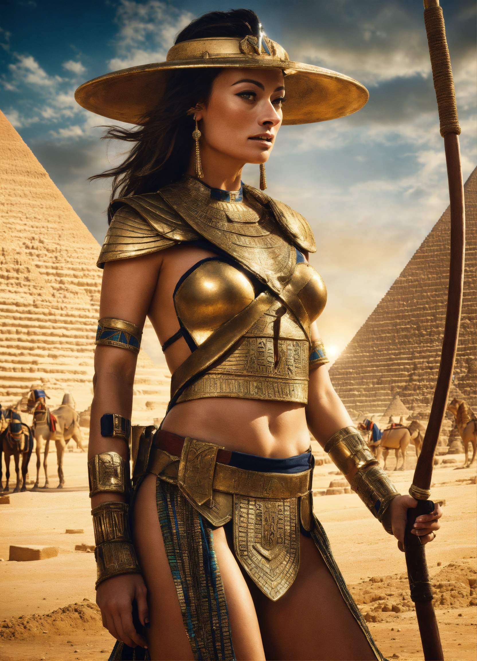 An epic fantasy scene featuring a gorgeous beautiful egyptian female like olivia wilde in full height holding a whip in hand in attractive outfit, working as prison guard on the construction of the great pyramid. a lot of egyptian workers around are doing their job. cinematic view. sharp detail.