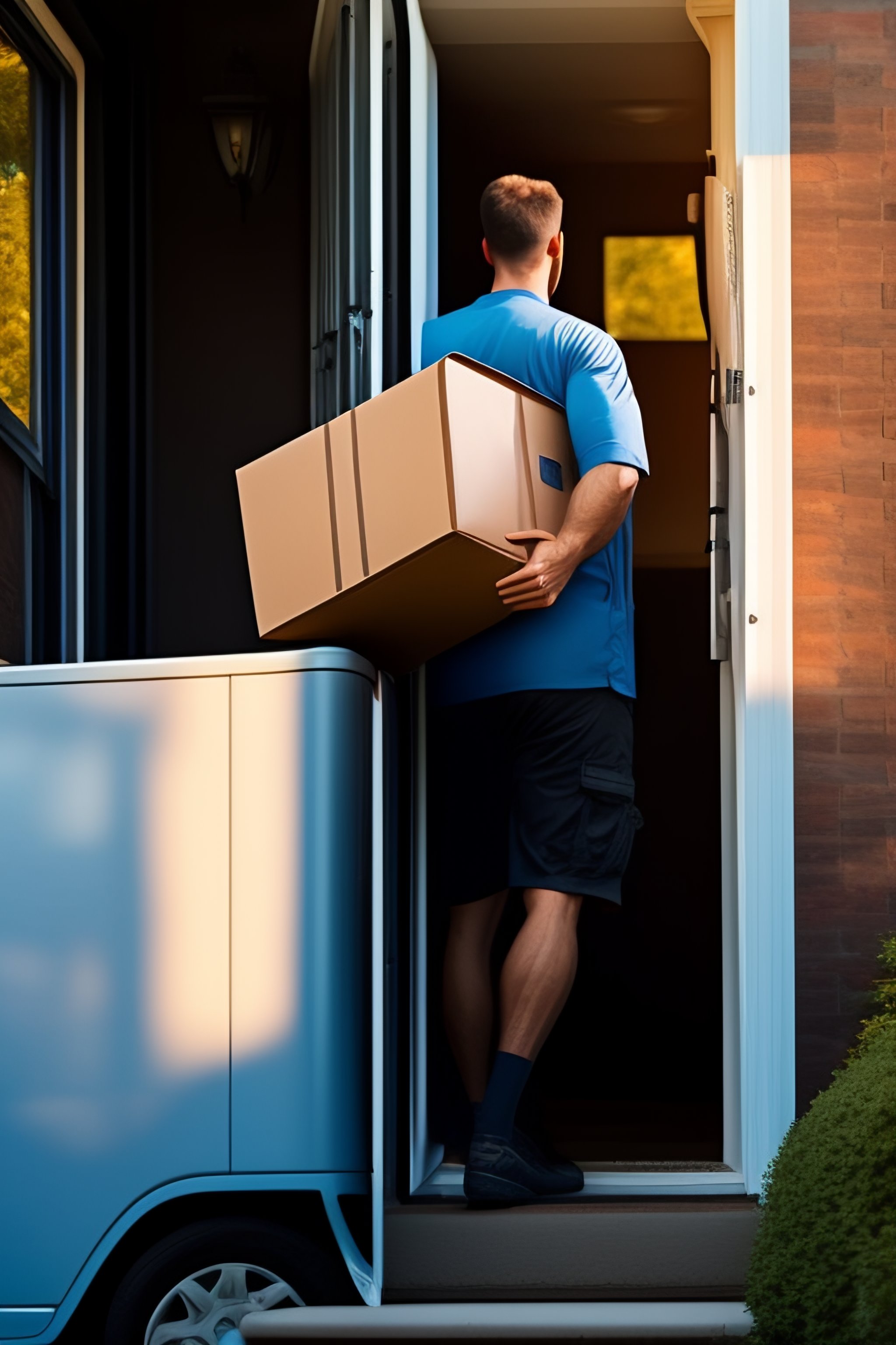 Delivery van driver carrying a package to the doorstep of a suburban house
