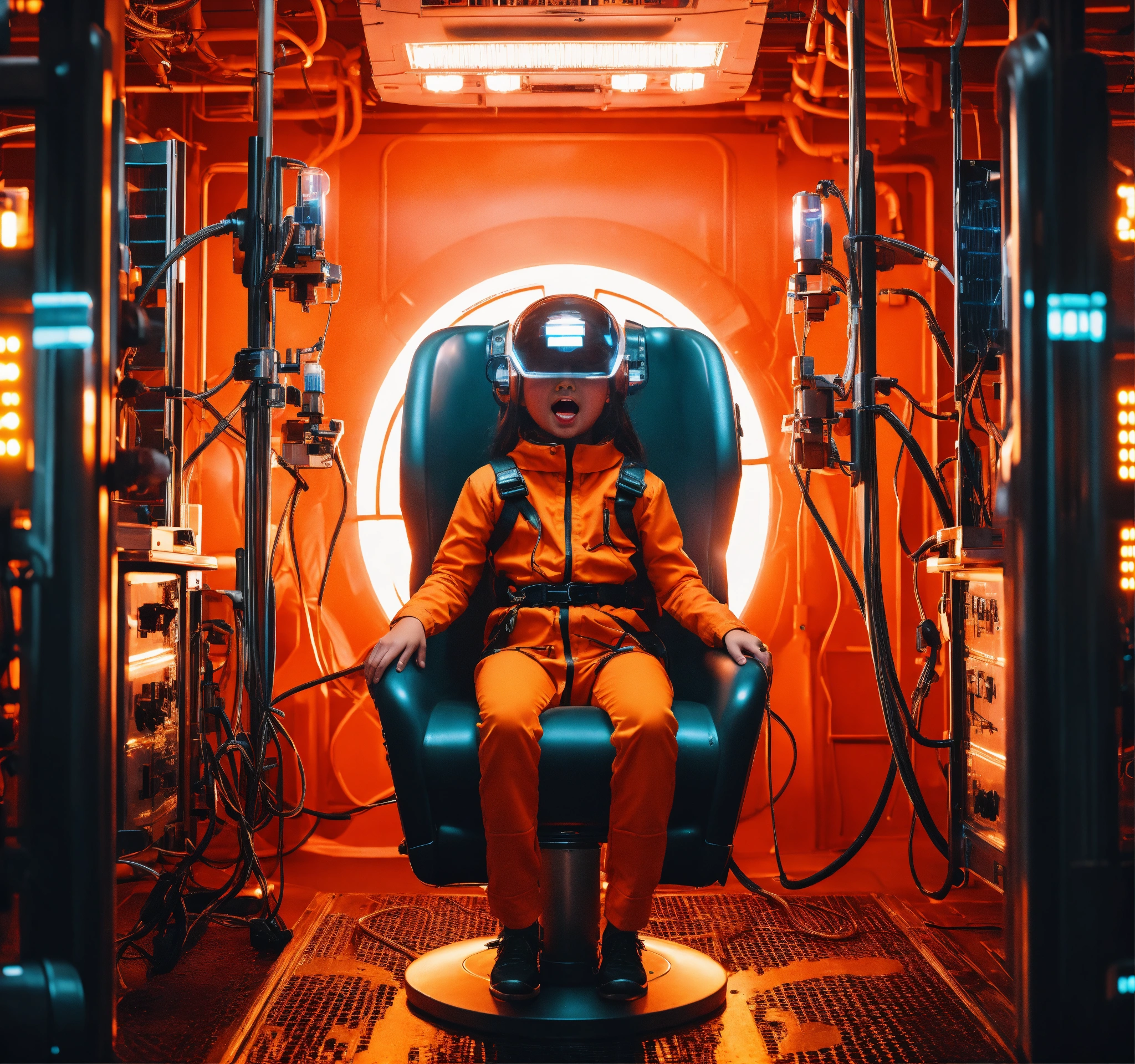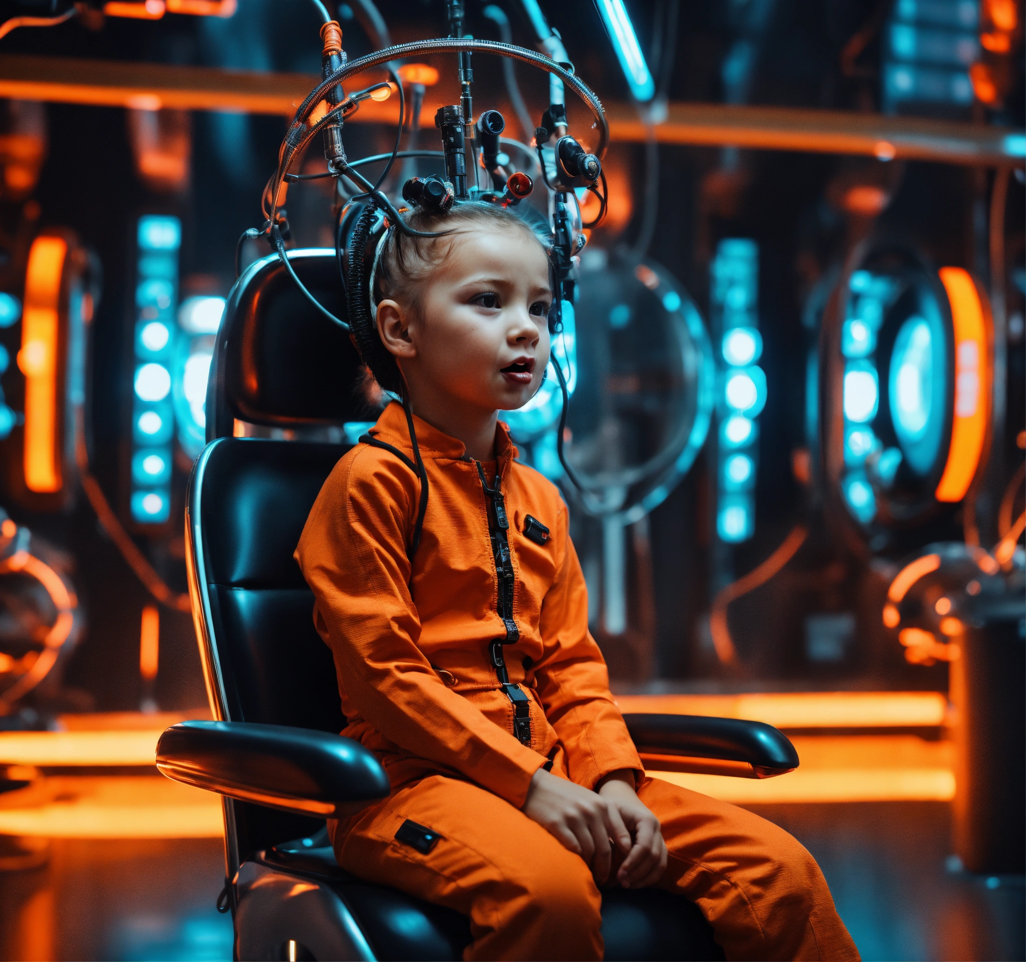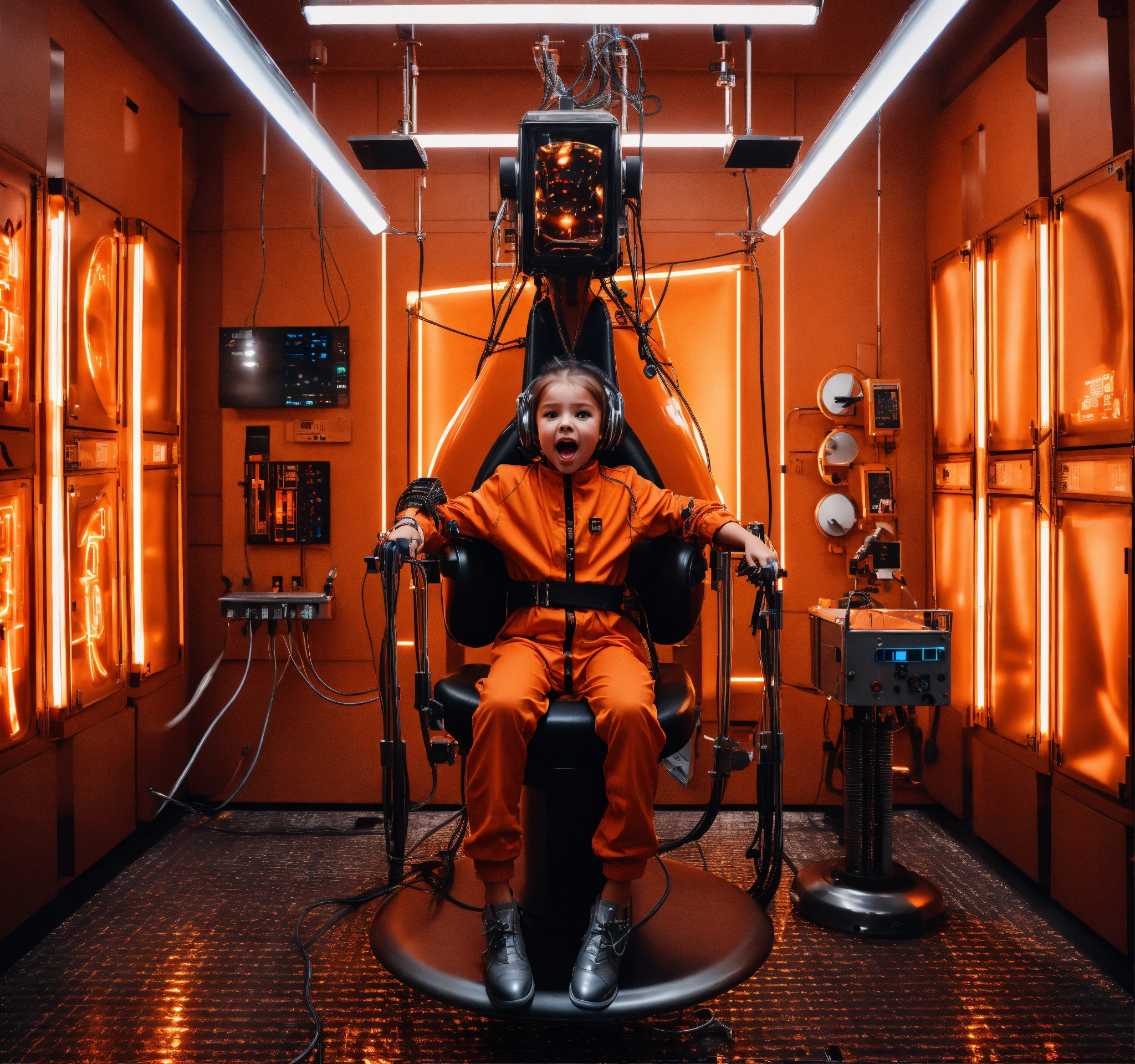 Little girl in futuristic orange jumpsuit is screaming strapped in sitting in a cold steel hair salon chair with dryer on his head with lots of metal tubes hooked up extracting his soul facing forward in a high tech lab room with alot of lights and buttons on the walls, 8k, sci-fi, futuristic, red, giger