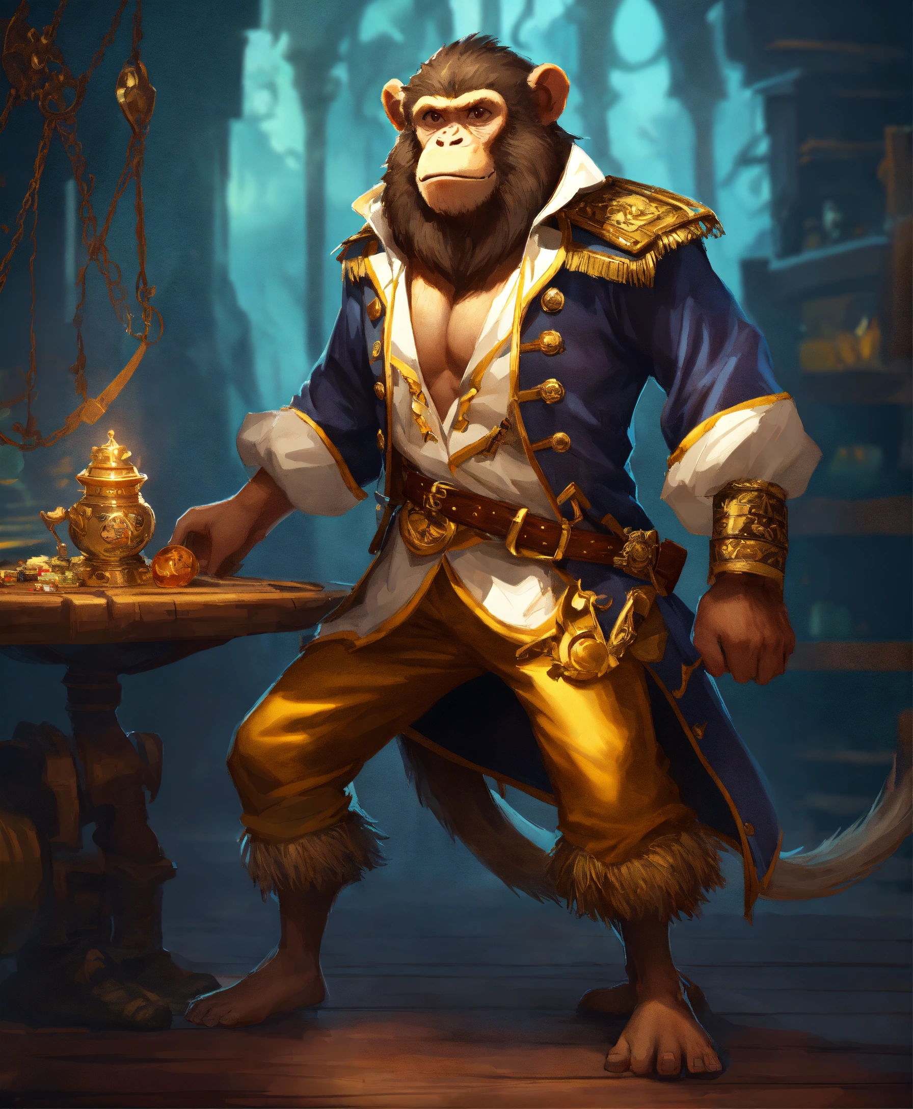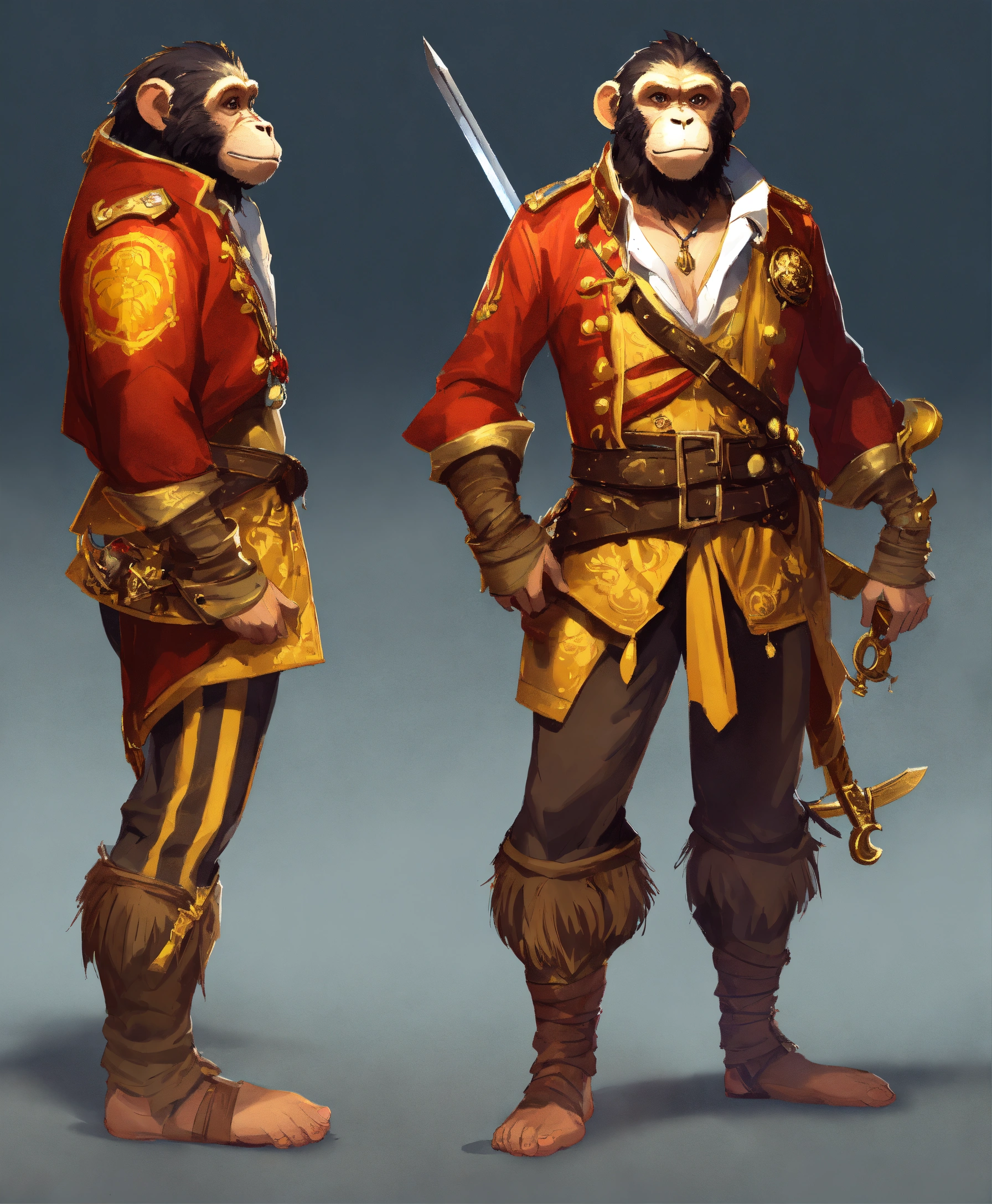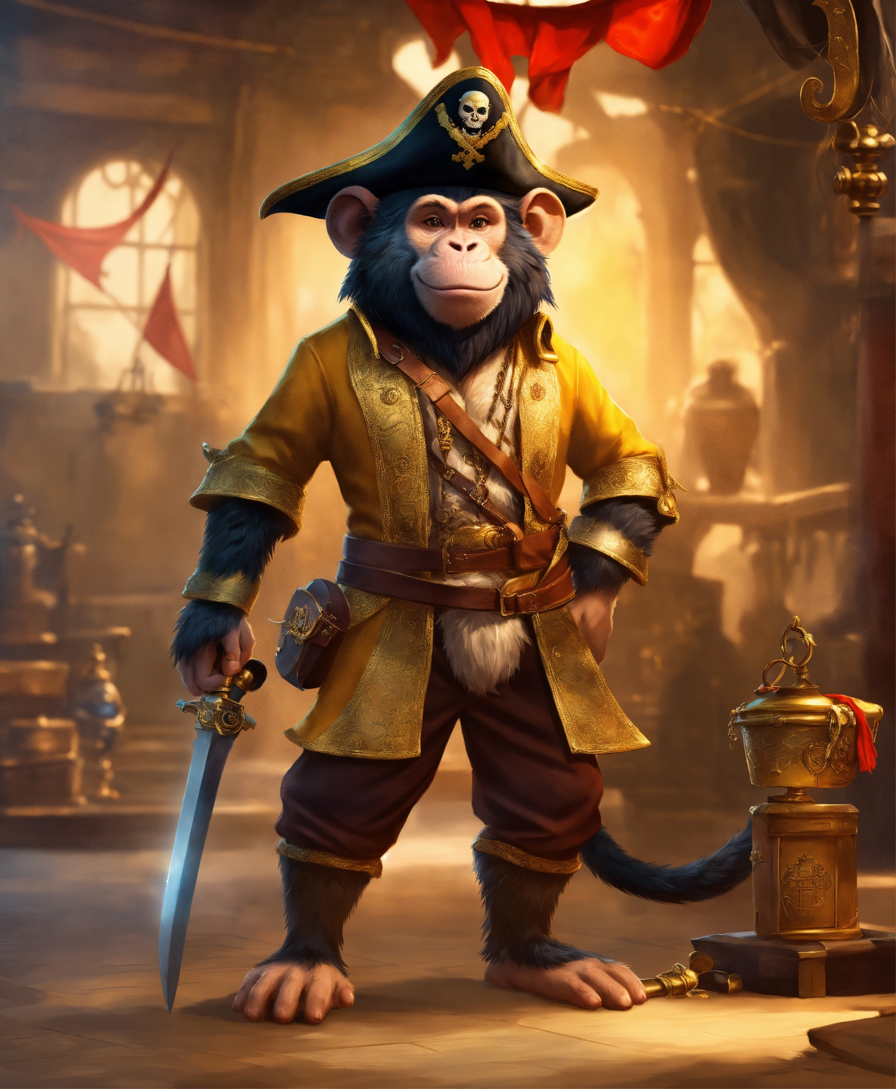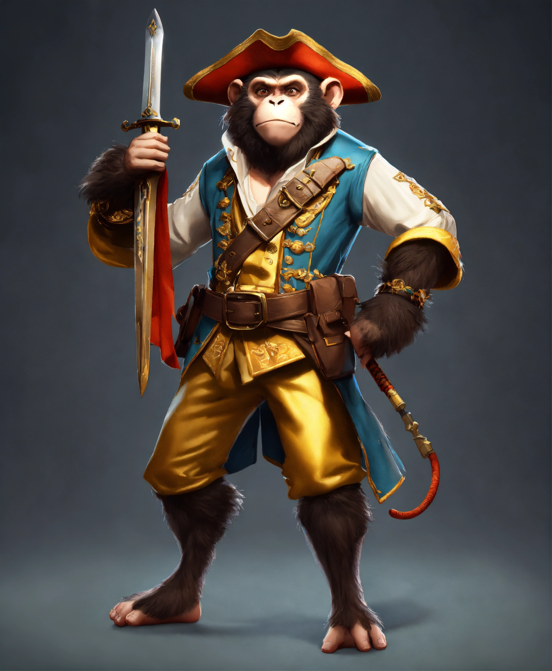 Board game character design, monkey in a pirate's golden shirt and golden pants, sword in hand, ((in full height)), (characters of the game), detailed digital art, ((highly detailed)), digital painting, artstation, concept art, sharp focus, illustration, cinematic lighting