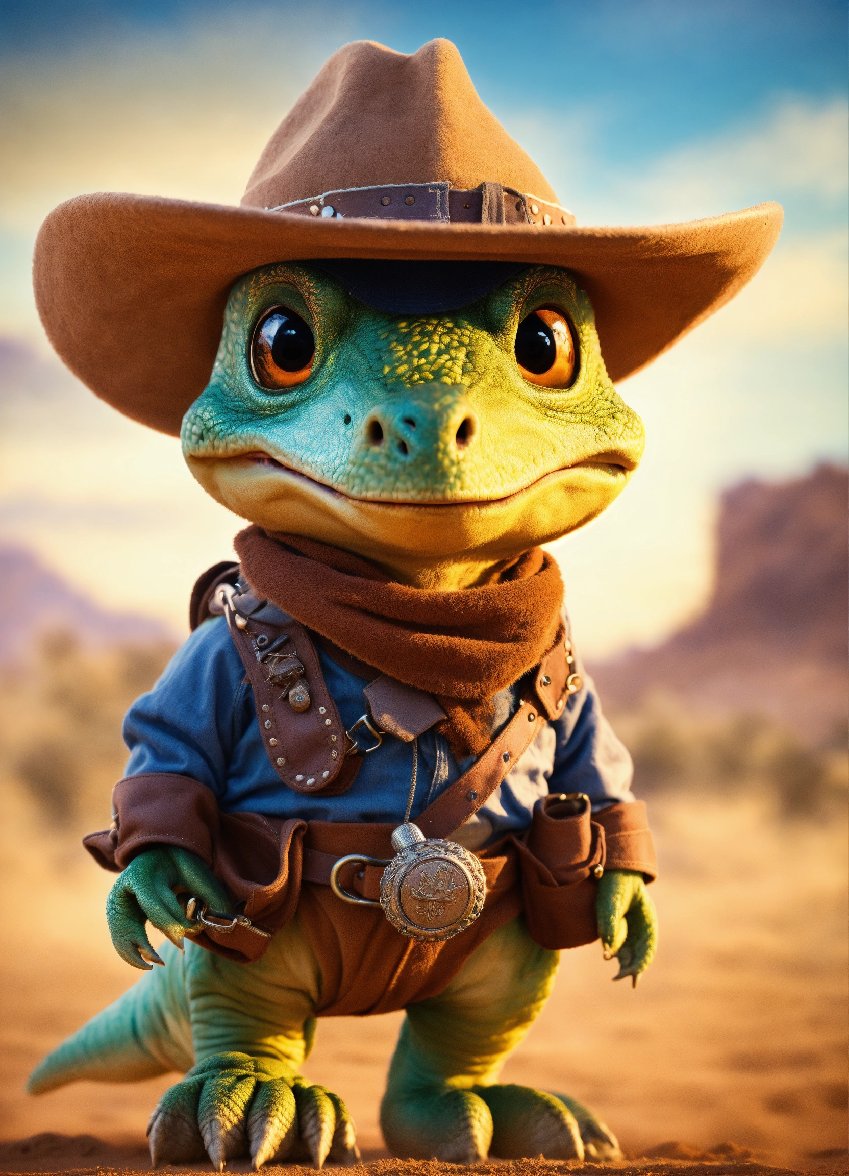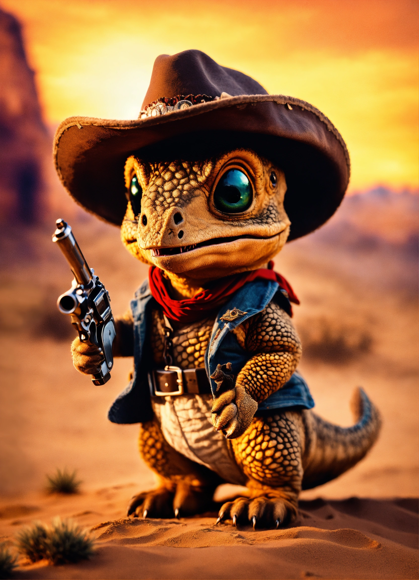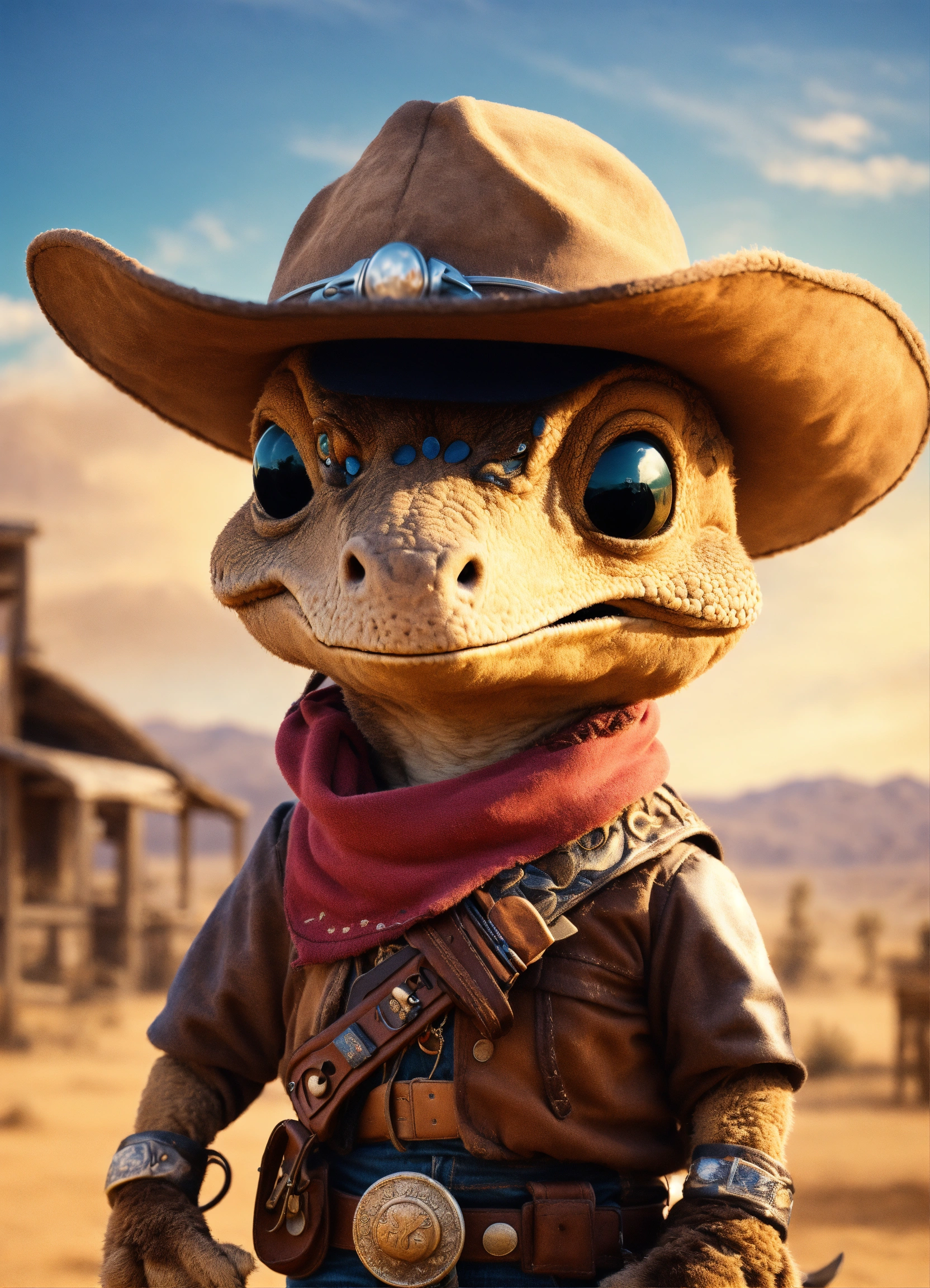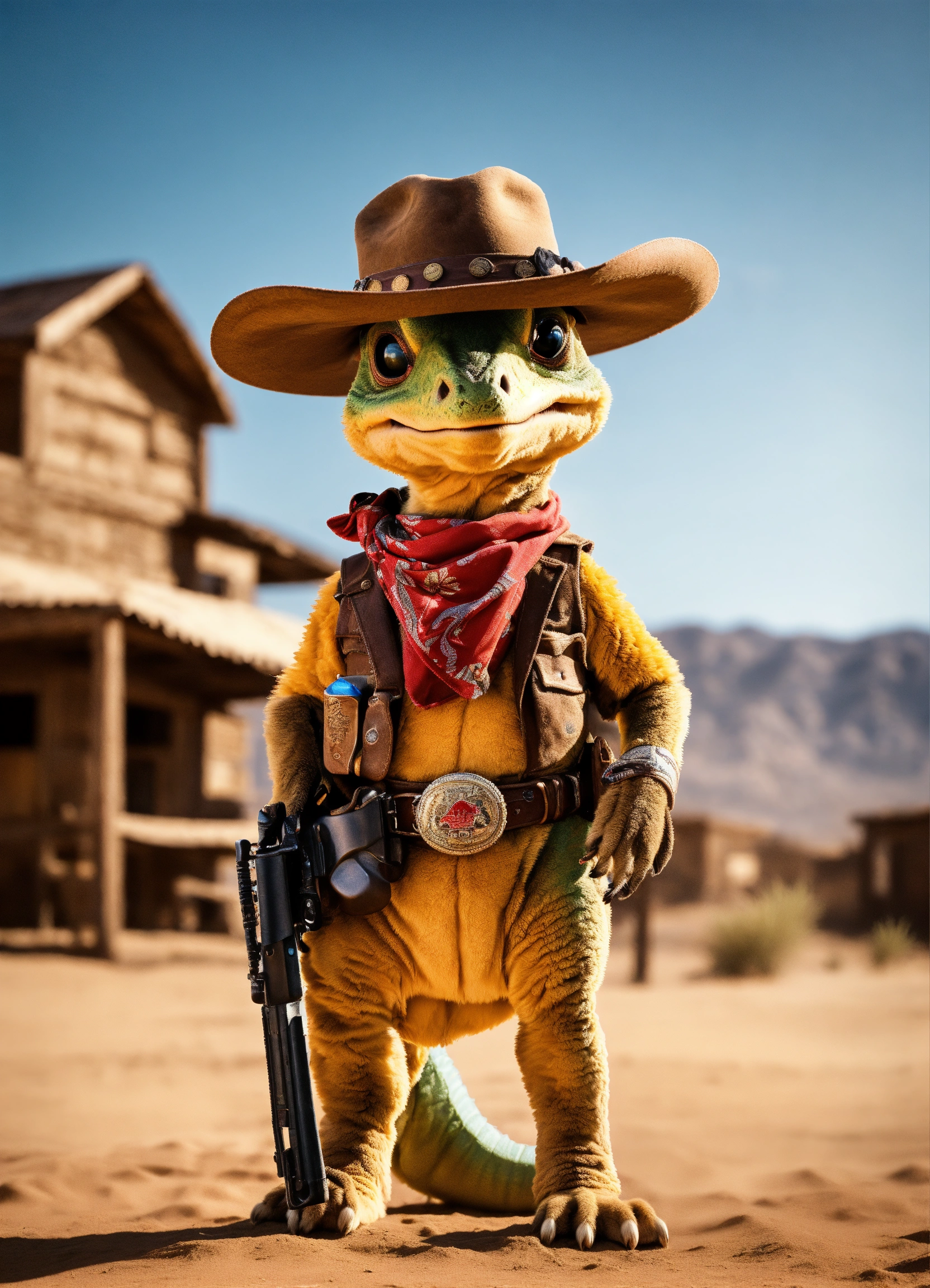 An adorable and fluffy baby dinosaur with big colored eyes, cowboy, the good the bad and the ugly theme, bandana over mouth, western, desert, with a western village and saloon, sandstorm, old revolver in hand, bright sky, with blur background, high quality, 8k