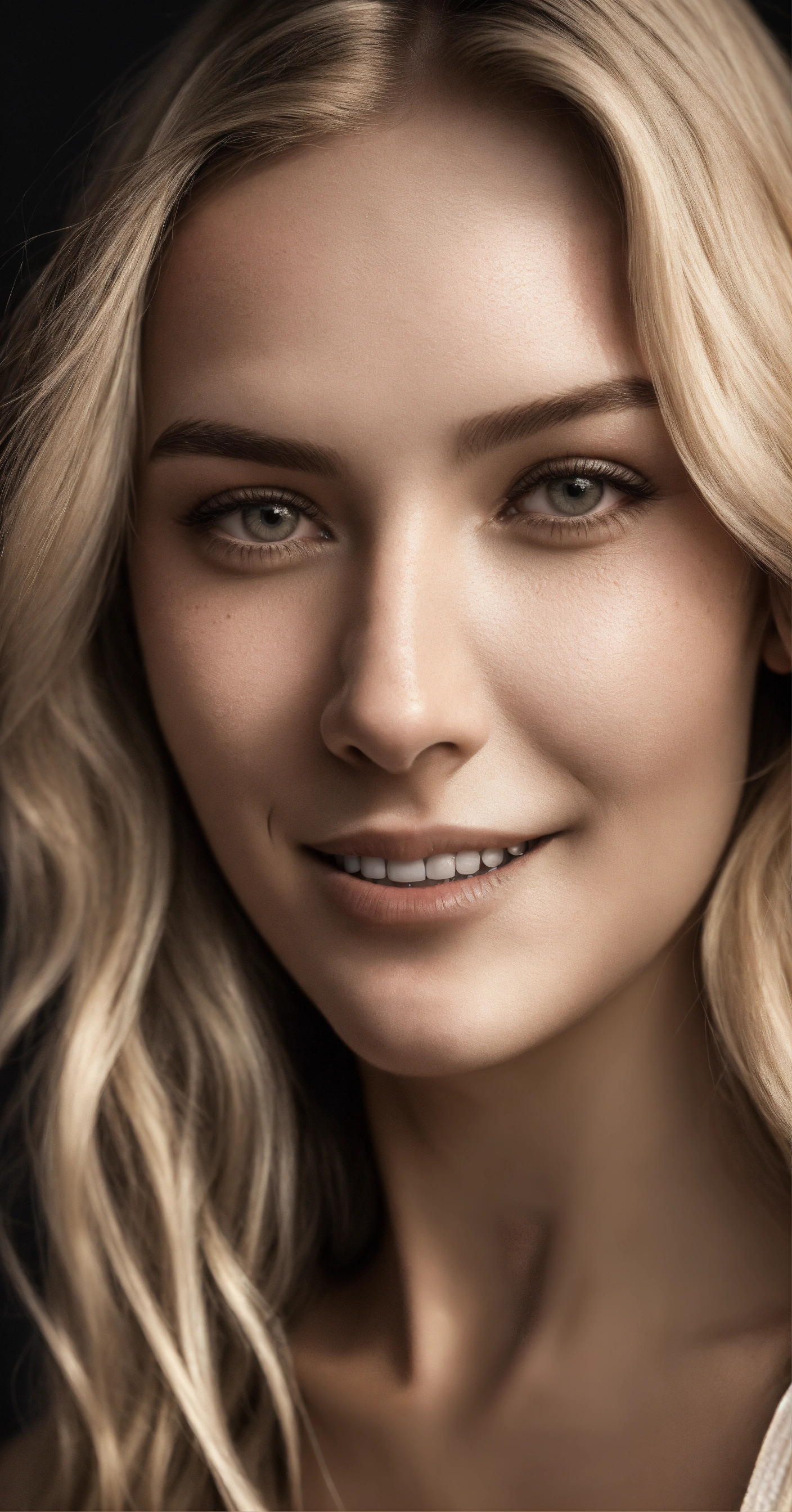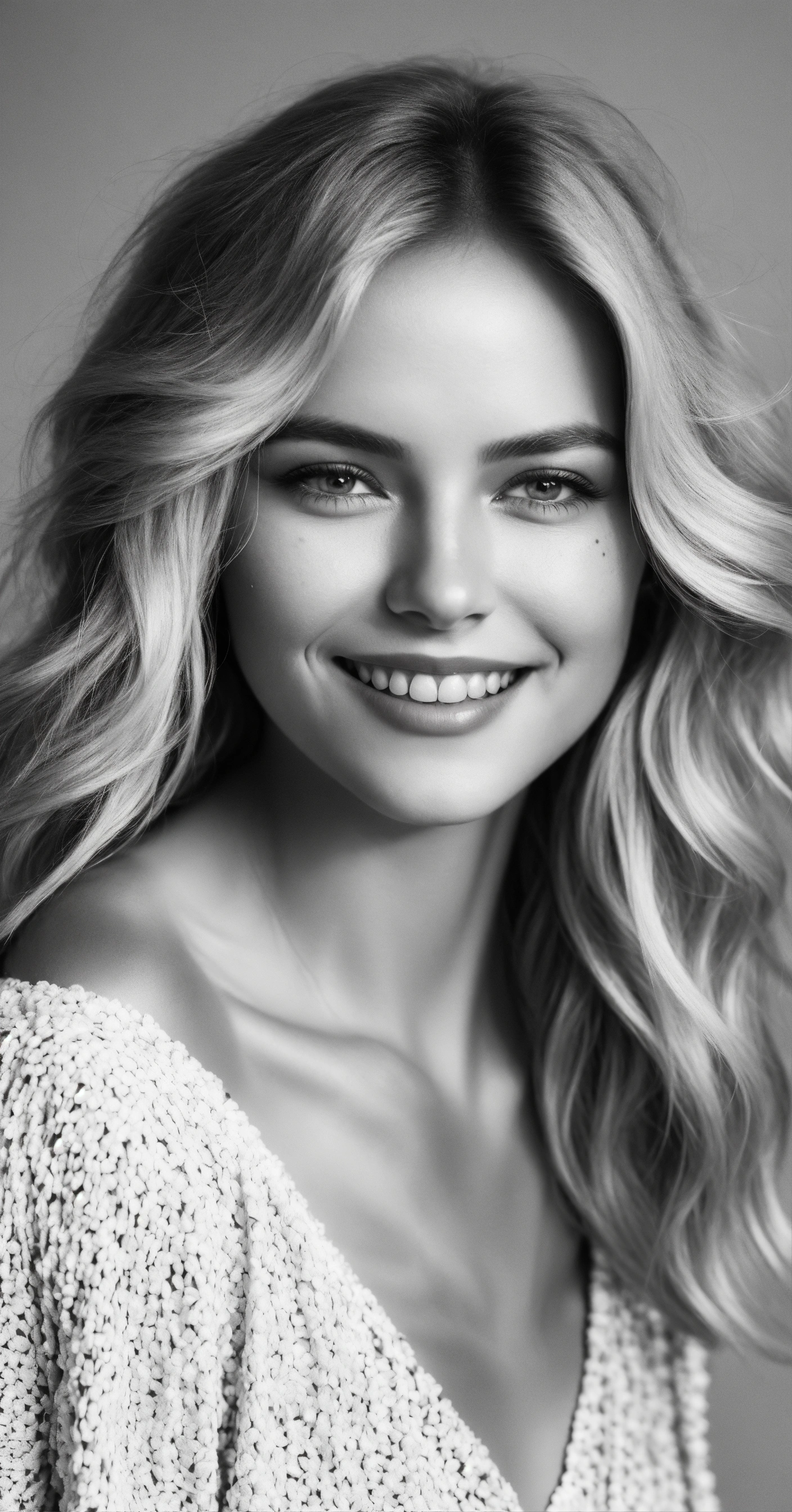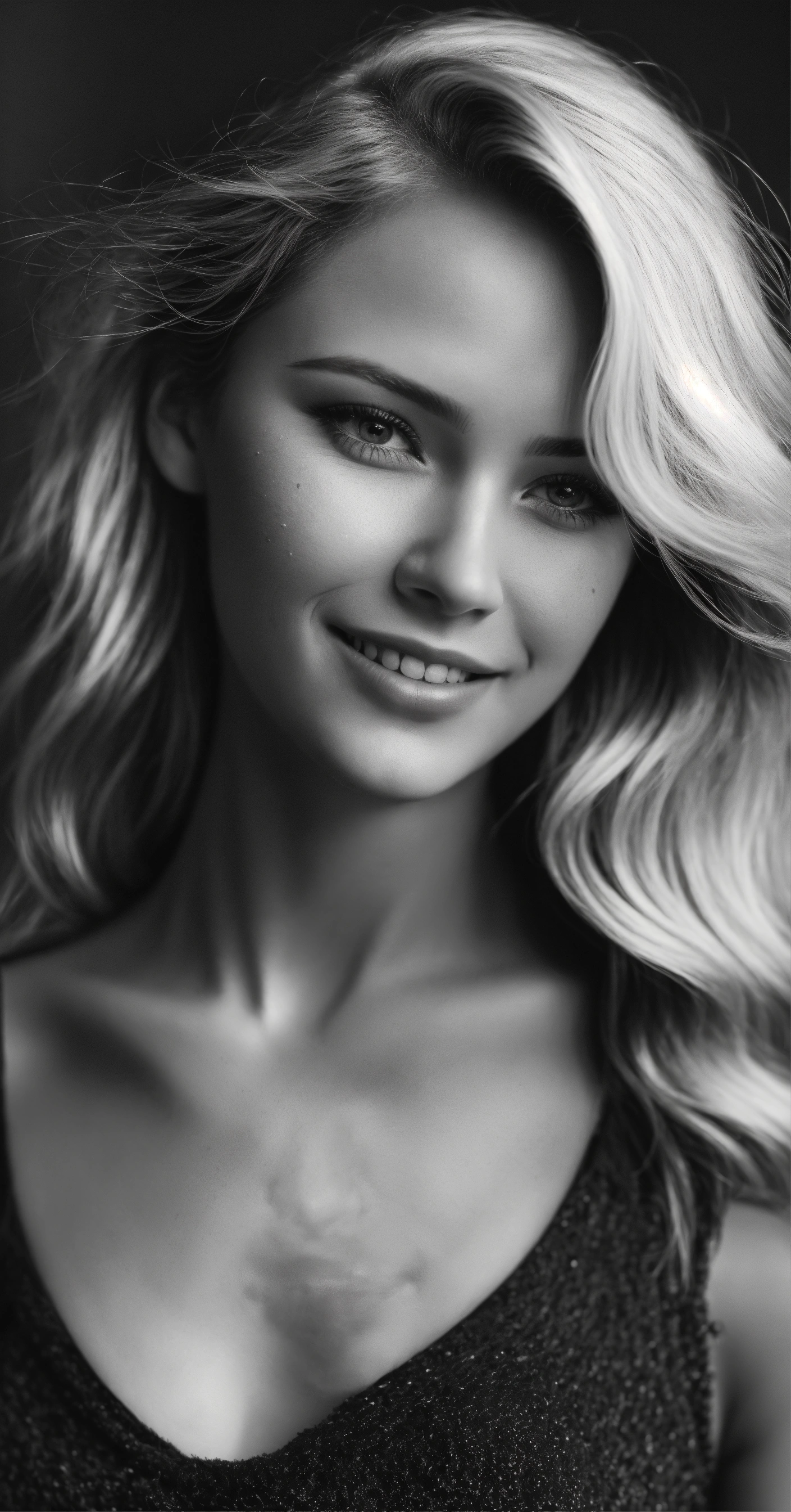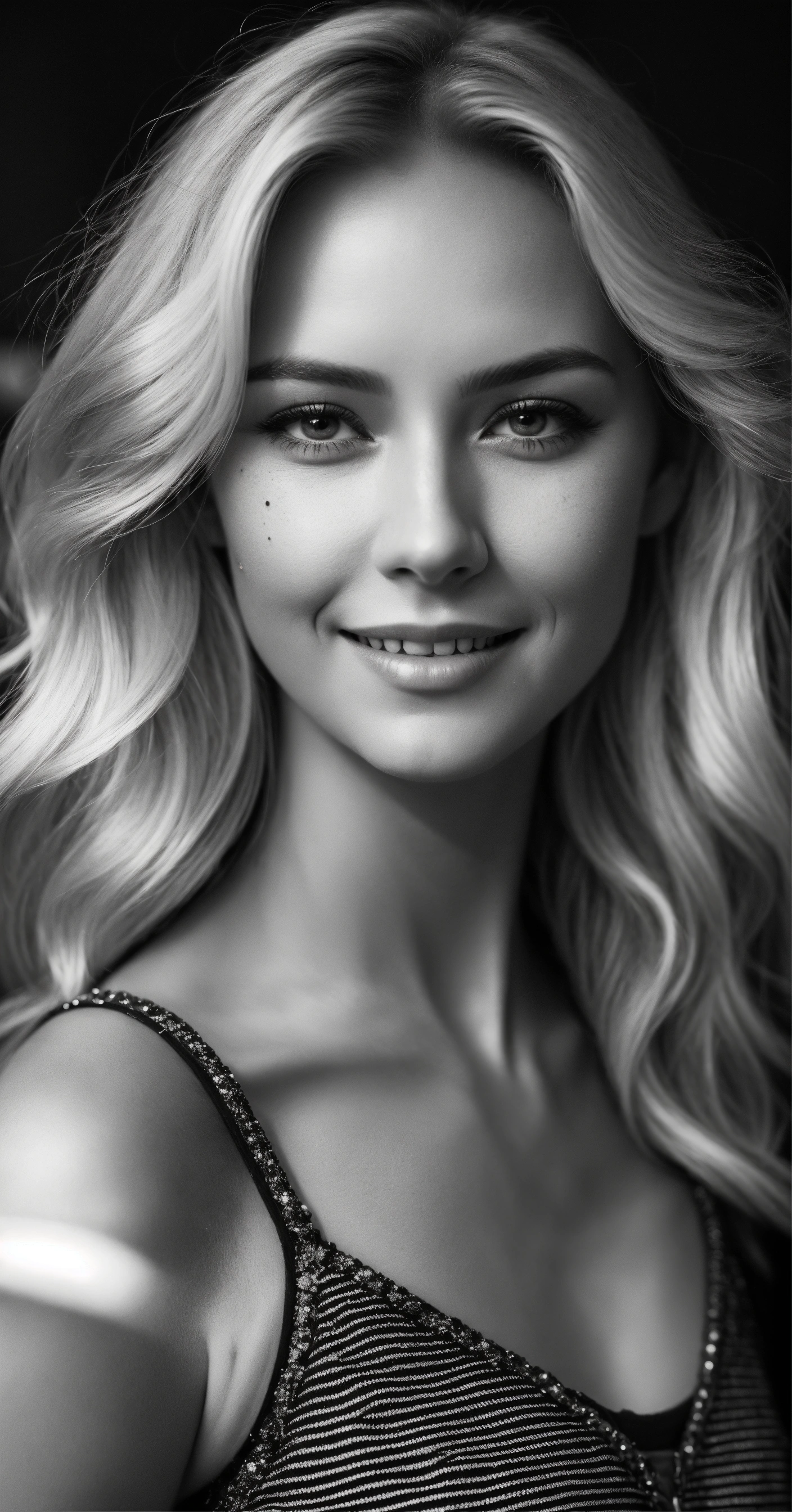 Photo with knowing smile of a blonde female model with natural skin detail and small mole, black and white studio photo, light eyes, cinematic atmosphere, parcourt style studio light