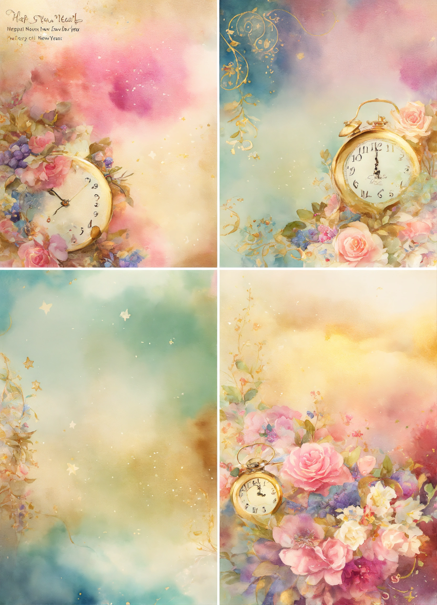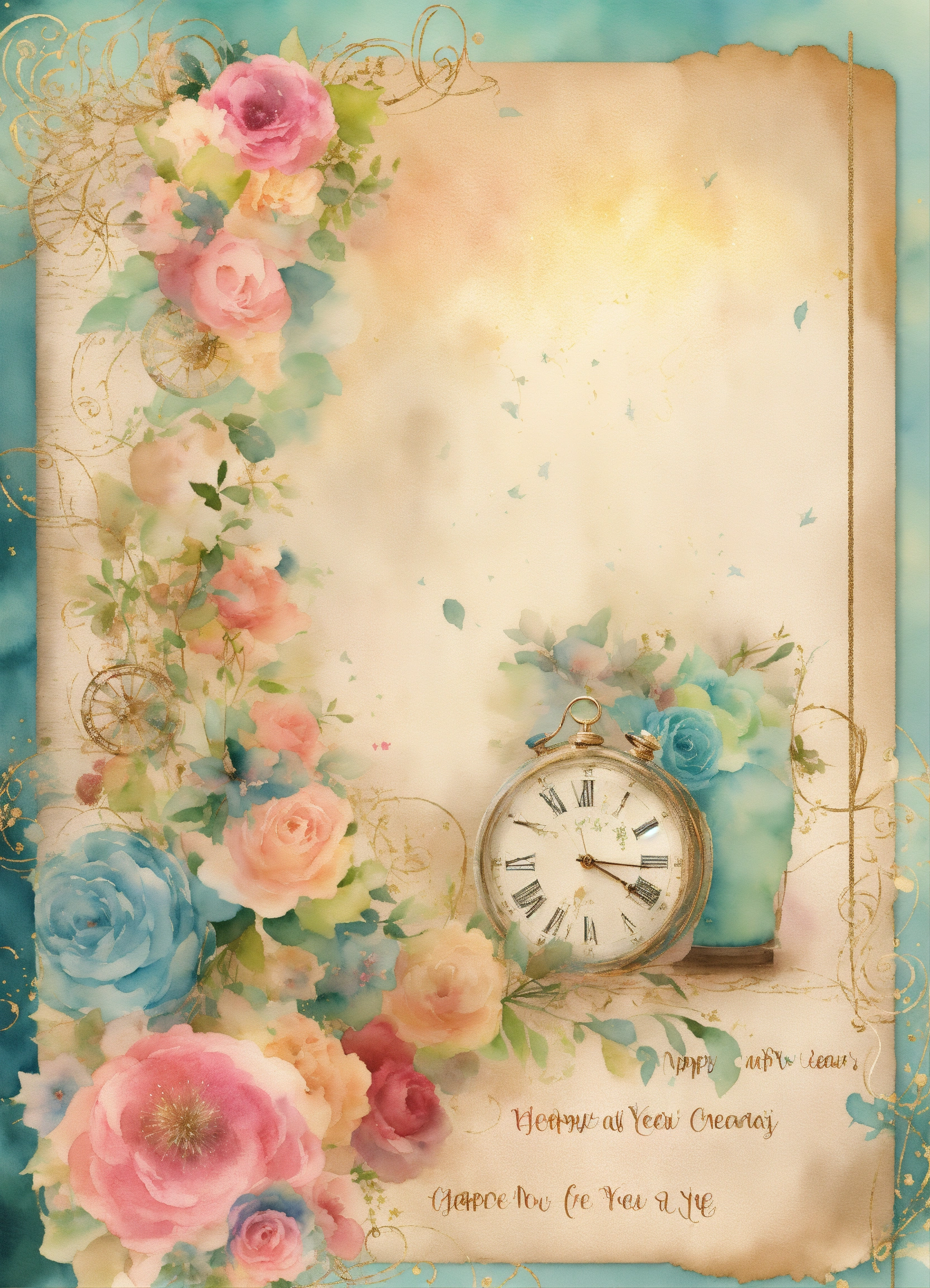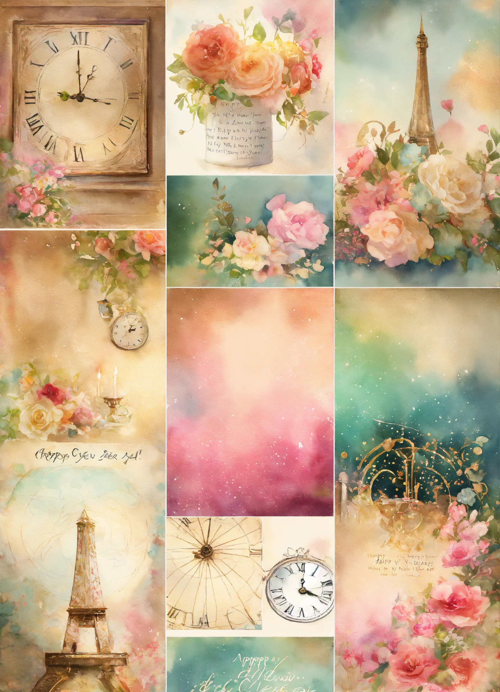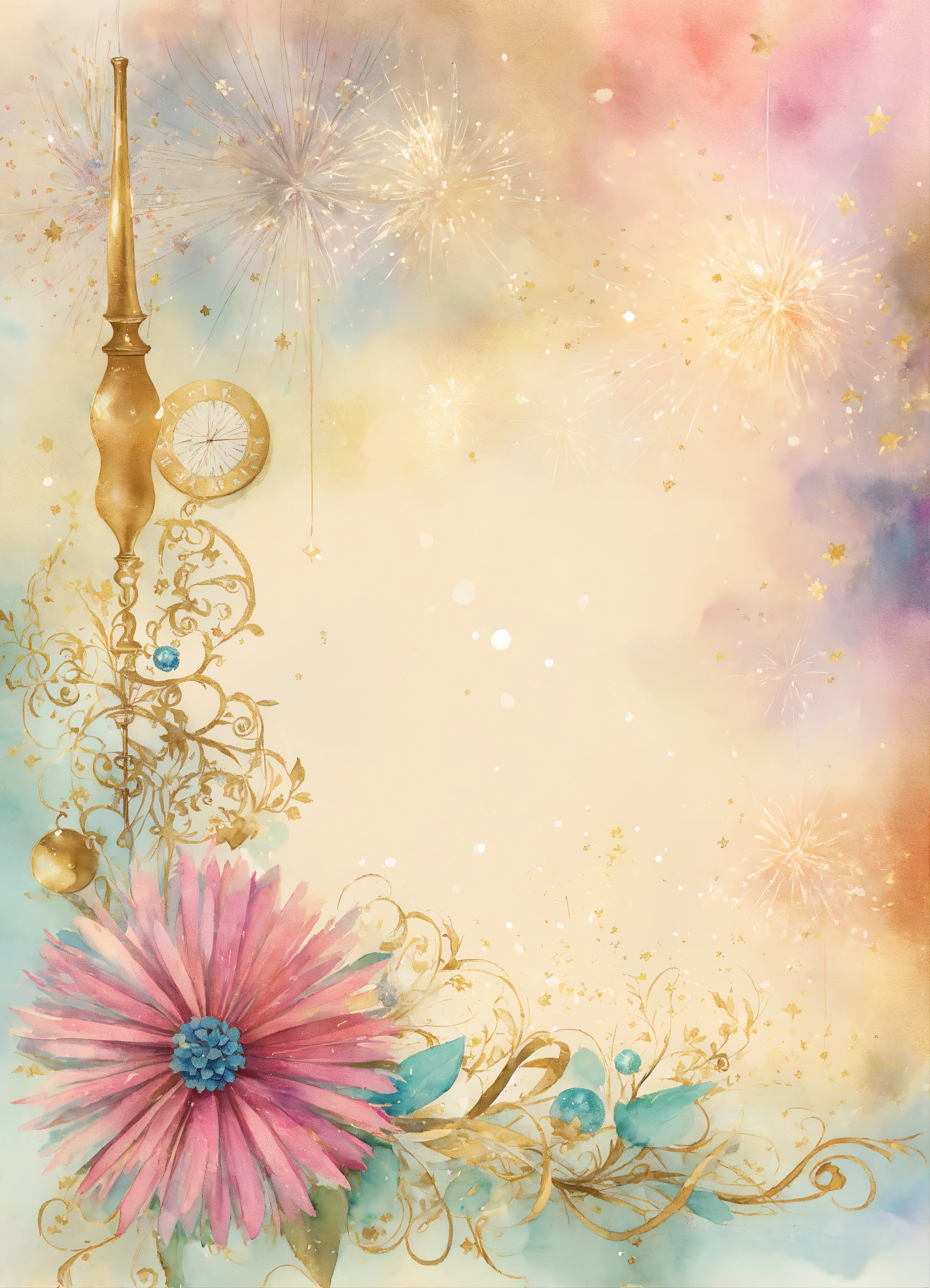 Shabby chic dreamy mist pastel junk journals "design captivating watercolor illustrations of new year's eve celebrations, including iconic elements like fireworks, champagne glasses, clocks striking midnight, party hats, and festive decorations. auld lang syne a traditional scottish song often sung at the stroke of midnight to bid farewell to the old year and welcome the new one. provide each element as a separate png image, suitable for effortless cutting and use in crafting projects like card making, scrapbooking, and creating new year's-themed decorations. these digital illustrations should capture the excitement and hope of ringing in the new year, offering a versatile resource for crafting joyful and visually appealing new year's creations." swirling magical fairytale abstract art style