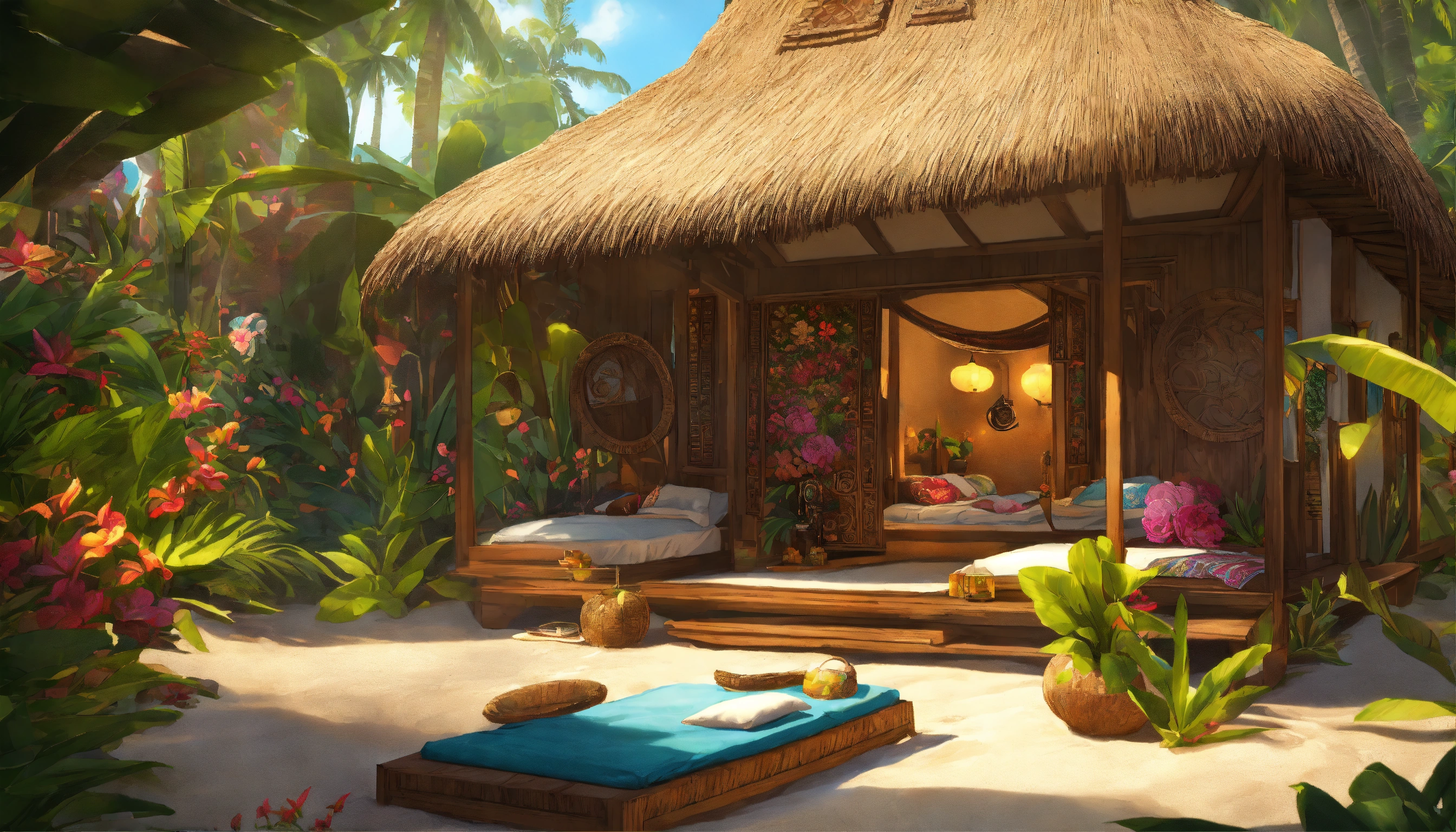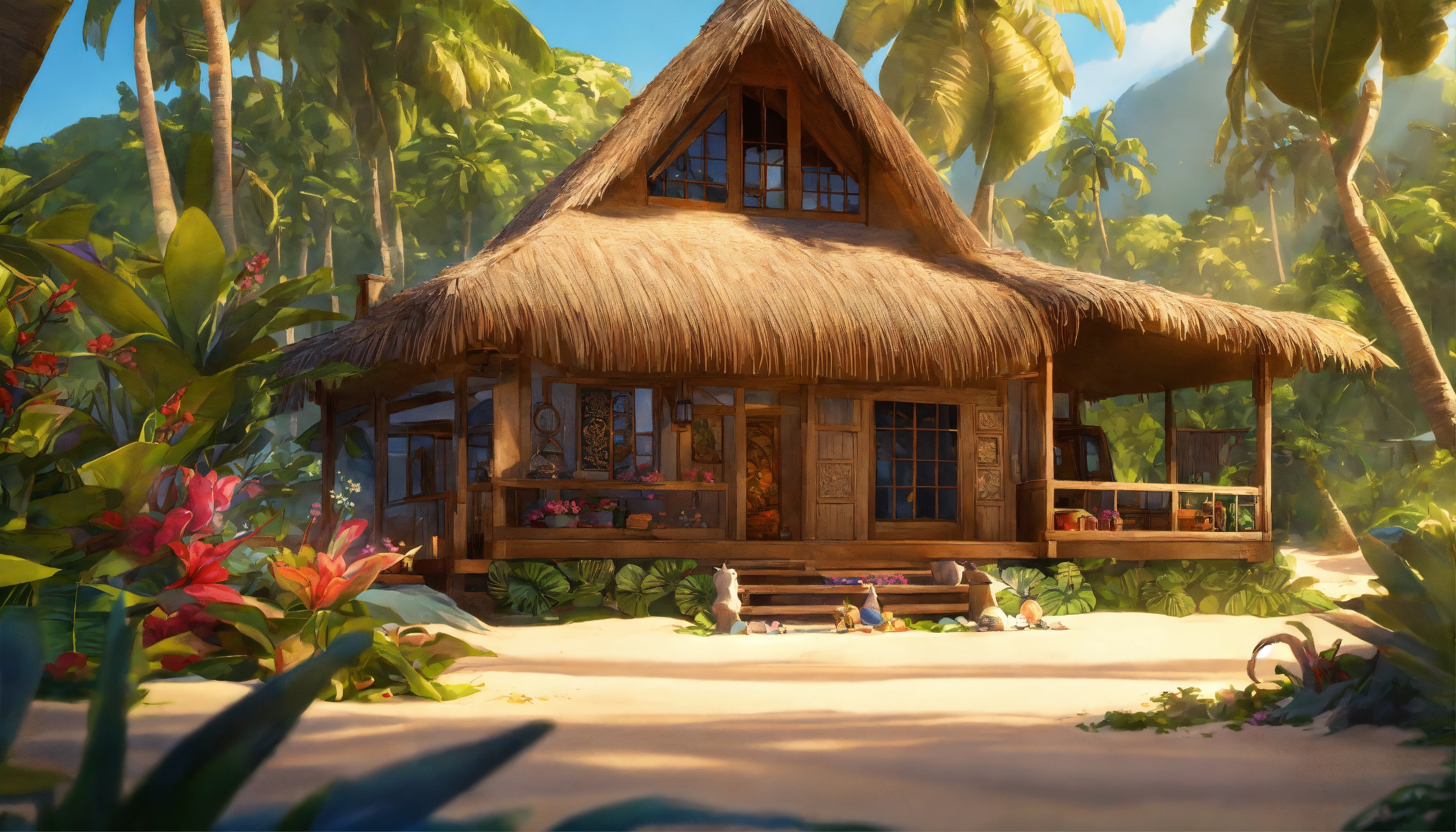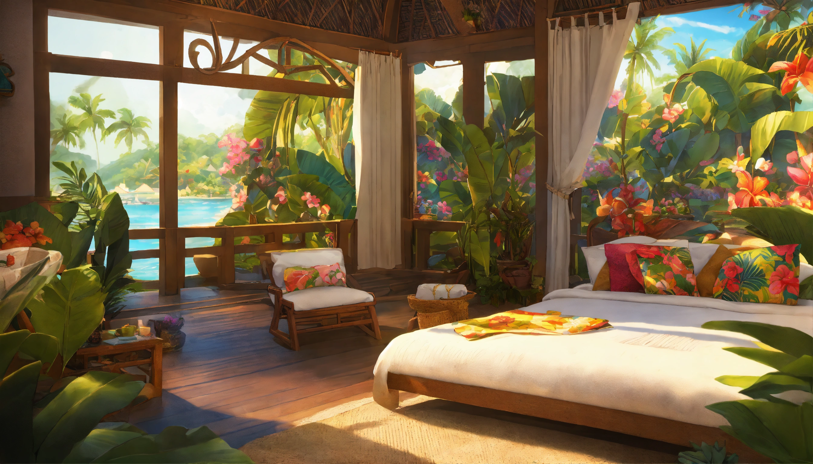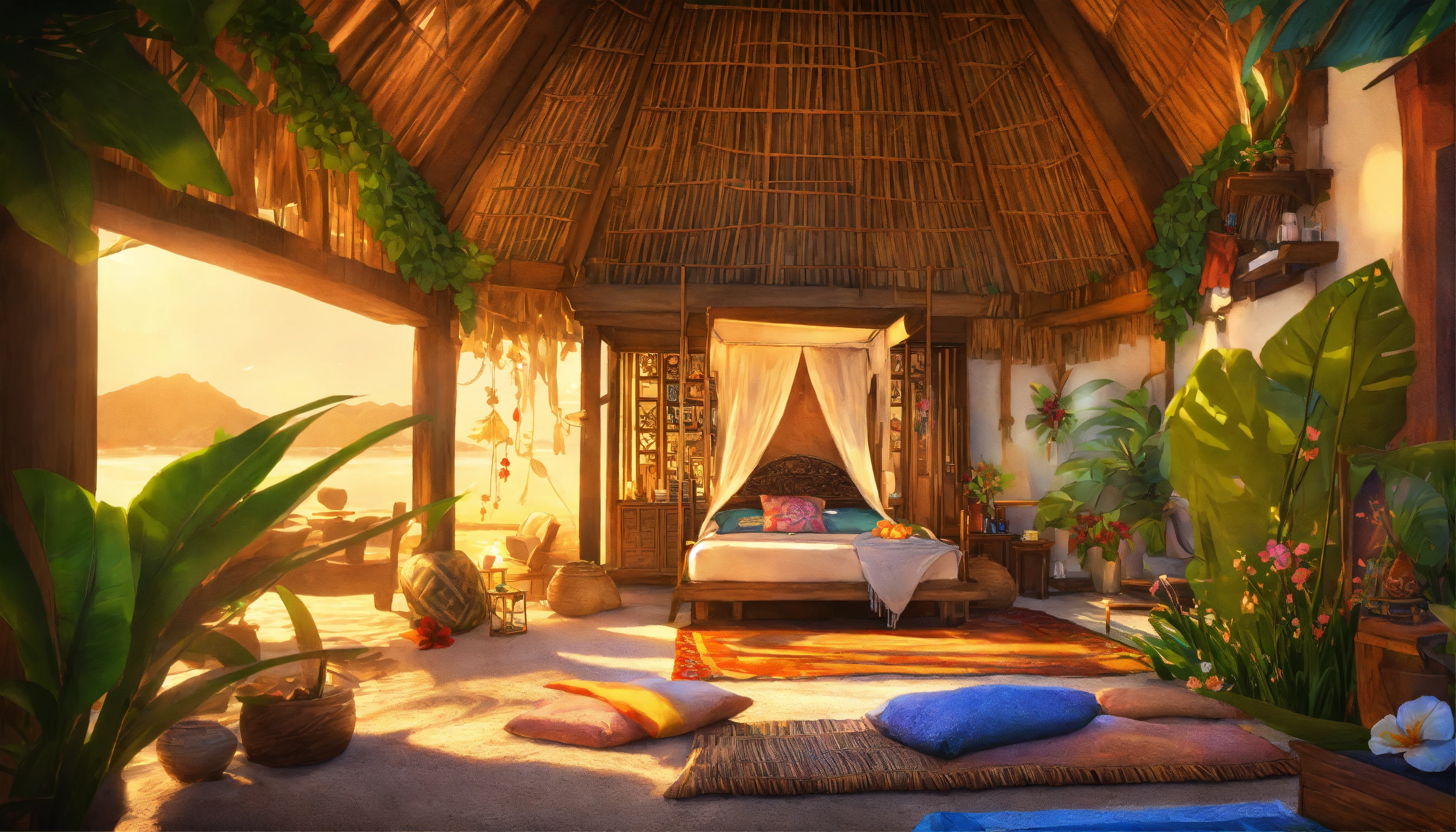 Concept art of tropical village house, polynesian, fantasy, moana house, island, beautiful, tribe, detailed, intricate, topical flowers, white sand, village house on the beach, interior, inside of the house, layout, interior design, bedroom, feminine floral bed blanket, girly tropical