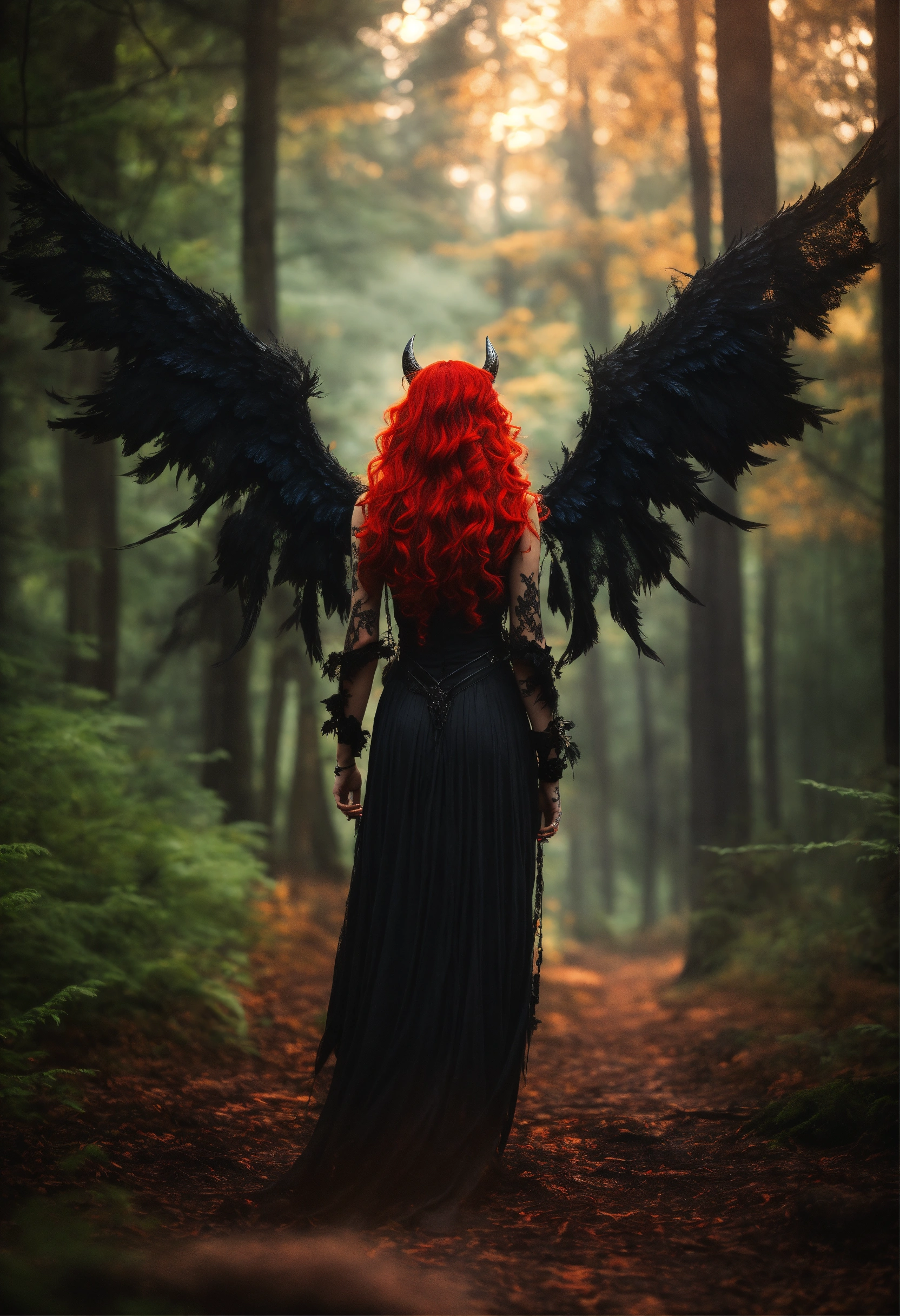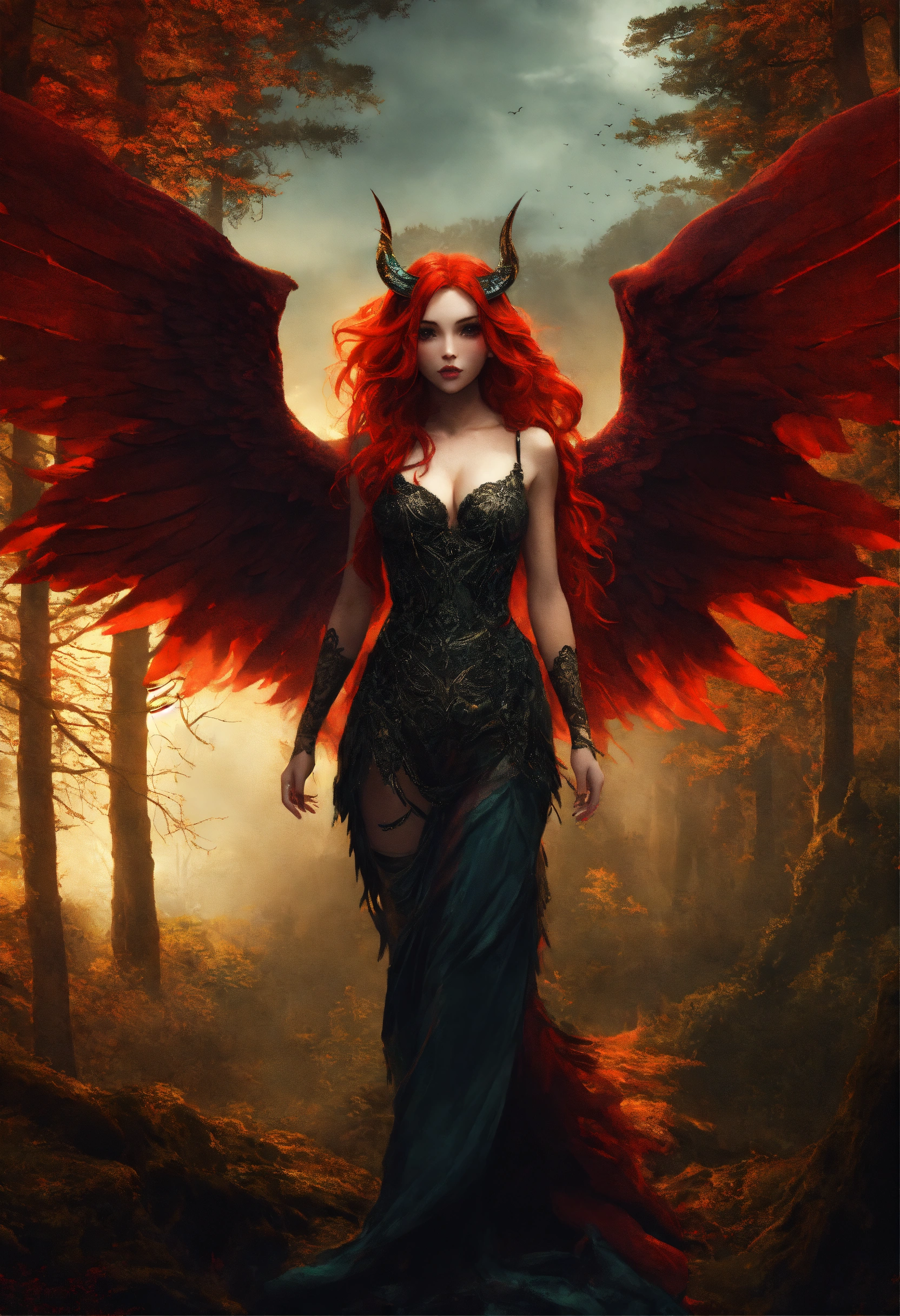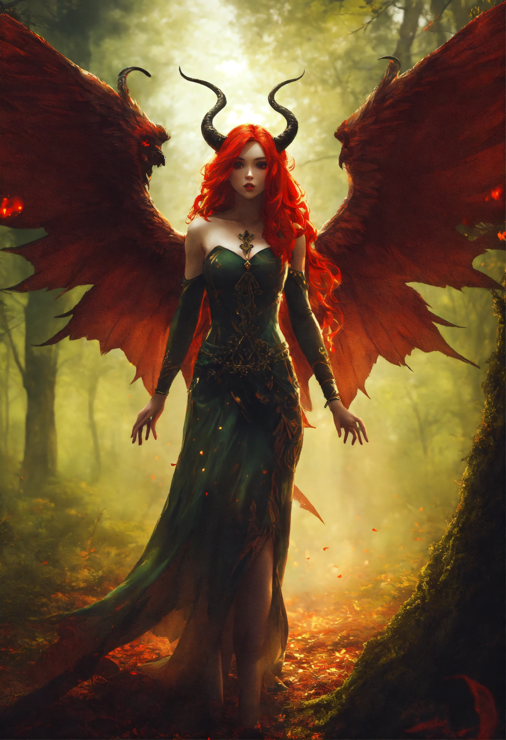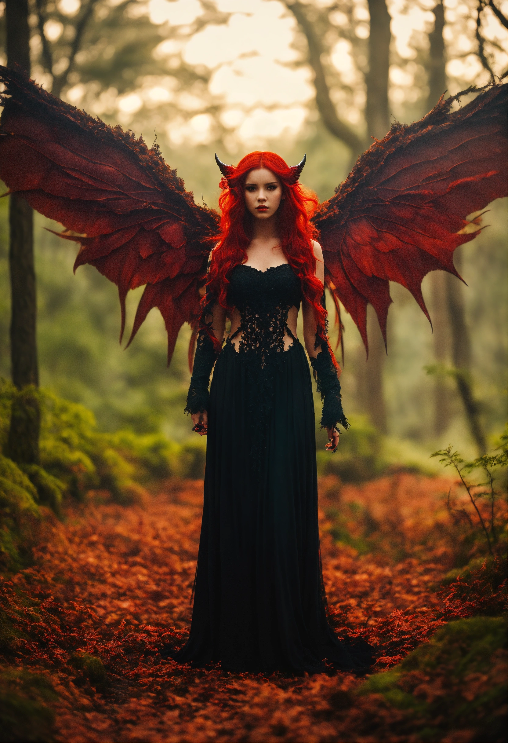 Female demon with wings and eerie red hair with forest in the background
