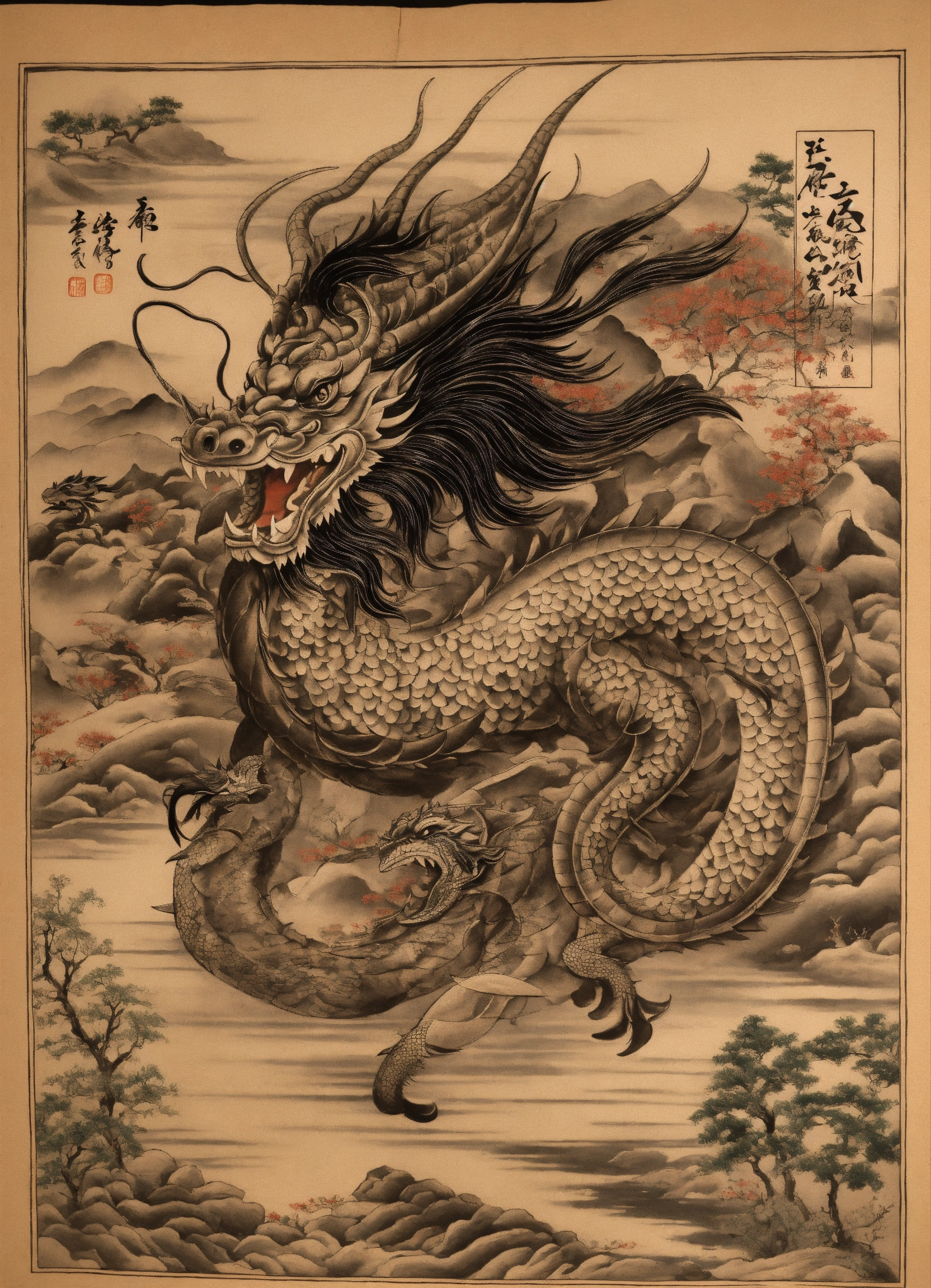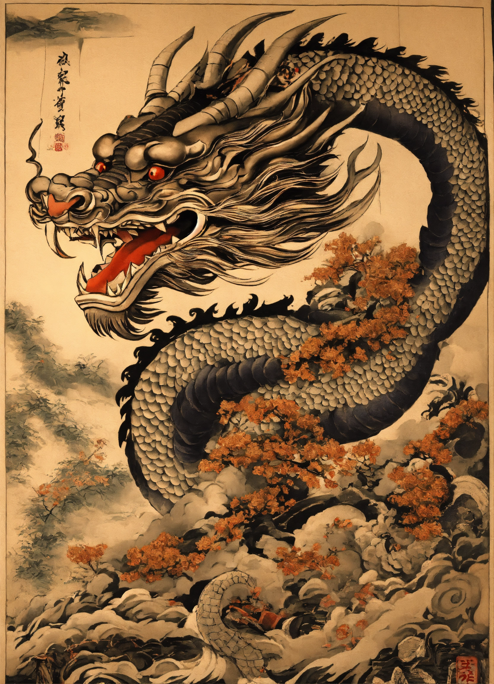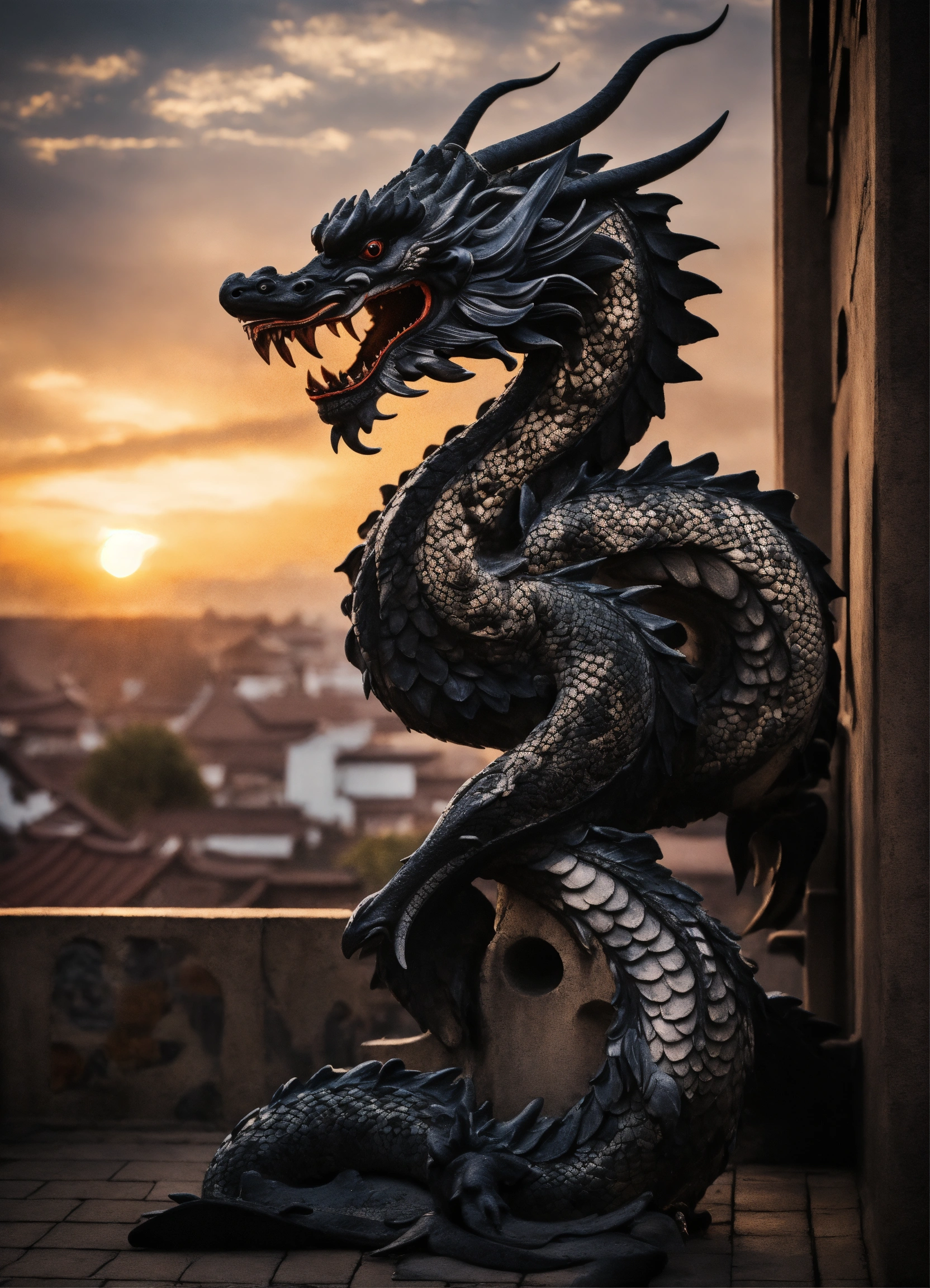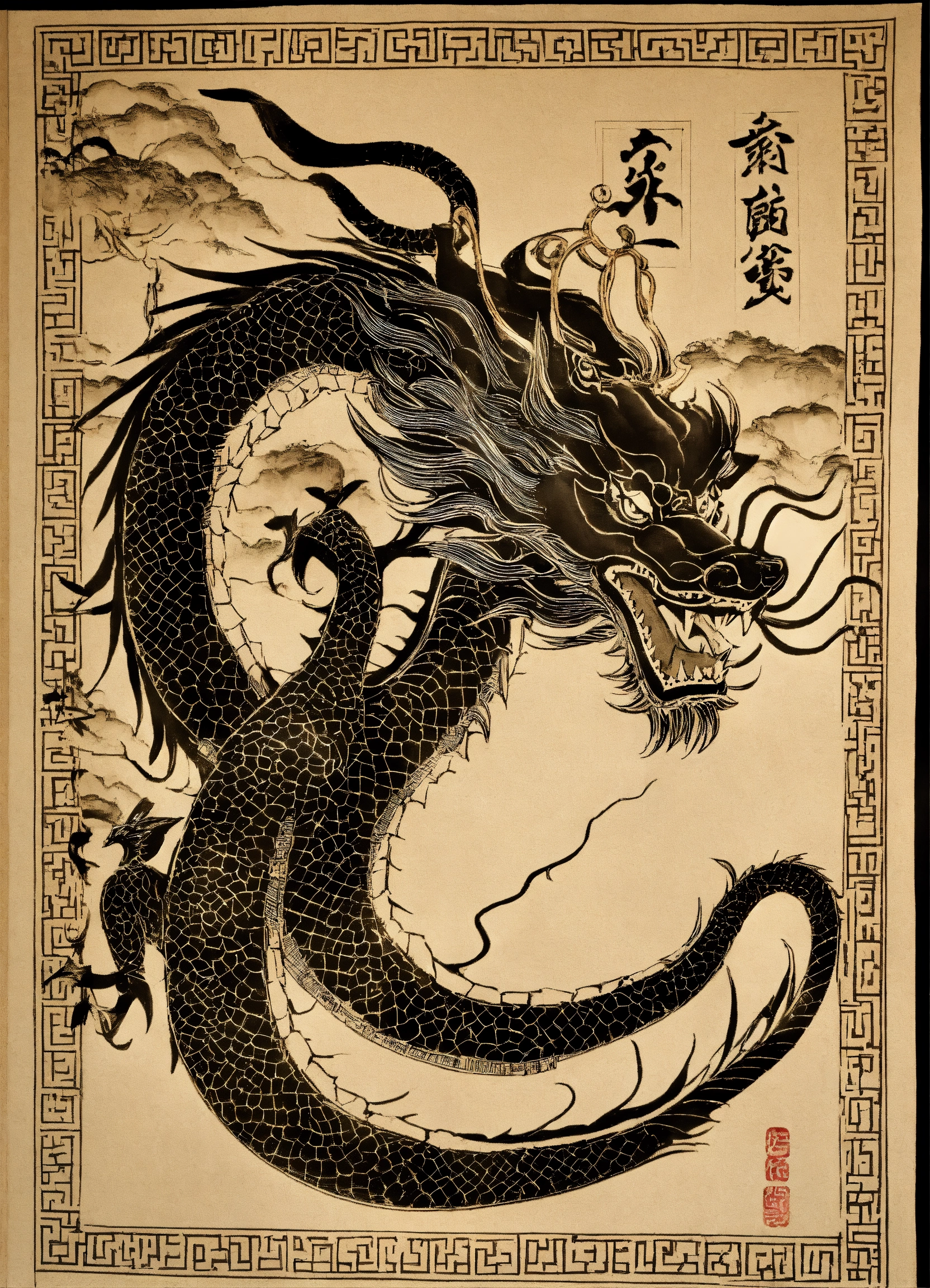 Komplettes rückentattoo in schwarz weiss bei einem mann, mit altchinesischen häusern im hintergrund und einem samuraischwert im vordergrund, um das samurauschwert schlingt sich ein chinesischer drache, das schwert ist auch verziehrt mit einem frauengesicht und totenkopf