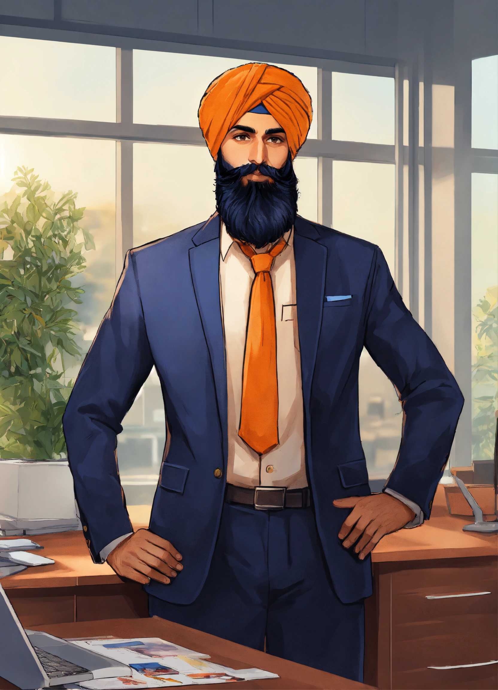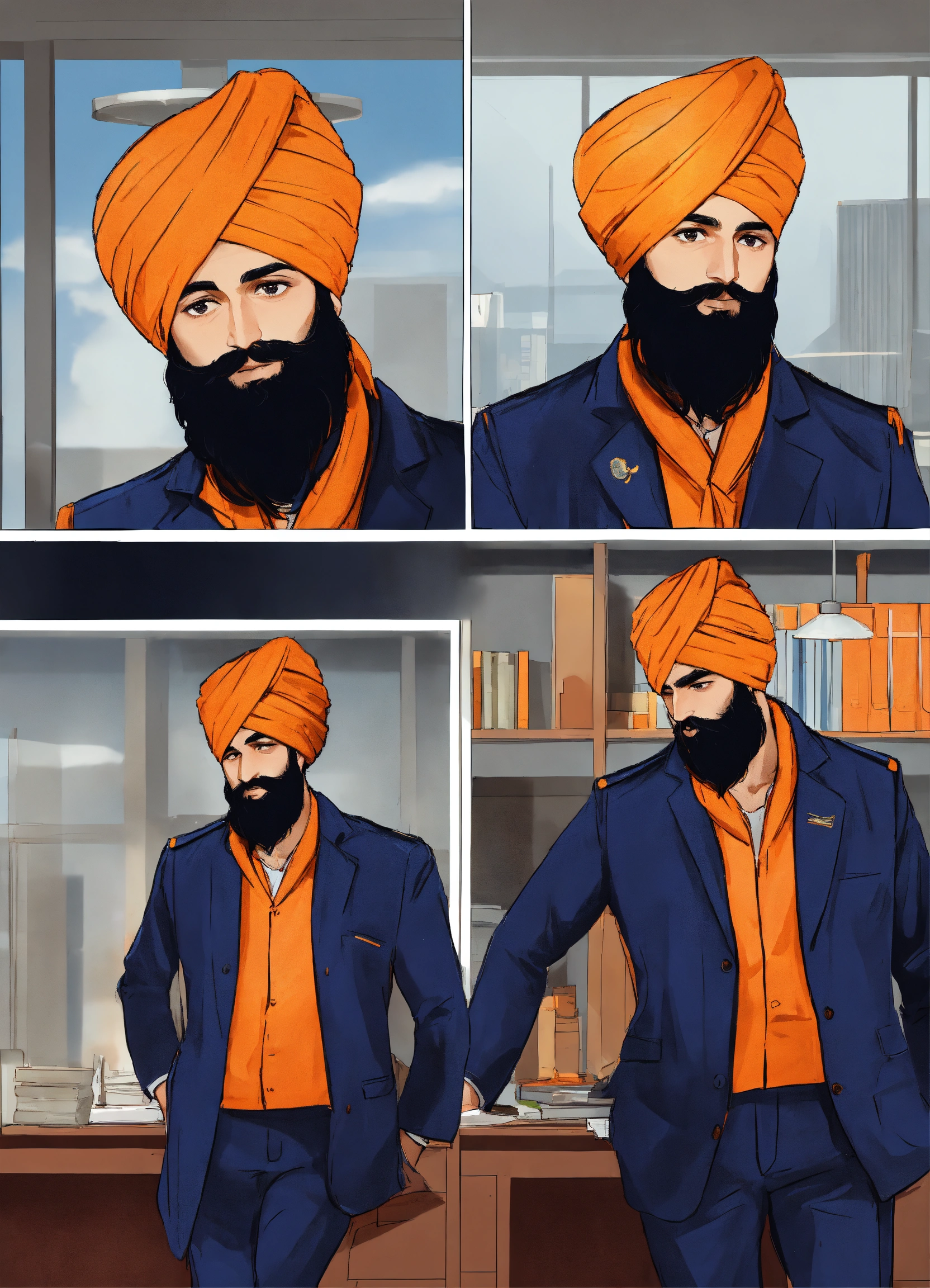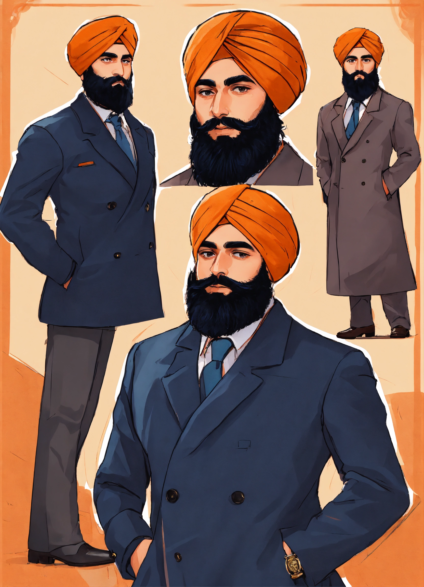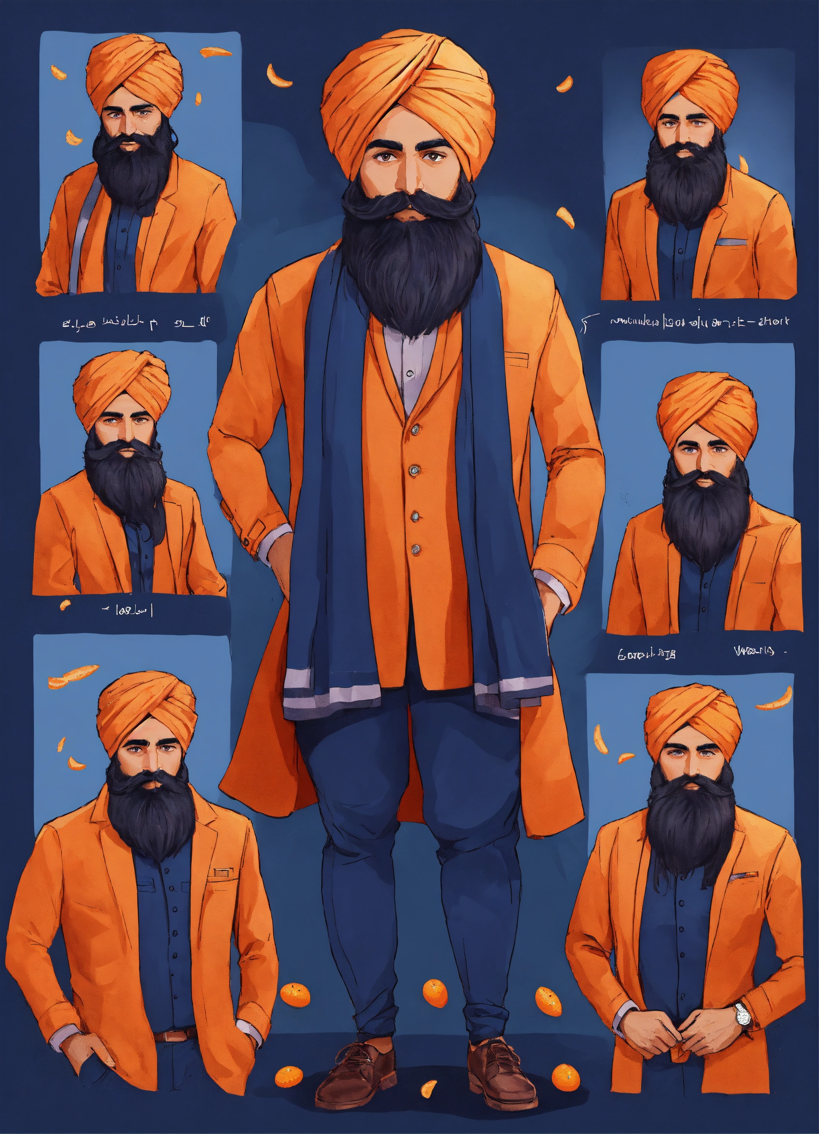 A punjabi man with long beard with orange turban waring navy blue coat age 40 standing in office illustration with multiple poses