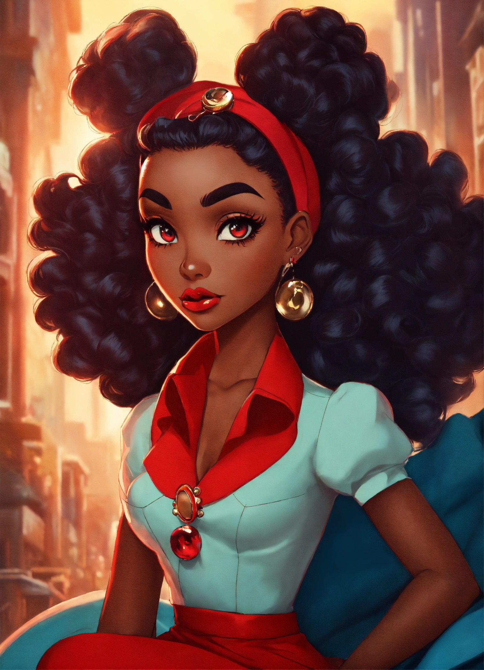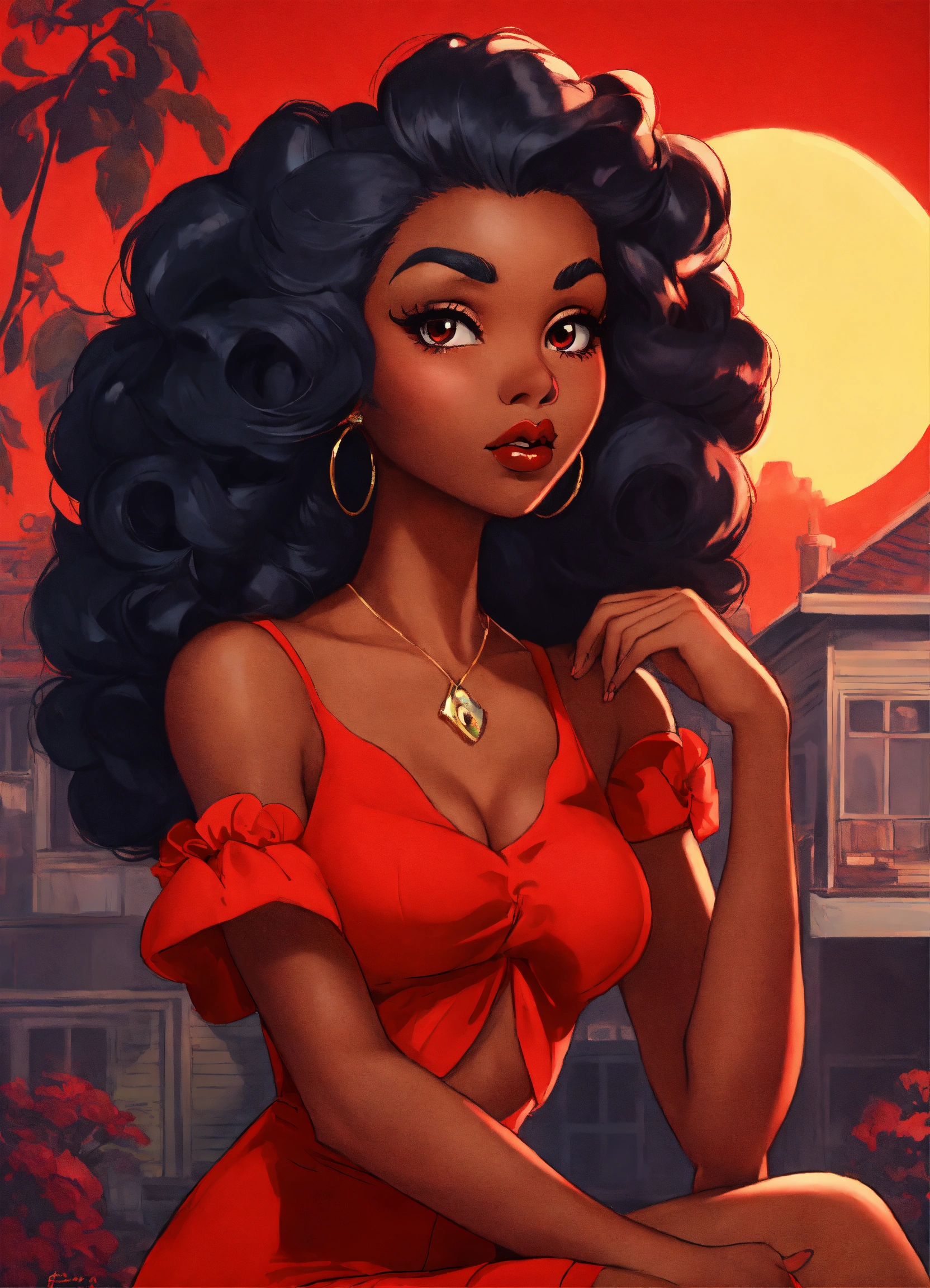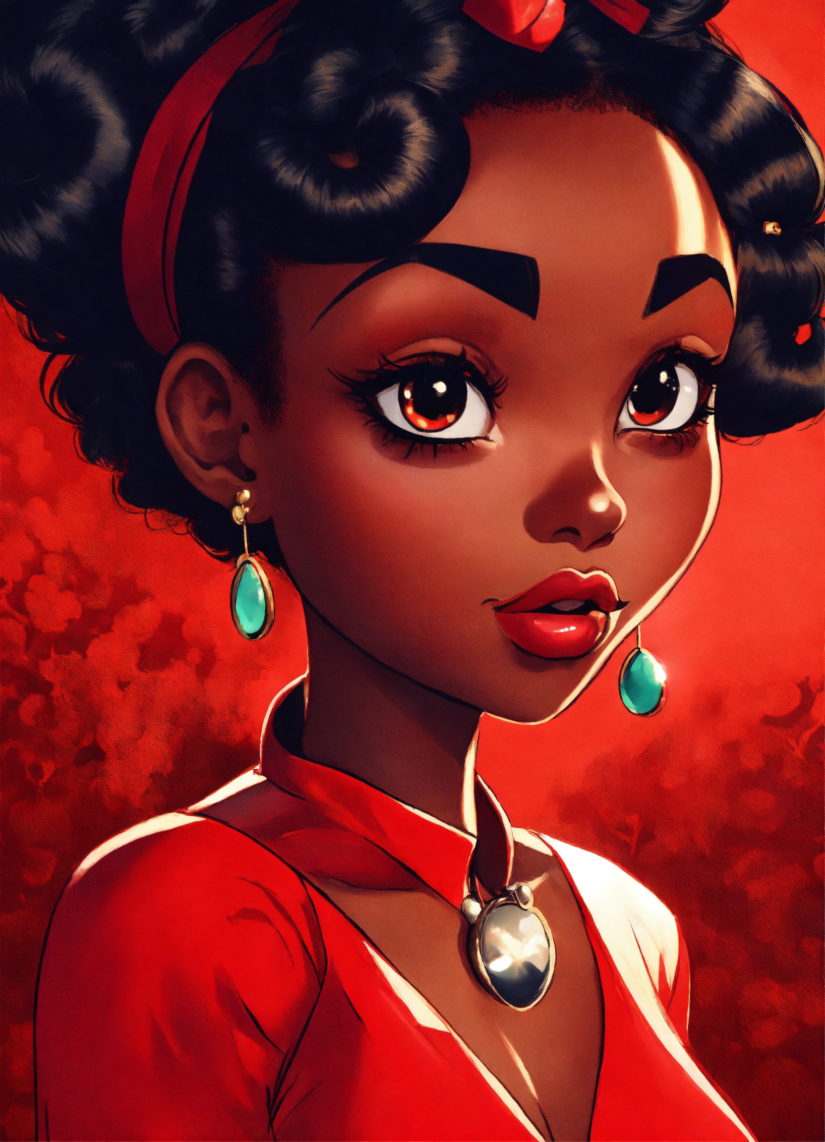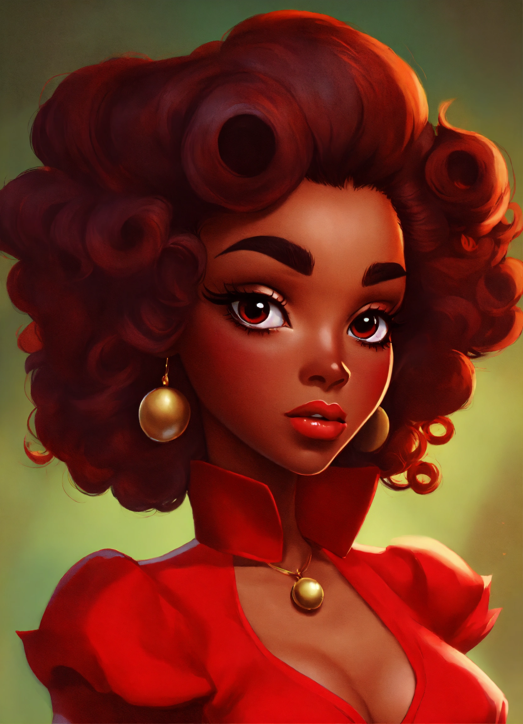 Create a stern betty boop meets powerpuff girl inspired black female character in red with oversized red flowing hair and big gorgeous eyes, retro 1940’s anime