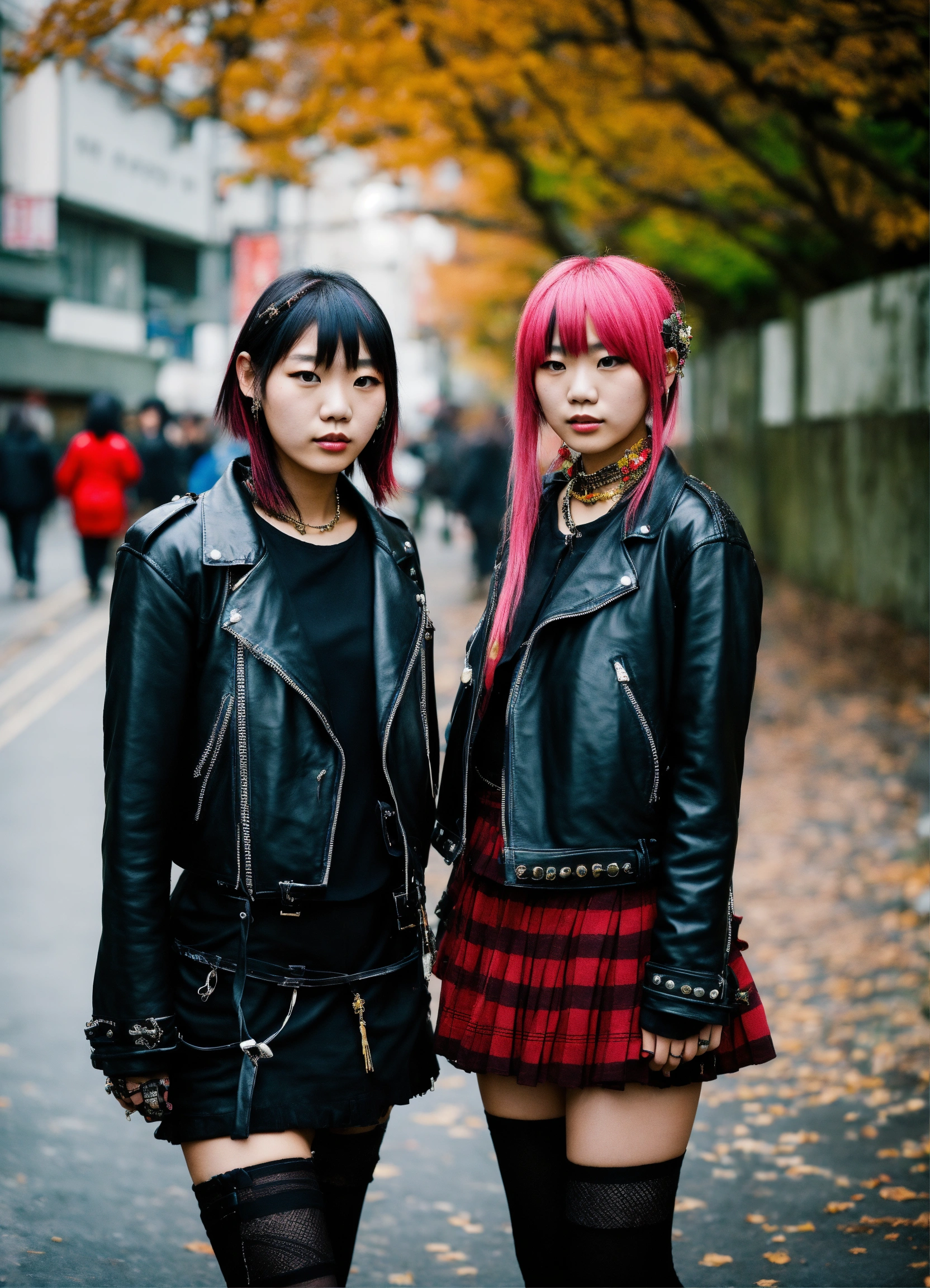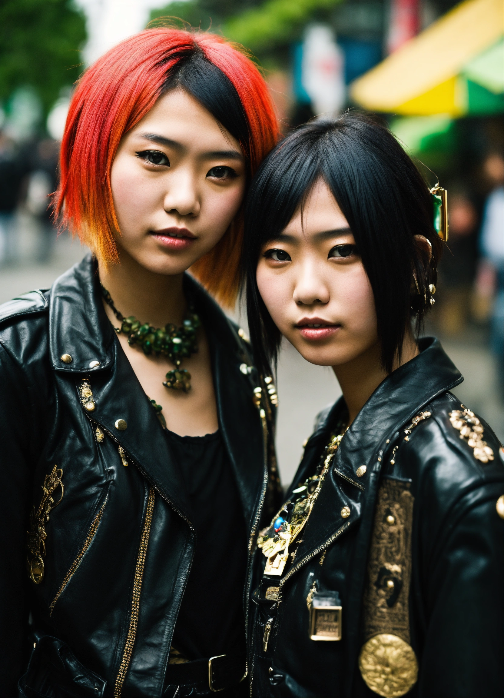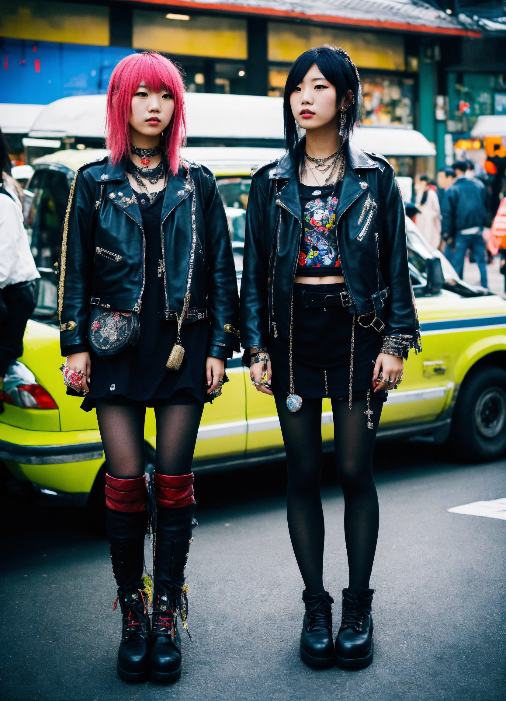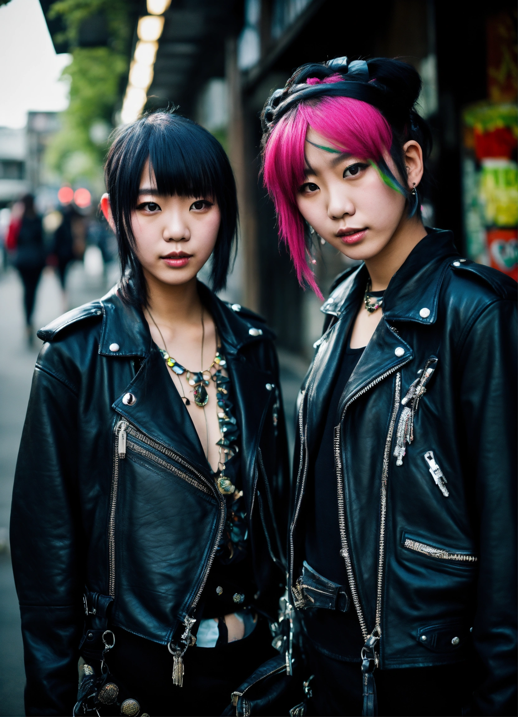 Two 20 year old japaneze punk girls wearing a black leather jacket and traditional dress, juwelry, urban enviroment