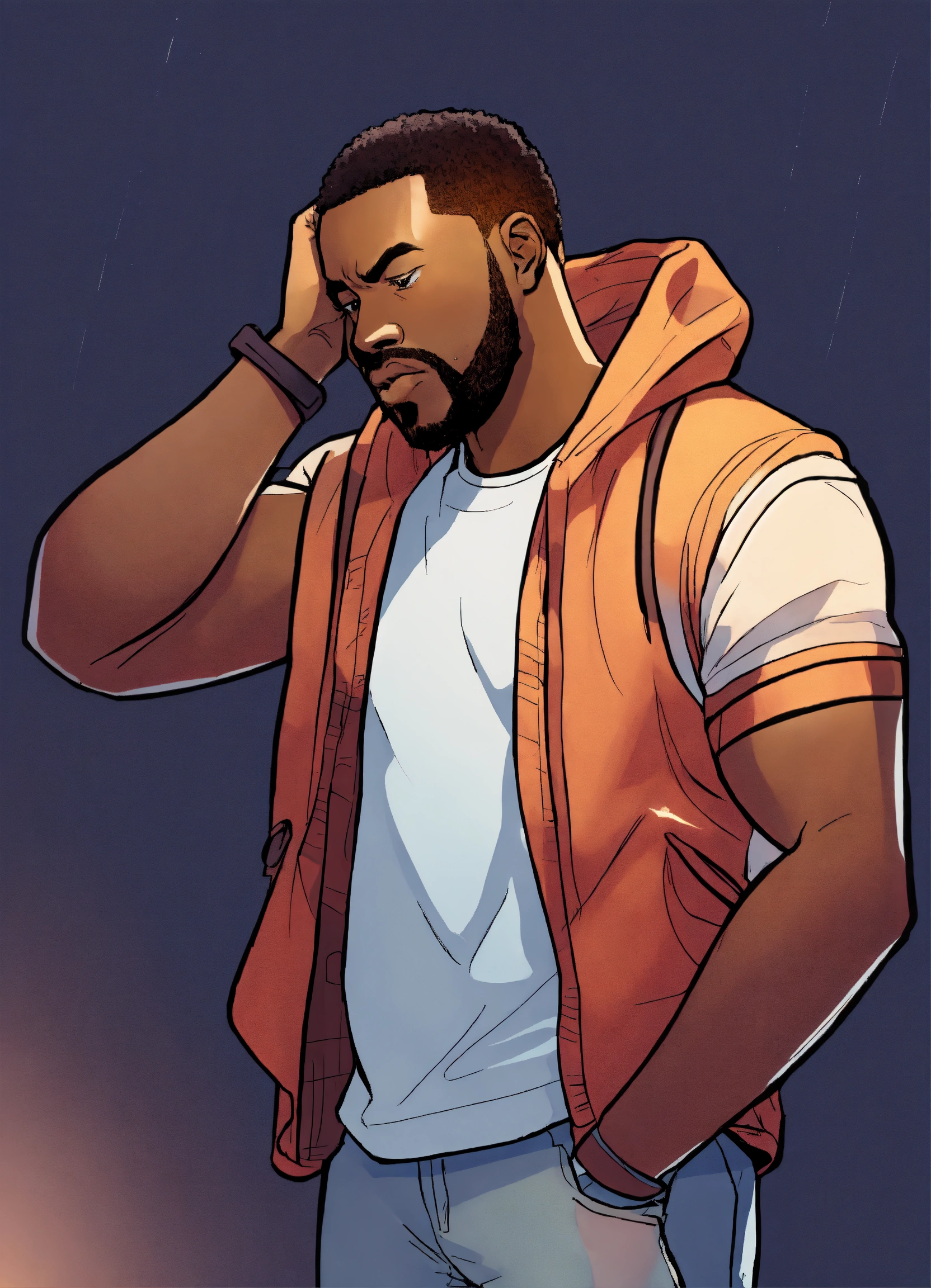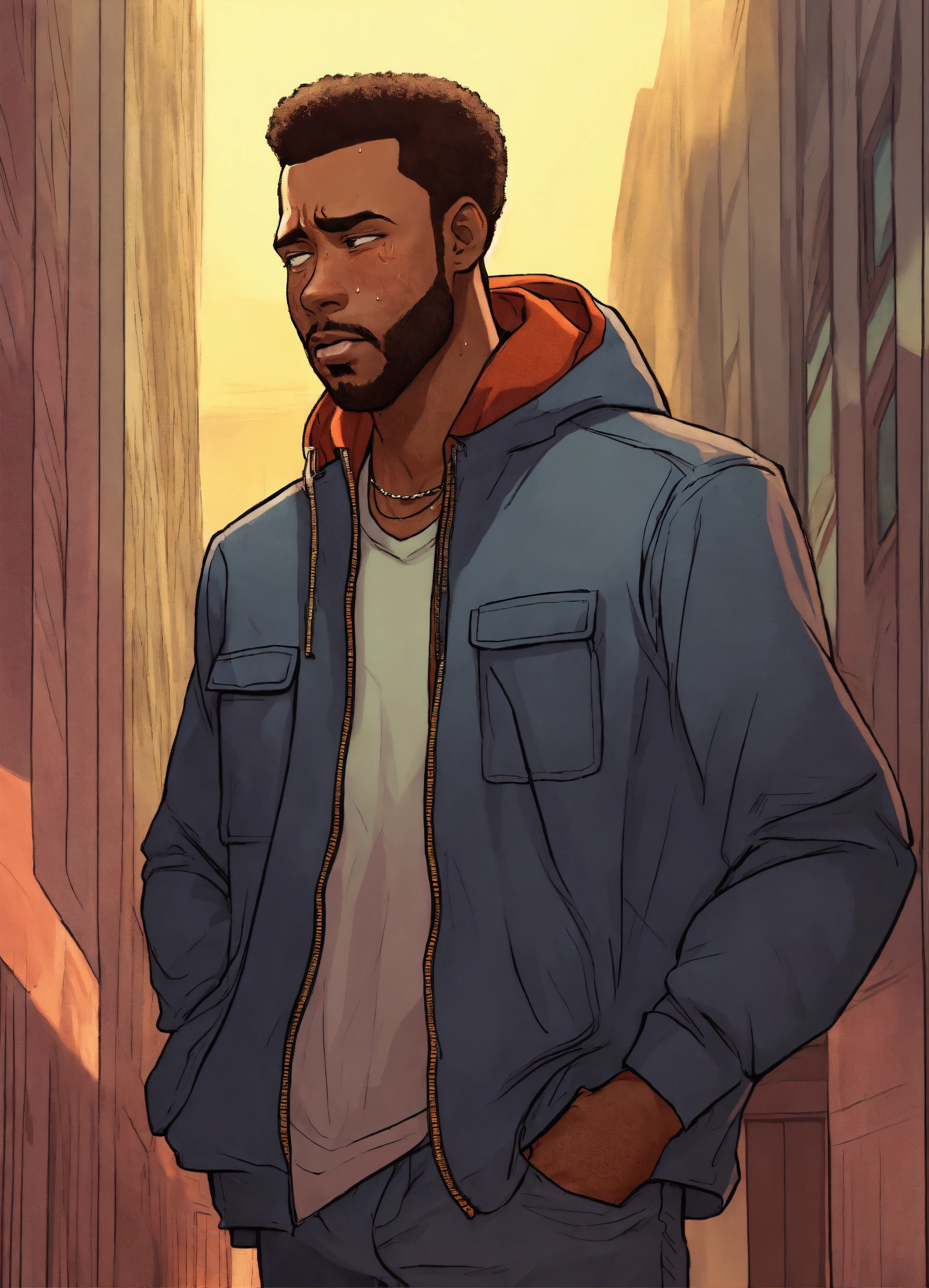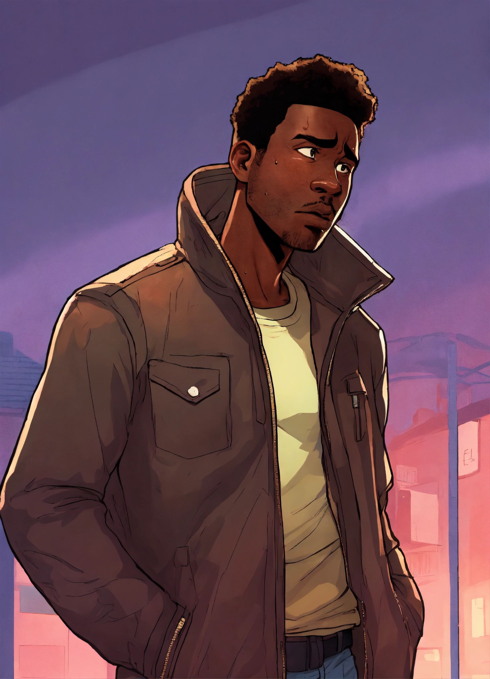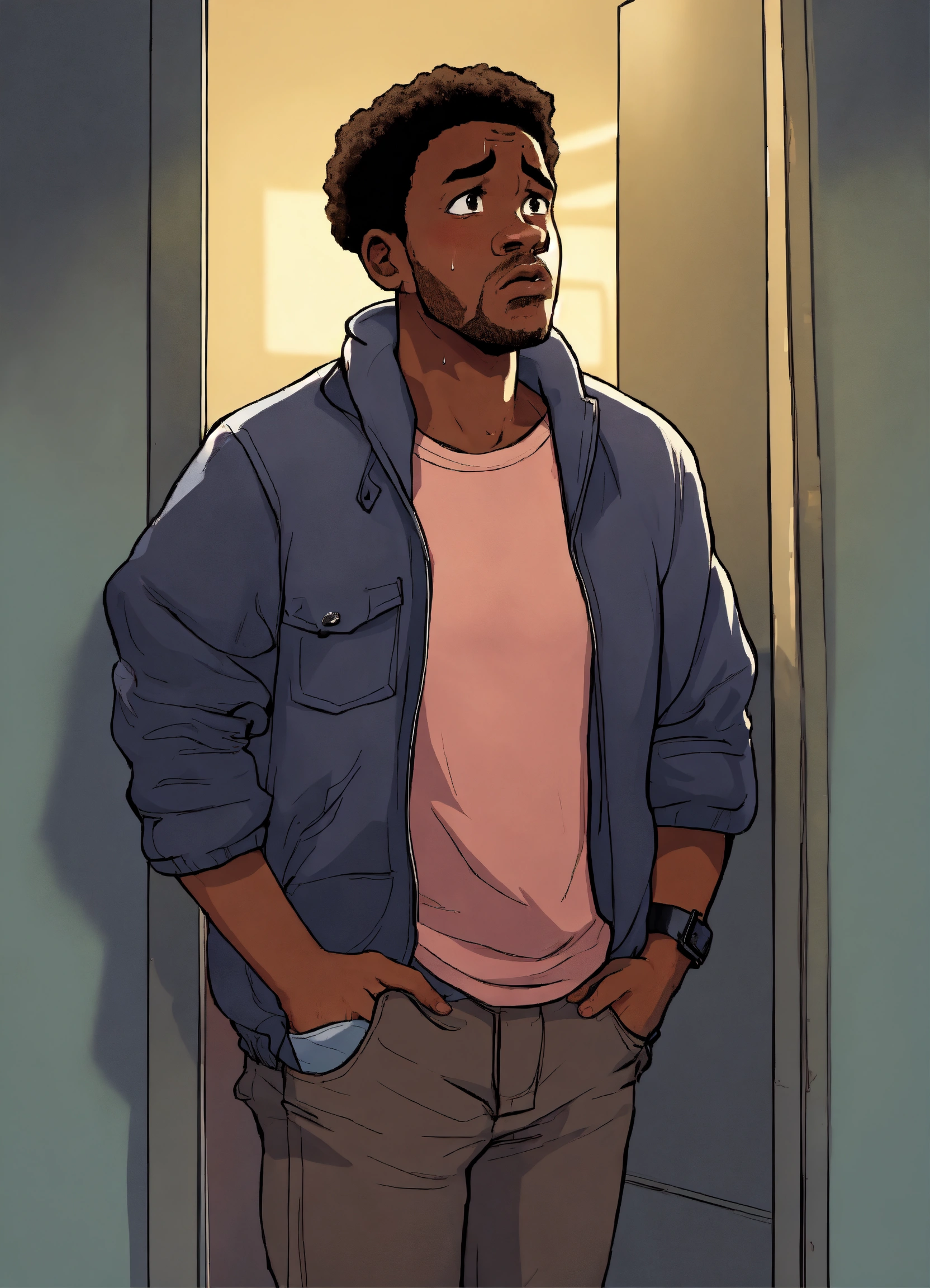 Cartoon of a worried black man with sweat coming frim his head, stretching his coat pocket so that his hand can fit in to the pocket with volumetric lighting