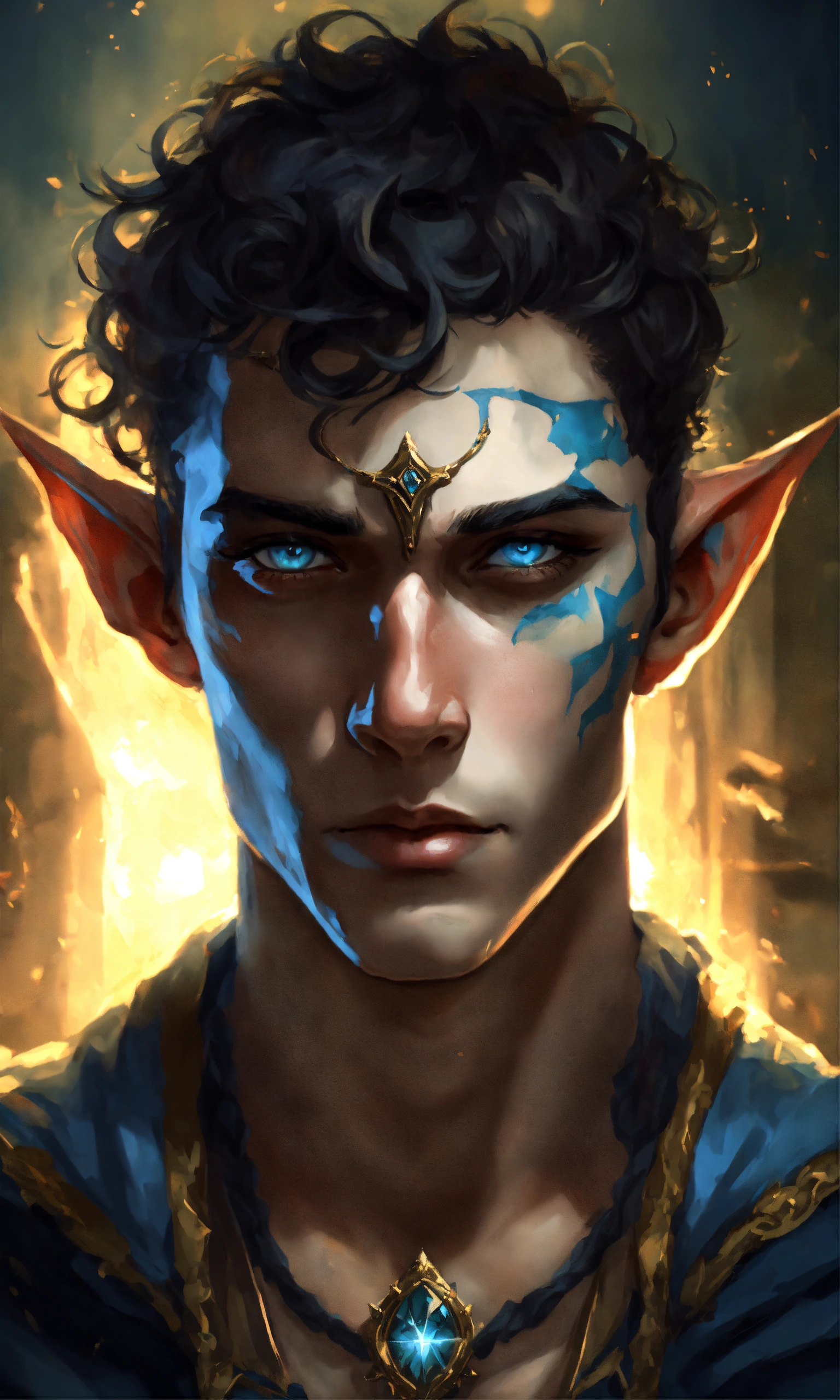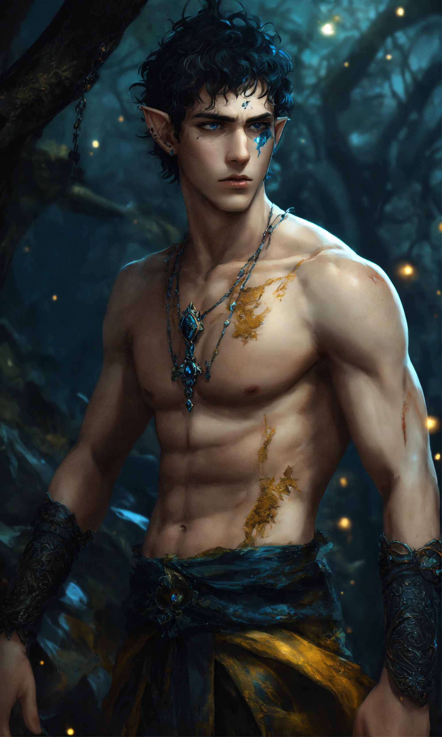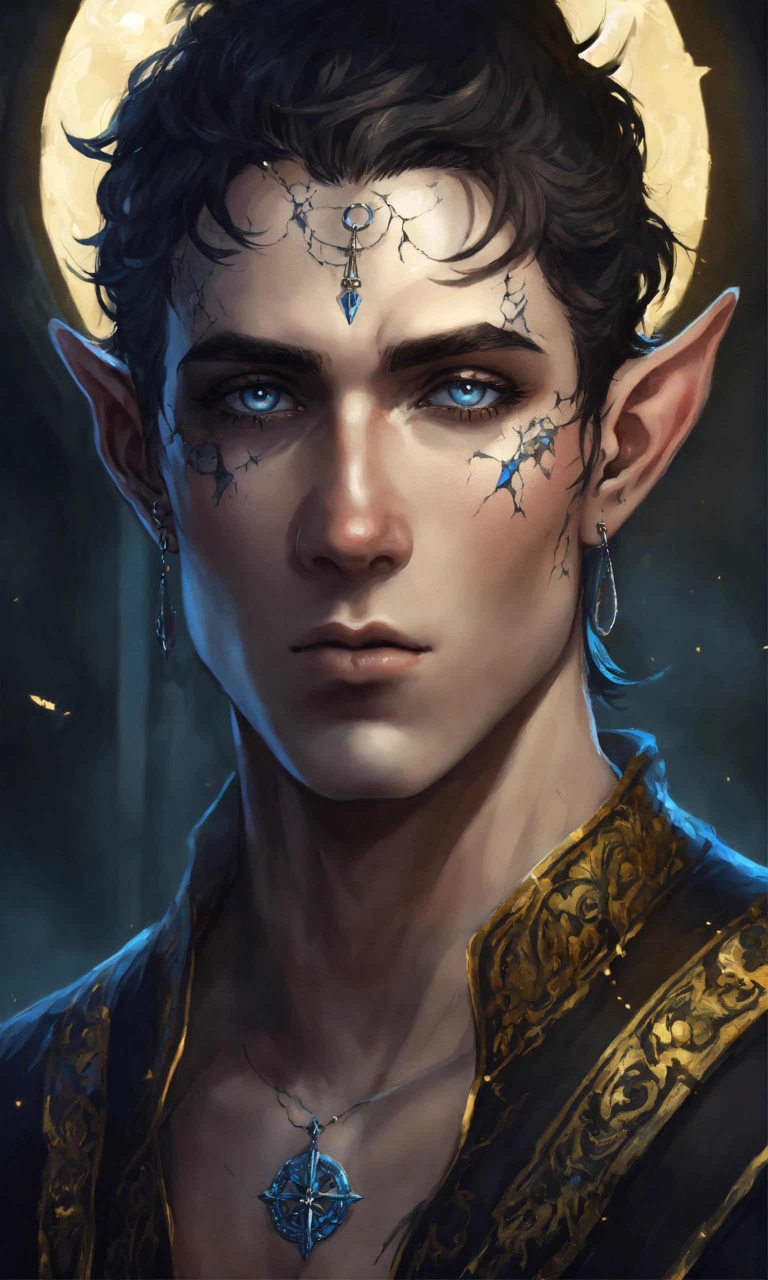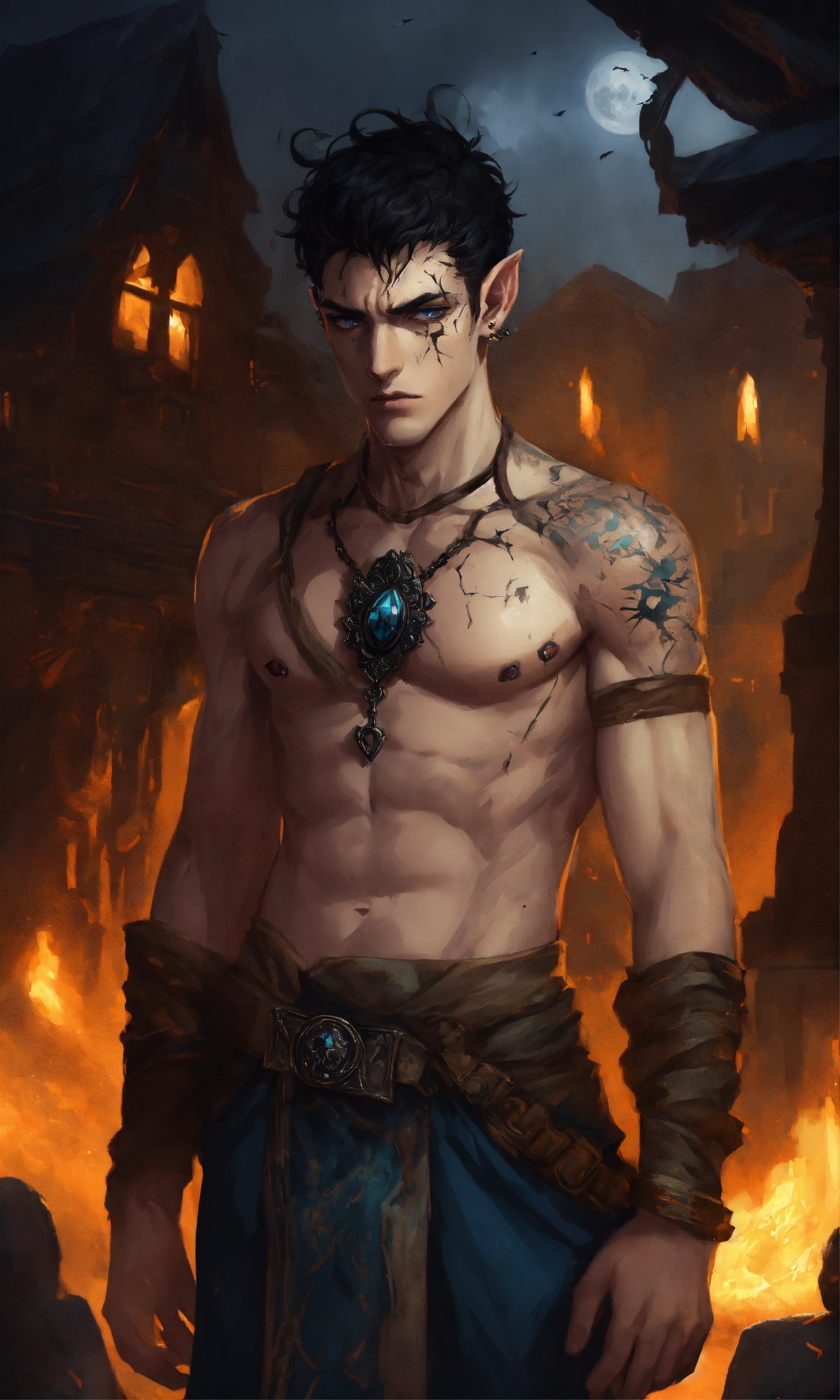 Fantasy portrait of a gaunt male elf, sickly thin, scrawny, shirtless monk, pale skin, black shattered skin, black cracked face, broken skin, inocent expression, chin up, lifted brow, pointy chin, short curly black hair, big blue eyes, lost expression, sad, open, black shadow magic, ultra detailed, piercings, moonlight graveyard background