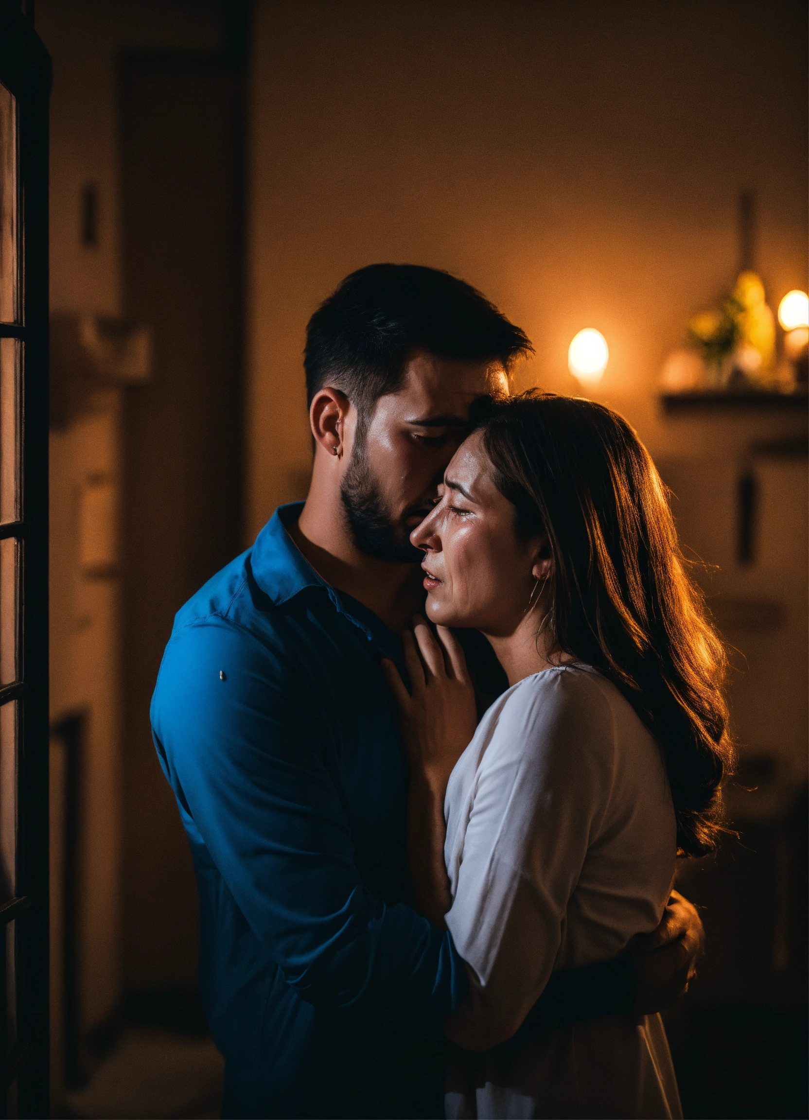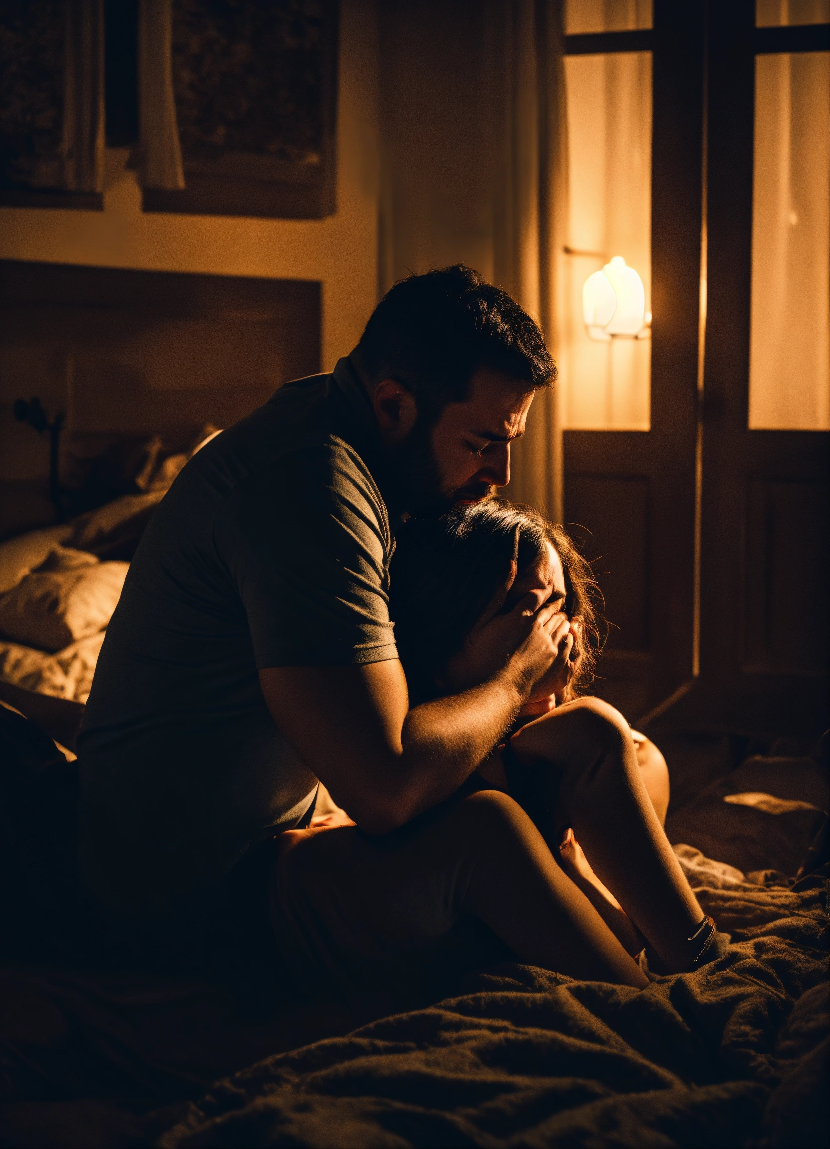 Man comforting feared and crying wife in scary night