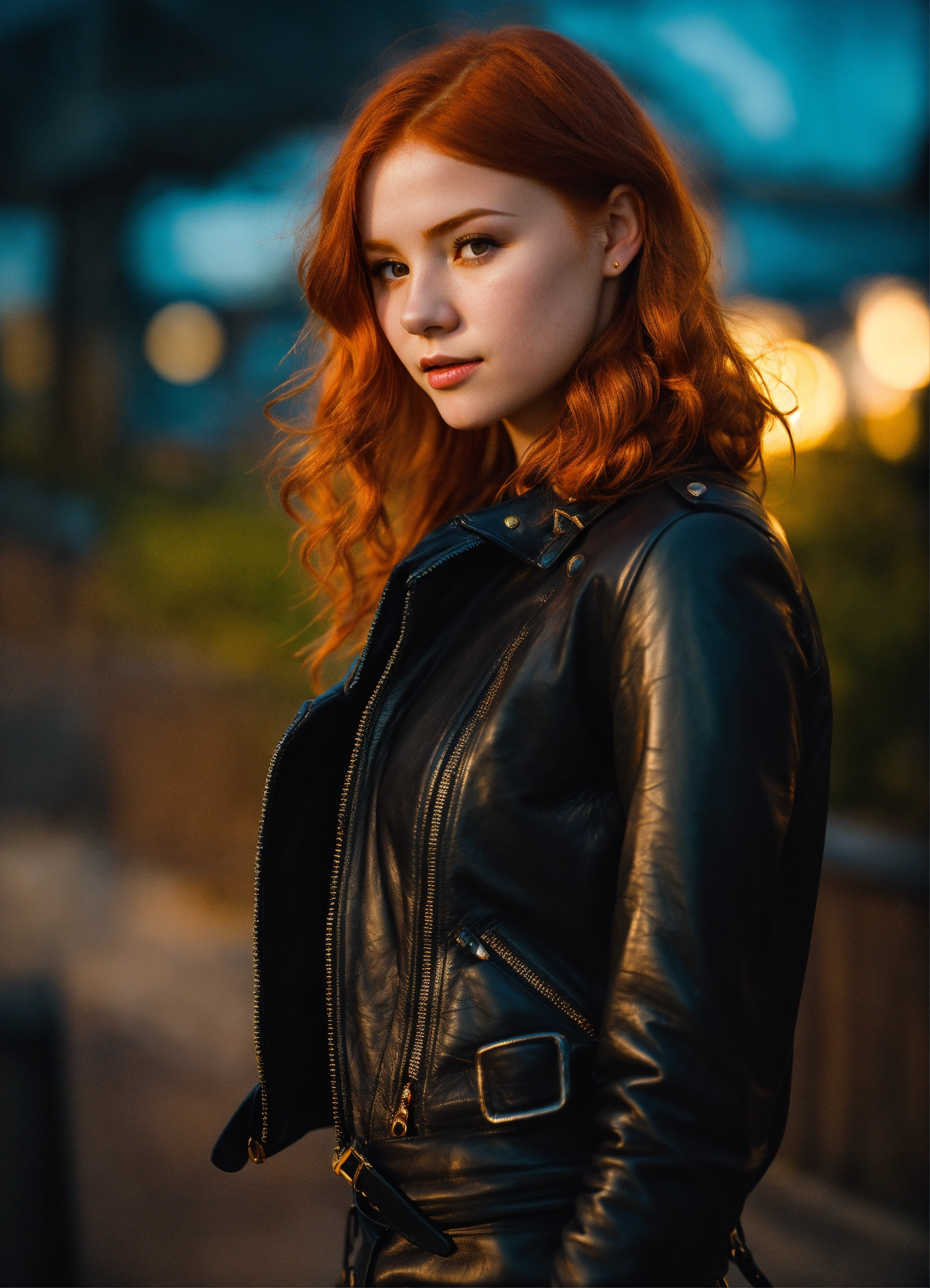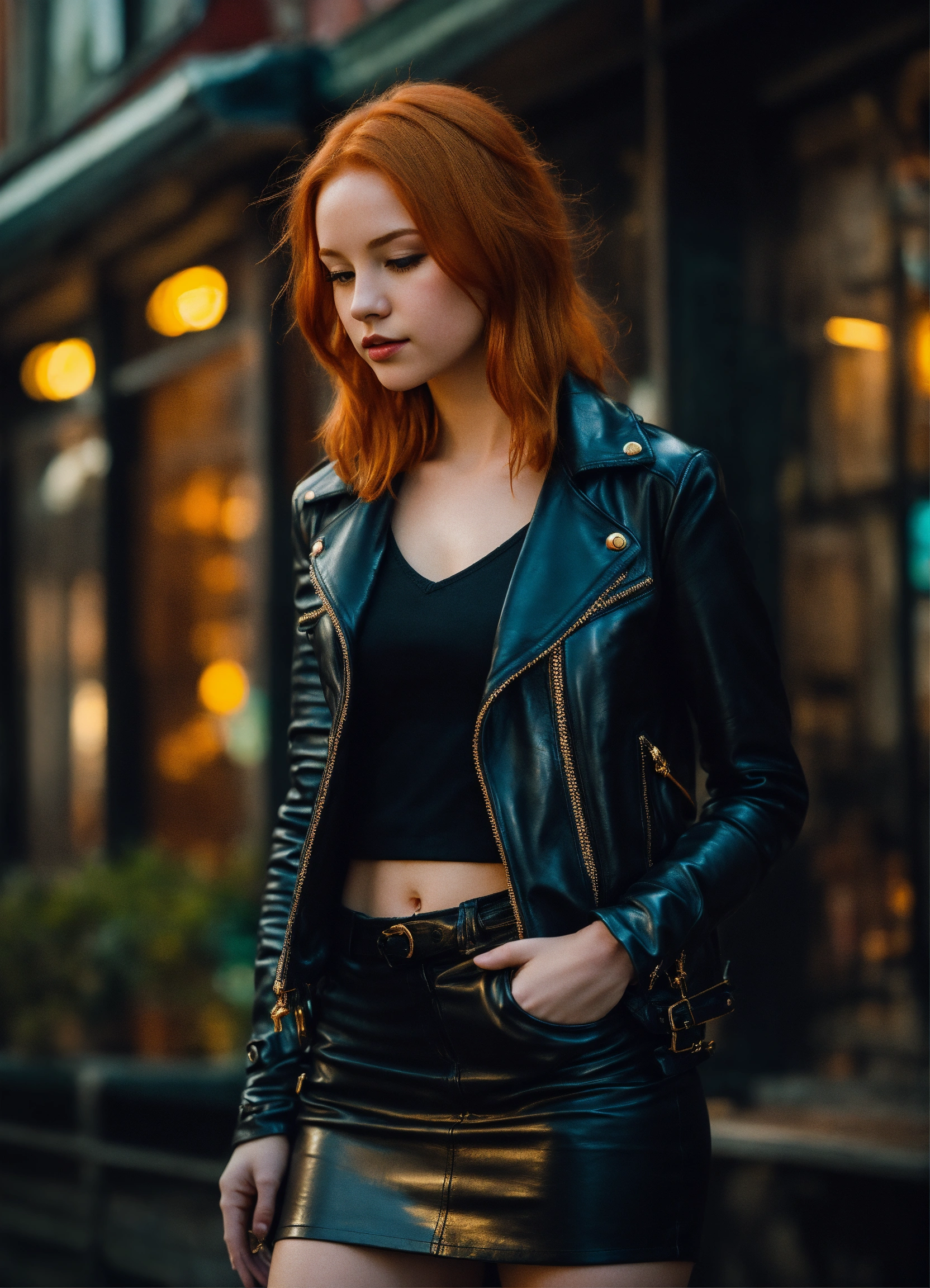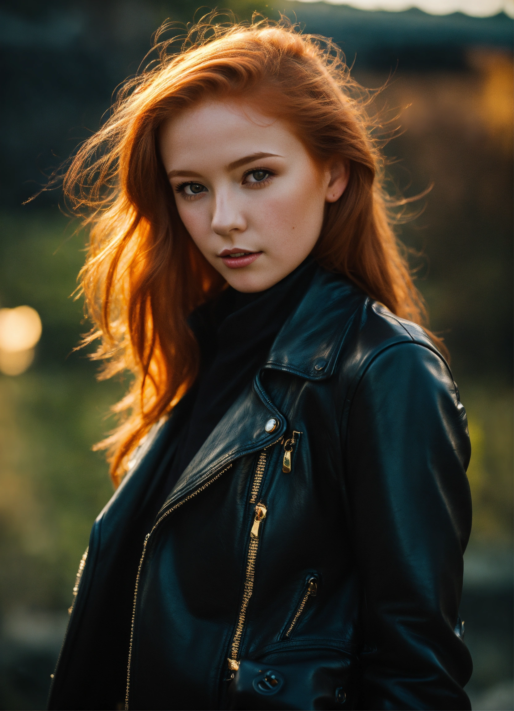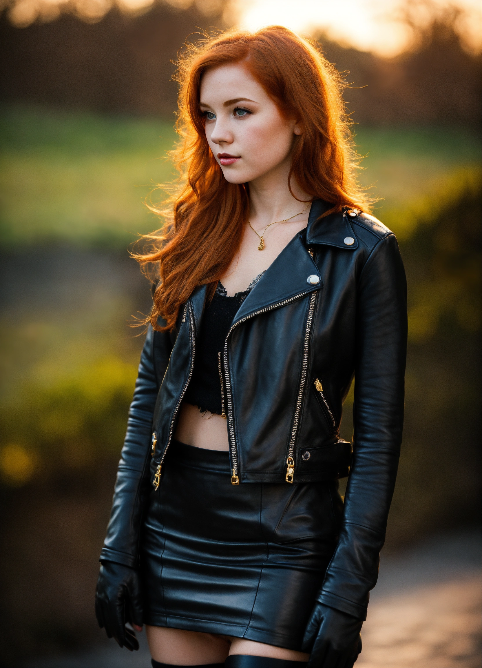 Cute young redhead irish girl, fantasy, exquisite detail, 30 - catch light, low - contrast, high - sharpness, depth - of - field, golden - hour, ultra - detailed photography, wearing a black leather jacket mini skirt and gloves