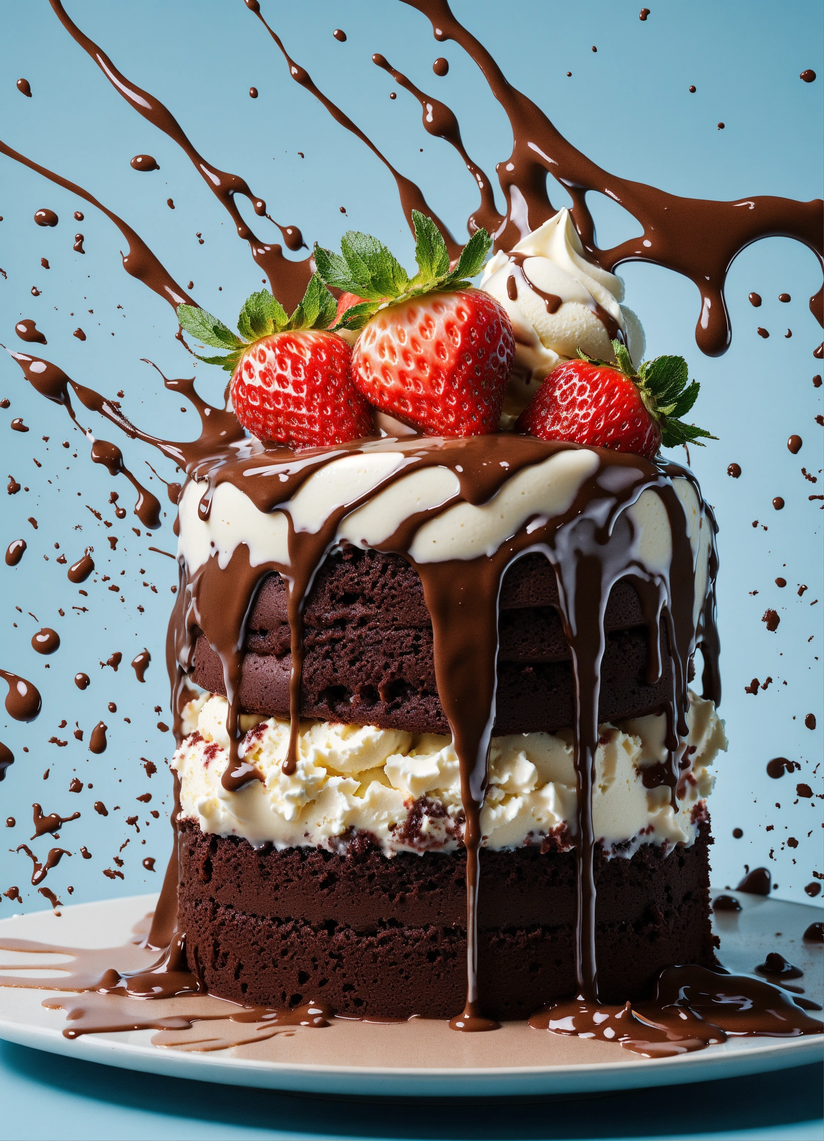Capture dynamic splashes of food in a flying food photography" with a chocolate mud cake as the main subject, showcasing splashes of chocolate icing toppings and strawberries on top of the icing. with a giant mouth & lips shaped like strawberries, and teeth biting into the cake. utilize high-speed photography for photorealistic surrealism style, with a white background and trending clean minimalist backdrop. include vanilla icecream with the chocolate mudcake. create 3 ad posters with pro-grade color grading, studio lighting, rim lights, layered comps, and shot with an eos-1d x mark iii camera. publish on 500px, behance, and consider concept art."), photorealistic images, high-speed photography, surrealism, white background, clean background, minimalist, cuware, table, steam, smoke, ad posters, pro-grade color grading, studio lighting, rim lights, layered comps, eos-1d x mark iii, 500px, behance, concept art), photo, 3d renderv0.1