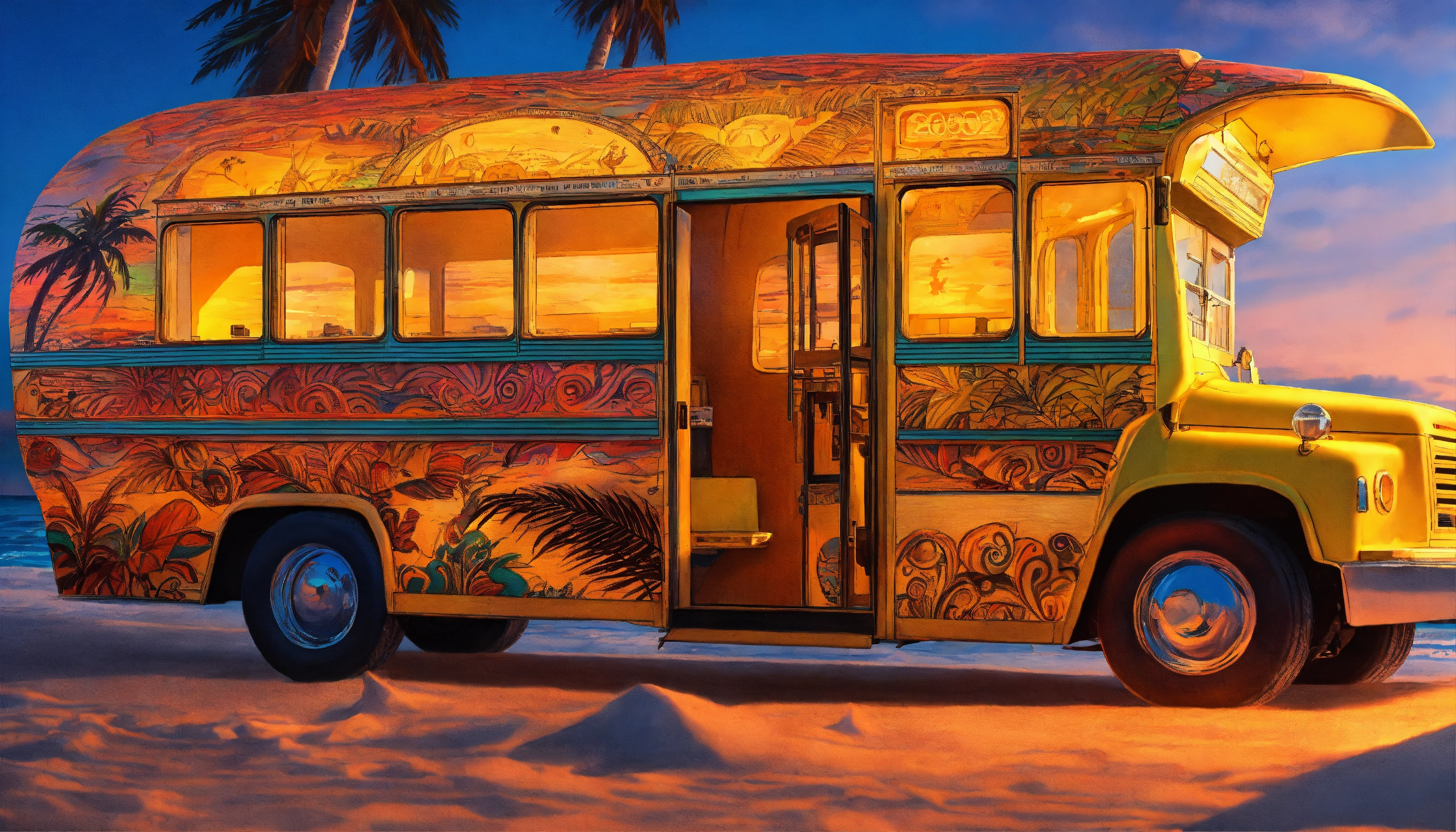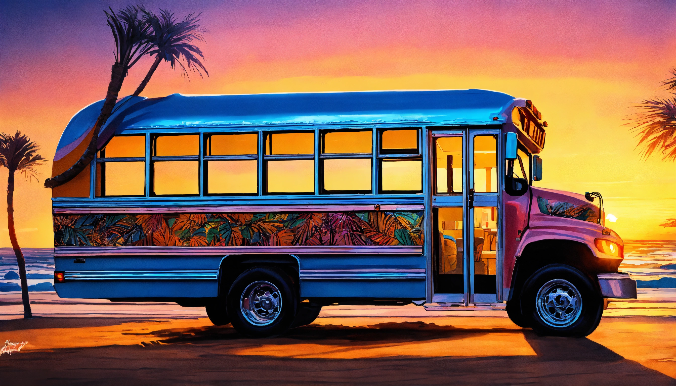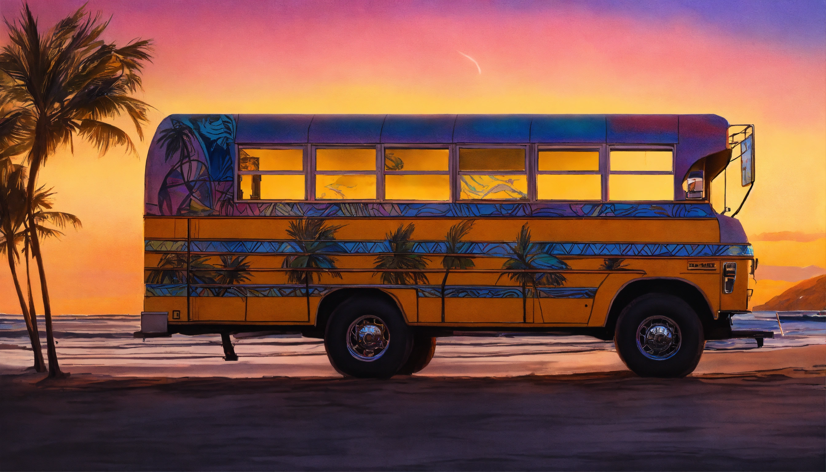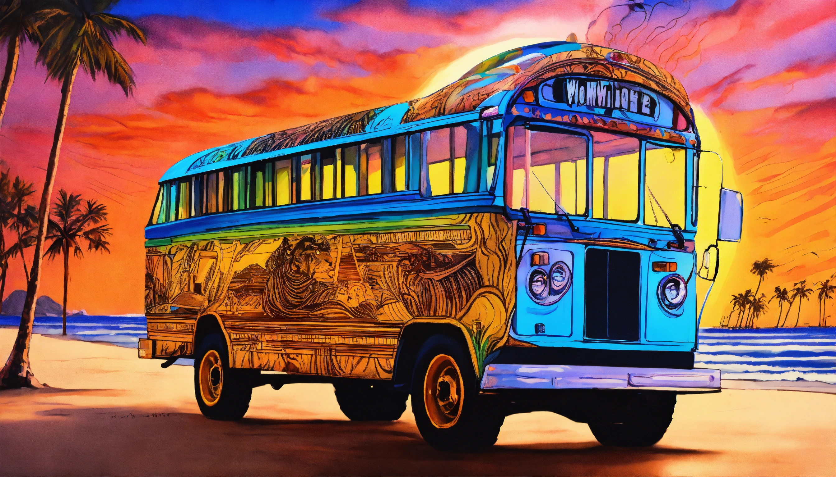 2000 thomas built flat nose converted school bus, 12 windows, artistic color pencil sketch, 4 wheels, roof top deck with beach chairs, palm trees on top, silk flowing, painted with dope tribal wolf mural on it, exterior shot in sunset, artistic concept sketch style, inside is glowing lights through window.