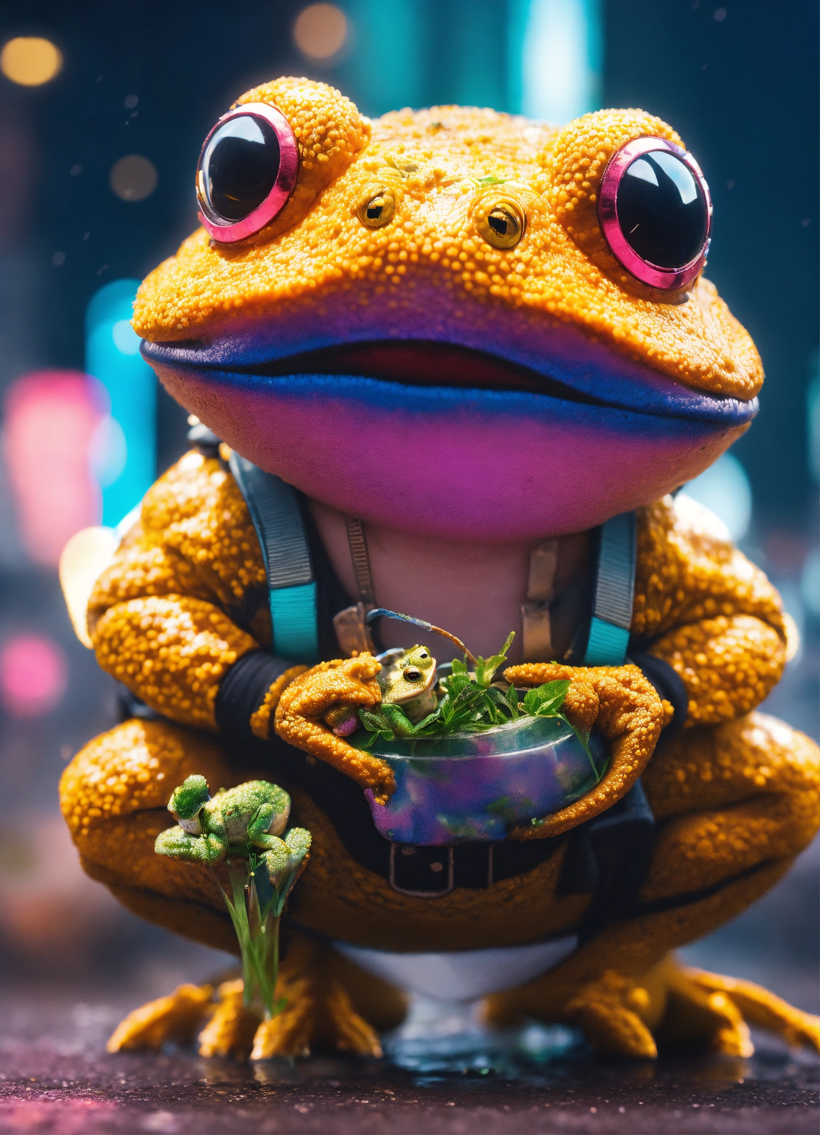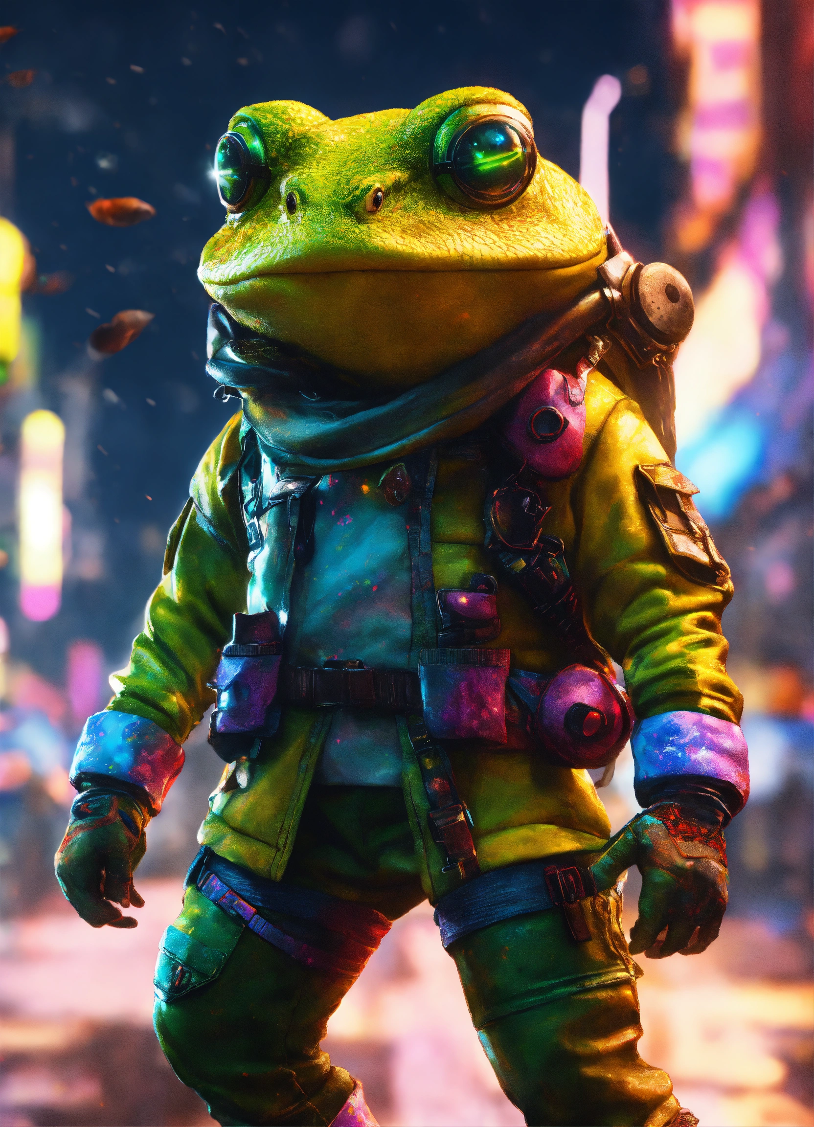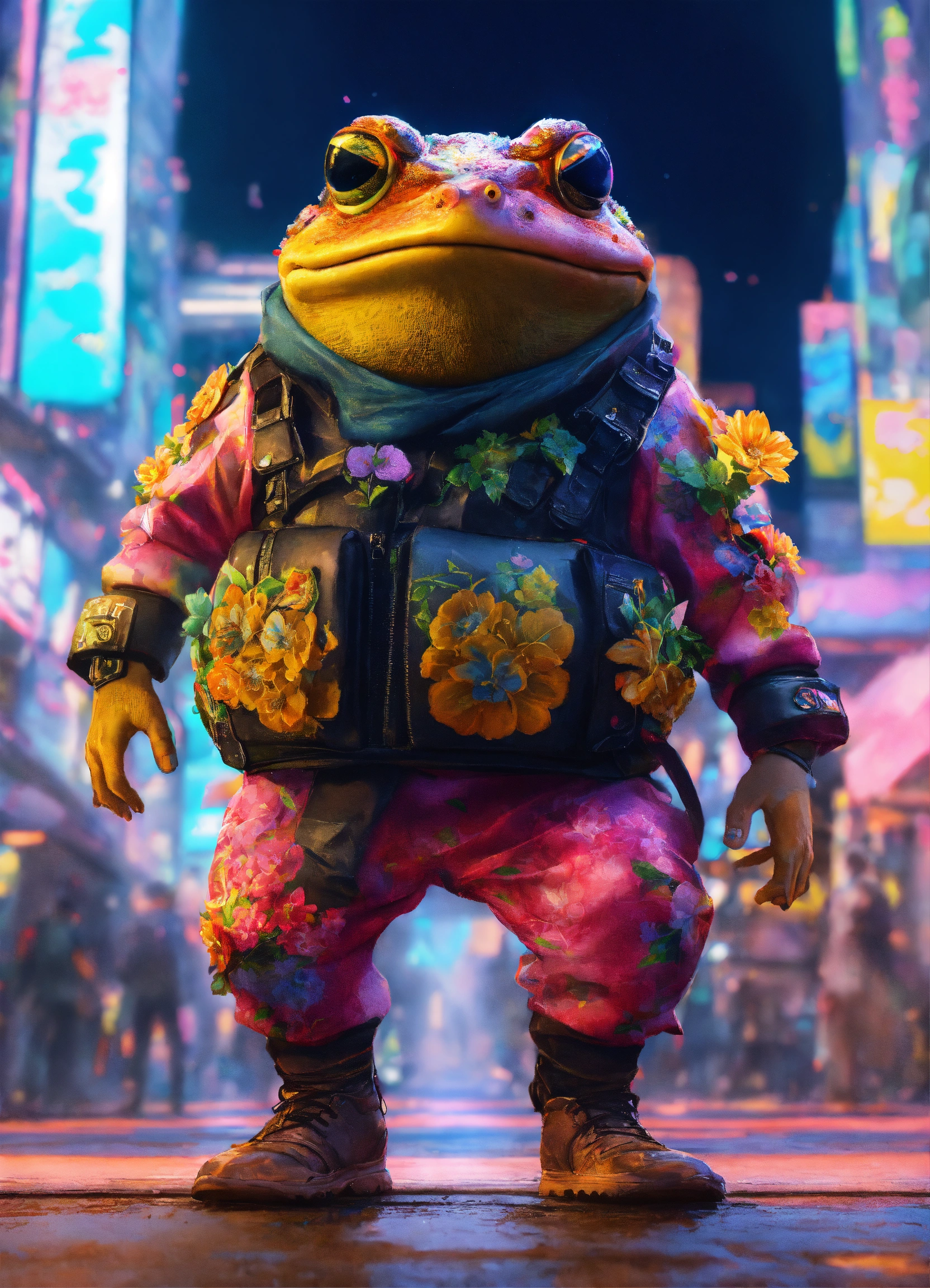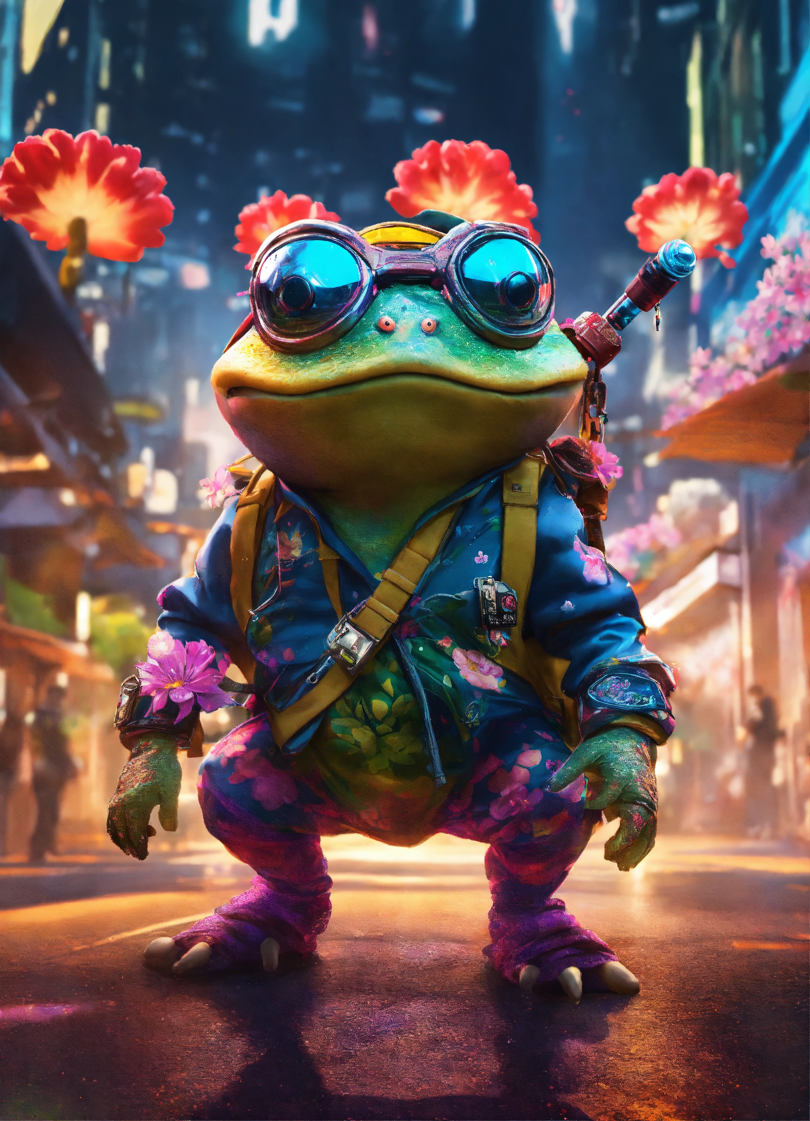 A toad as a ninja in a milk slice of life anime, cyberpunk colorado festival raver style, of a person in urban floral wear, with a cloud as a head, photorealistic, volumetric lighting, 8k, highly detailed