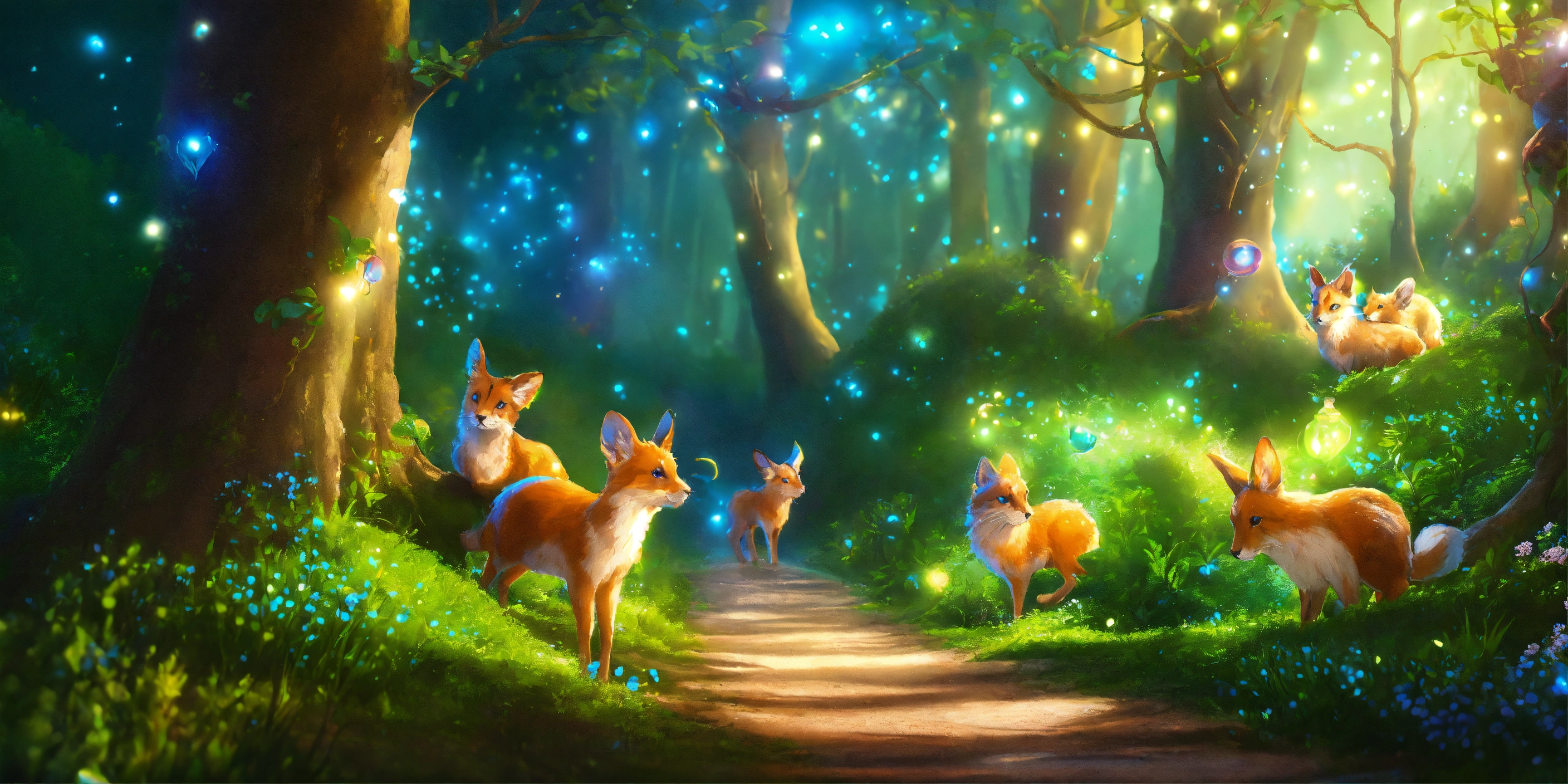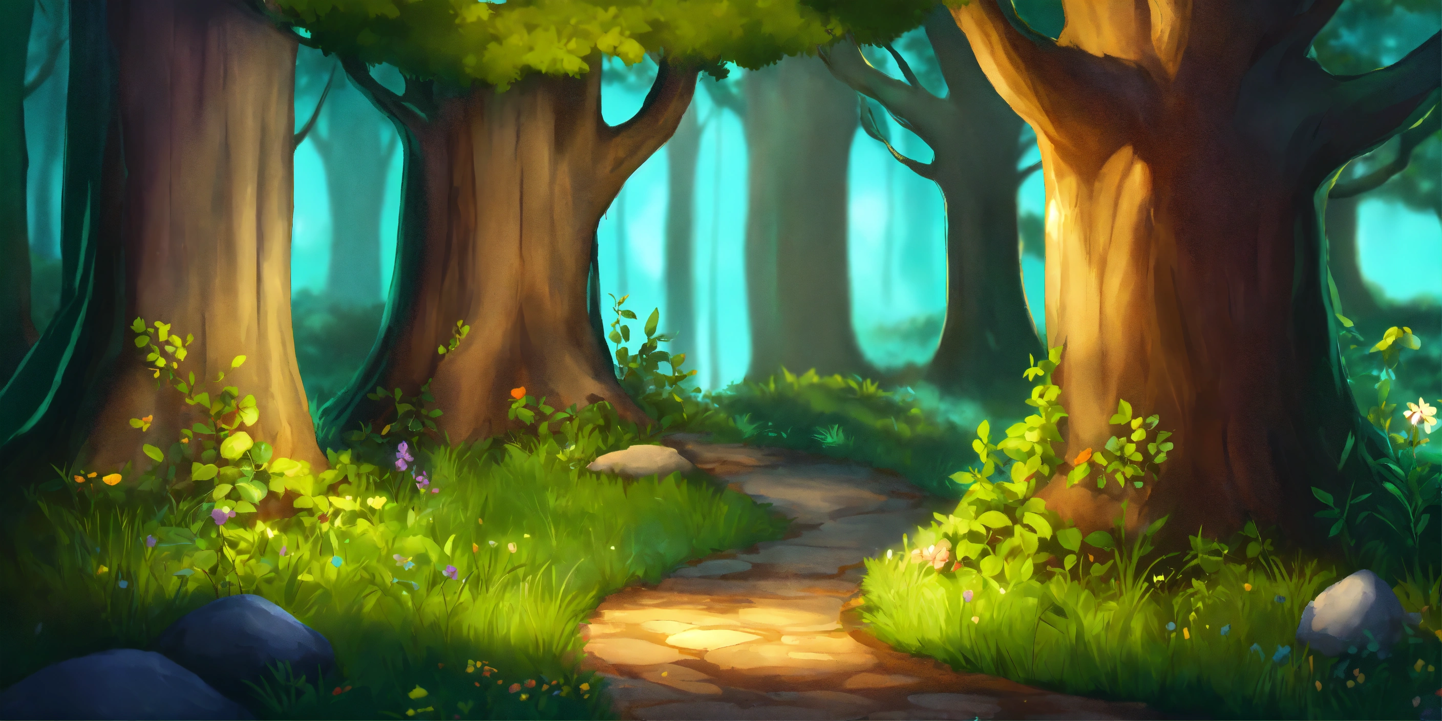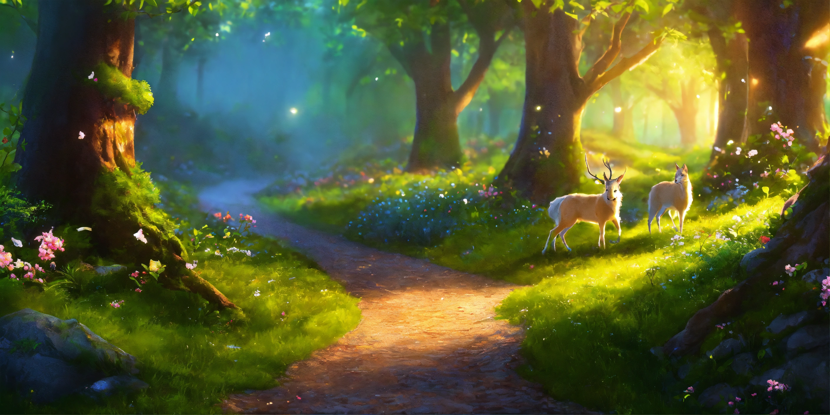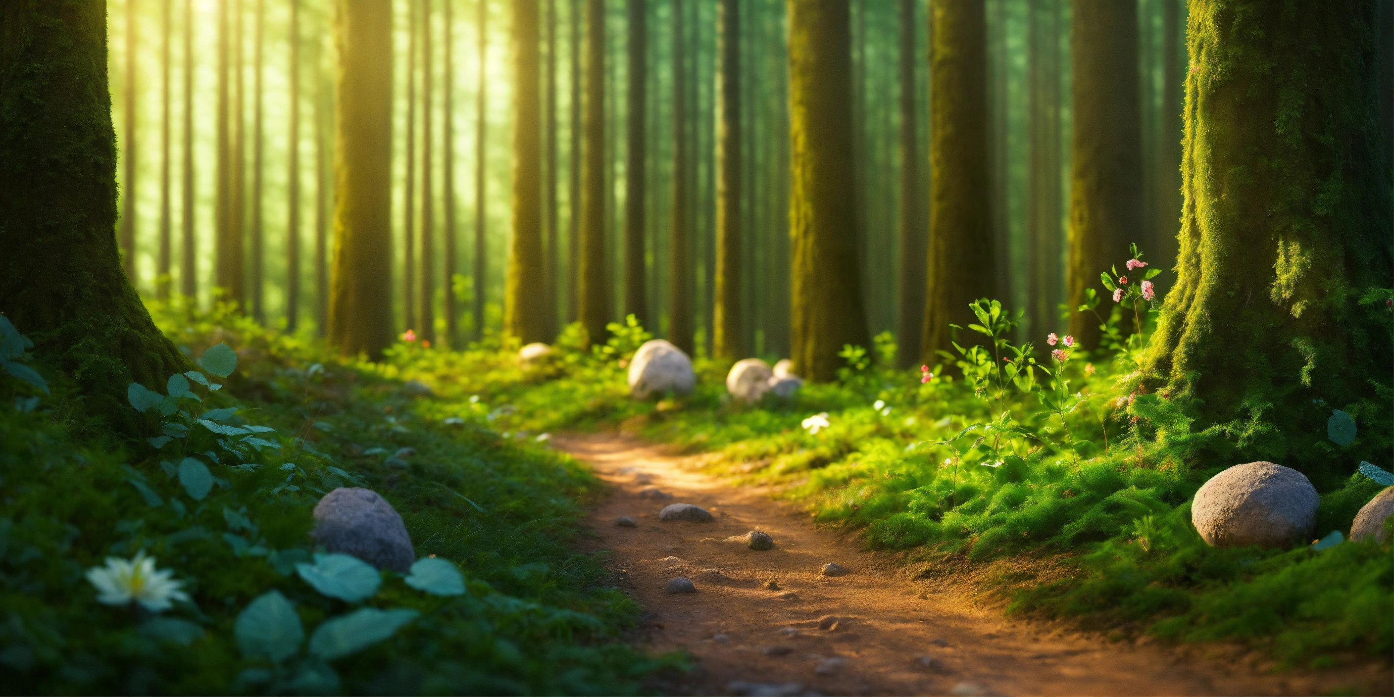 Gentils lutins dans la forêt, arbres magiques, mousse sur les pierres le long du chemin. style réaliste, image lumineuse