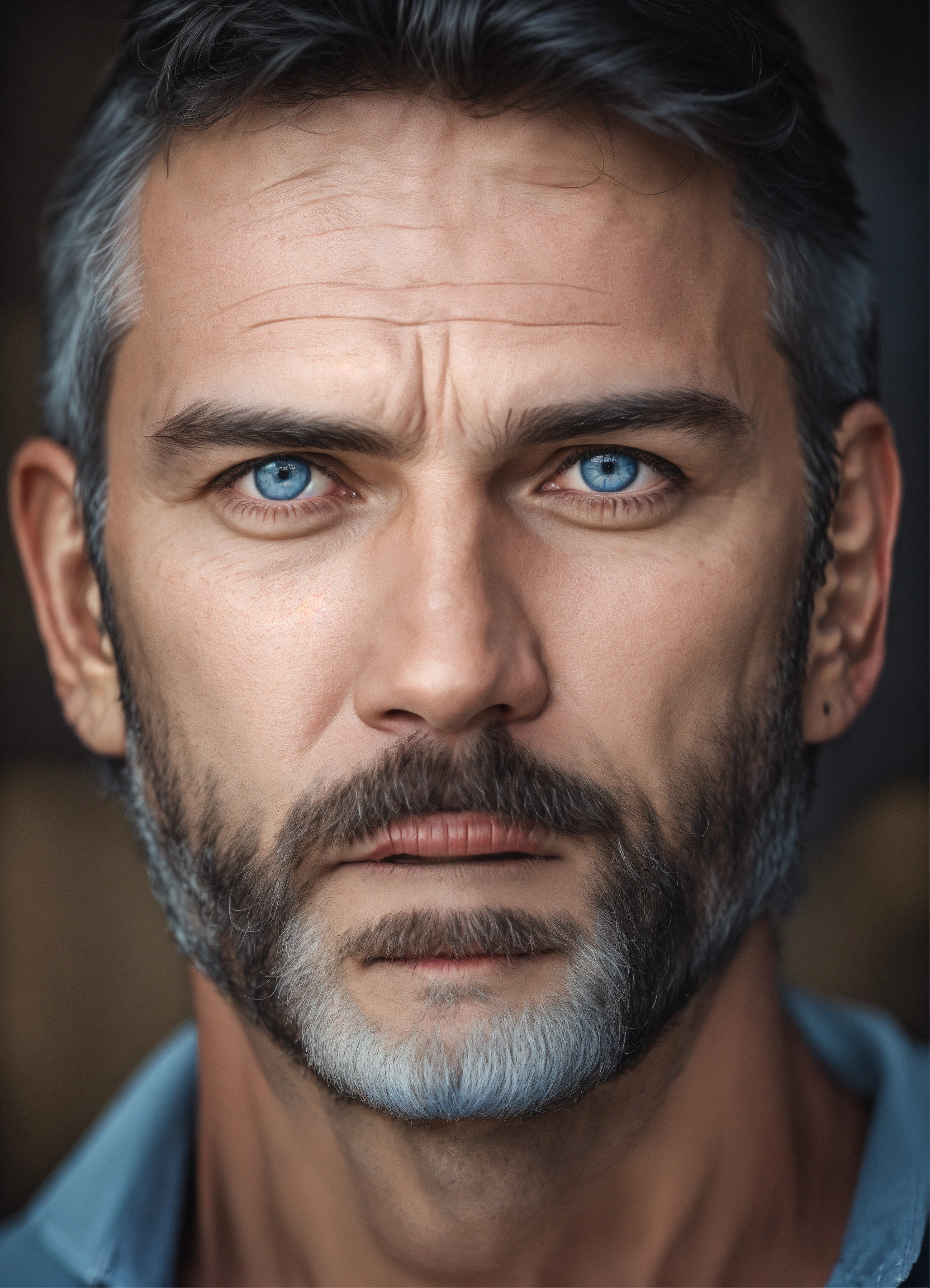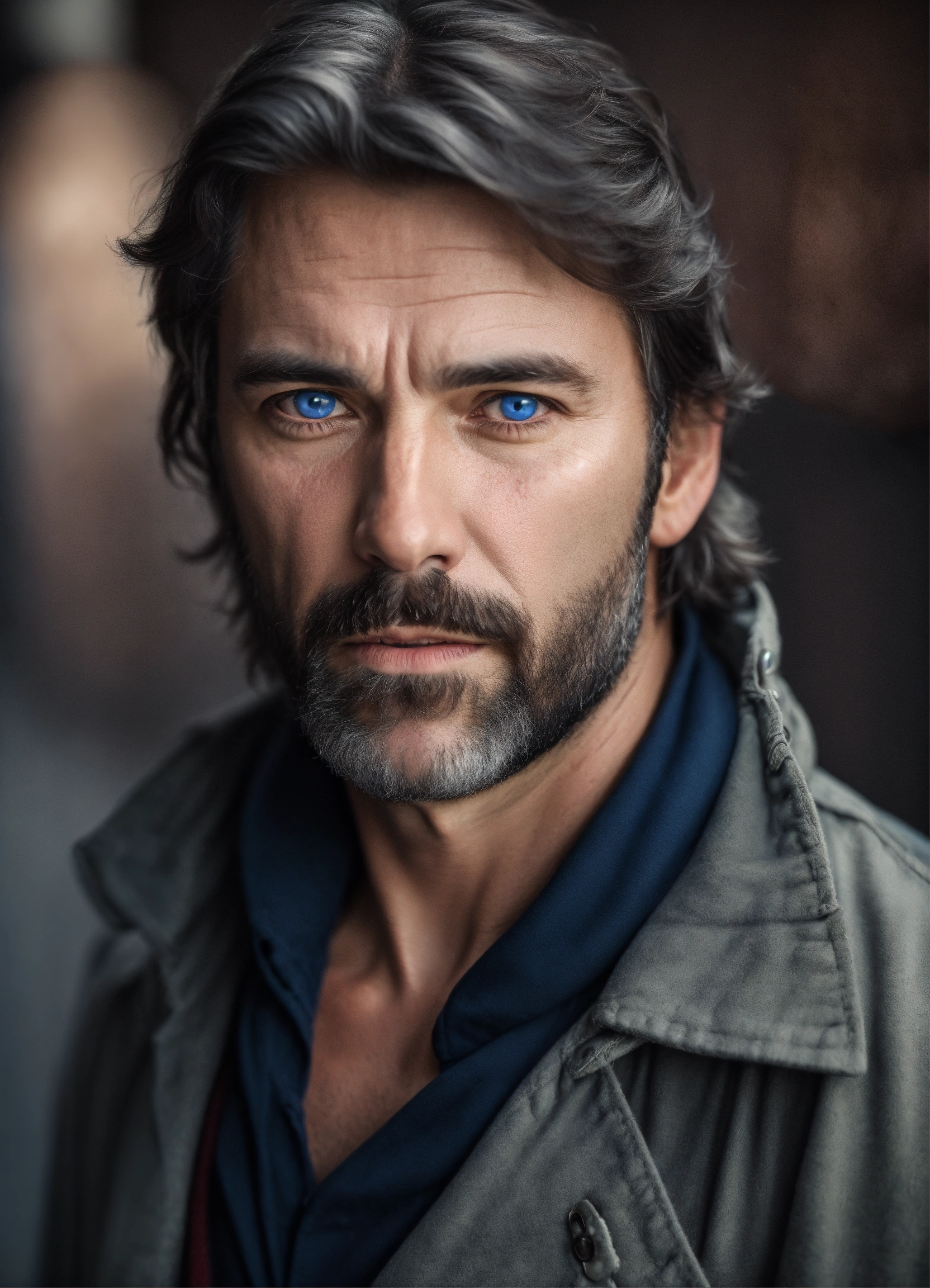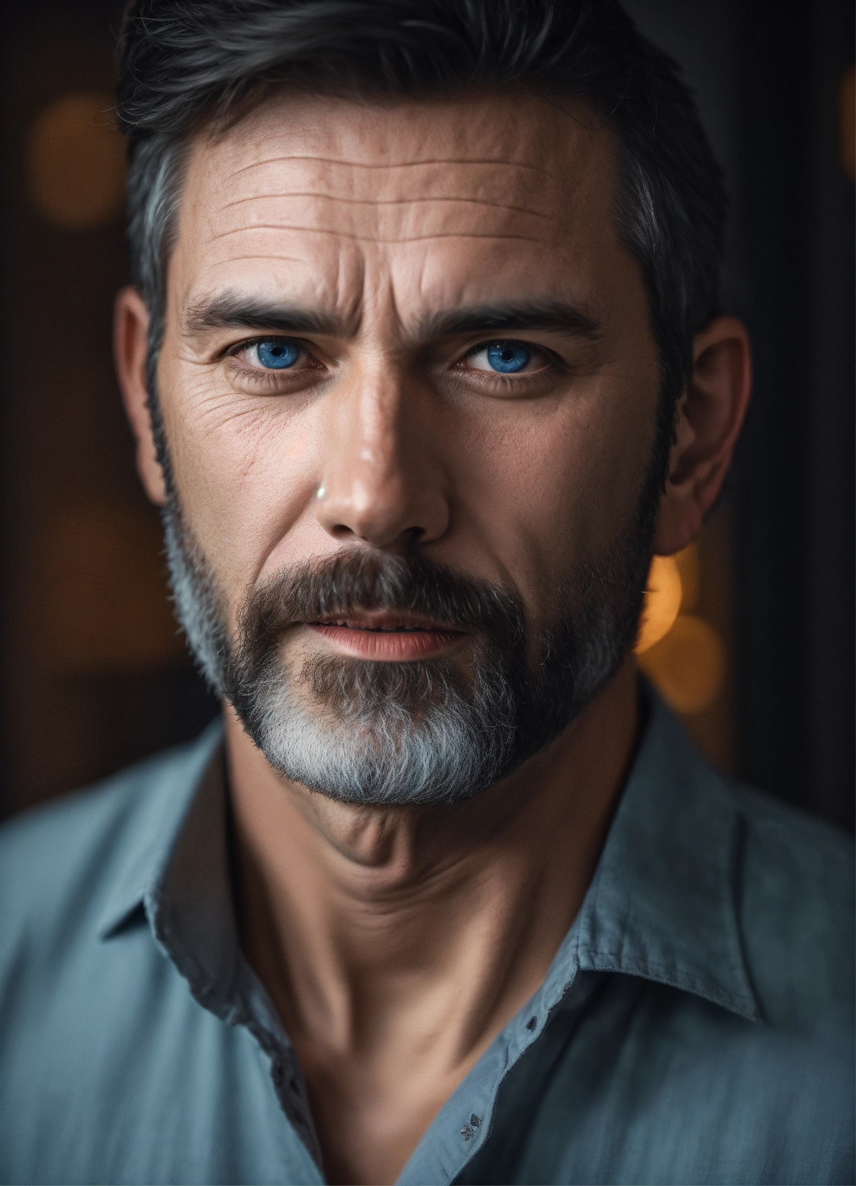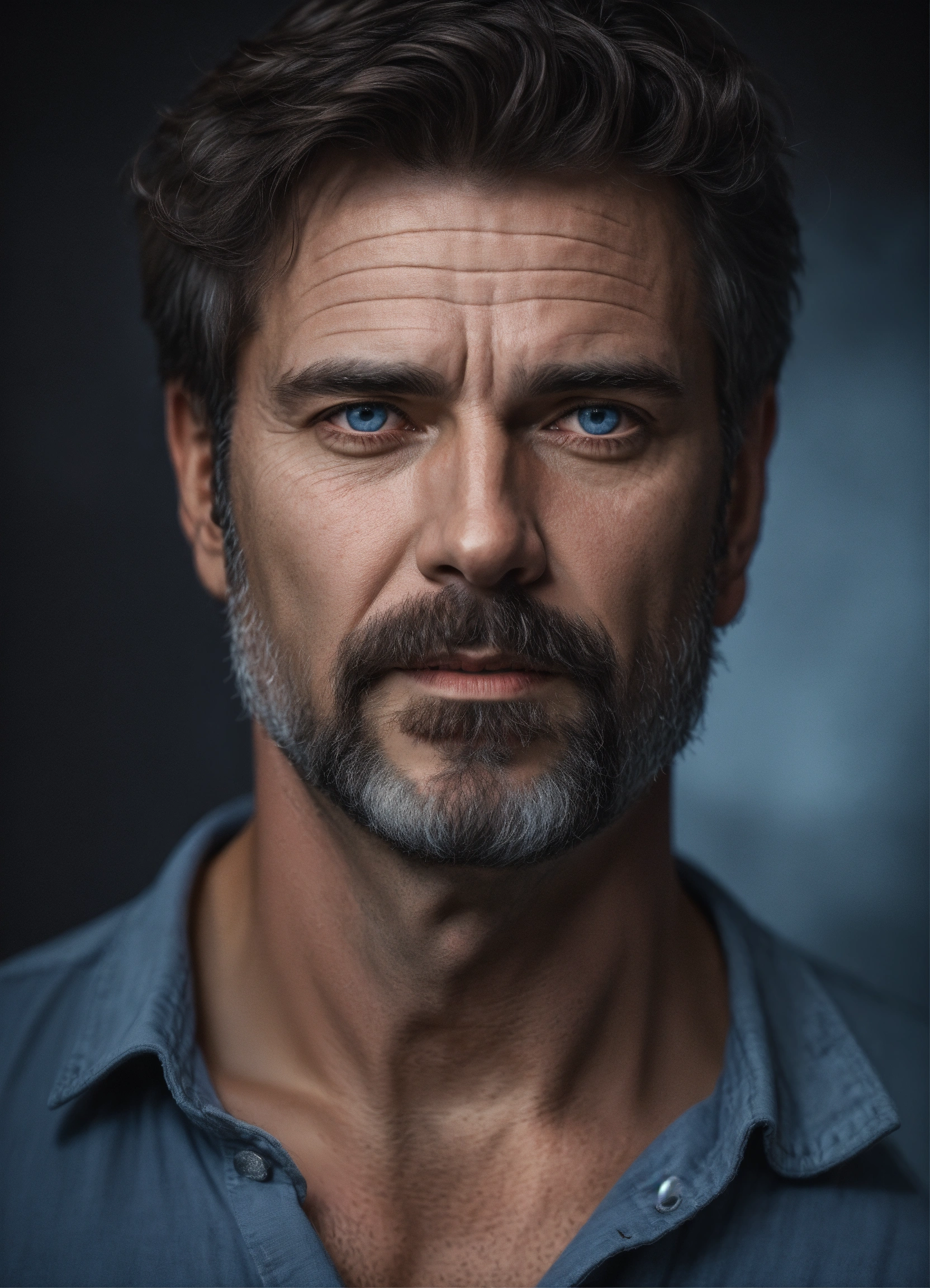 Portrait of handosme middle-aged men with dark hair, light naturally blue eyes, european model, brutal, very masculine, photorealistic, hd portrait