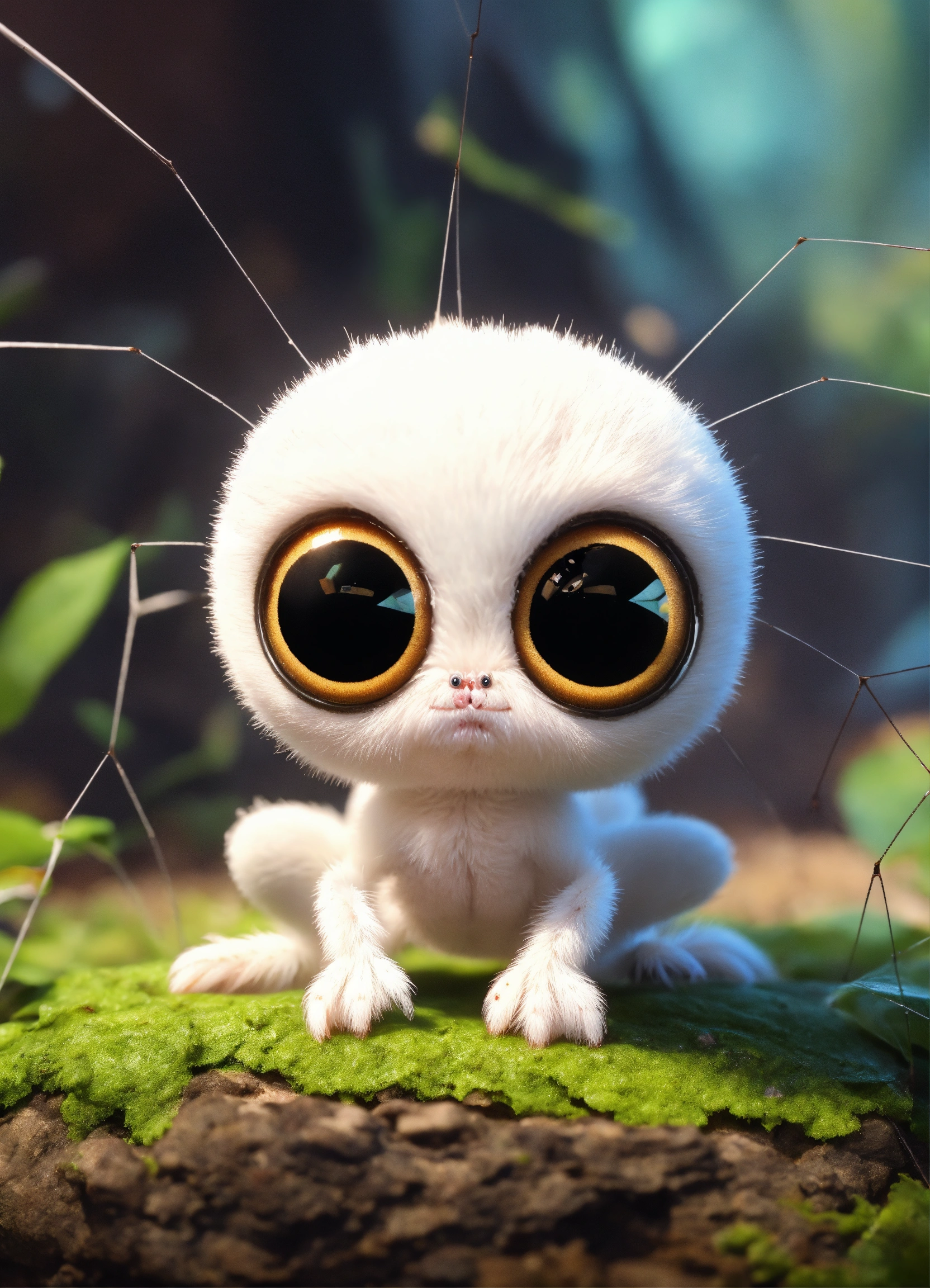 A cute all white baby spider with big eyes