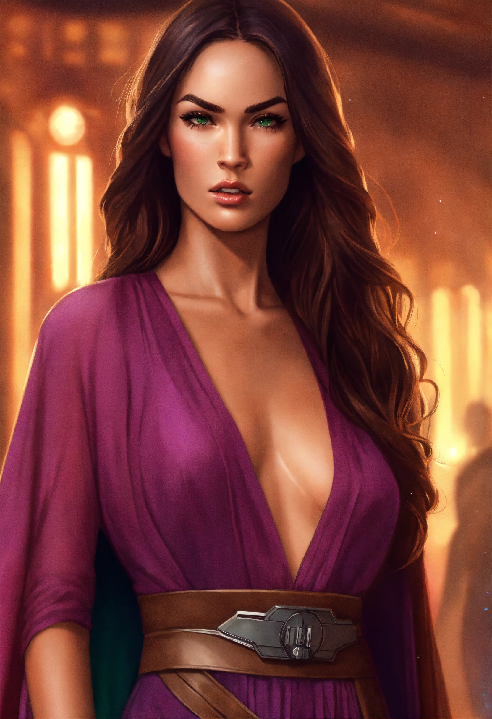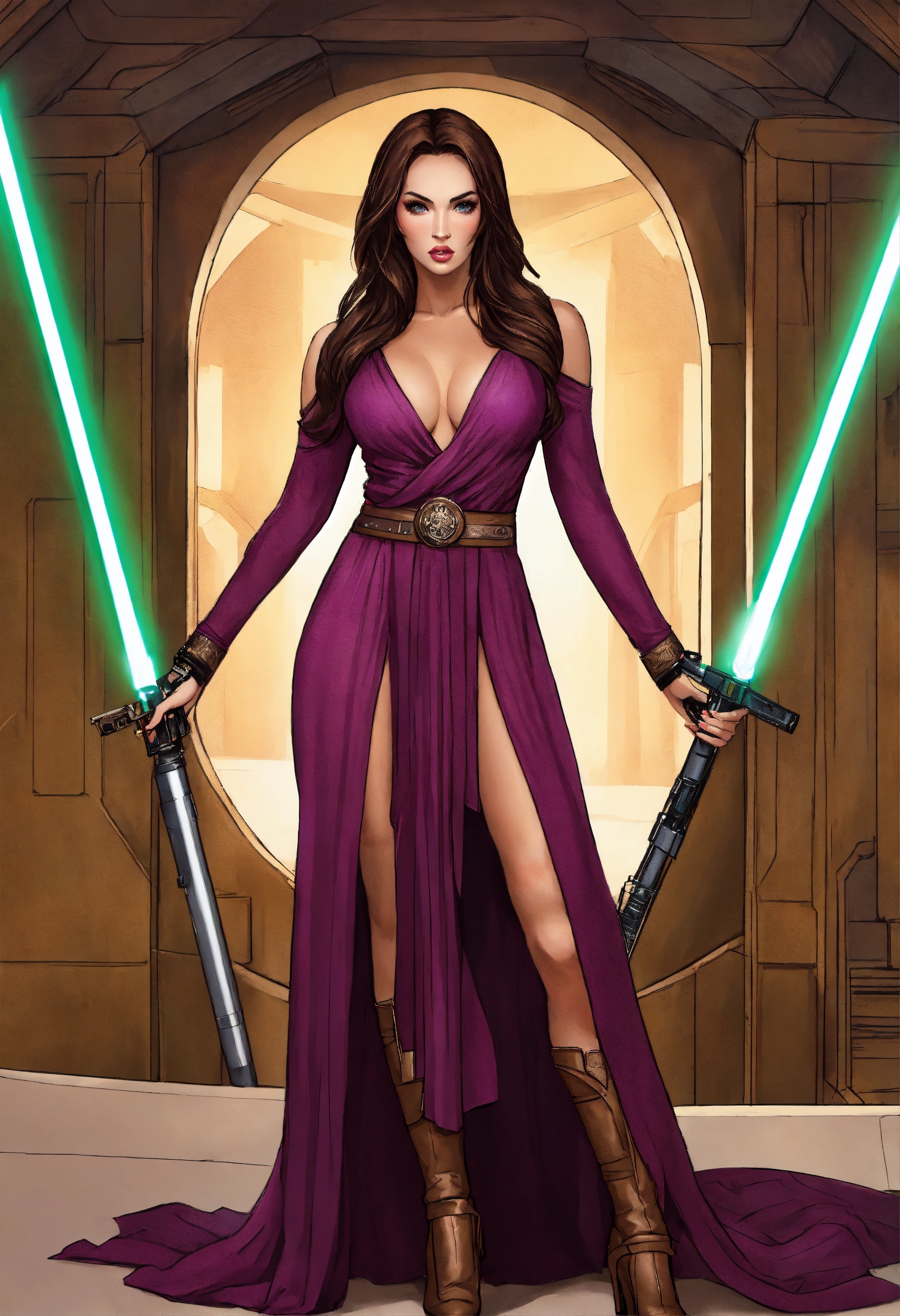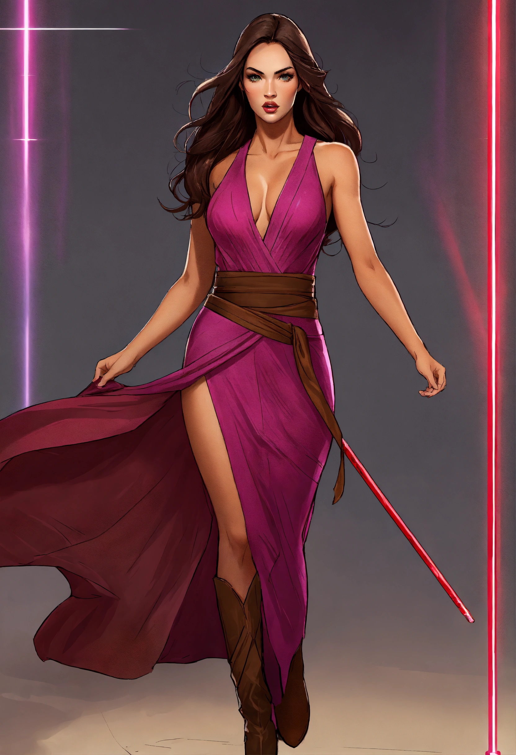 Concept art of pretty female megan fox jedi in a form-fitting plunge-cut outfit, maria lucia honan dress, light brown loose hair, green eyes, long floor length dress, long very light brown hair, star wars, sabine rich, artgerm, j scott campbell, artgerm, jedi outfit, full body, detailed, hyper realistic, intricate, beautiful, low cut neckline, fitted, tight dress, perfect body, full body, maria lucia honan dress, belt, high leg slit dress, knee high brown boots, jedi, star wars, pleated fabric, jedi, smooth light skin, round face, slim nose, long black eyelashes, perfect detailed face, realistic, cinematic, long dress, full body, low cut neckline, very long flowing light brown hair, loose long brown hair, fitted dress, tight fitted dress, leg slit dress, purple magenta burgundy chiffon fabric dress, purple magenta burgundy ombre flowing chiffon fabric, purple magenta burgundy ombre