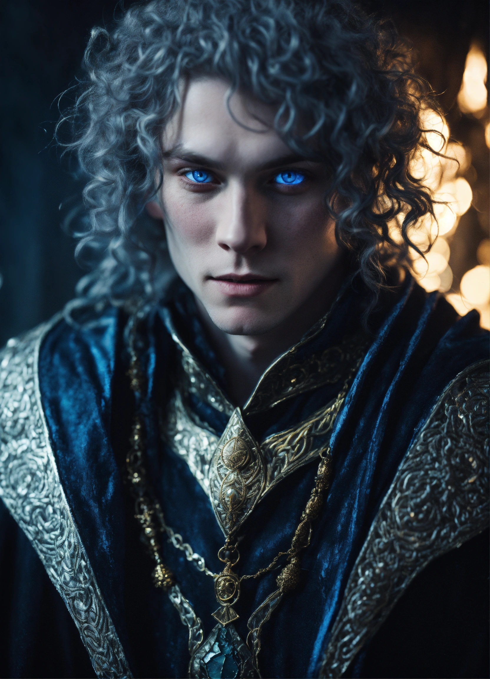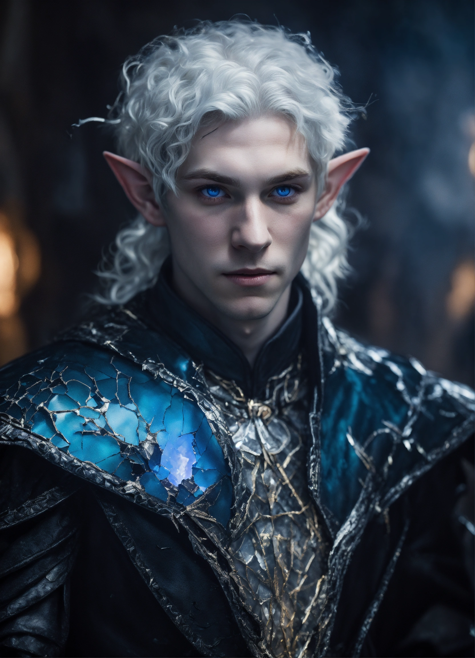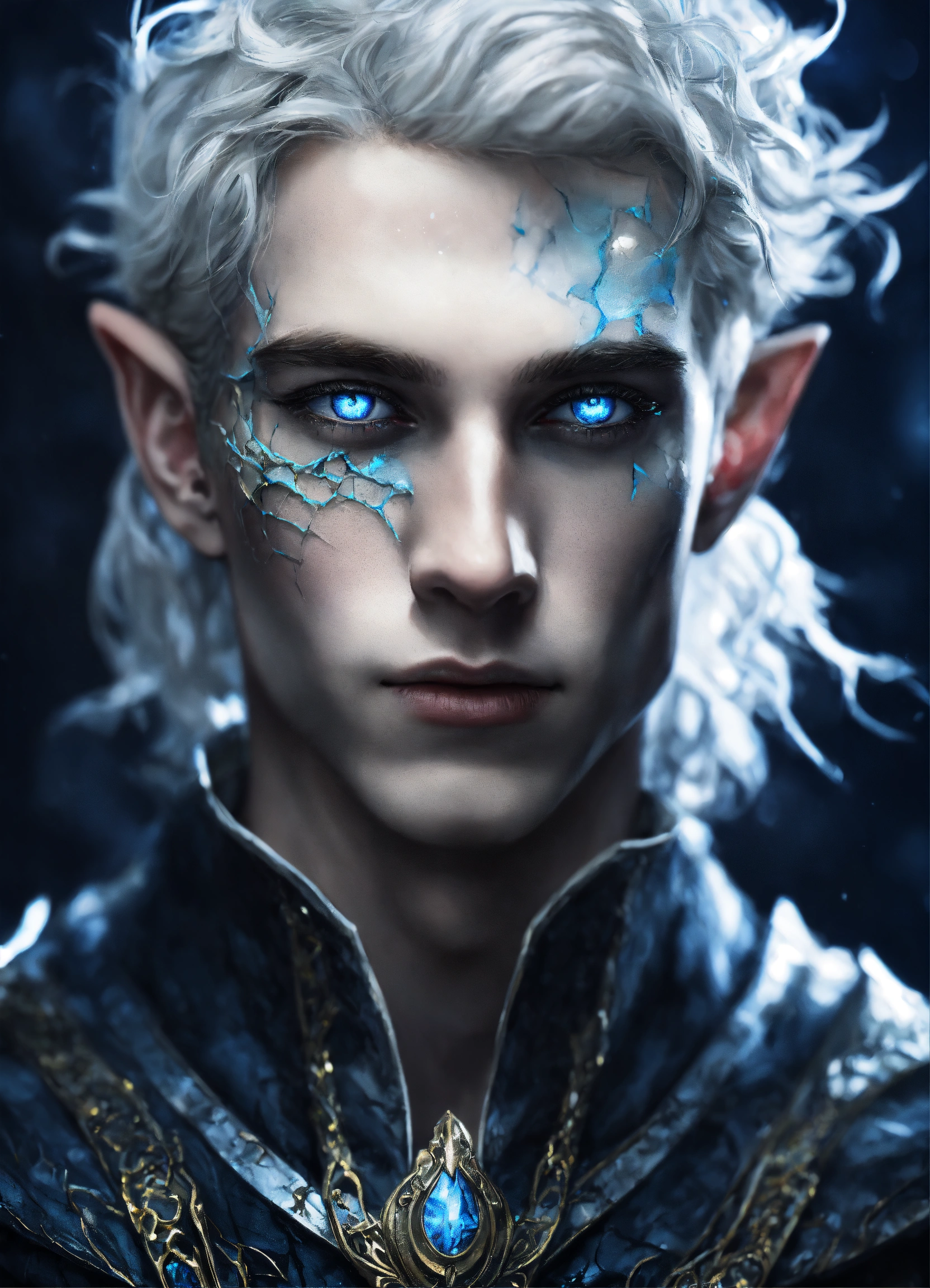 Fantasy portrait of a sickly pale-skinned male elf sorcerer, black shattered and cracked skin, lightweight clothes, gentle blue eyes, soft smile, glowing white curly hair, black magic, ultra detailed