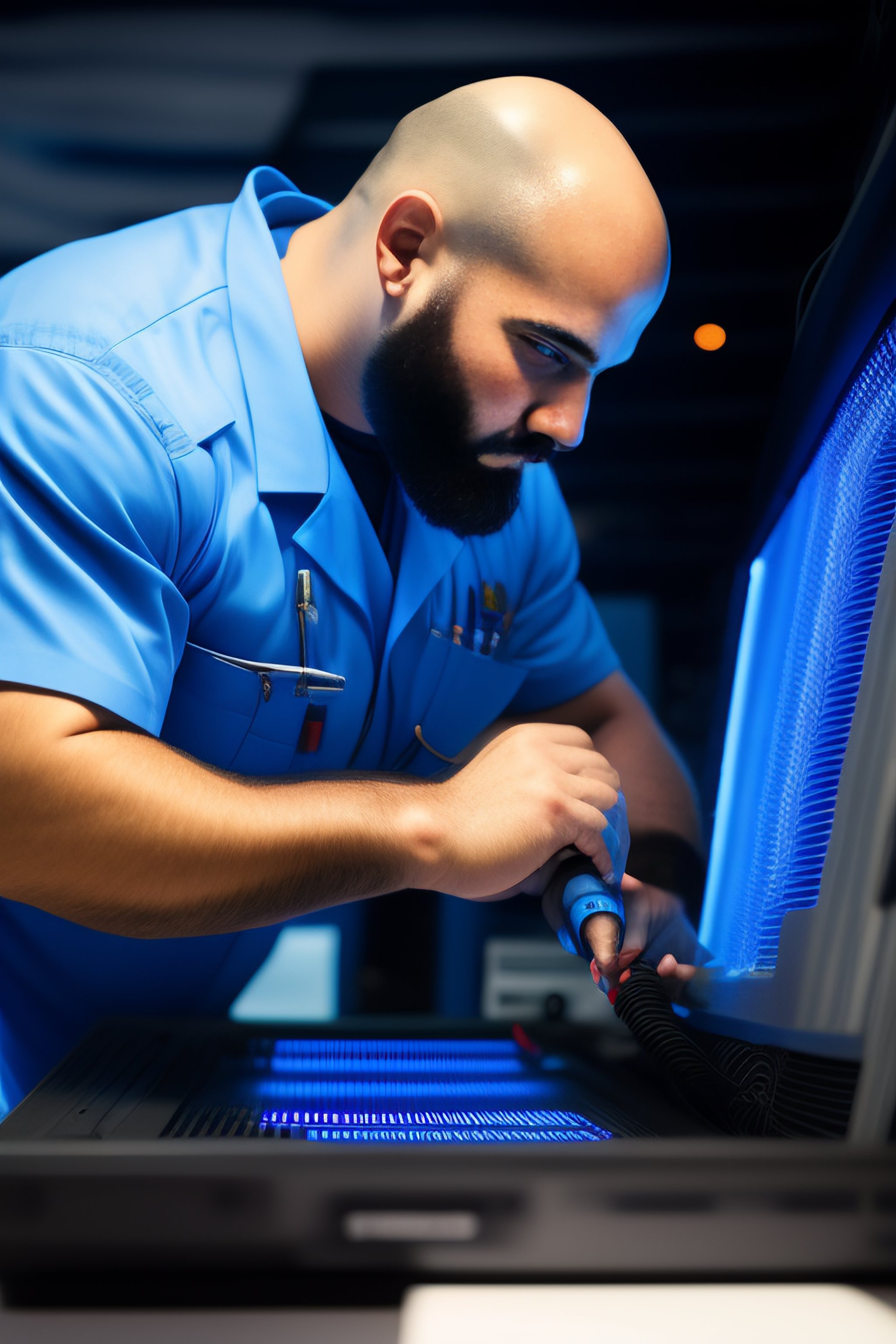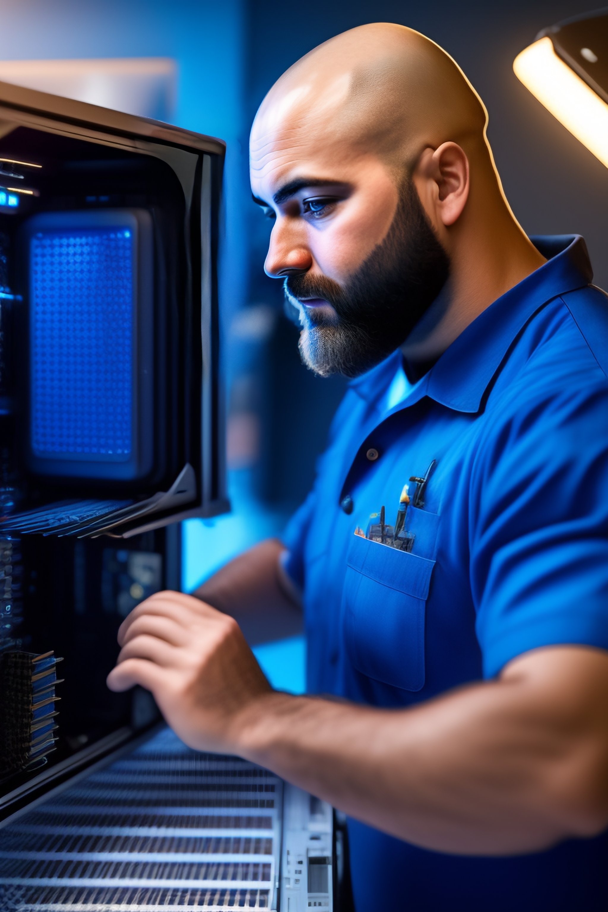 A bald bearded tech support guy wearing a blue shirt, fixing computers, repairing computers, 4k, rule of thirds, extreme detail, detailed drawing, trending artstation, hd, sharp focus, backlit, symmetrical features, digital art, illustration