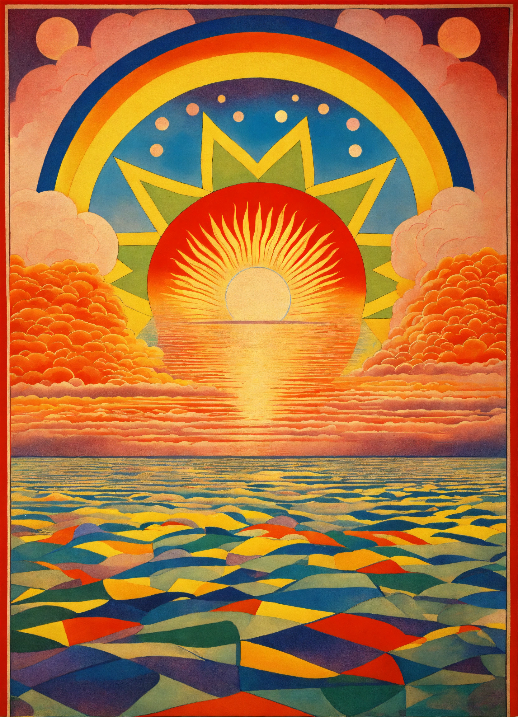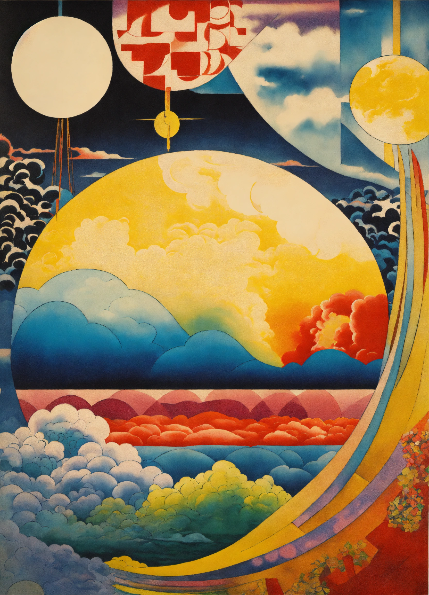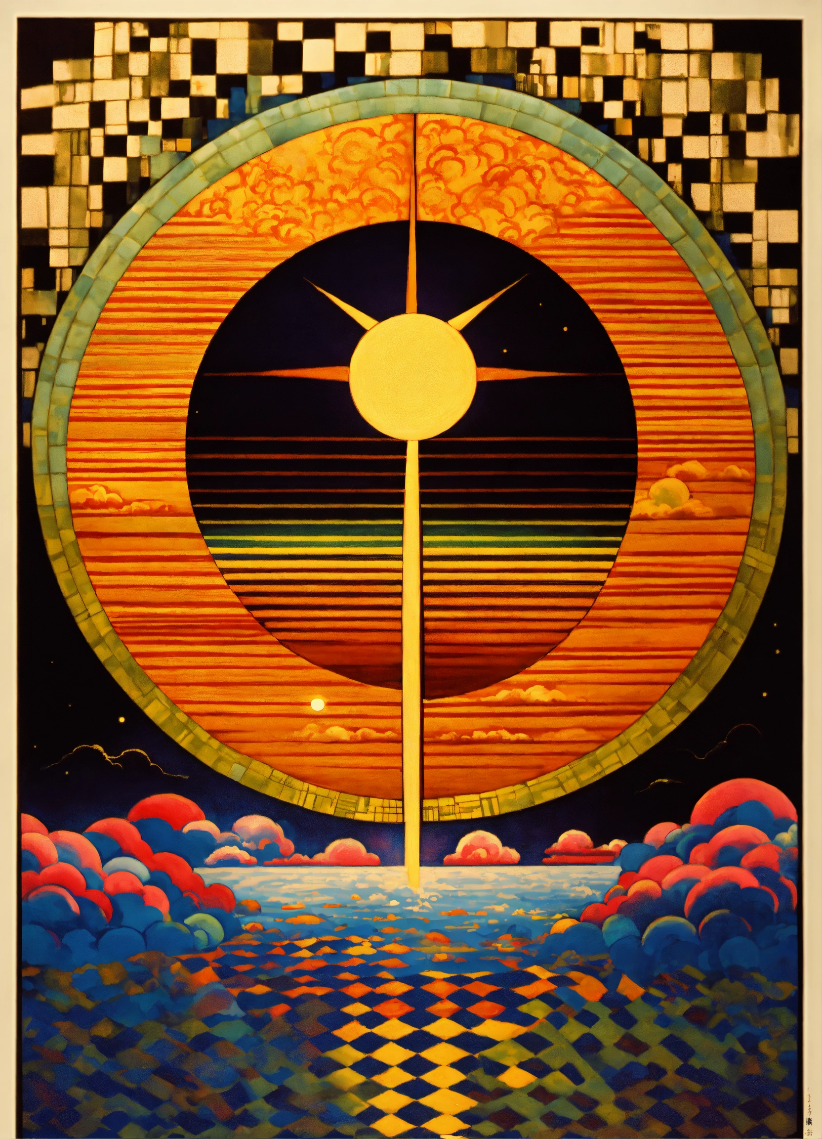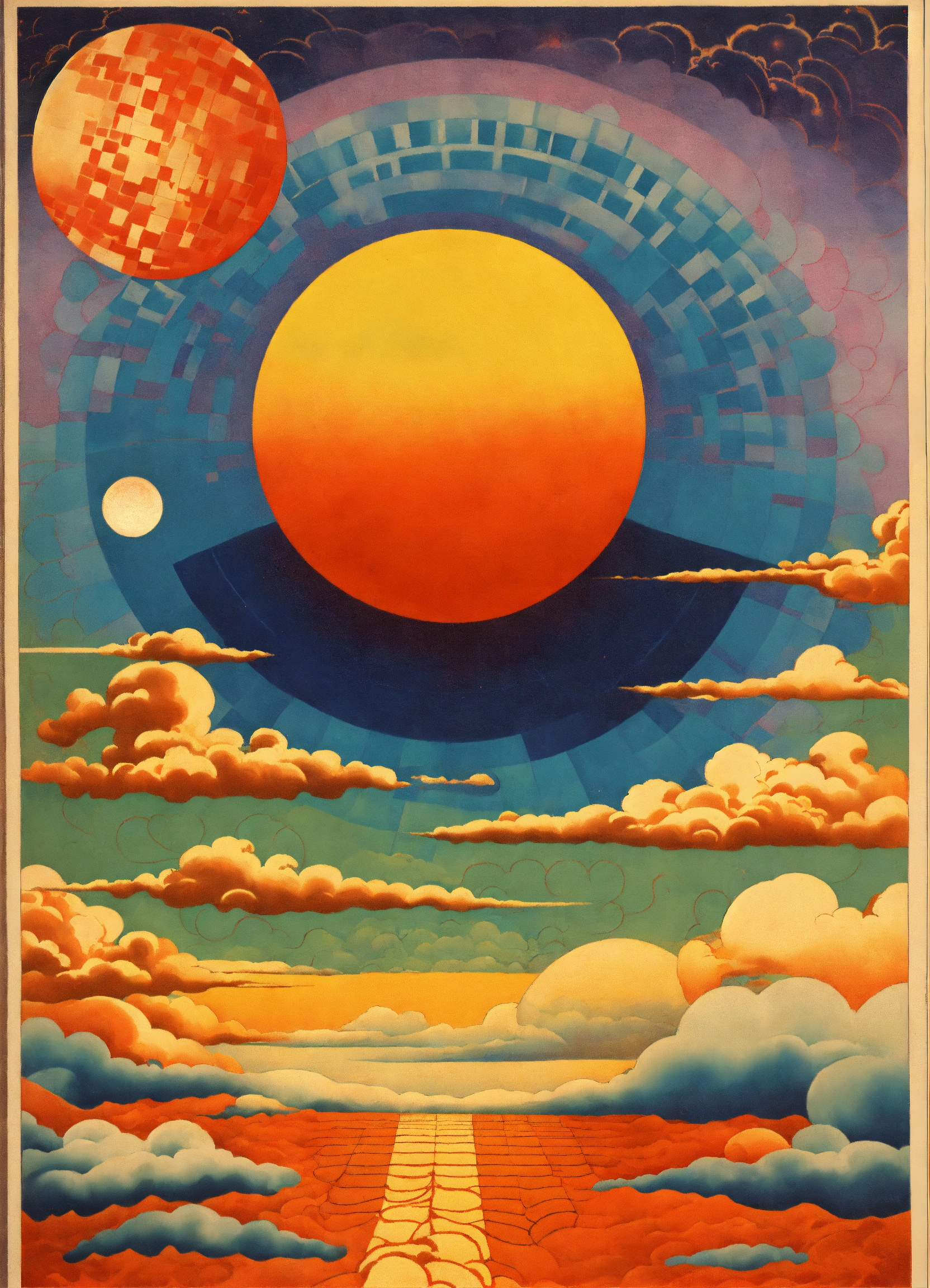 Japanese vintage poster, oriental, sun merging into moon, geometrical clouds, dream dimension, psychedelic, nebula, cosmic frontier, rainbow checkerboard patterns by picasso