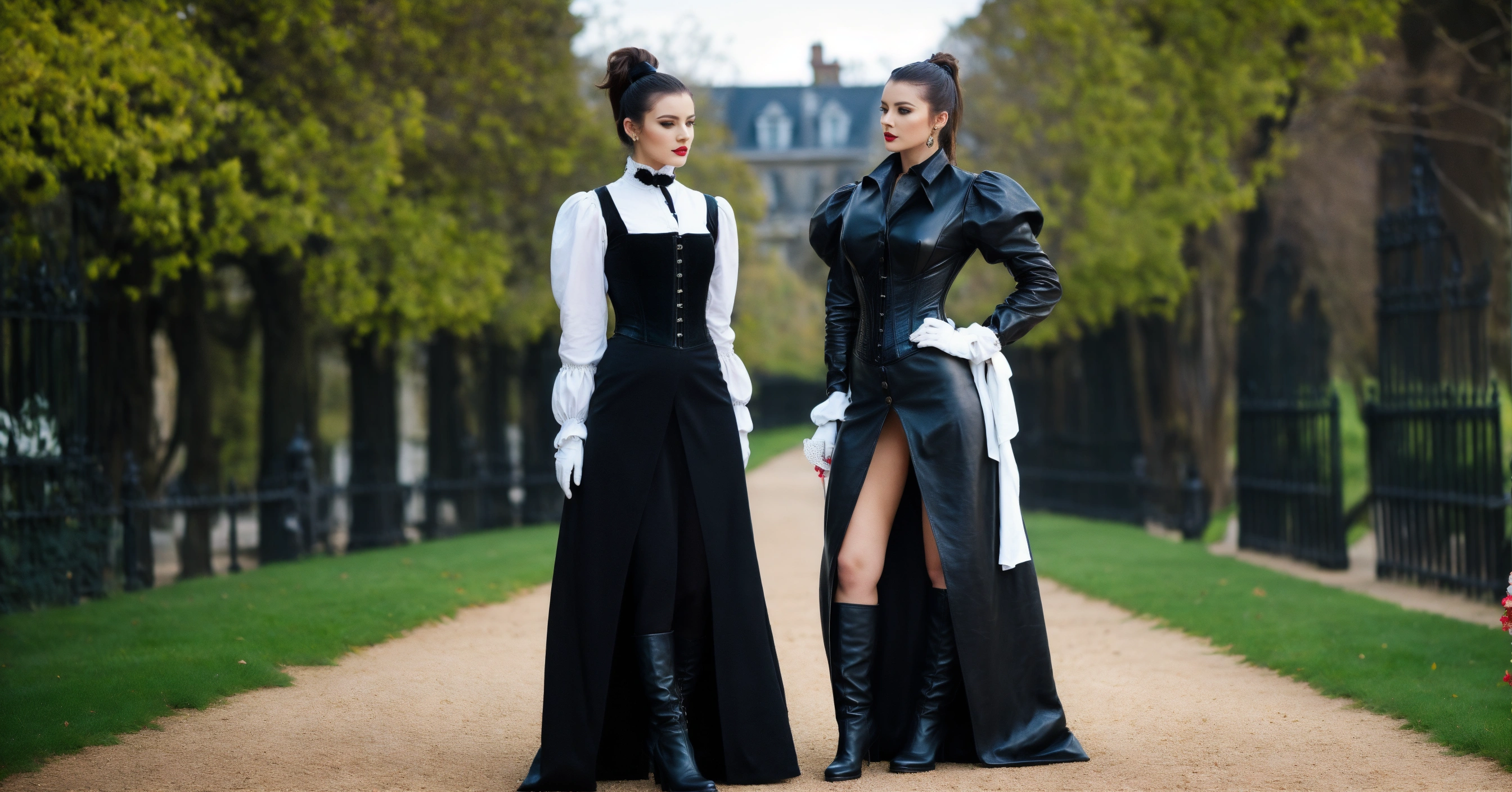 Two stunning french seductress women fashion model, brunette straight high ponytail, black leather corset, long strict victorian governess wide black long leather shirt dress with long big puff sleeves and big buttons, mansion park with sunny daylight, white office shirt collar, leather gloves, eyeliner makeup, black leather boots