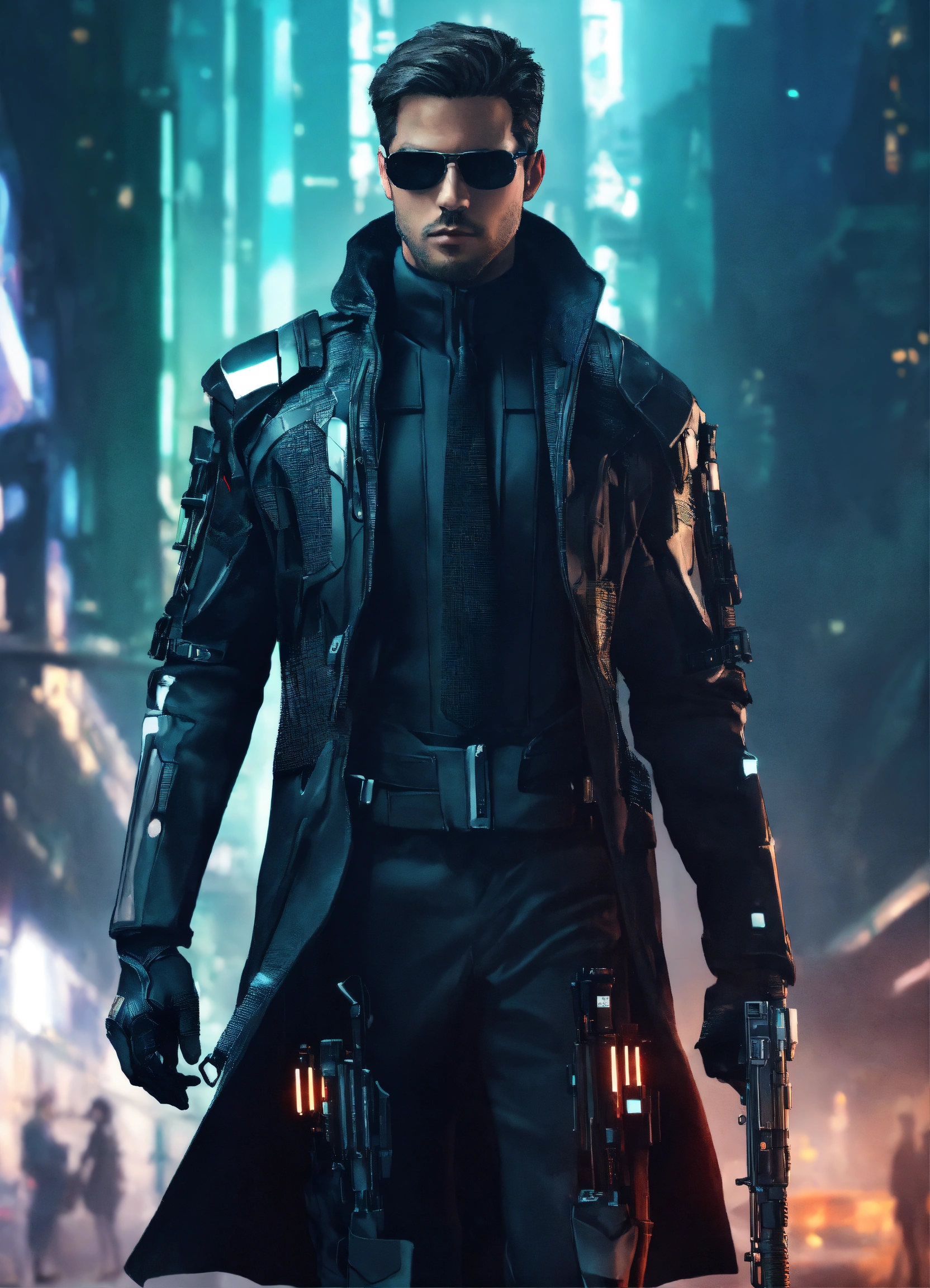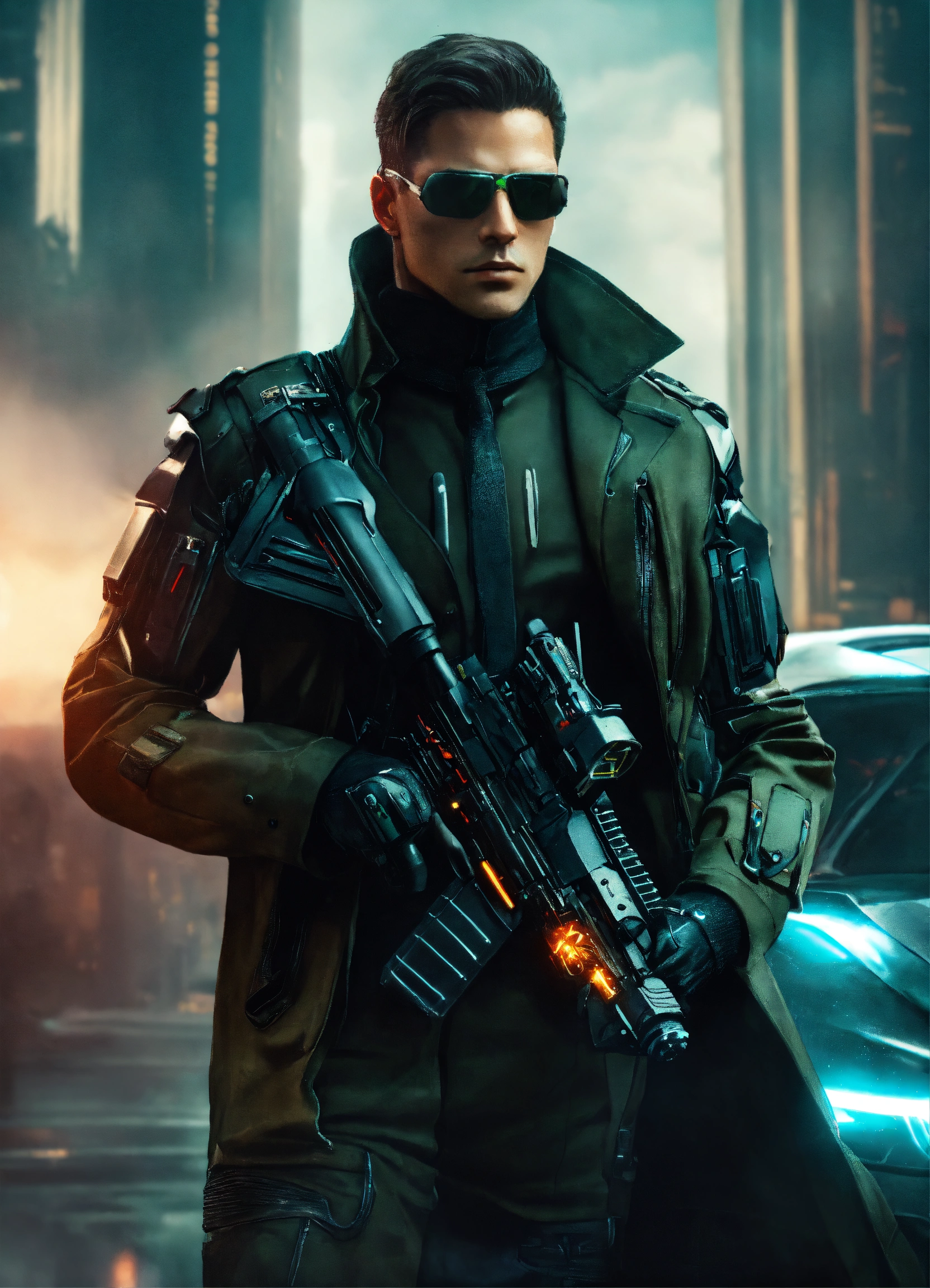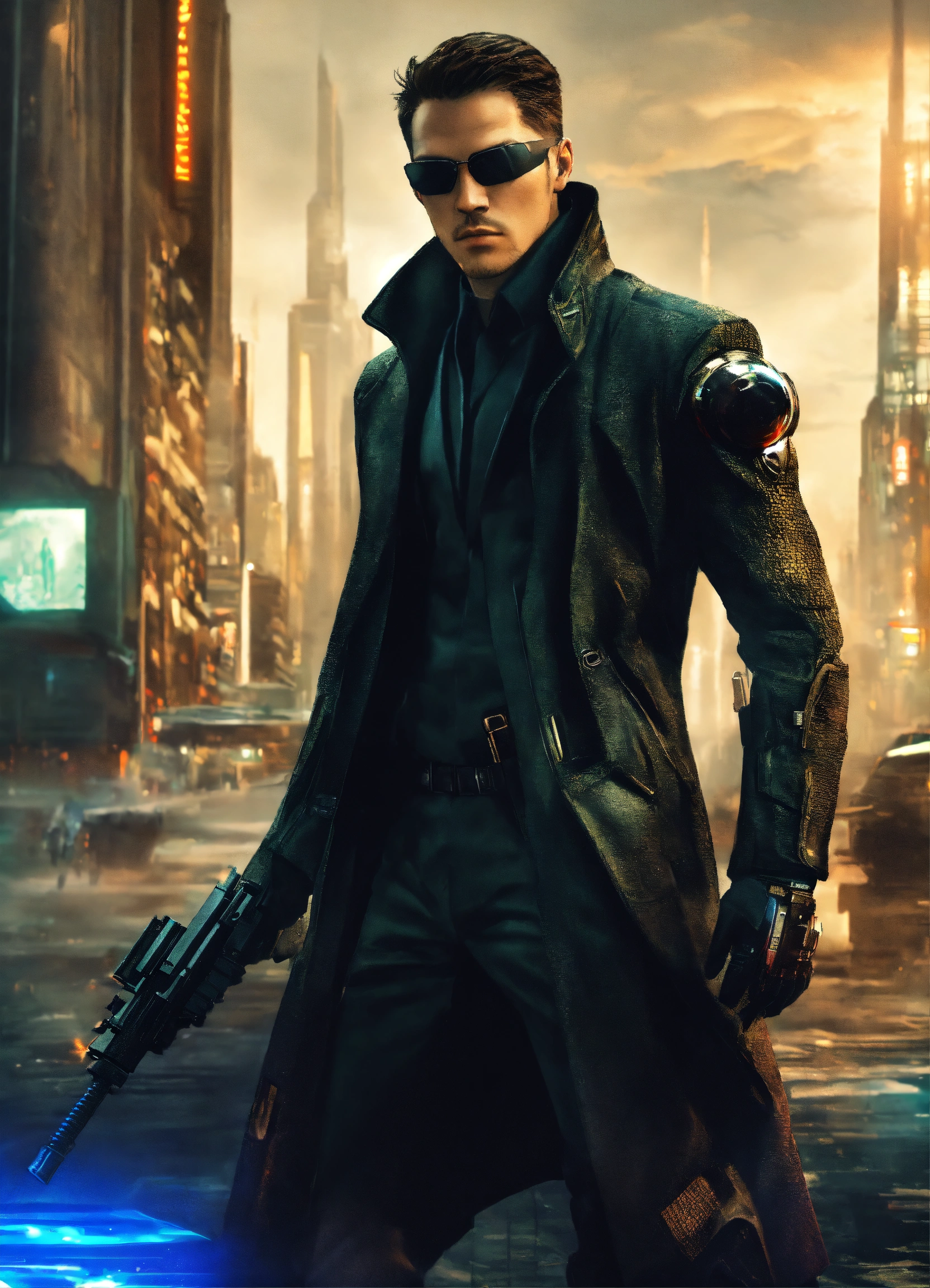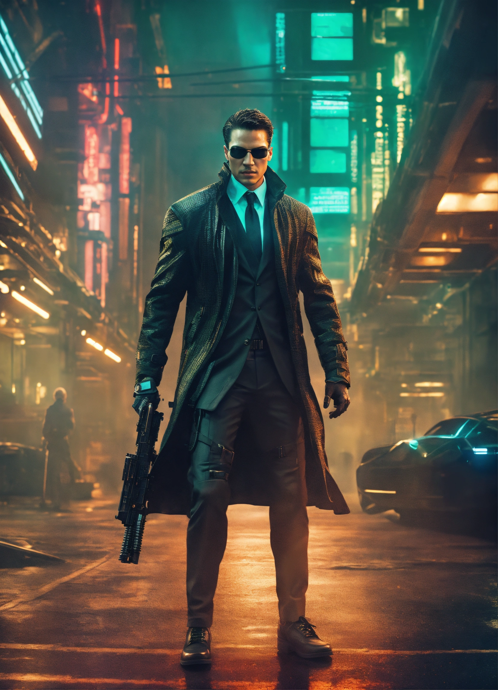 A secret agent from the future with a futuristic suit, coat and great weapons, future art, matrix style